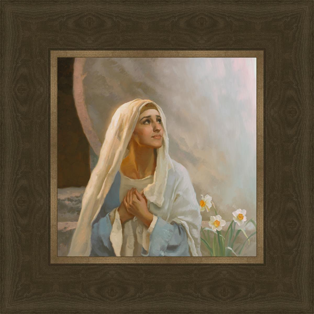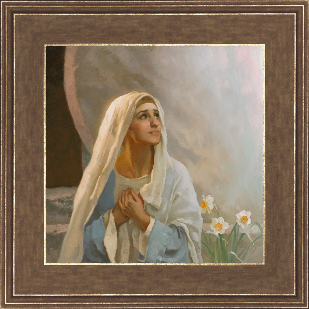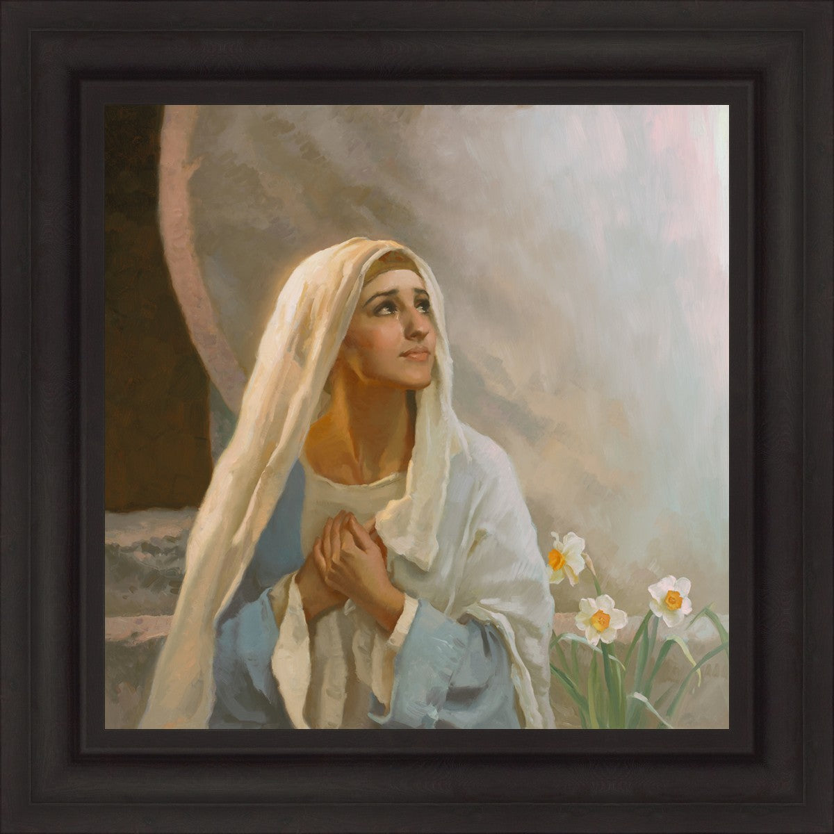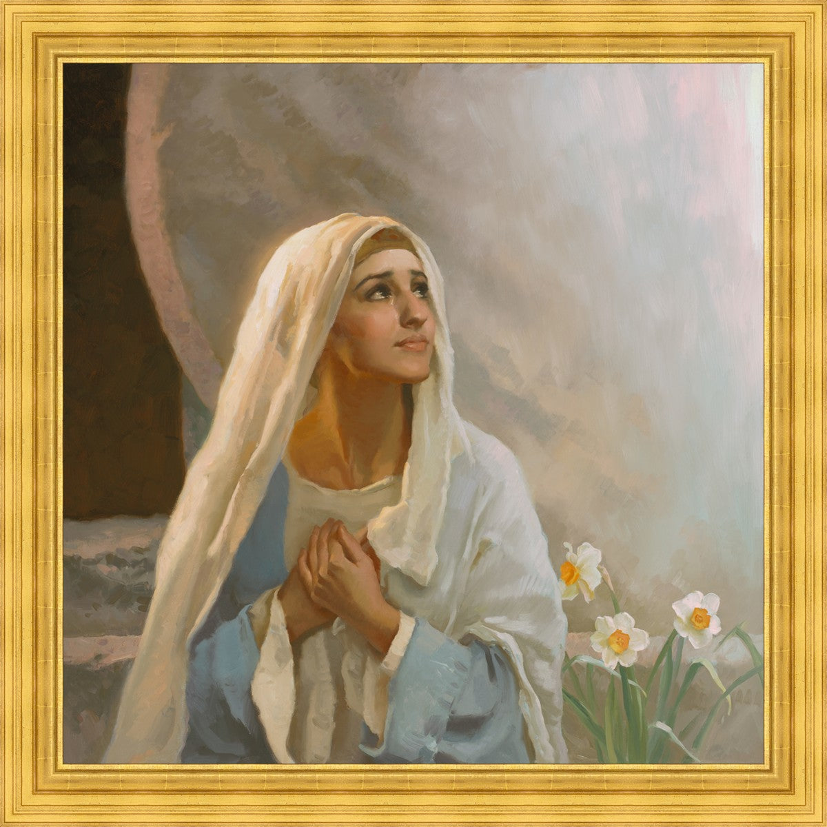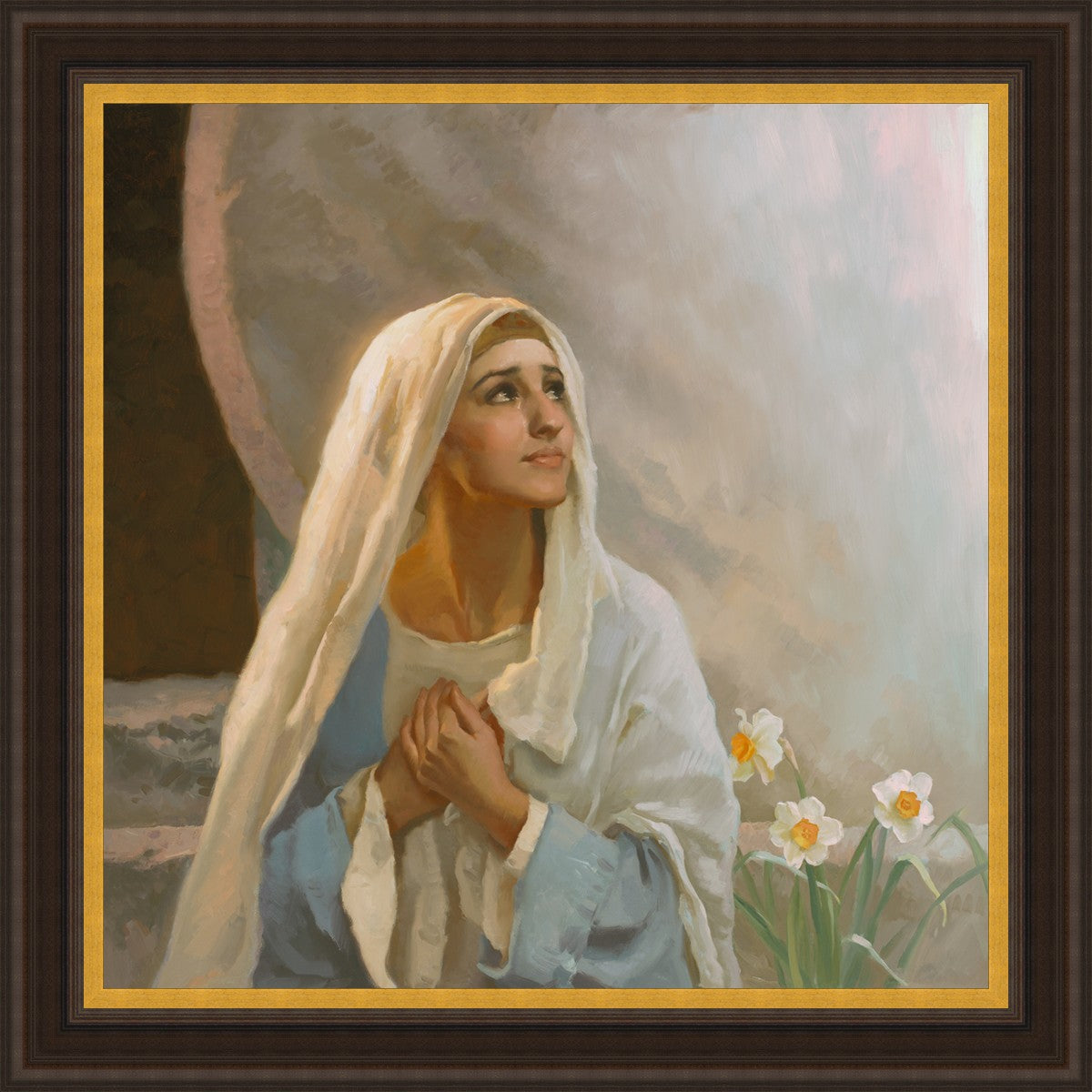 Mary's expression, one of awe and reverence, reflects the dawning of understanding as she looks upon the resurrected Lord. The tender blooms nearby, fresh against the stone, echo the miracle of life and resurrection. It is my hope that those who gaze upon this work feel the joyous serenity of a pivotal moment in faith, a scene of quiet wonder, and the everlasting promise of victory through Christ.