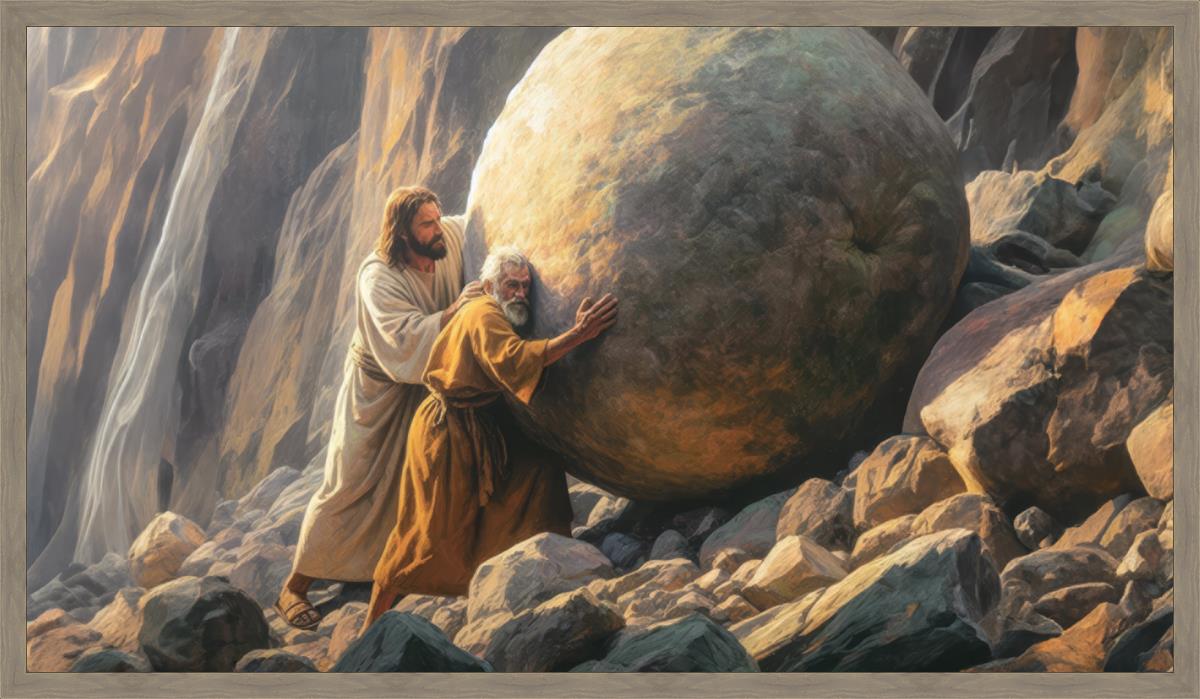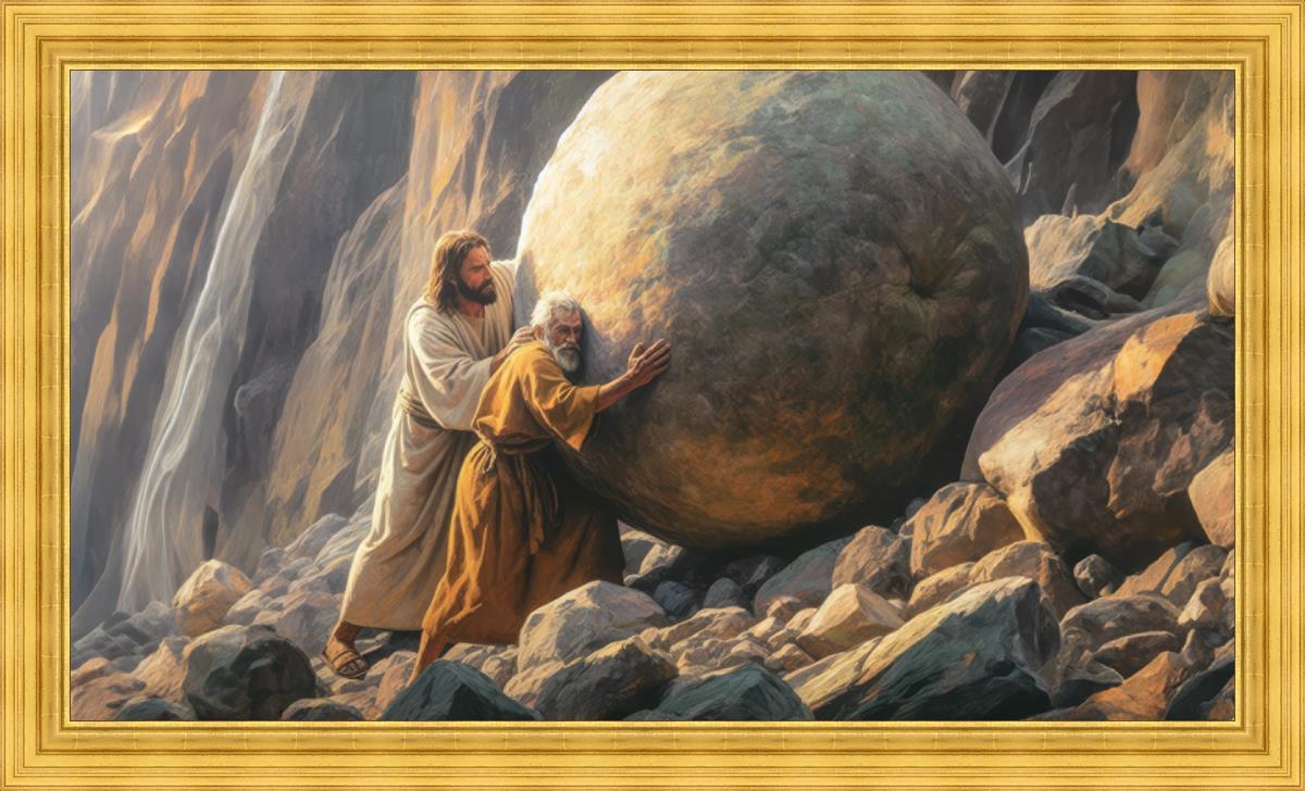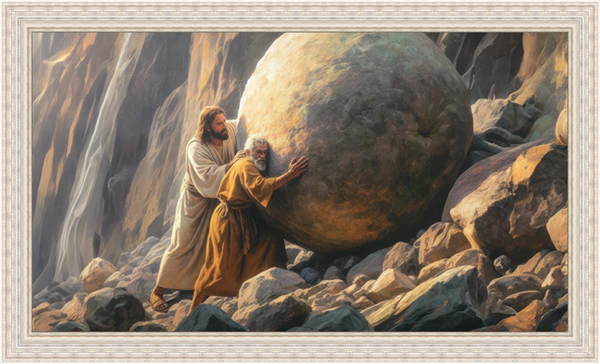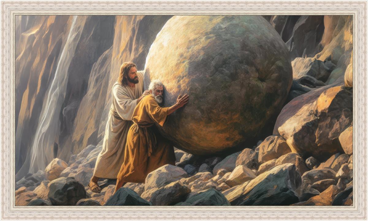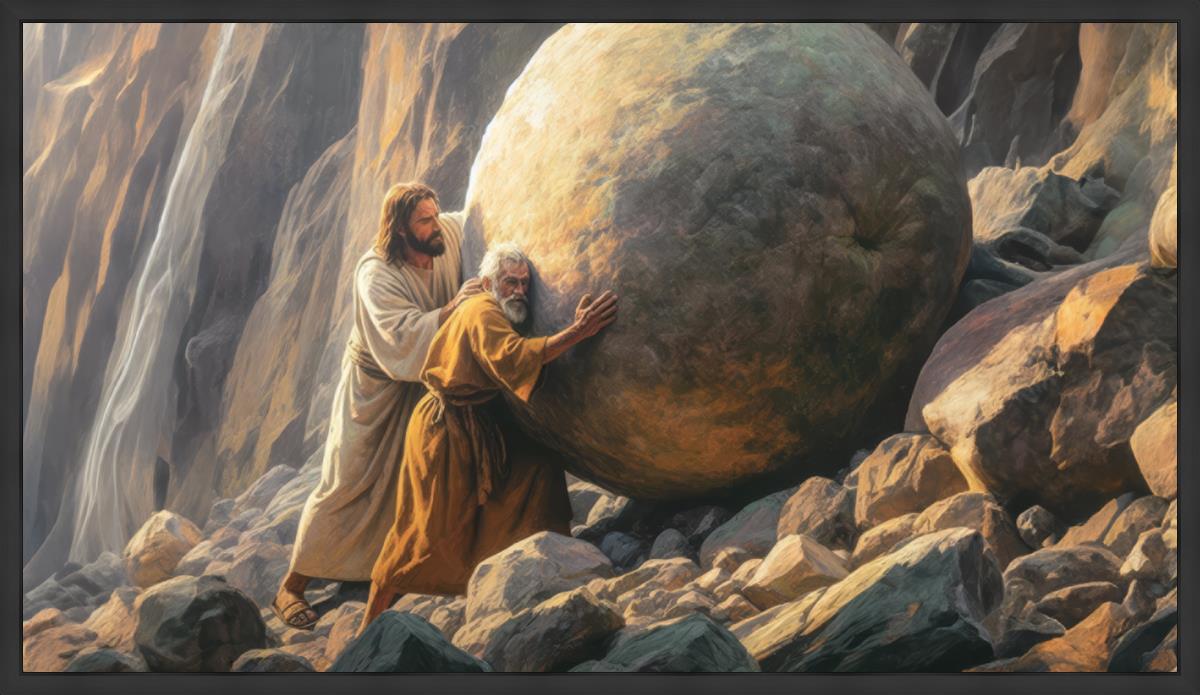 Inspired by the myth of Sisyphus, "Redemption's Ascent," features an old man pushing a heavy stone up a rocky slope. The story of Sisyphus tells of a man condemned to endlessly push a boulder uphill, only to watch it roll back down each time. Similarly, the old man in our painting represents humanity's struggles with sin and redemption. But in our version, Jesus stands beside him, sharing the burden. With Jesus by his side, the narrative changes. Jesus offers strength and support, transforming the journey from one of despair to one of hope and redemption.