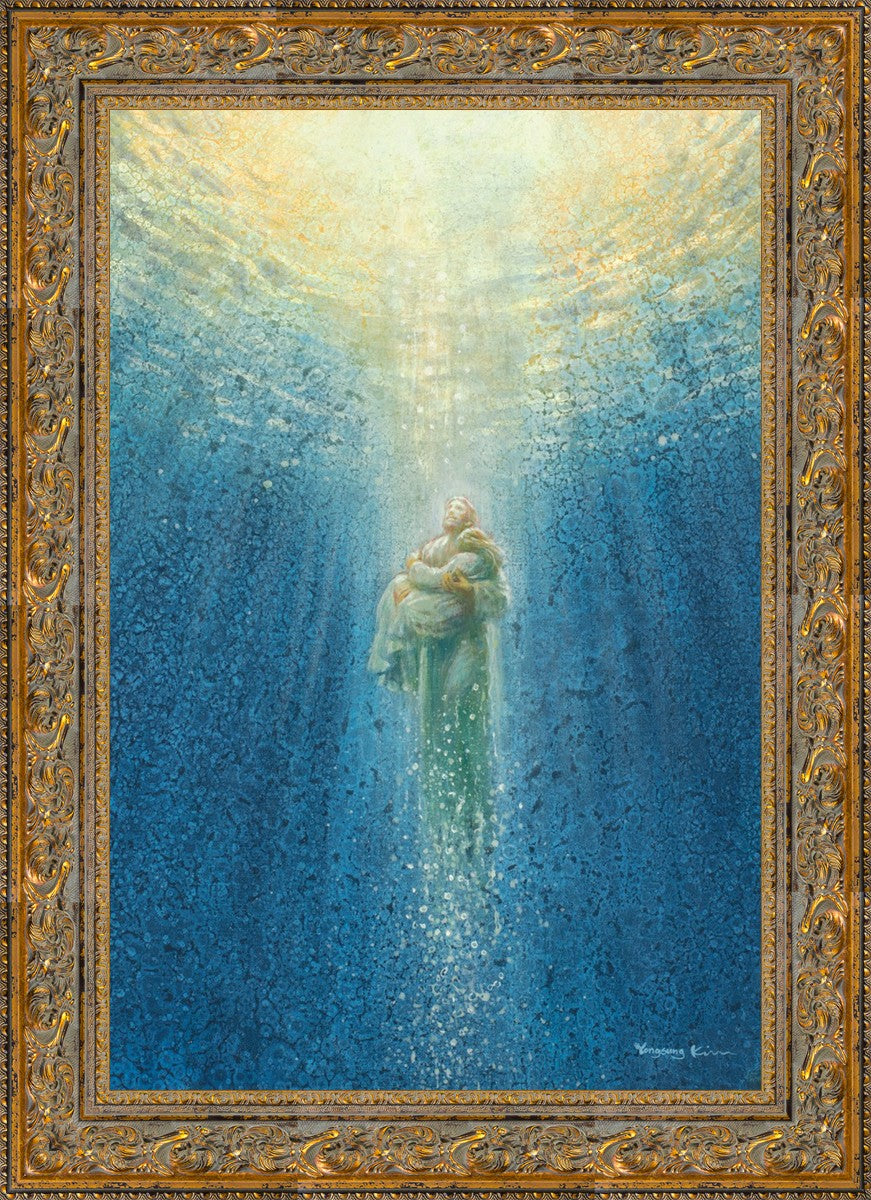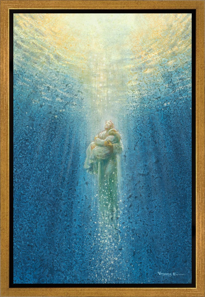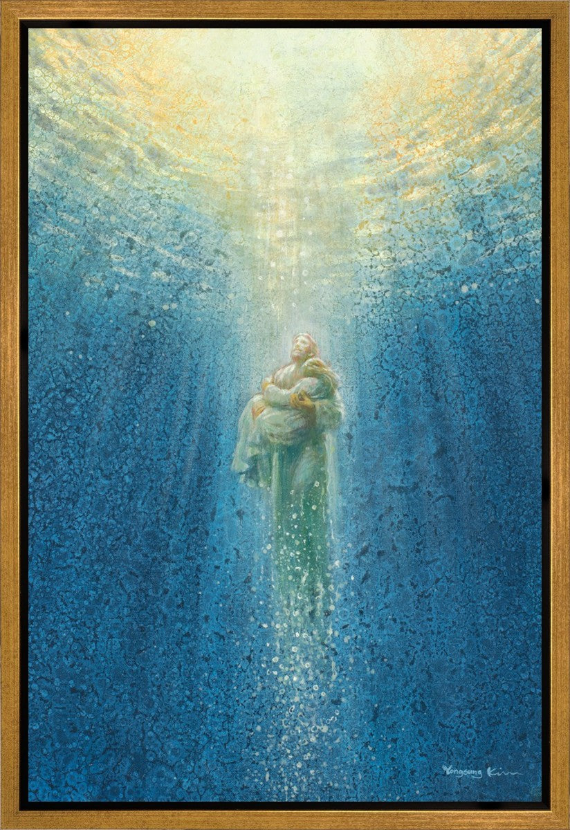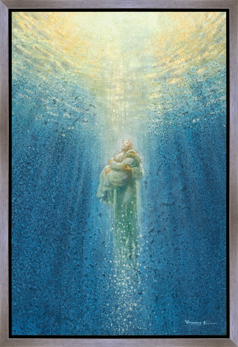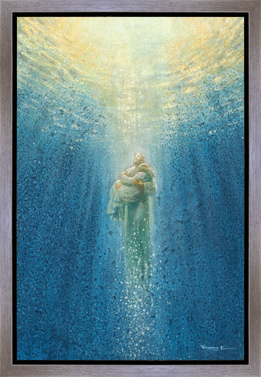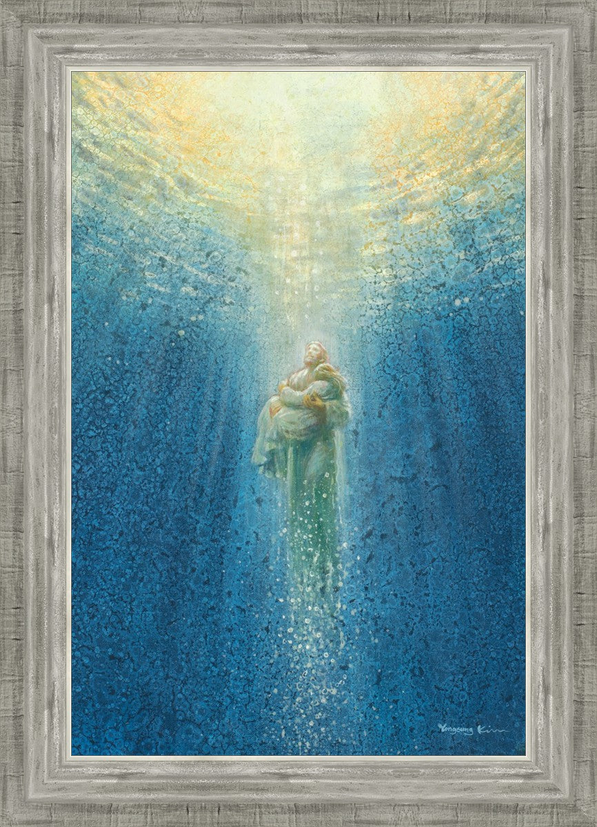 "Rescue Me" by Yongsung Kim portrays Jesus extending his hand to lift a sinking person out of deep waters, symbolizing divine rescue and salvation from despair. This artwork offers hope and reassurance to those facing adversity, reminding viewers of Jesus's unwavering presence and compassion in times of hardship and isolation.