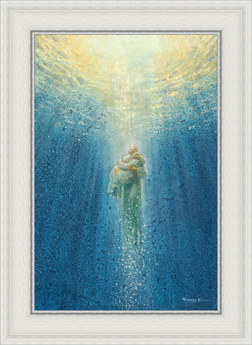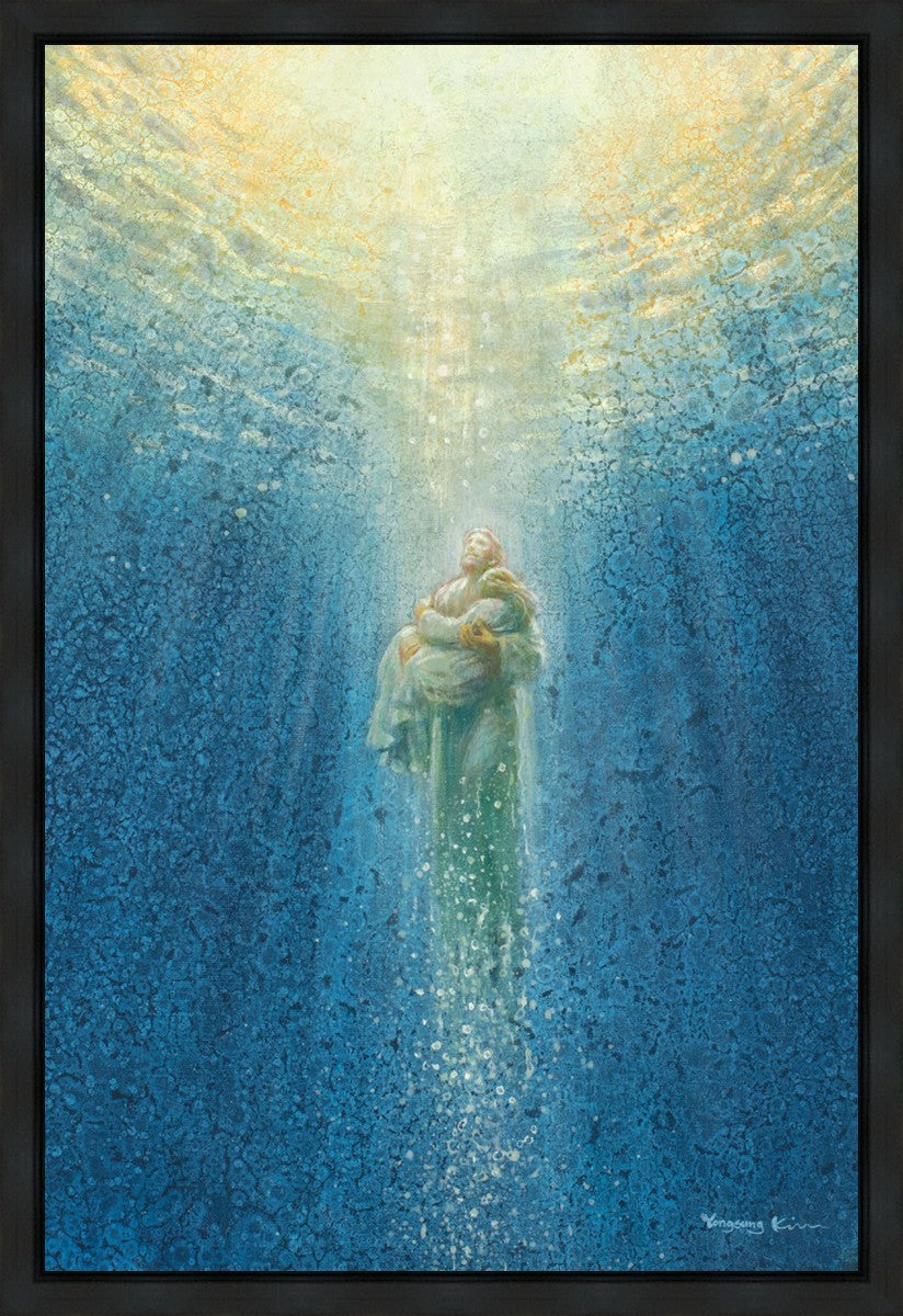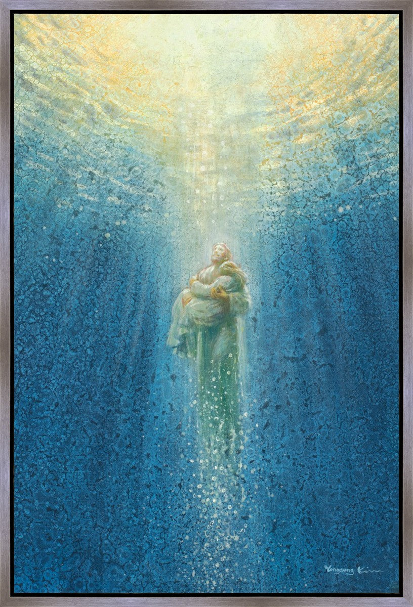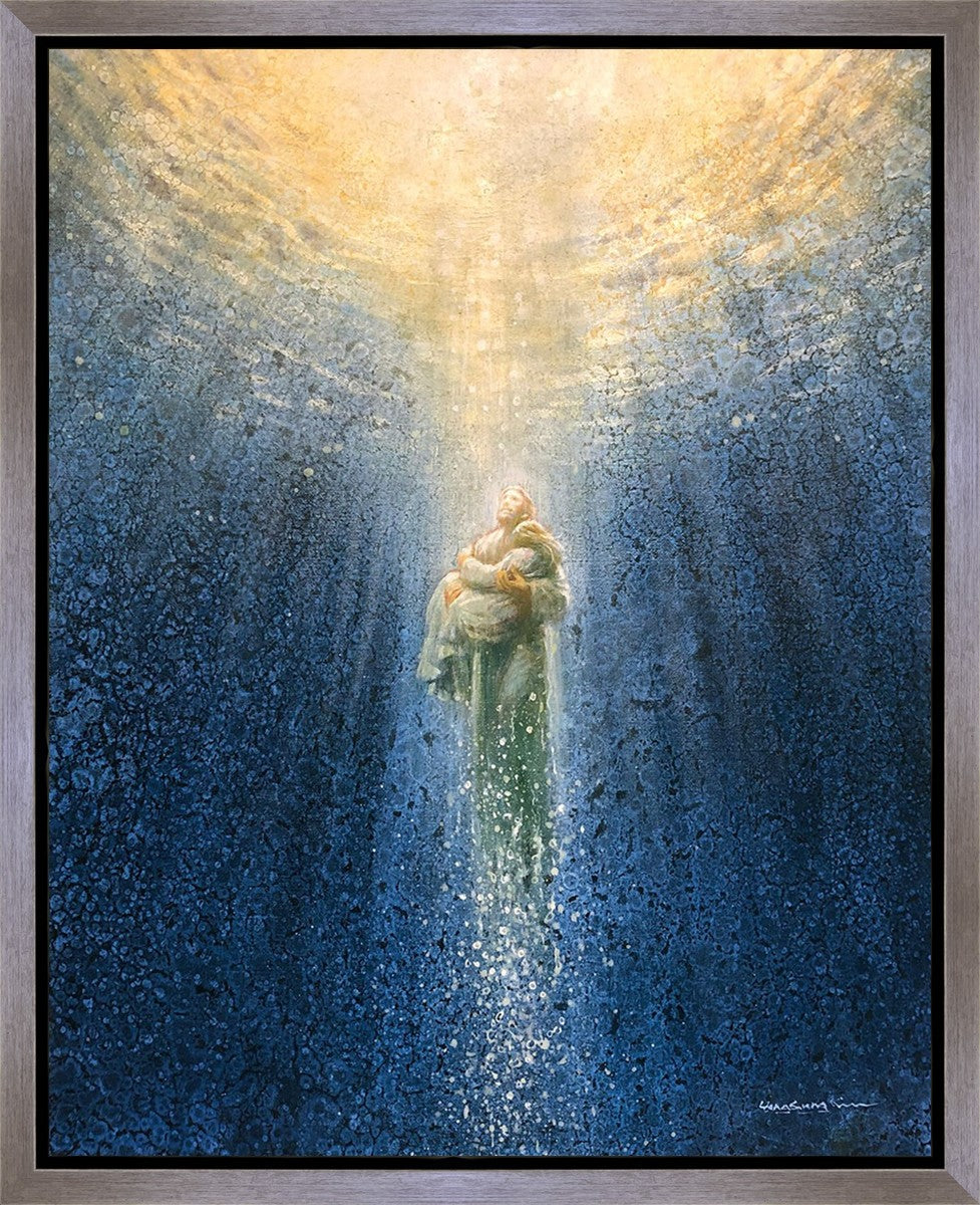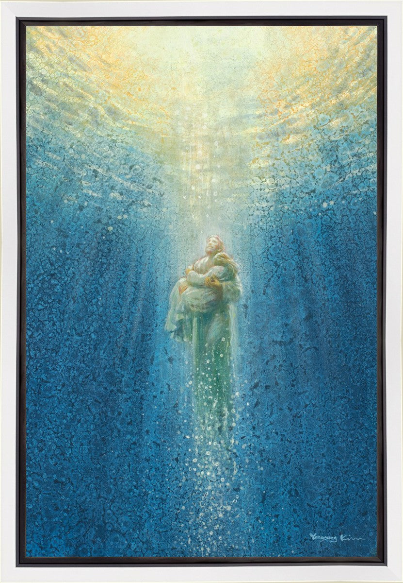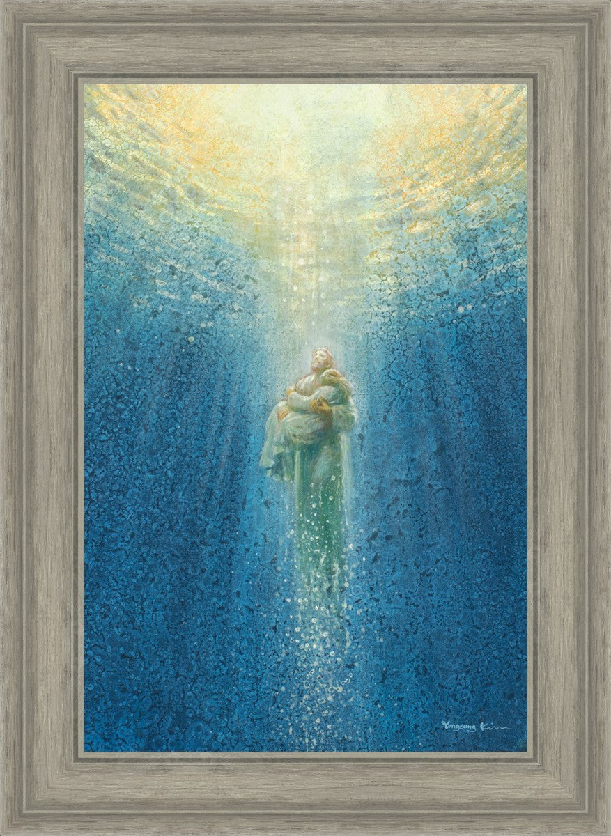 "Rescue Me" by Yongsung Kim portrays Jesus extending his hand to lift a sinking person out of deep waters, symbolizing divine rescue and salvation from despair. This artwork offers hope and reassurance to those facing adversity, reminding viewers of Jesus's unwavering presence and compassion in times of hardship and isolation.