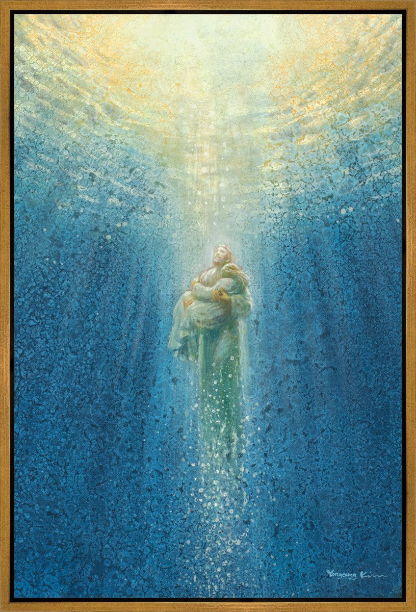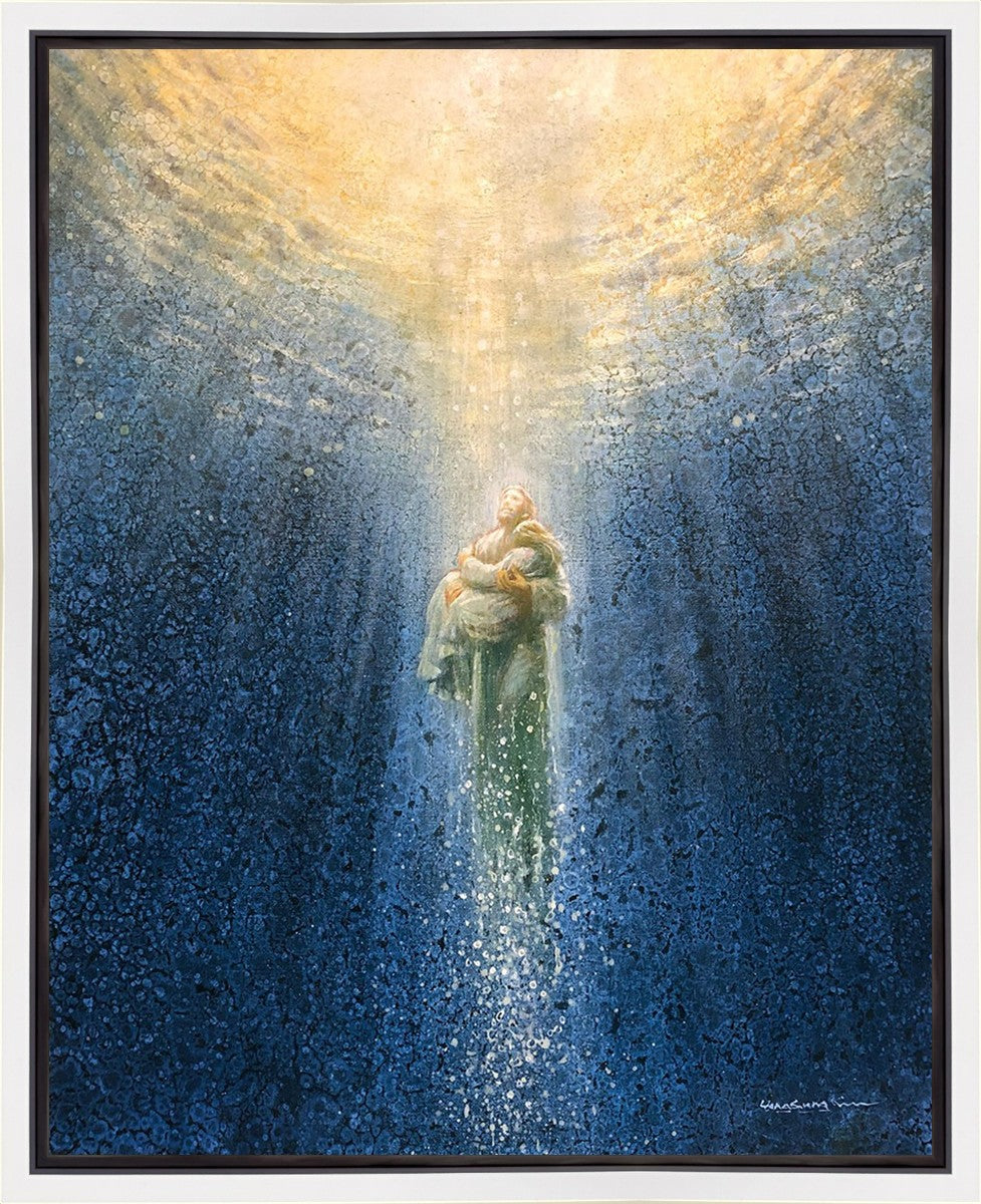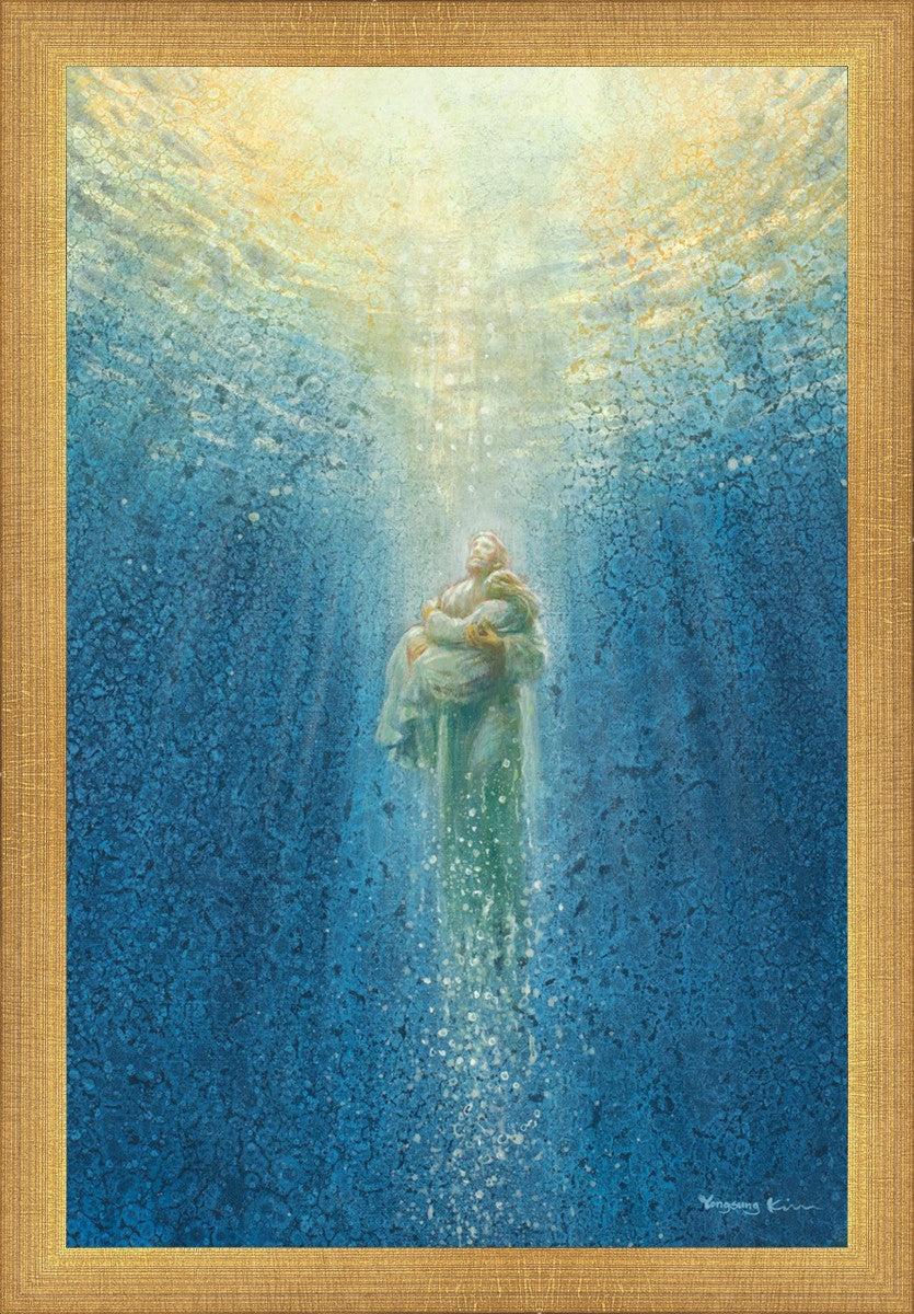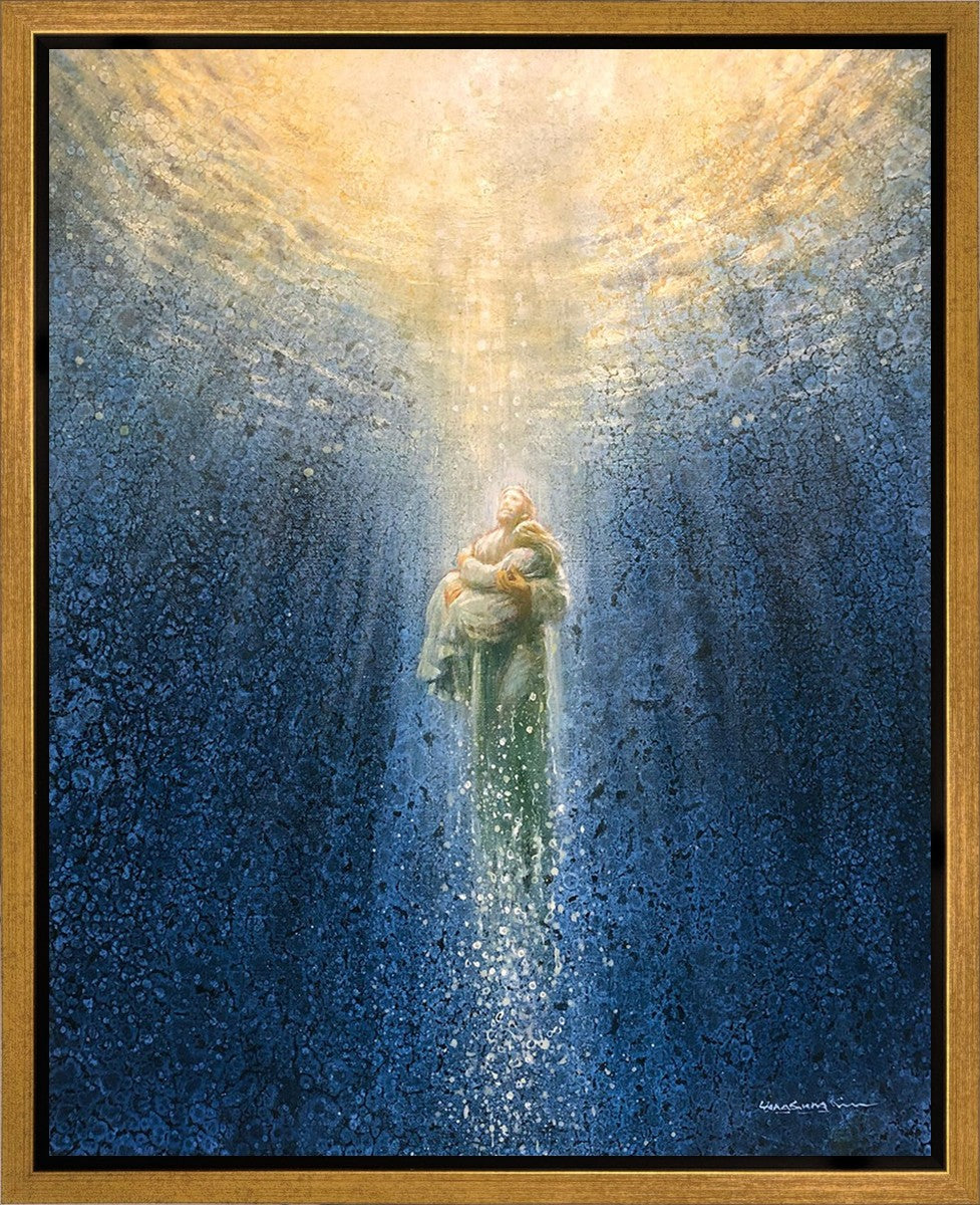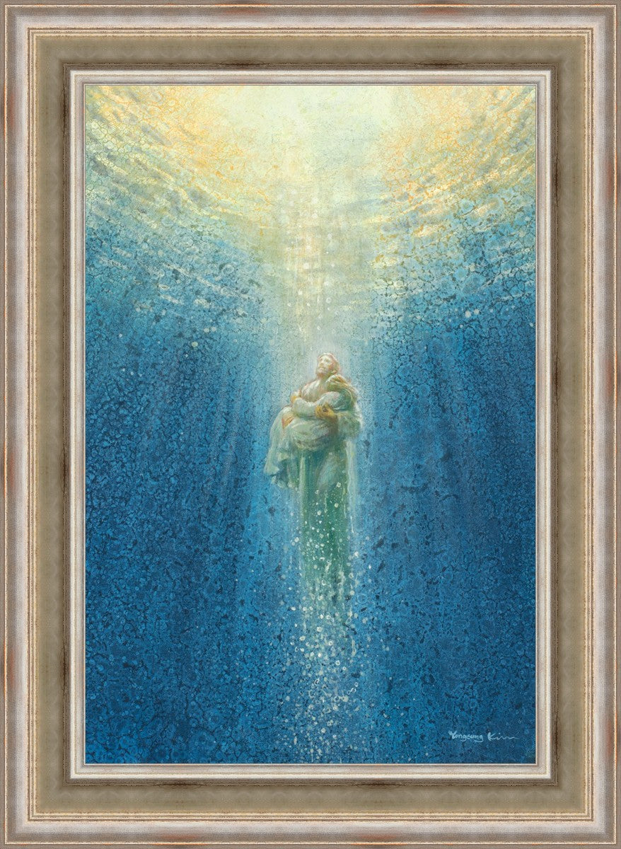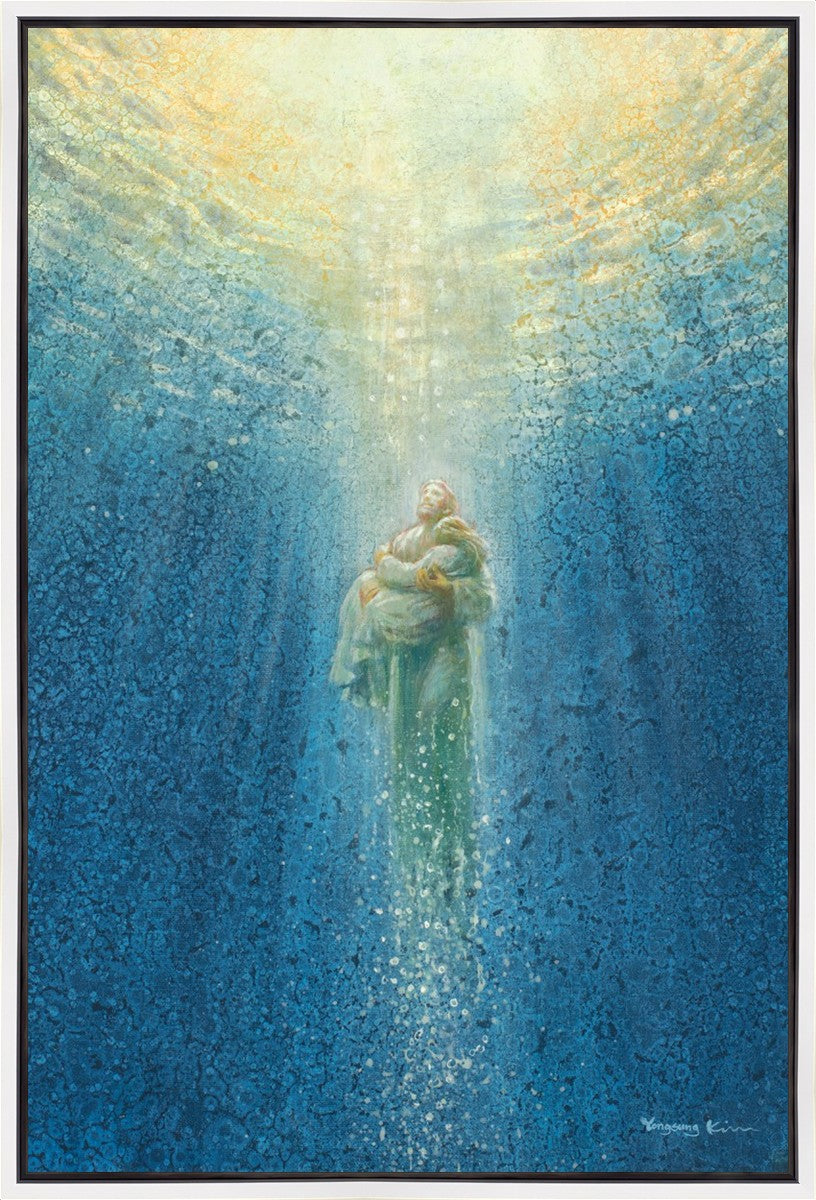 "Rescue Me" by Yongsung Kim portrays Jesus extending his hand to lift a sinking person out of deep waters, symbolizing divine rescue and salvation from despair. This artwork offers hope and reassurance to those facing adversity, reminding viewers of Jesus's unwavering presence and compassion in times of hardship and isolation.