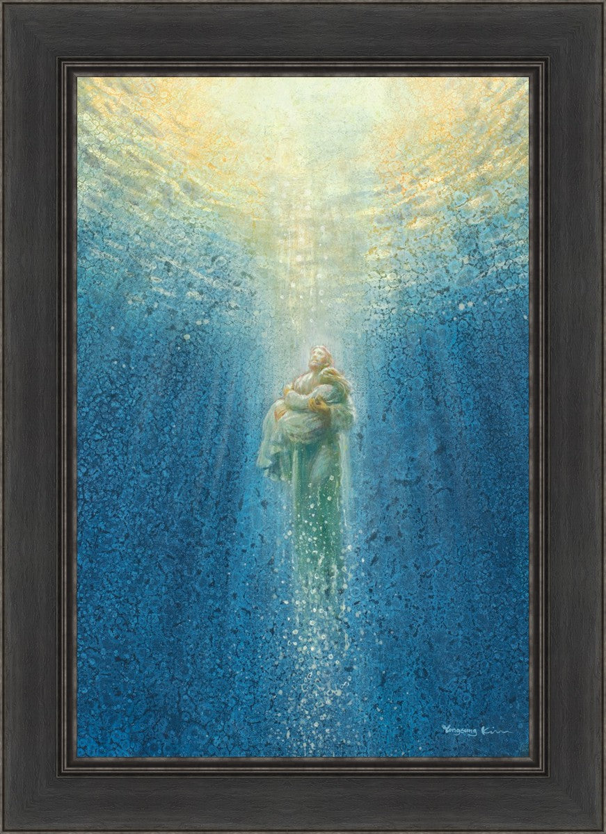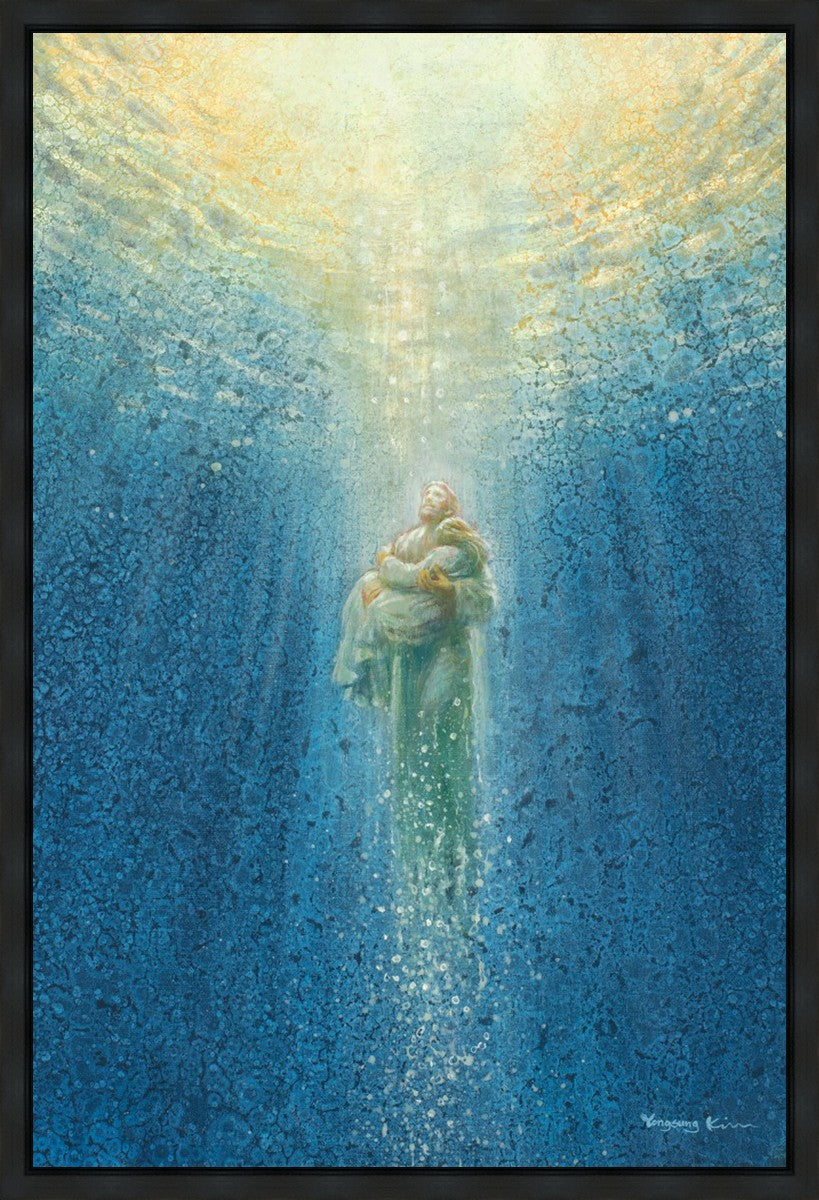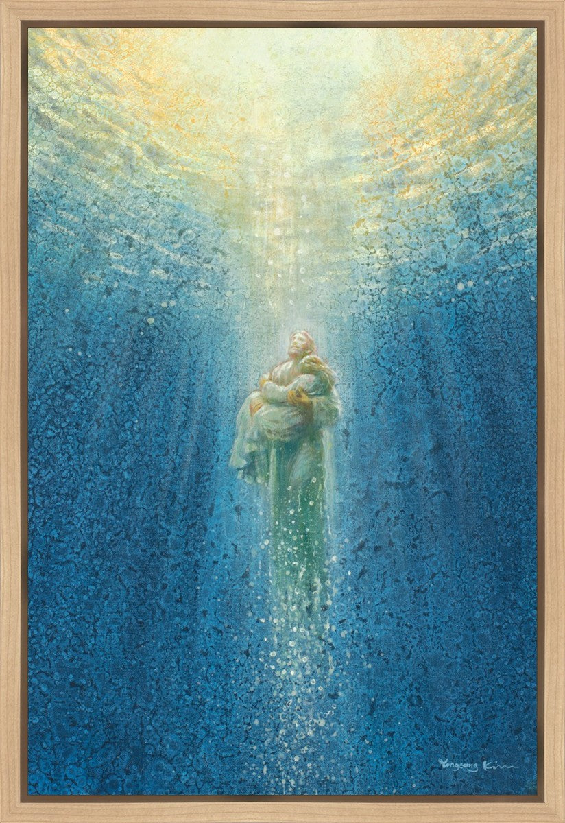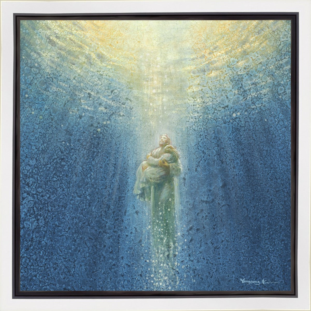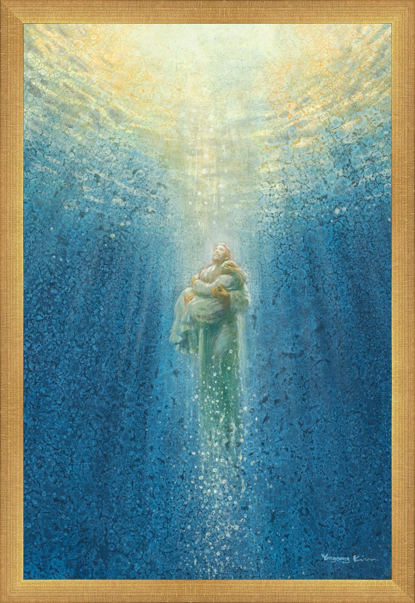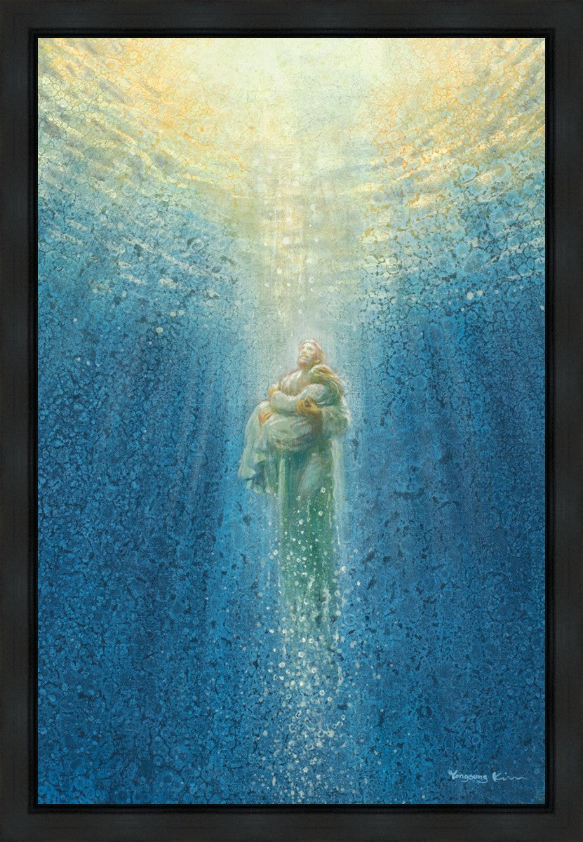 "Rescue Me" by Yongsung Kim portrays Jesus extending his hand to lift a sinking person out of deep waters, symbolizing divine rescue and salvation from despair. This artwork offers hope and reassurance to those facing adversity, reminding viewers of Jesus's unwavering presence and compassion in times of hardship and isolation.