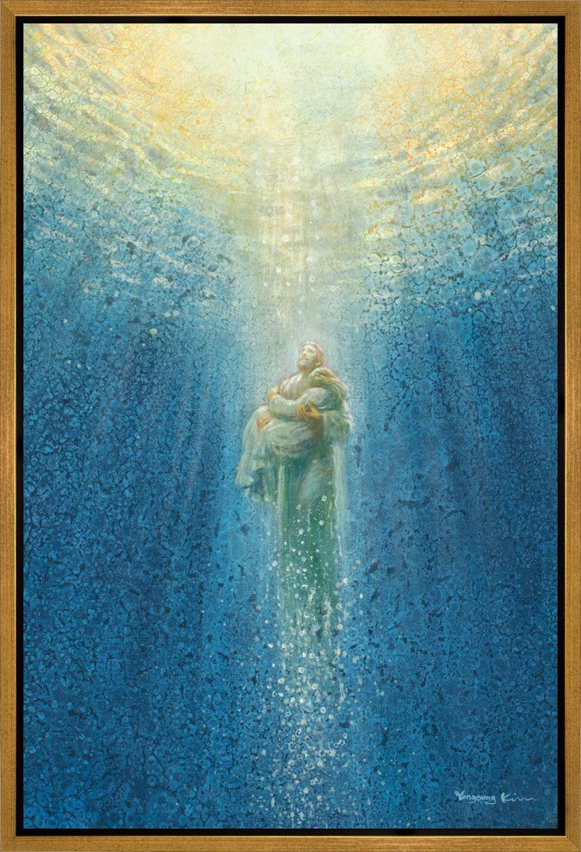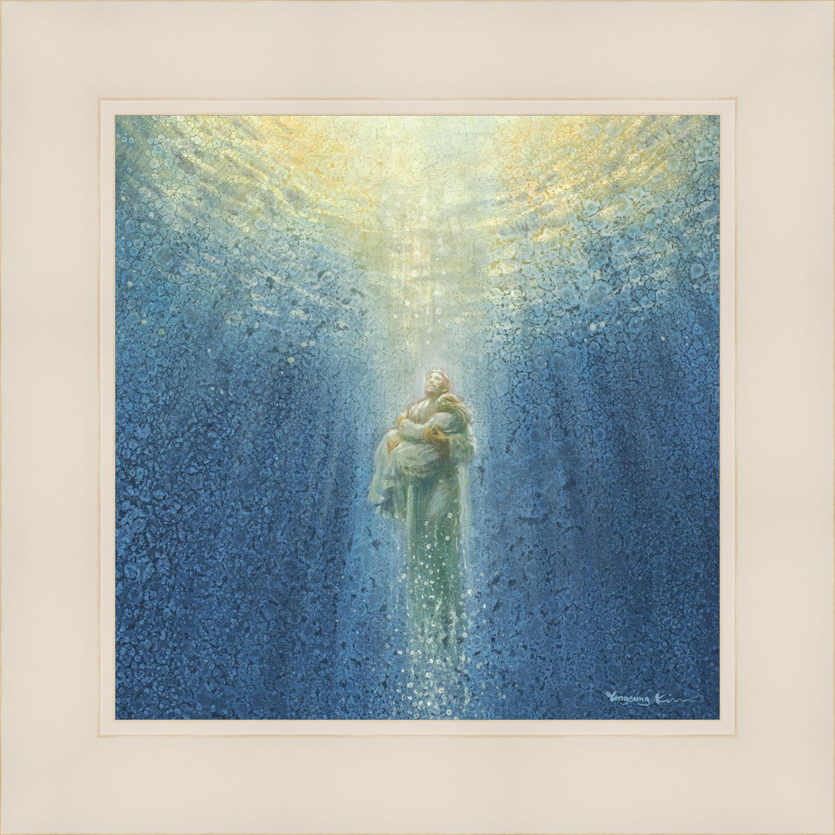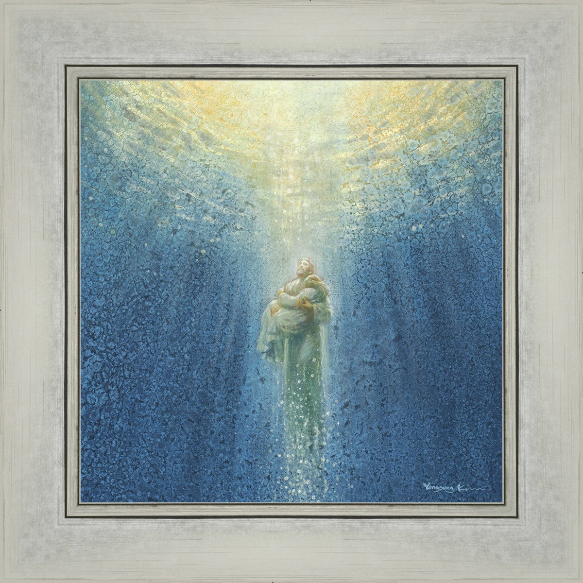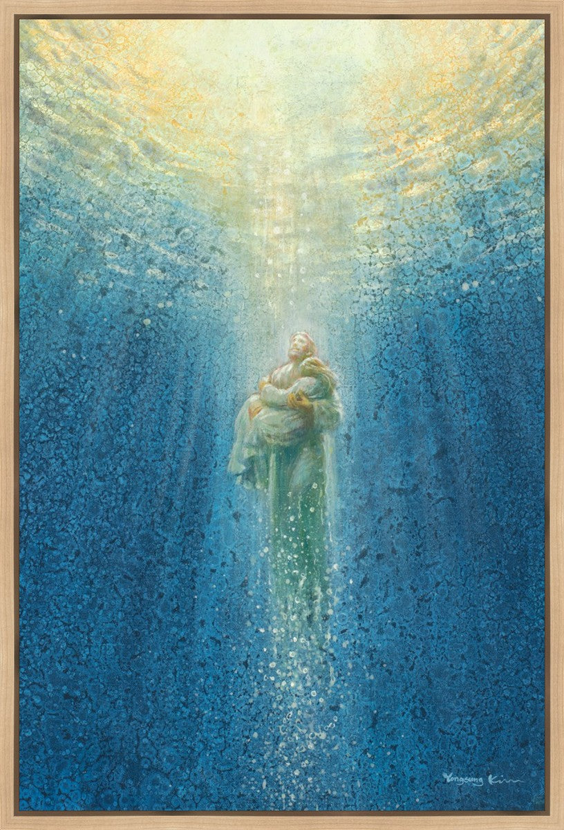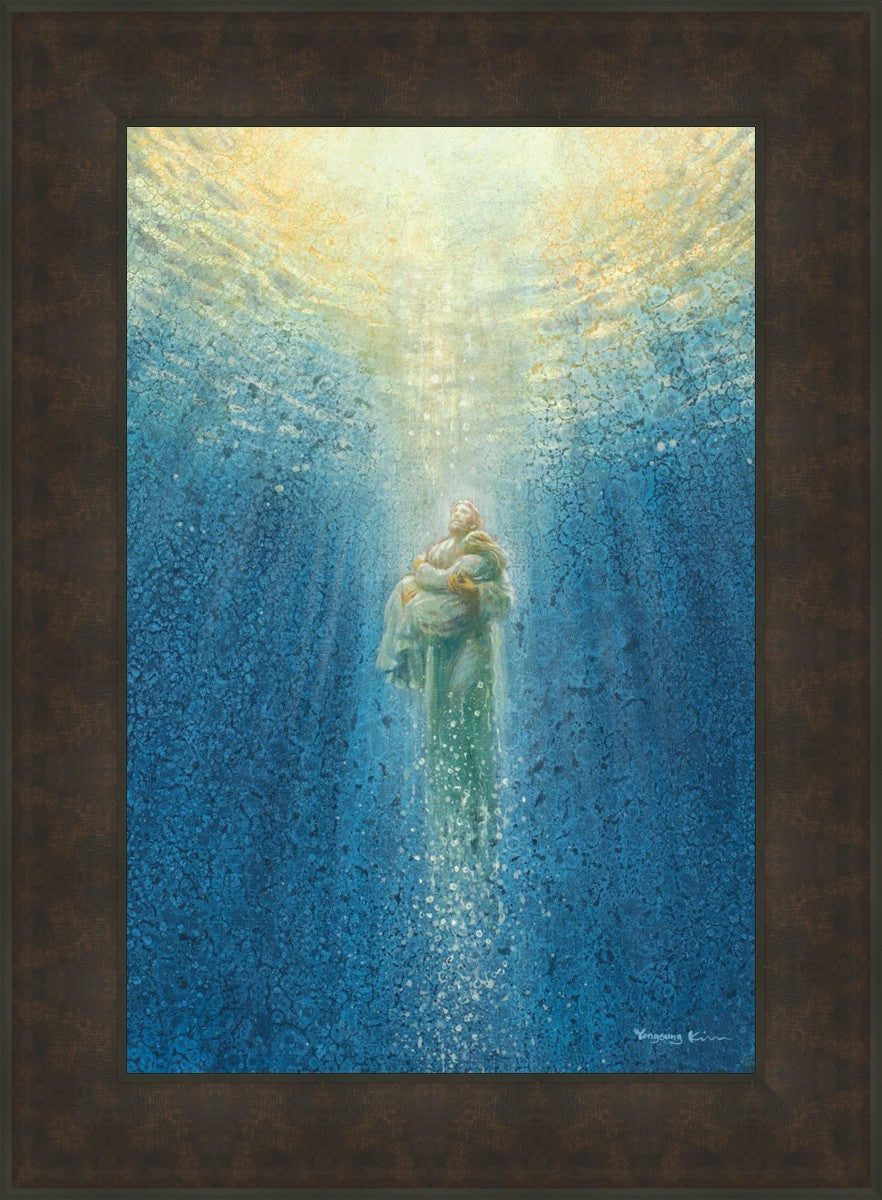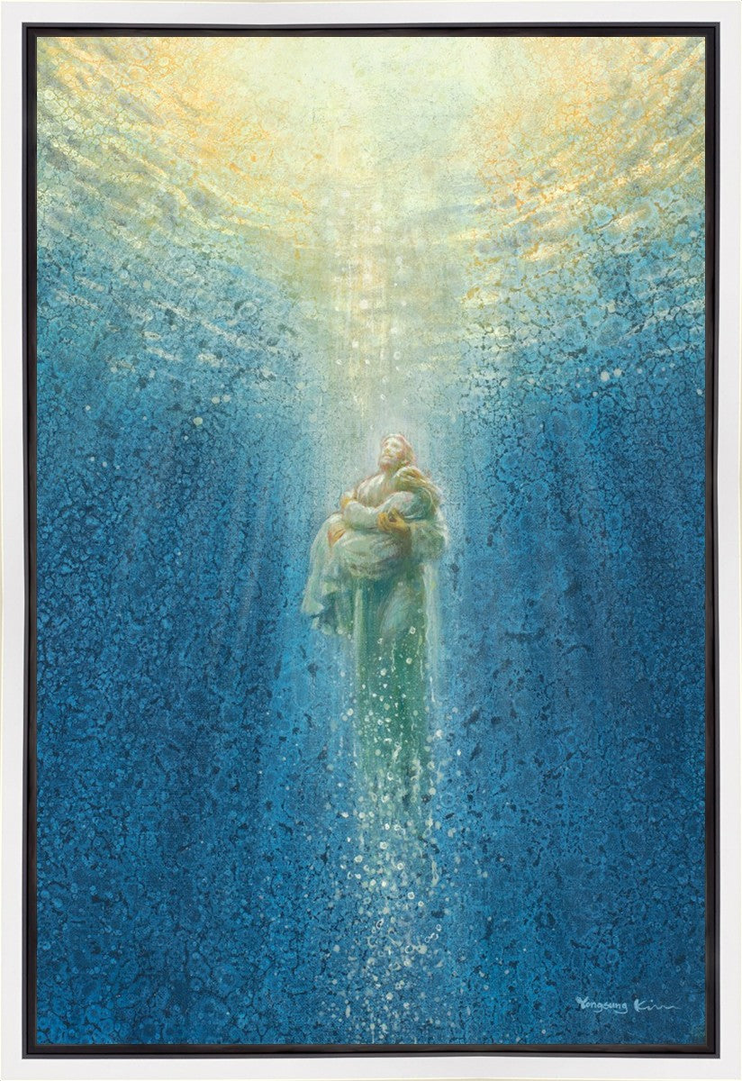 "Rescue Me" by Yongsung Kim portrays Jesus extending his hand to lift a sinking person out of deep waters, symbolizing divine rescue and salvation from despair. This artwork offers hope and reassurance to those facing adversity, reminding viewers of Jesus's unwavering presence and compassion in times of hardship and isolation.