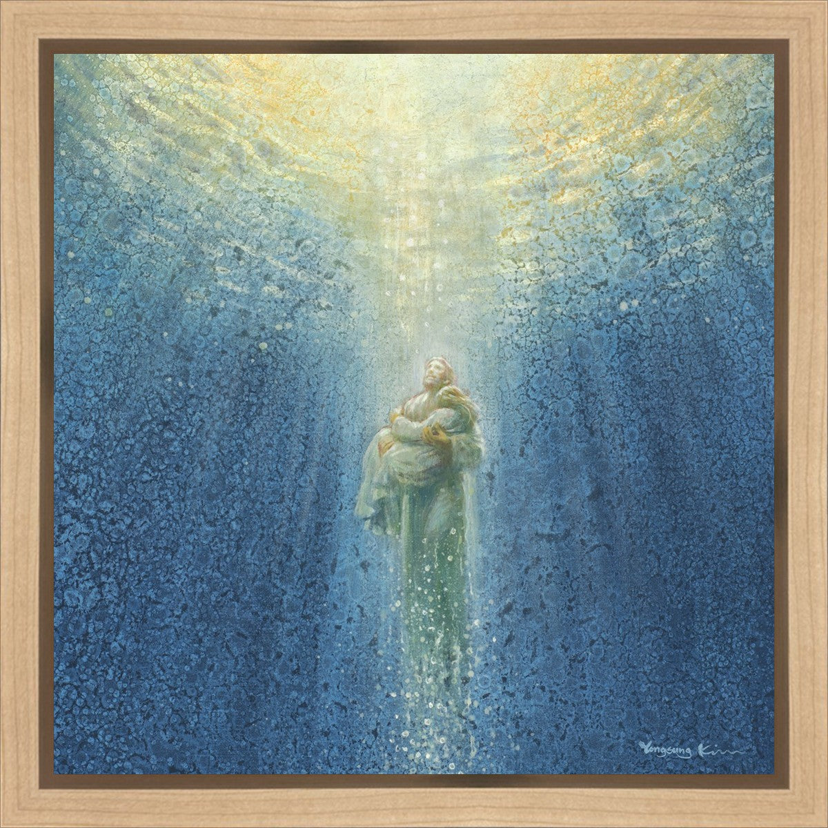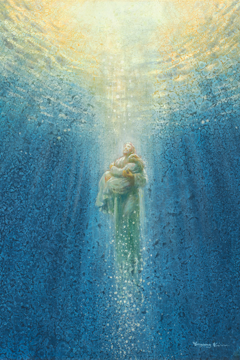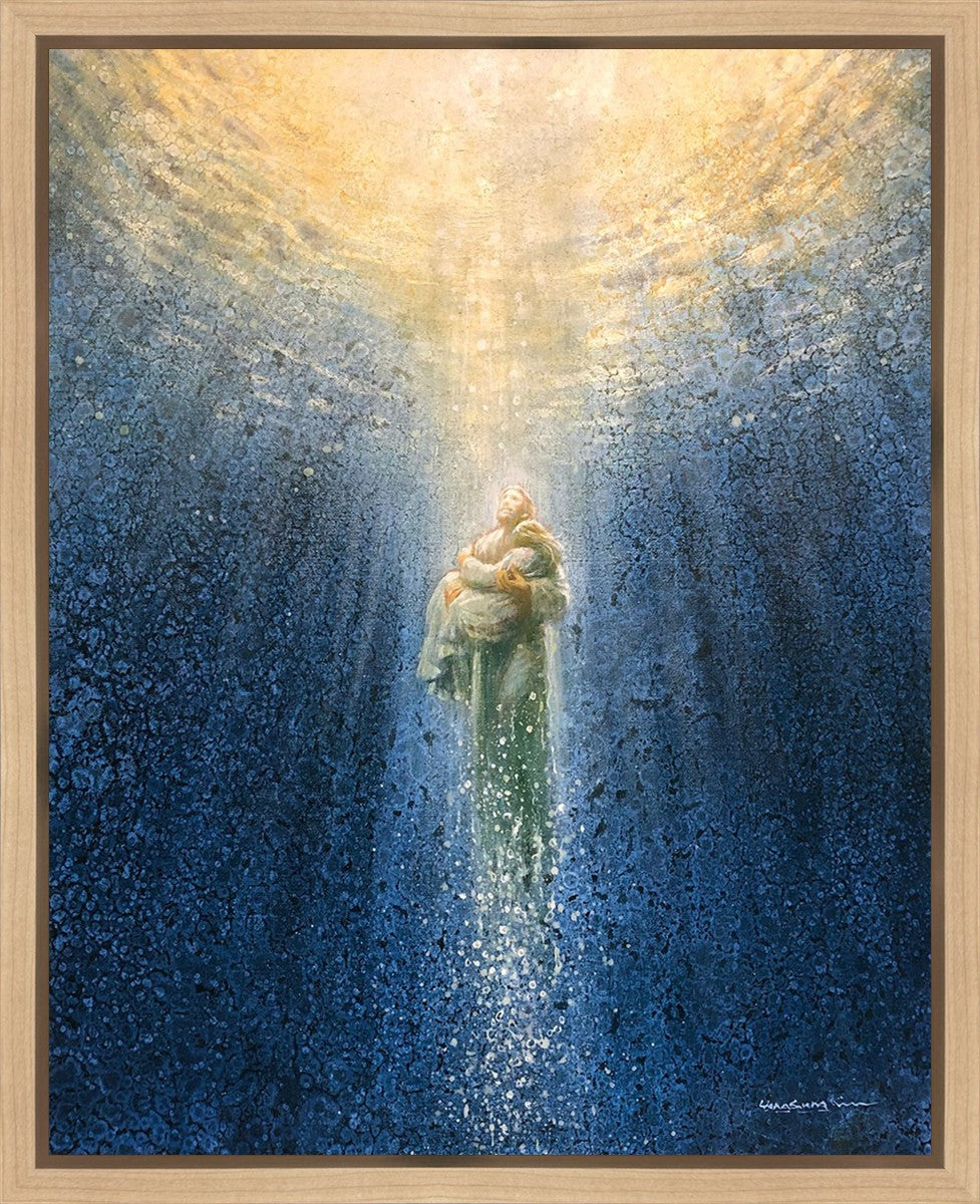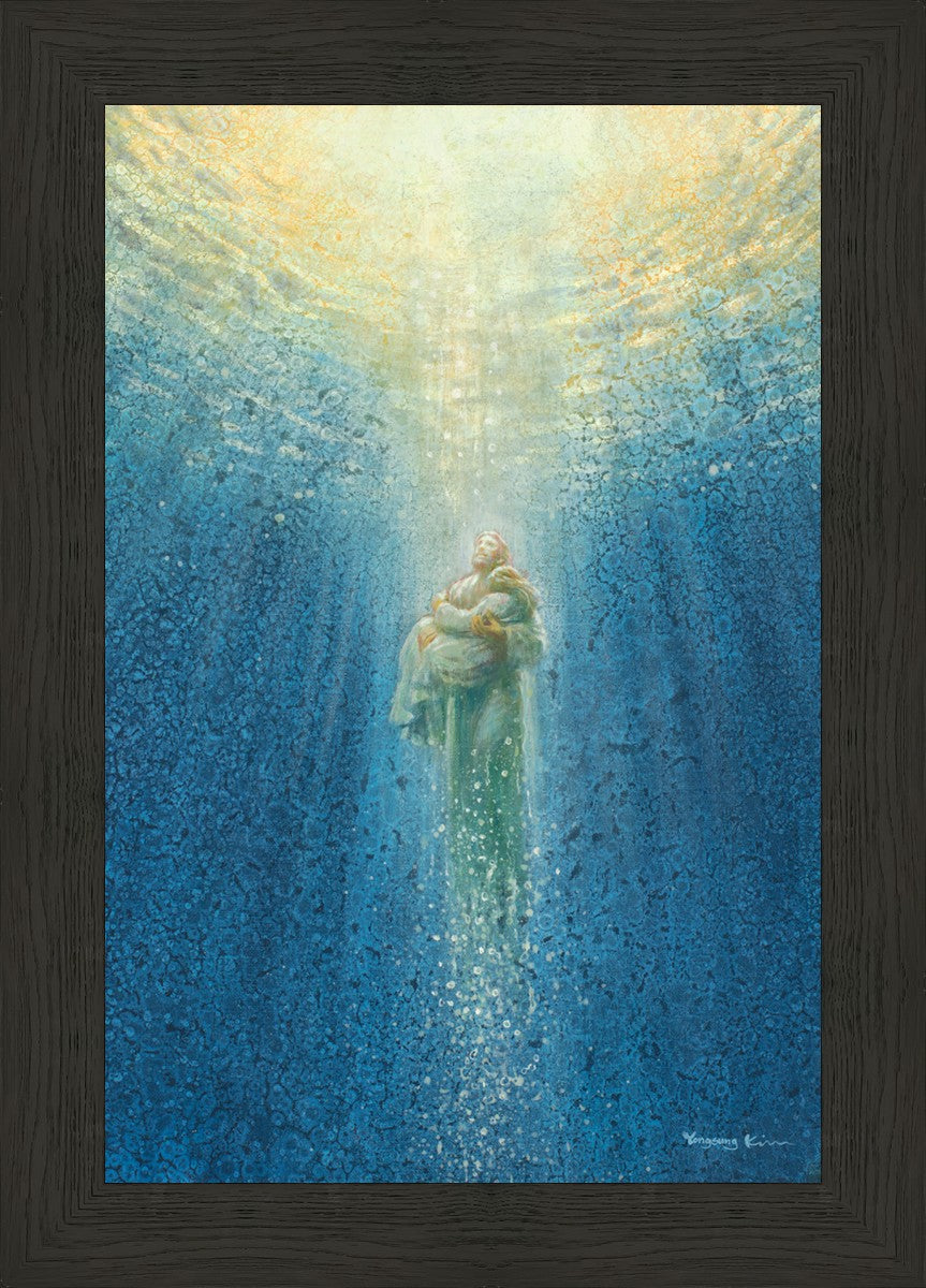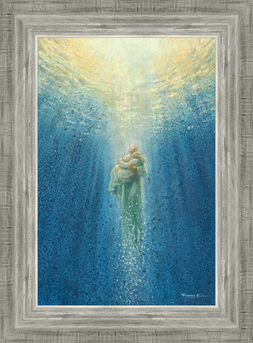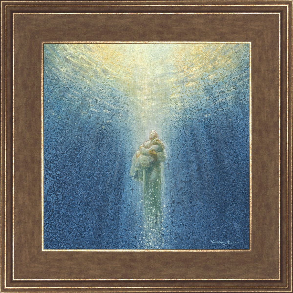 "Rescue Me" by Yongsung Kim portrays Jesus extending his hand to lift a sinking person out of deep waters, symbolizing divine rescue and salvation from despair. This artwork offers hope and reassurance to those facing adversity, reminding viewers of Jesus's unwavering presence and compassion in times of hardship and isolation.