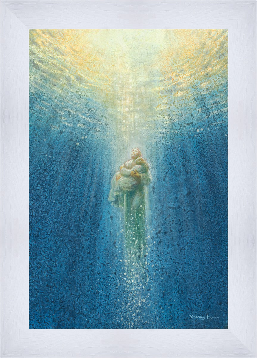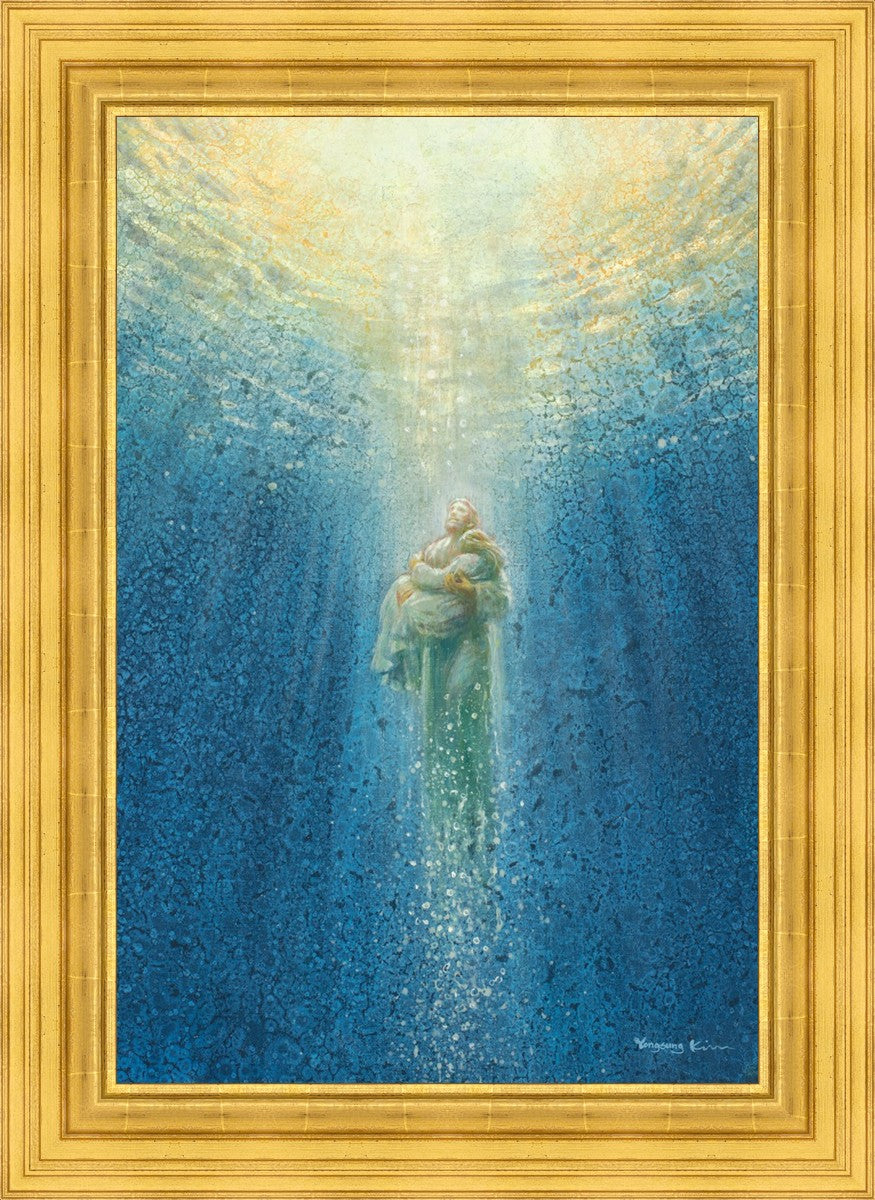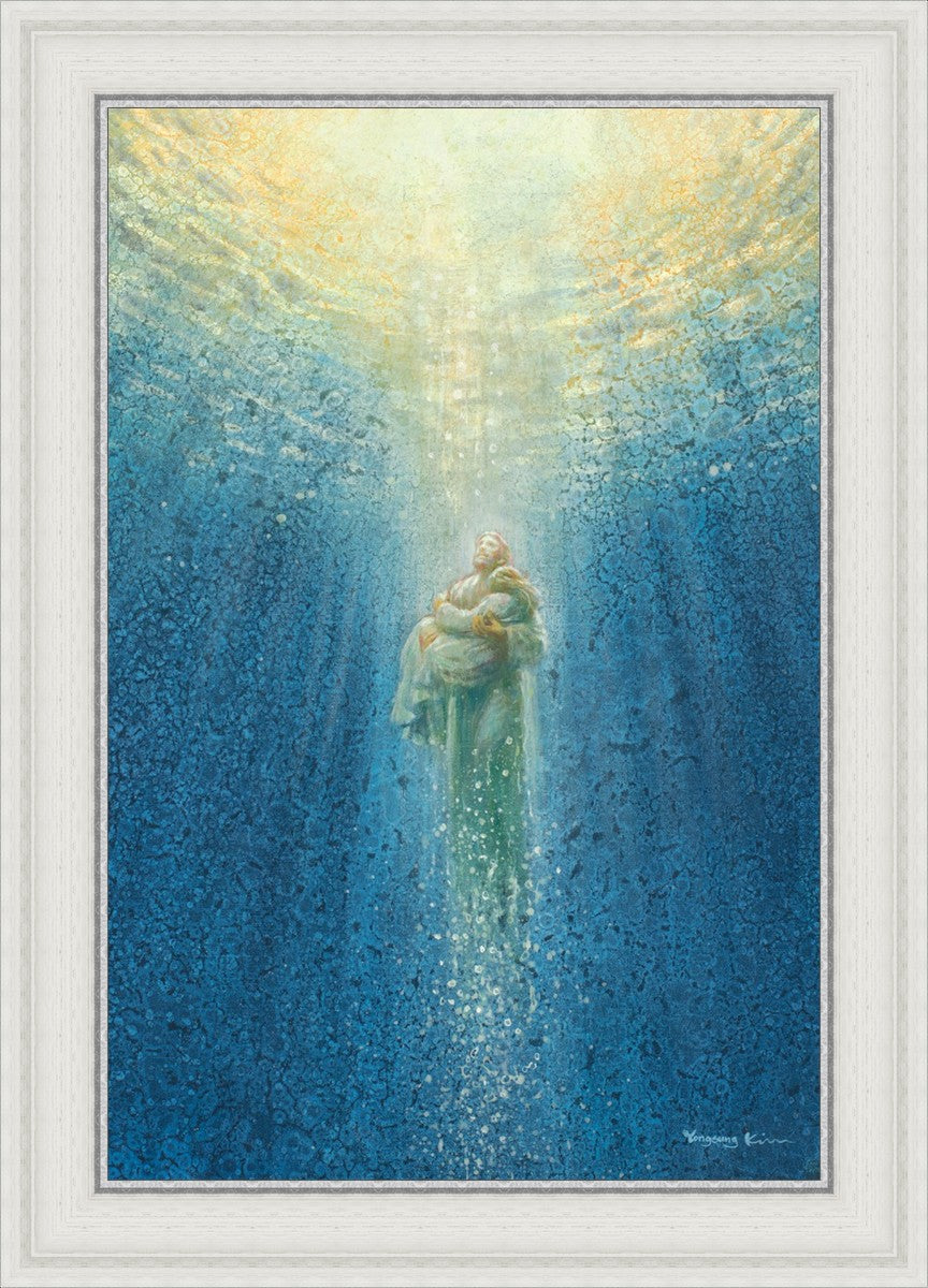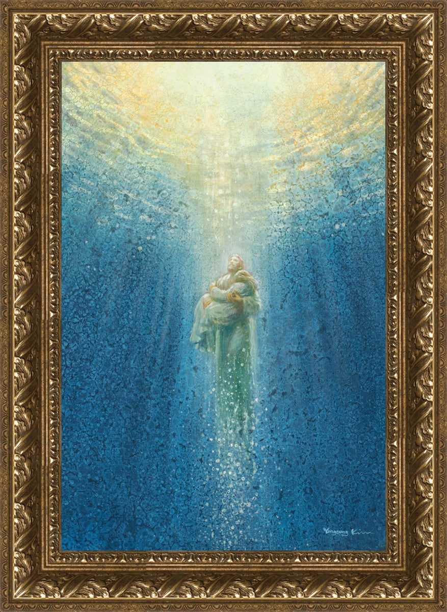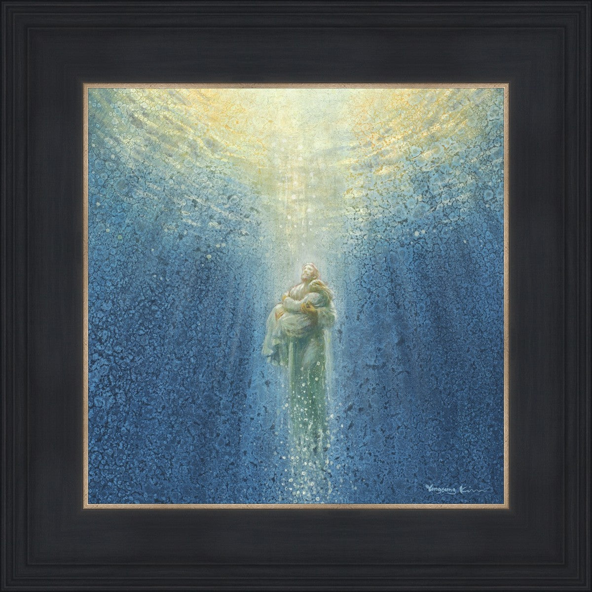 "Rescue Me" by Yongsung Kim portrays Jesus extending his hand to lift a sinking person out of deep waters, symbolizing divine rescue and salvation from despair. This artwork offers hope and reassurance to those facing adversity, reminding viewers of Jesus's unwavering presence and compassion in times of hardship and isolation.