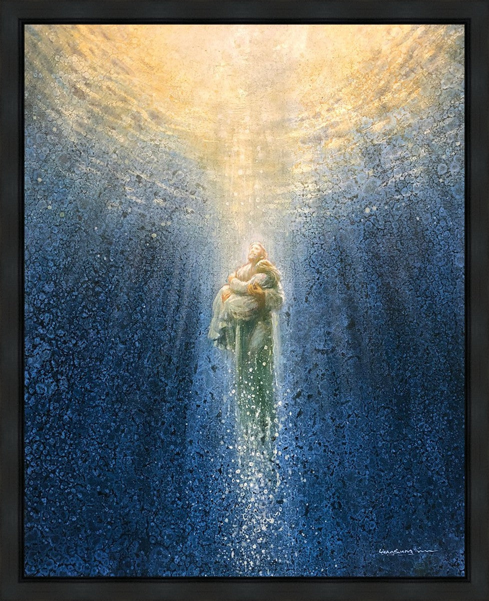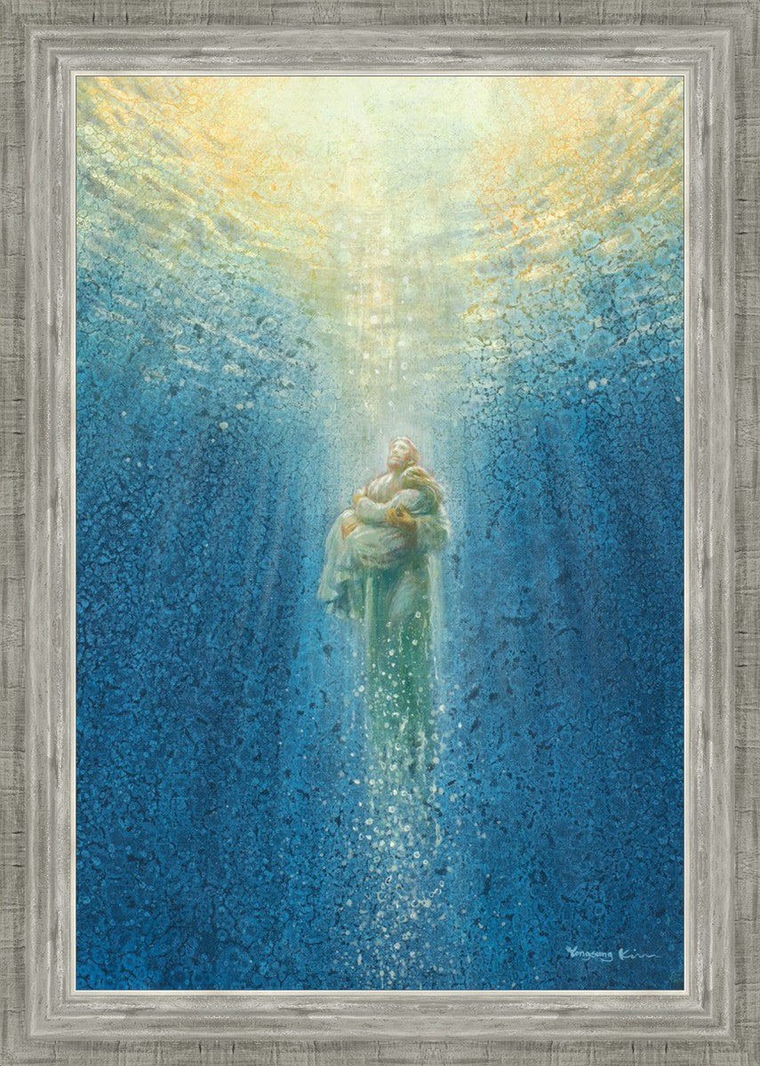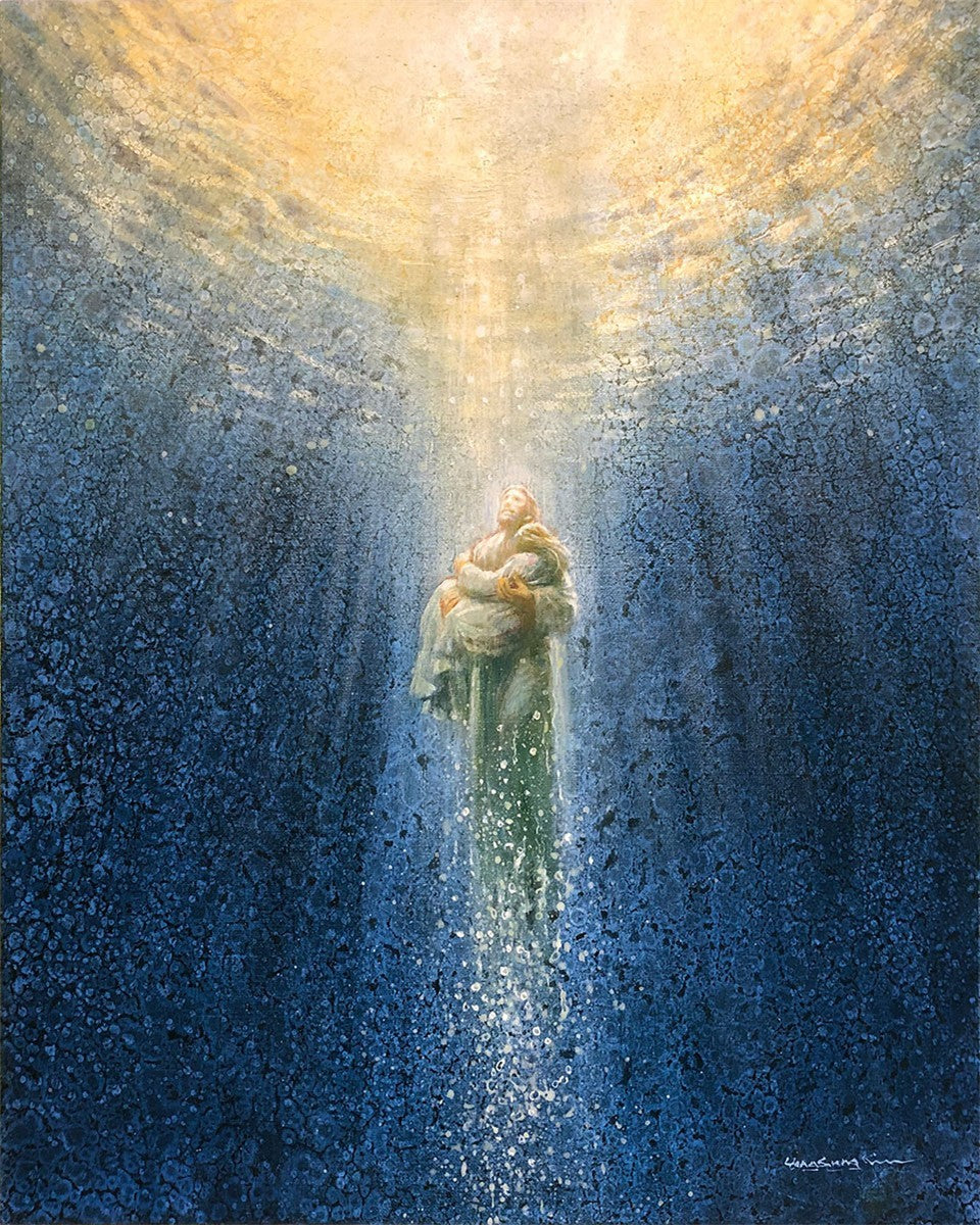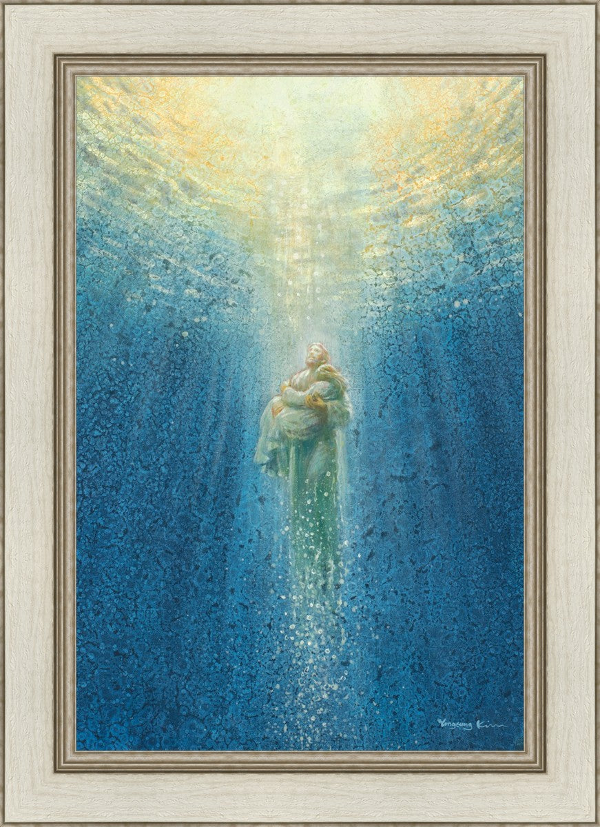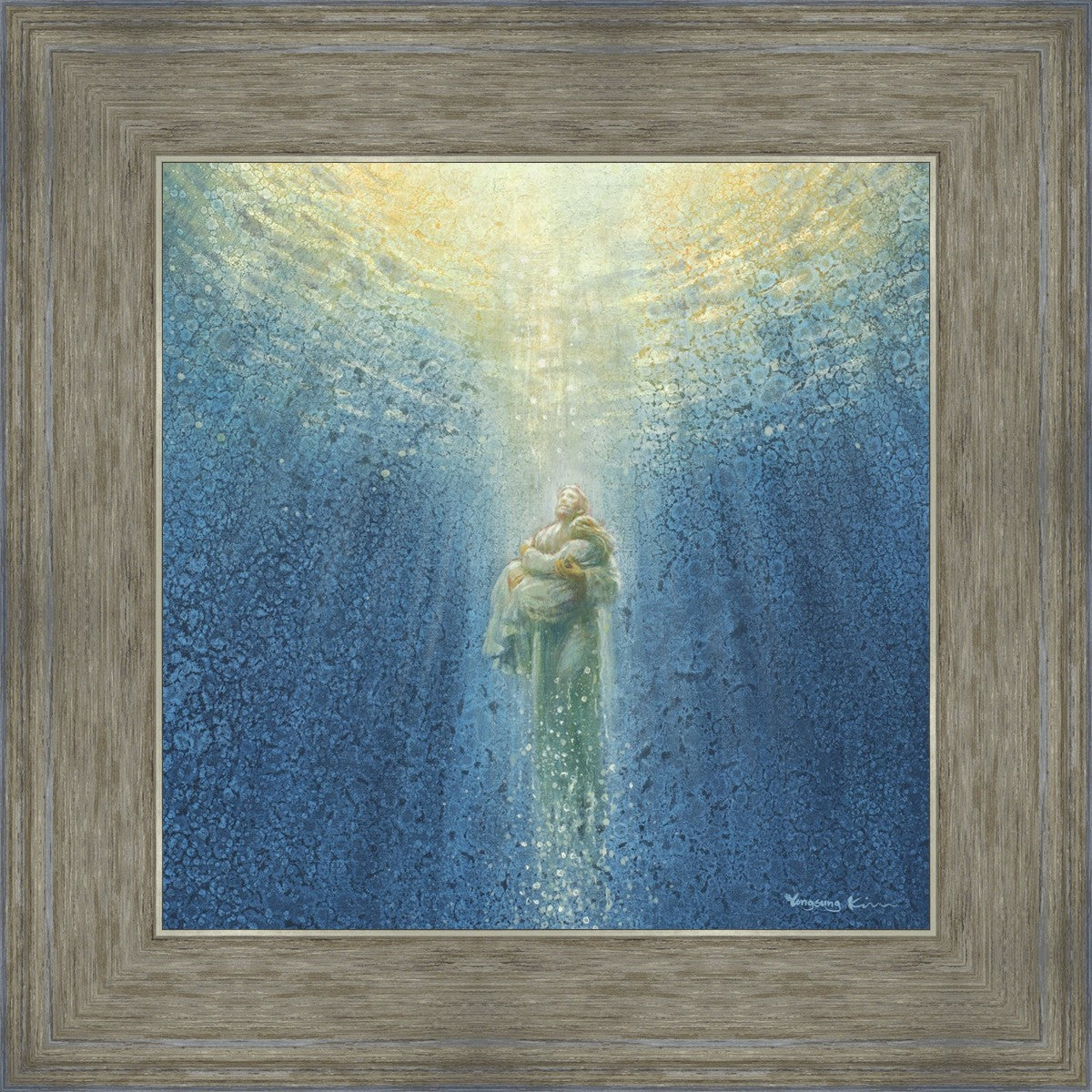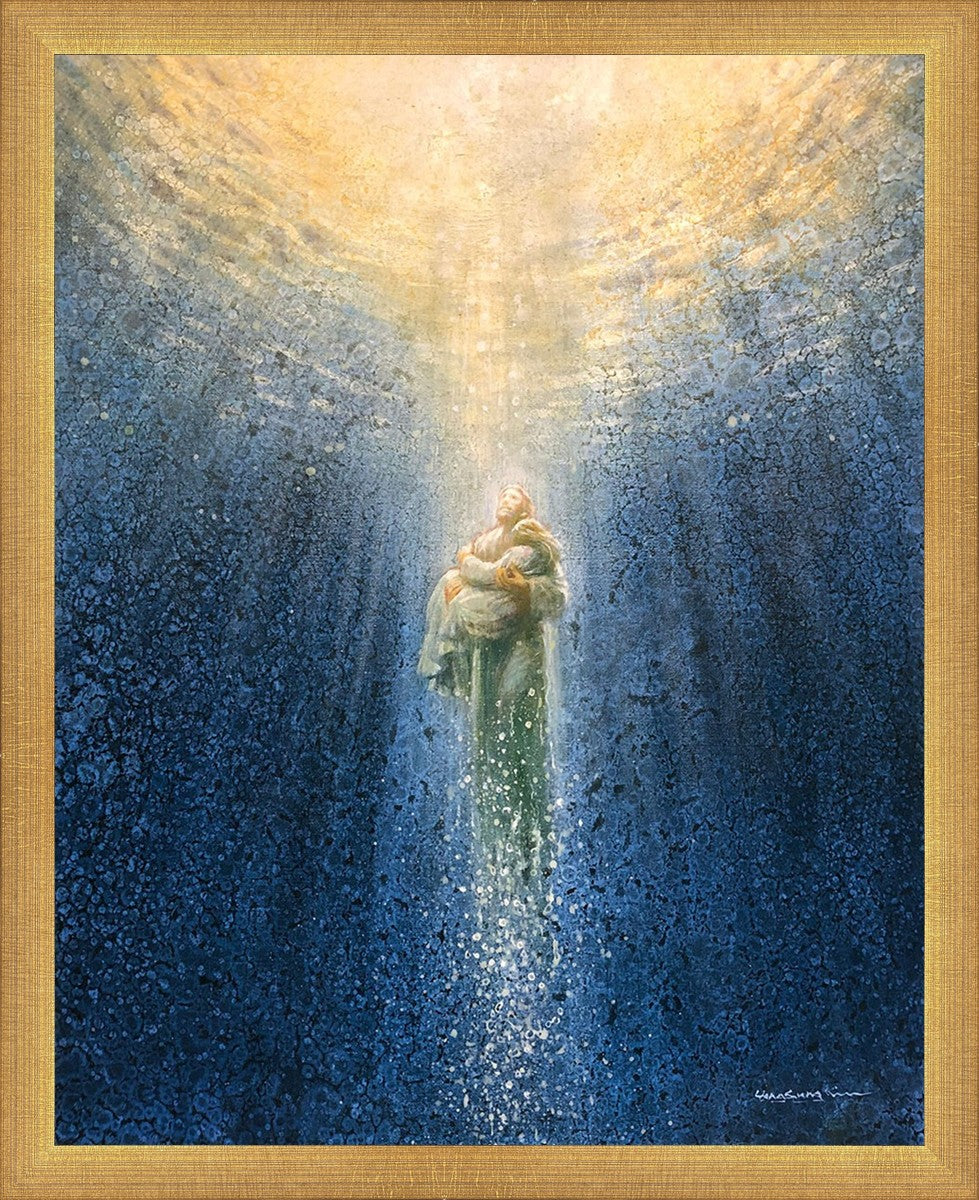 "Rescue Me" by Yongsung Kim portrays Jesus extending his hand to lift a sinking person out of deep waters, symbolizing divine rescue and salvation from despair. This artwork offers hope and reassurance to those facing adversity, reminding viewers of Jesus's unwavering presence and compassion in times of hardship and isolation.