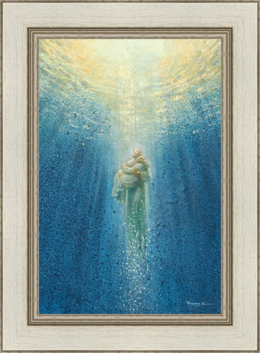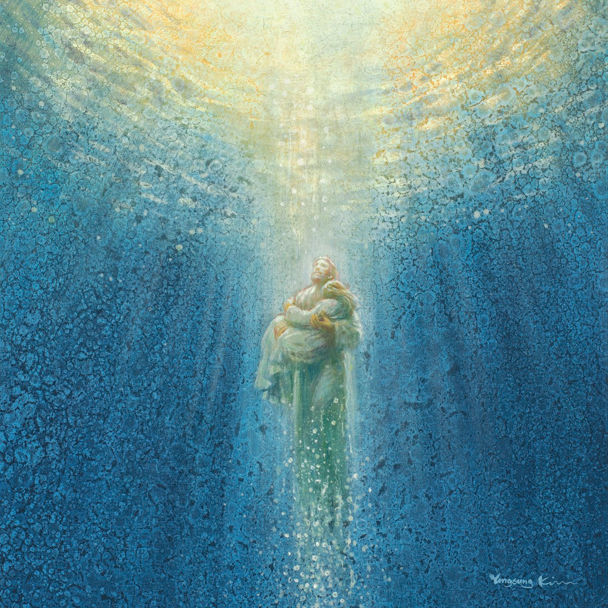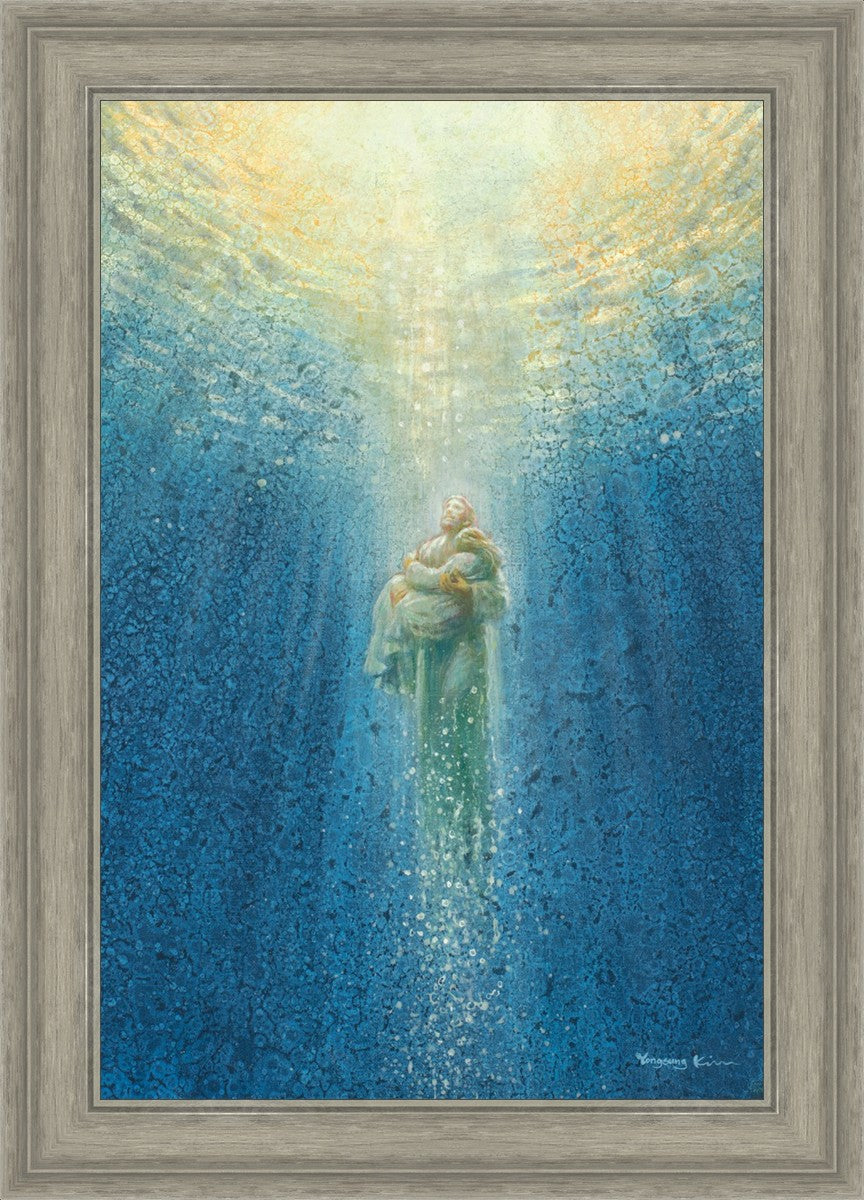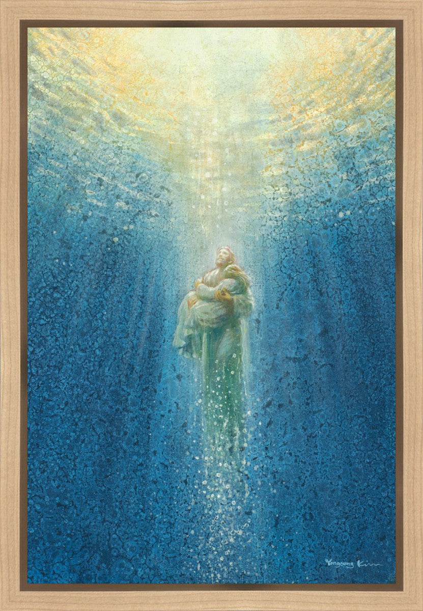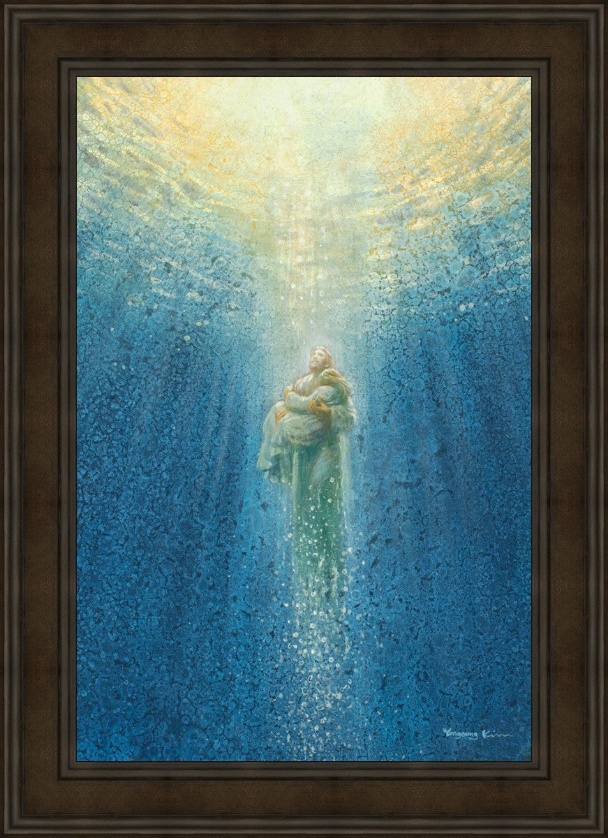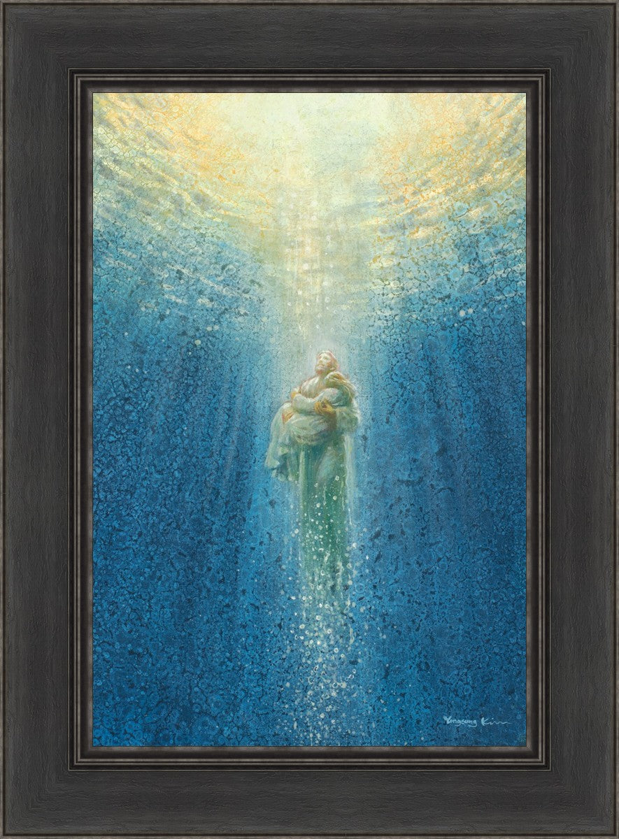 "Rescue Me" by Yongsung Kim portrays Jesus extending his hand to lift a sinking person out of deep waters, symbolizing divine rescue and salvation from despair. This artwork offers hope and reassurance to those facing adversity, reminding viewers of Jesus's unwavering presence and compassion in times of hardship and isolation.