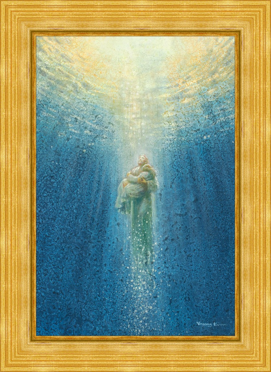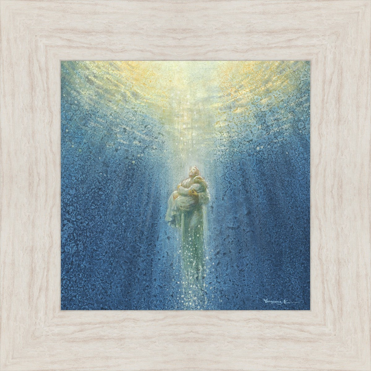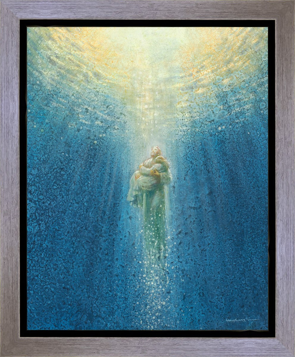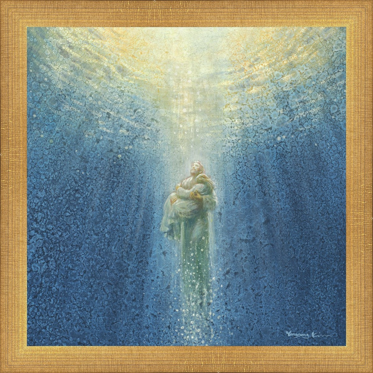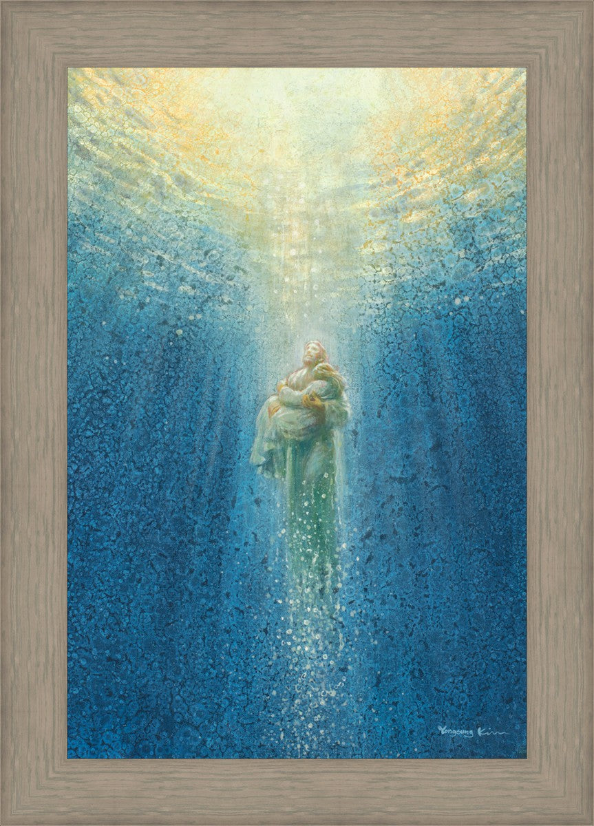 "Rescue Me" by Yongsung Kim portrays Jesus extending his hand to lift a sinking person out of deep waters, symbolizing divine rescue and salvation from despair. This artwork offers hope and reassurance to those facing adversity, reminding viewers of Jesus's unwavering presence and compassion in times of hardship and isolation.