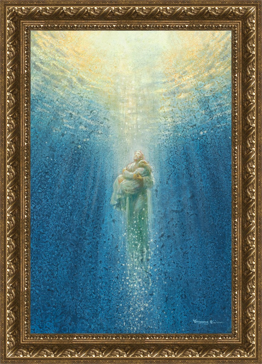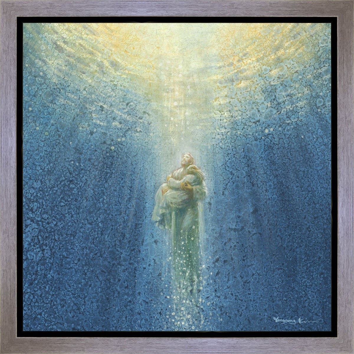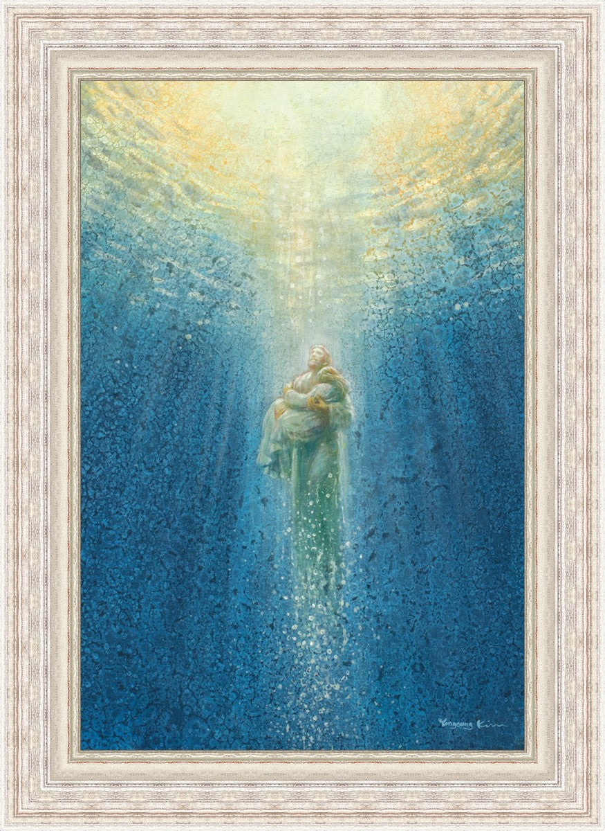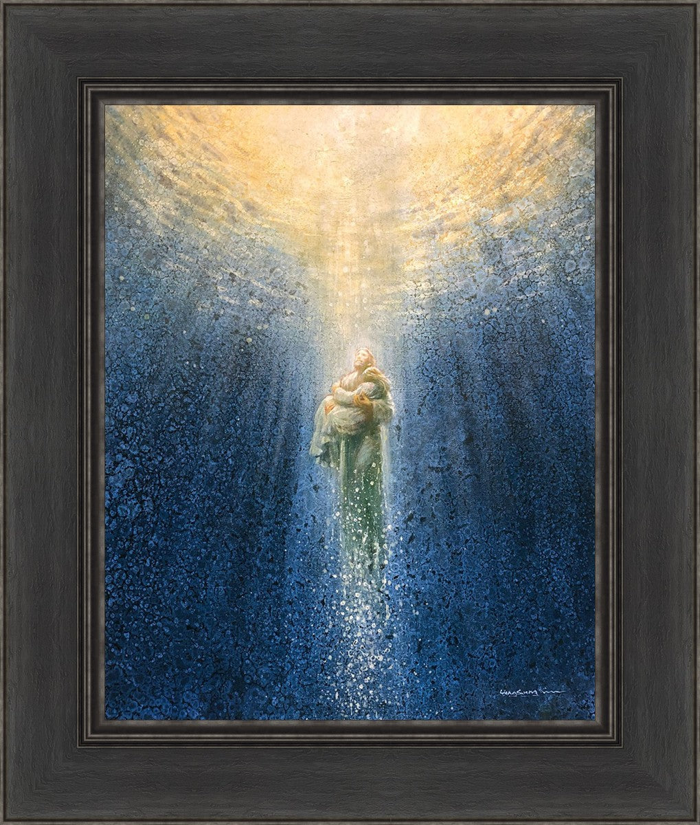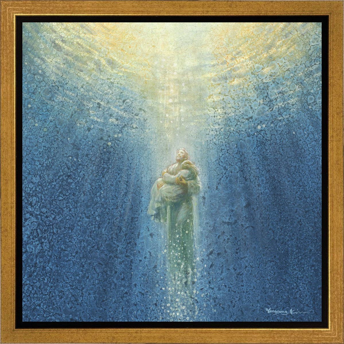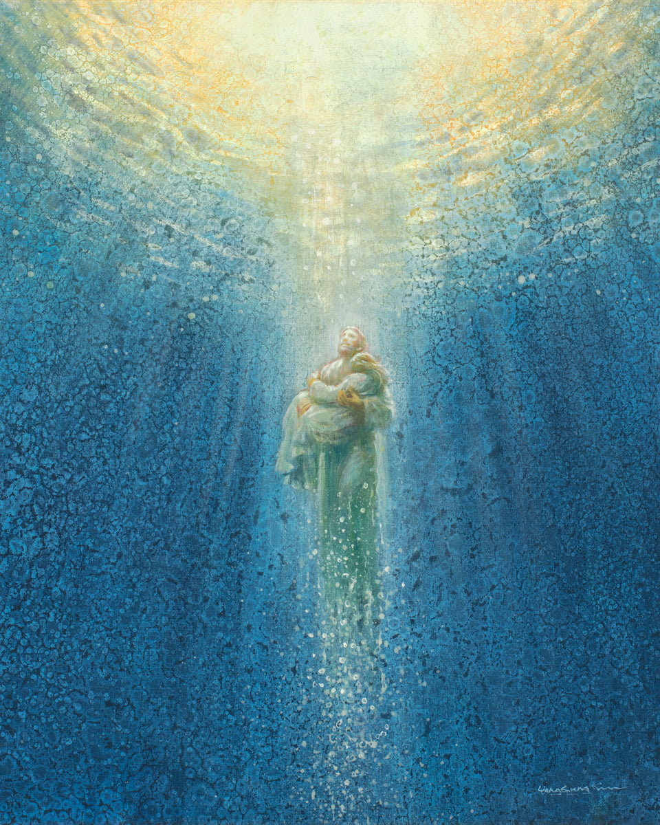 "Rescue Me" by Yongsung Kim portrays Jesus extending his hand to lift a sinking person out of deep waters, symbolizing divine rescue and salvation from despair. This artwork offers hope and reassurance to those facing adversity, reminding viewers of Jesus's unwavering presence and compassion in times of hardship and isolation.