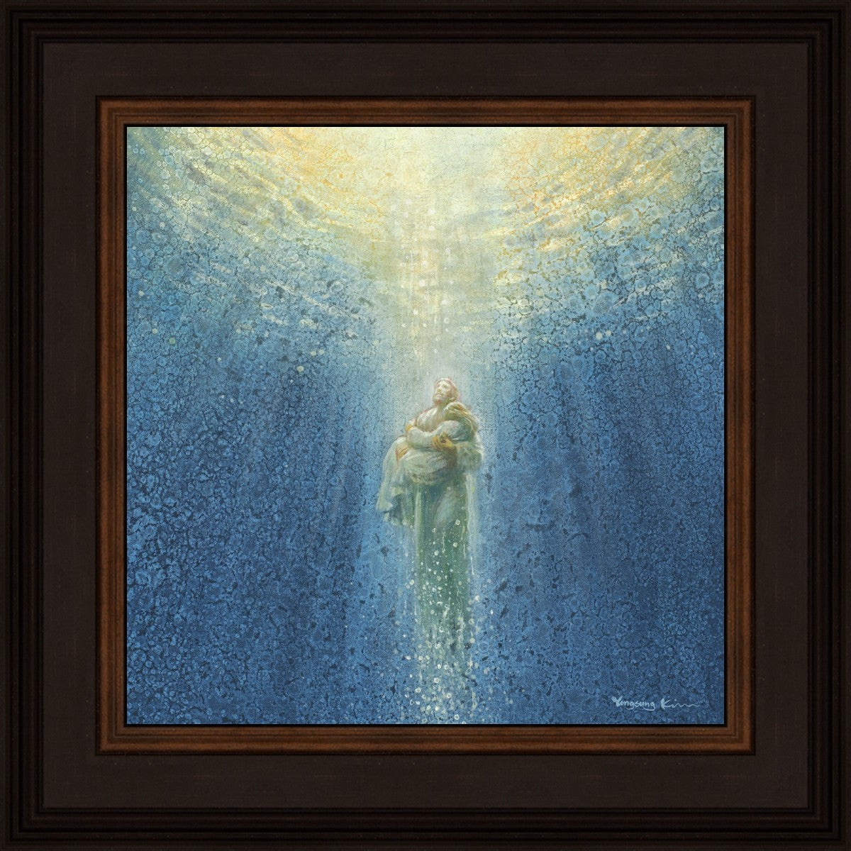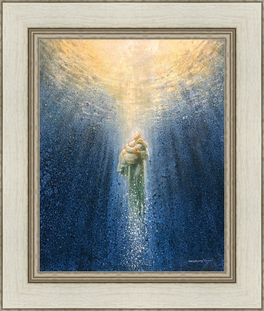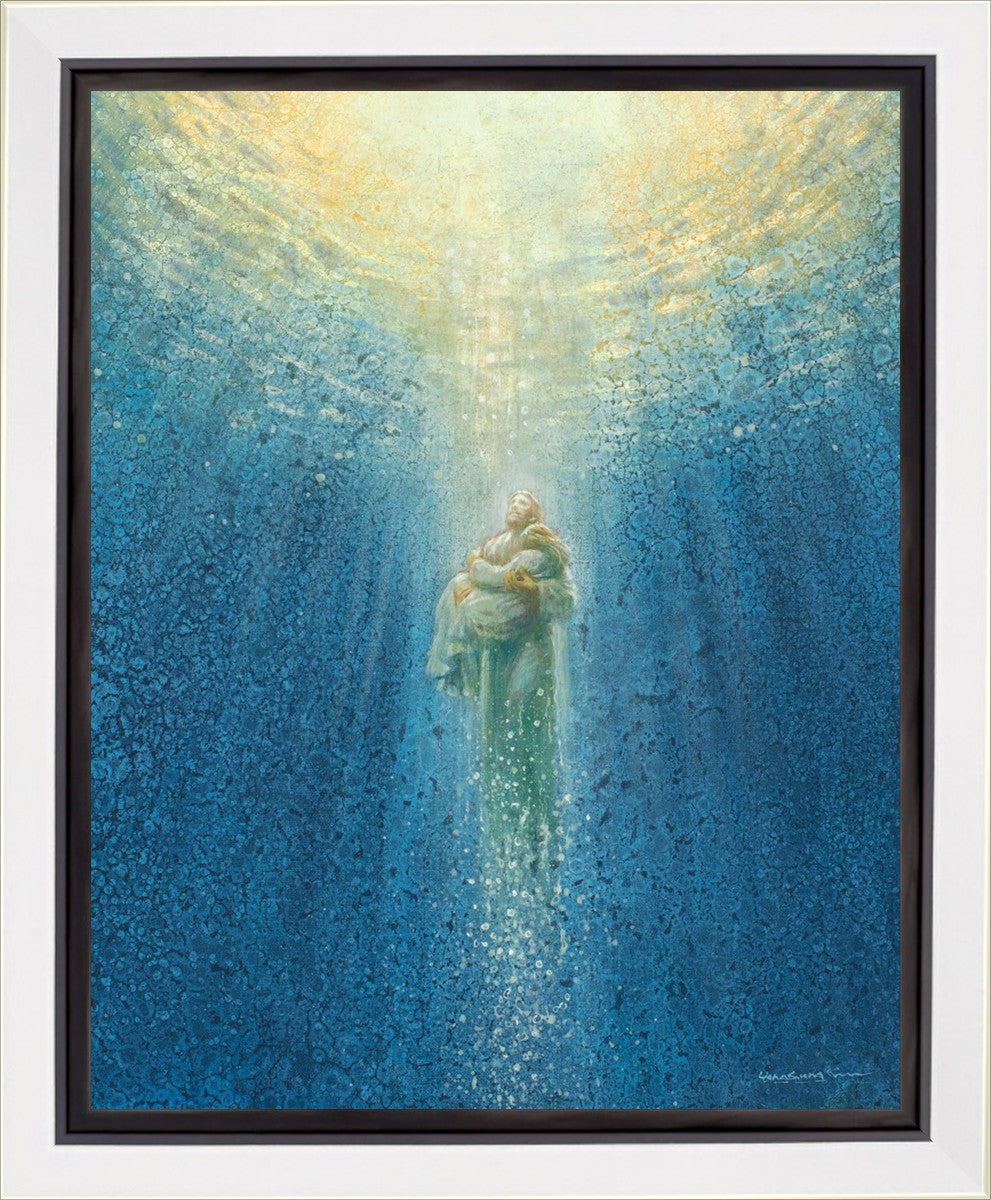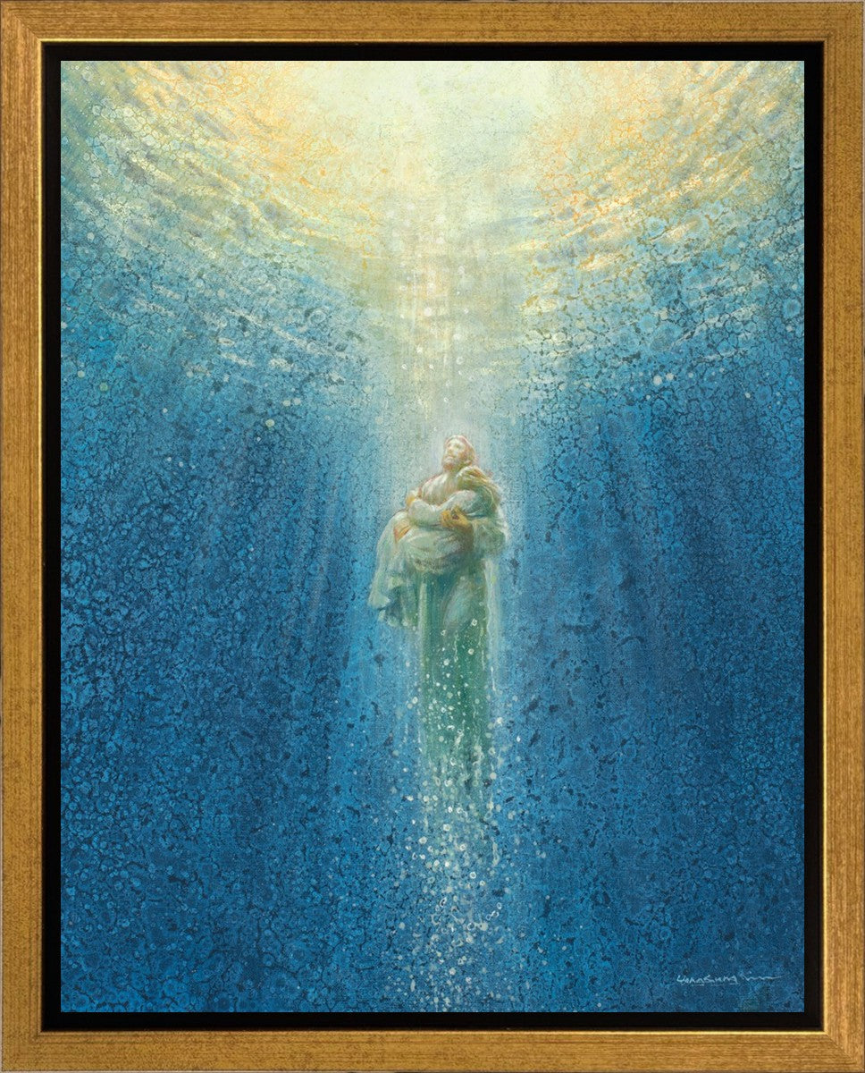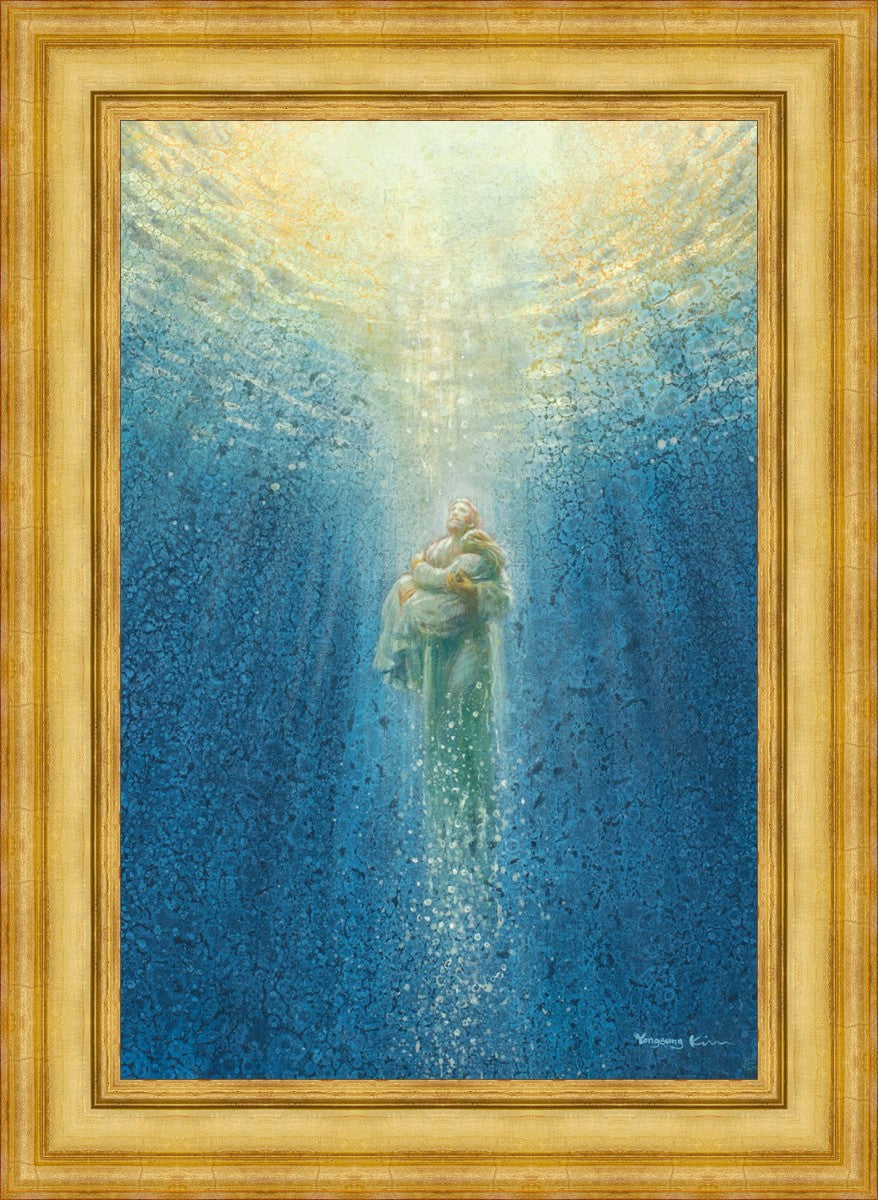 "Rescue Me" by Yongsung Kim portrays Jesus extending his hand to lift a sinking person out of deep waters, symbolizing divine rescue and salvation from despair. This artwork offers hope and reassurance to those facing adversity, reminding viewers of Jesus's unwavering presence and compassion in times of hardship and isolation.