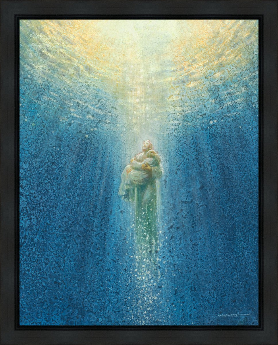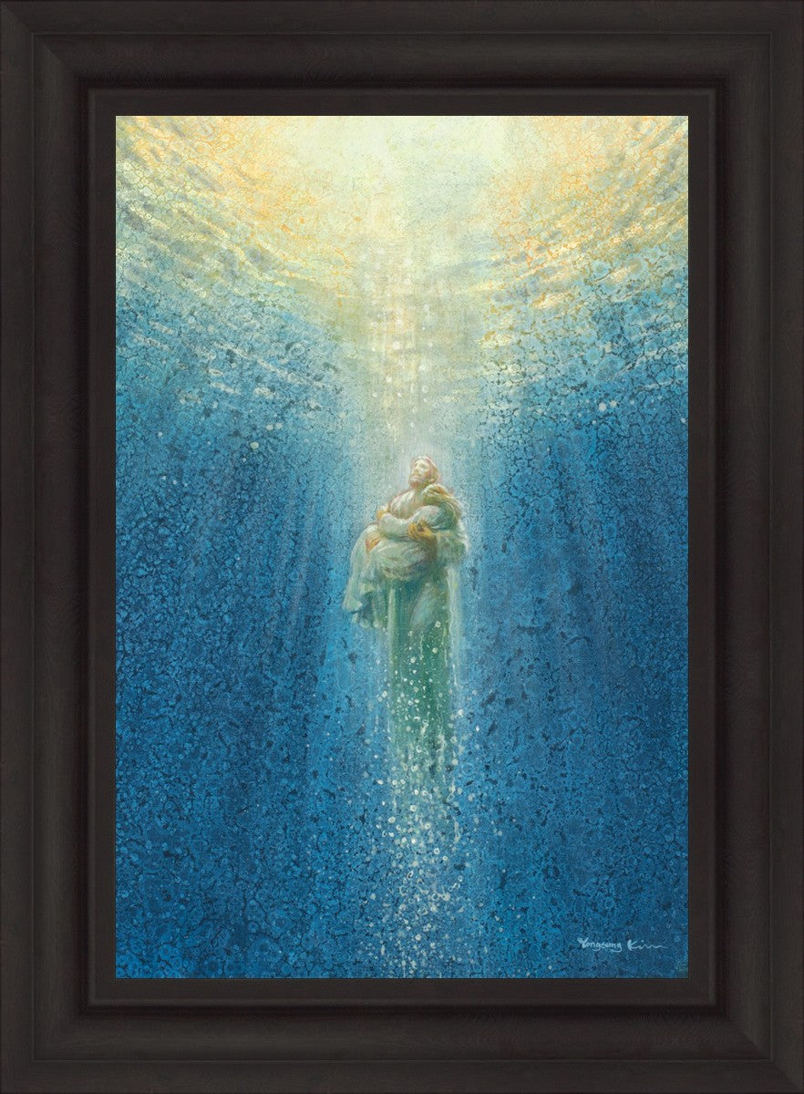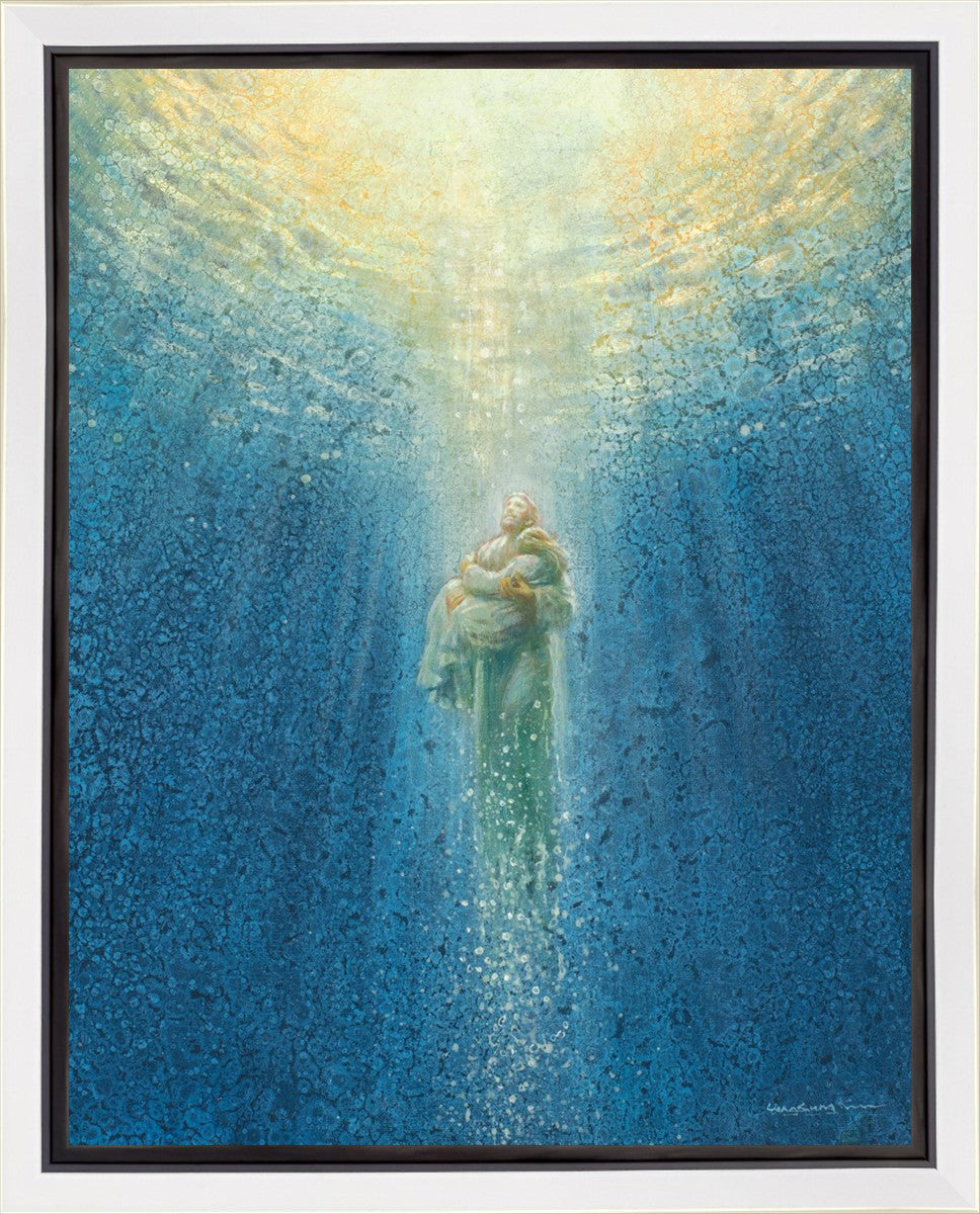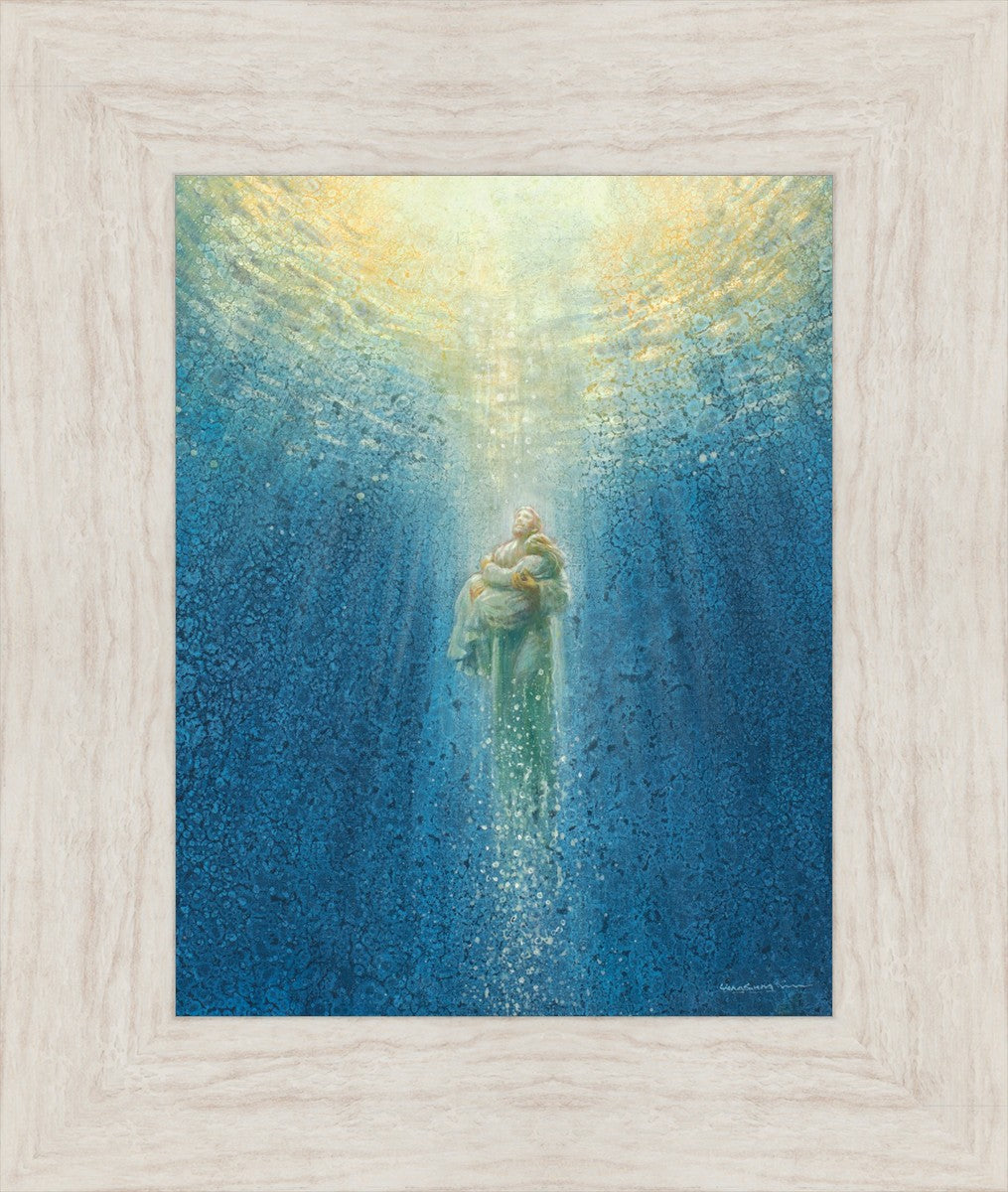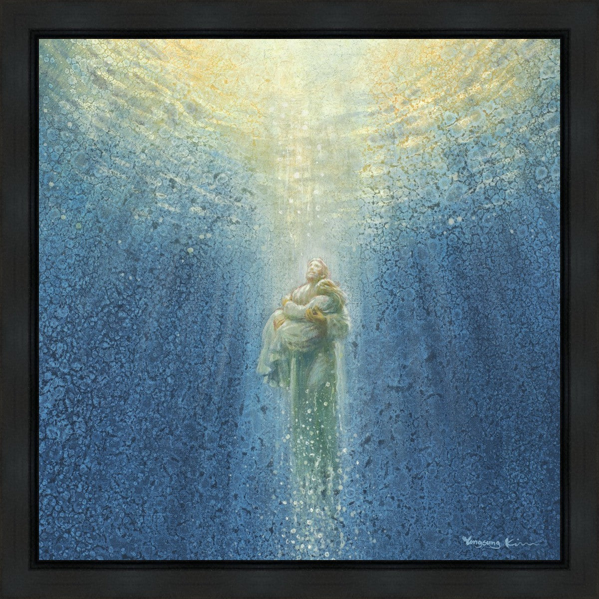 "Rescue Me" by Yongsung Kim portrays Jesus extending his hand to lift a sinking person out of deep waters, symbolizing divine rescue and salvation from despair. This artwork offers hope and reassurance to those facing adversity, reminding viewers of Jesus's unwavering presence and compassion in times of hardship and isolation.