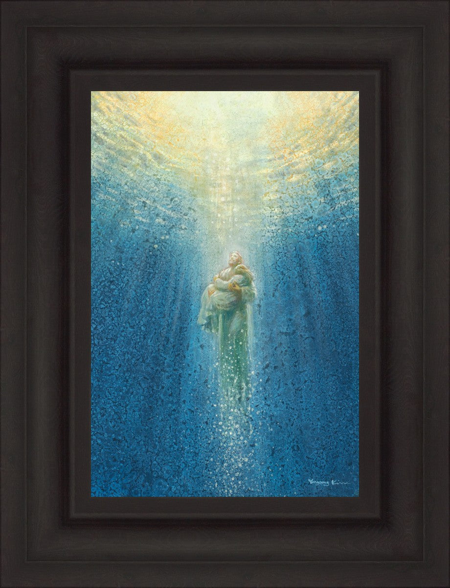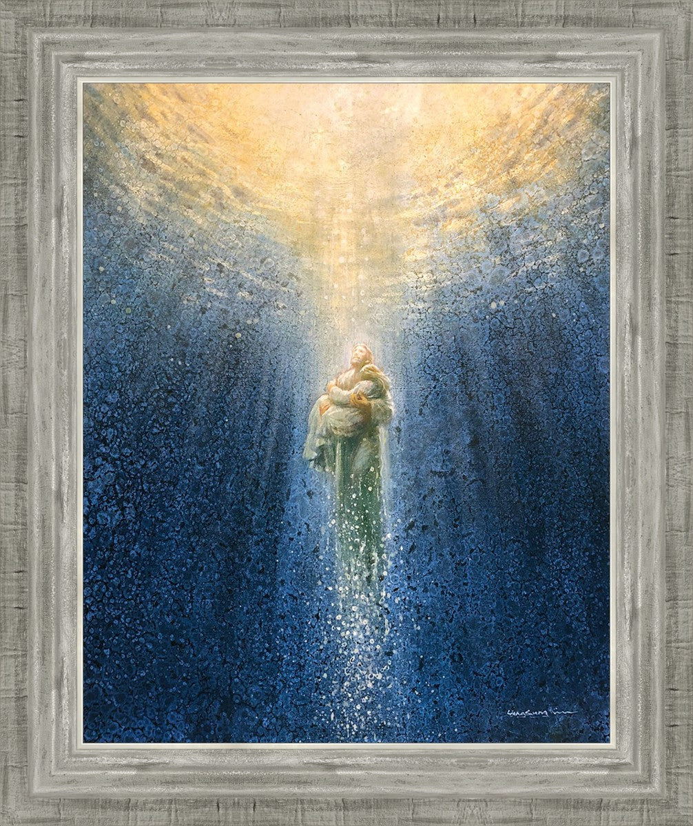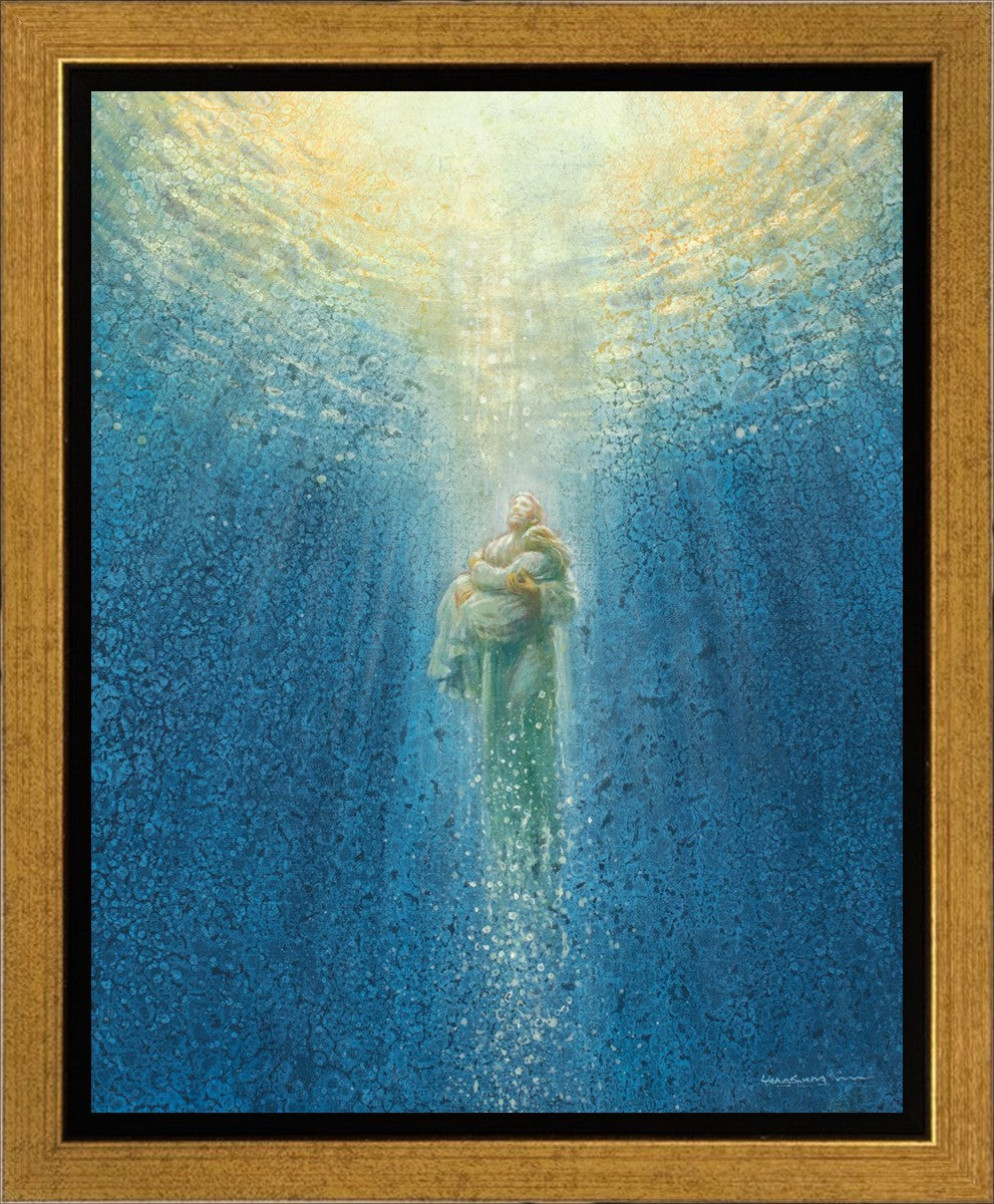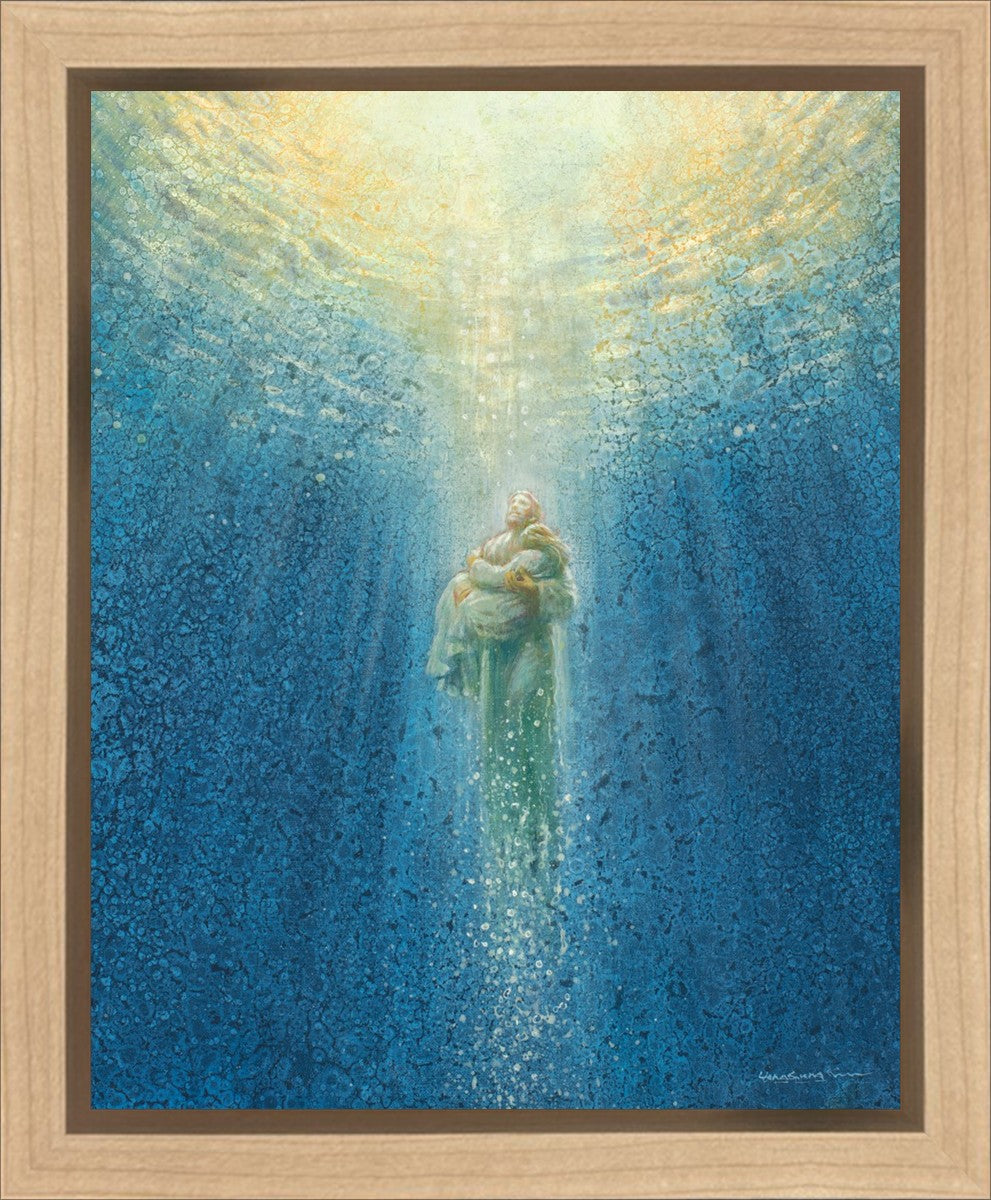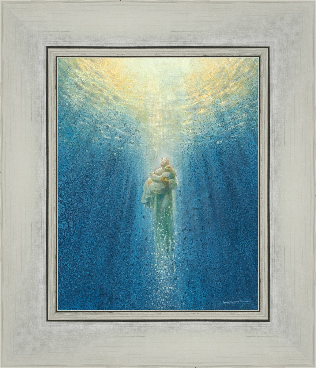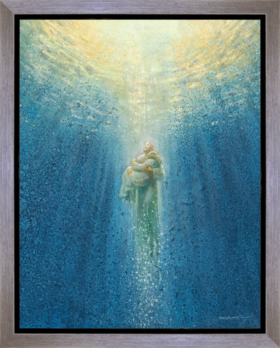 "Rescue Me" by Yongsung Kim portrays Jesus extending his hand to lift a sinking person out of deep waters, symbolizing divine rescue and salvation from despair. This artwork offers hope and reassurance to those facing adversity, reminding viewers of Jesus's unwavering presence and compassion in times of hardship and isolation.