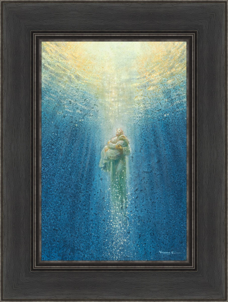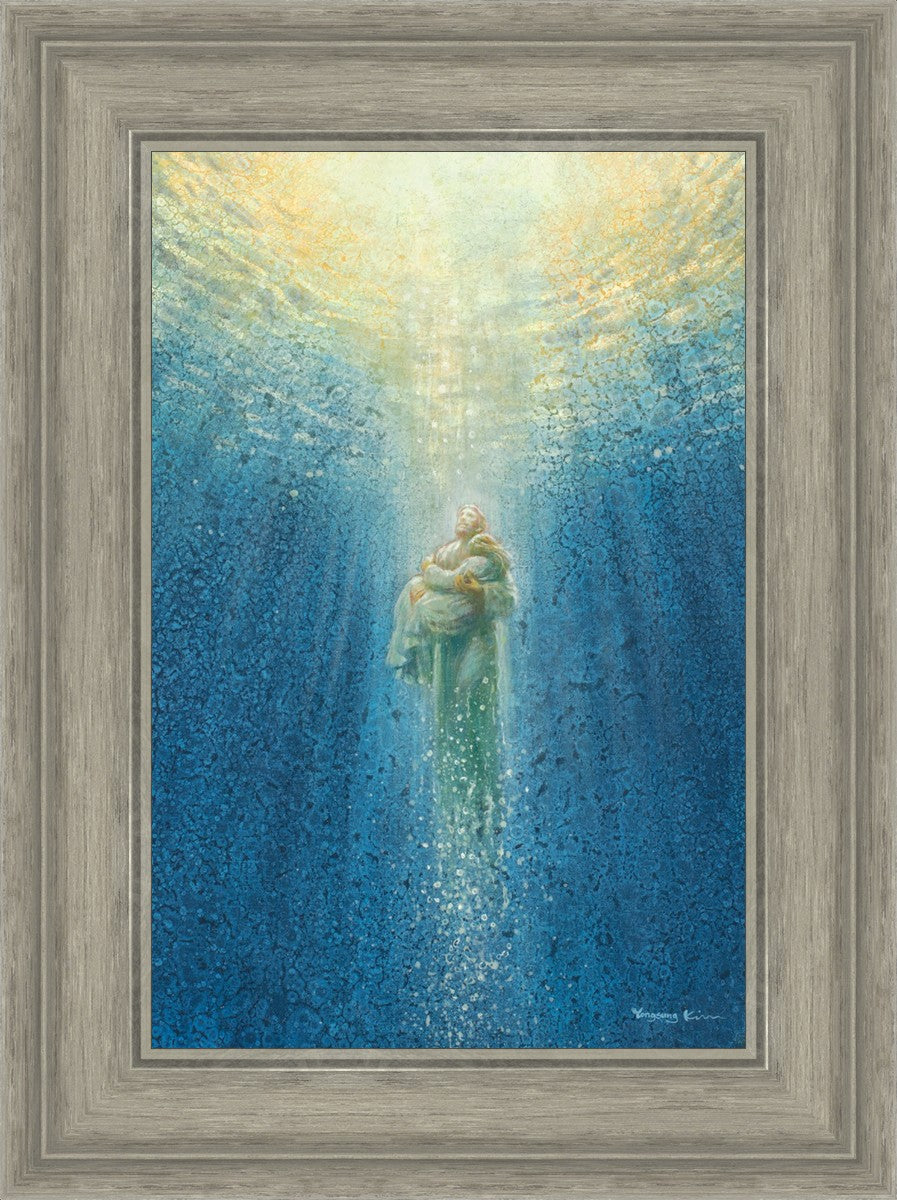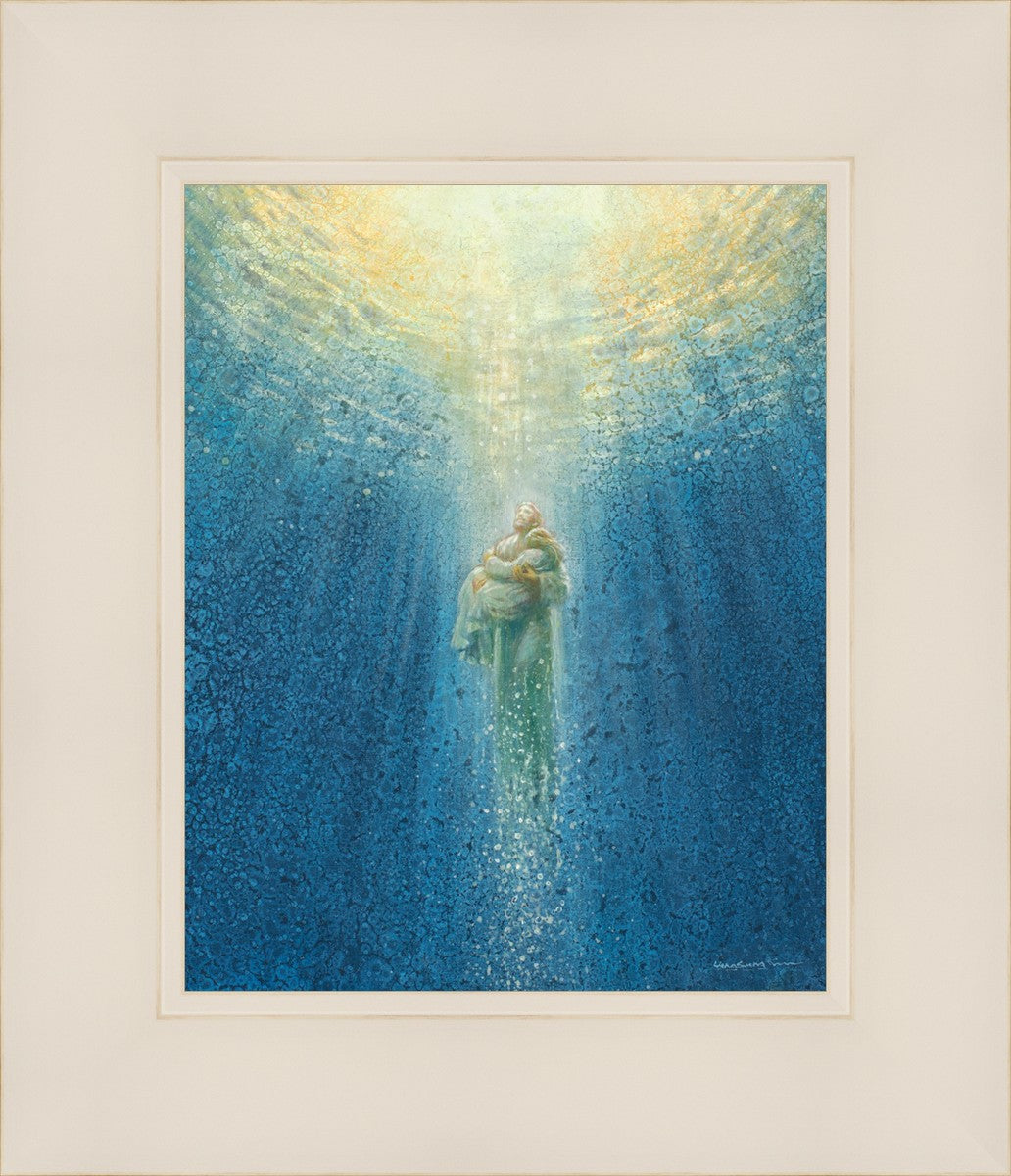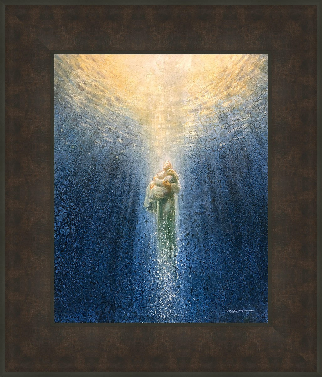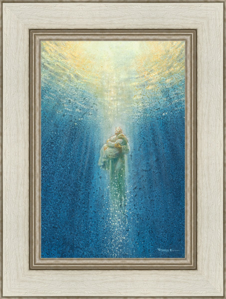 "Rescue Me" by Yongsung Kim portrays Jesus extending his hand to lift a sinking person out of deep waters, symbolizing divine rescue and salvation from despair. This artwork offers hope and reassurance to those facing adversity, reminding viewers of Jesus's unwavering presence and compassion in times of hardship and isolation.
