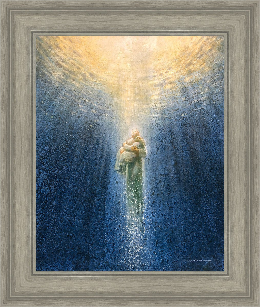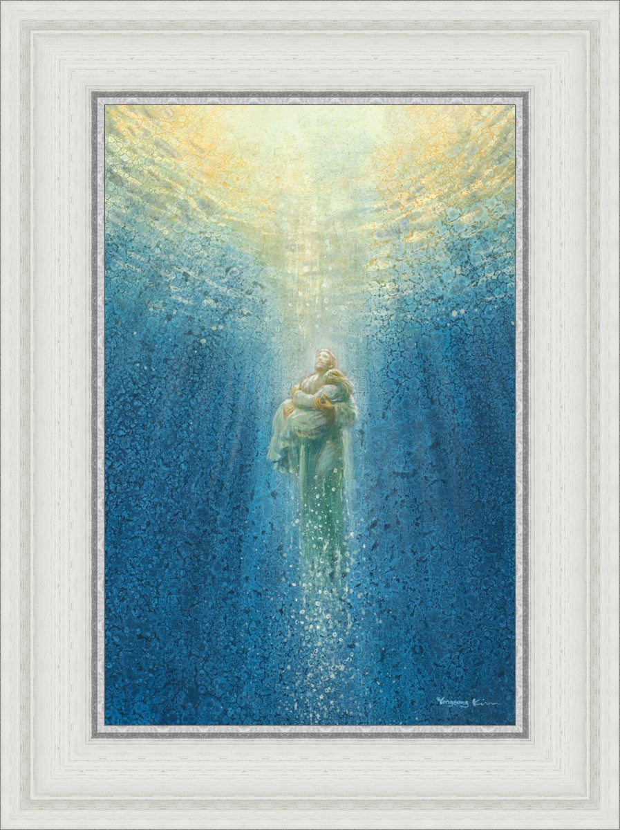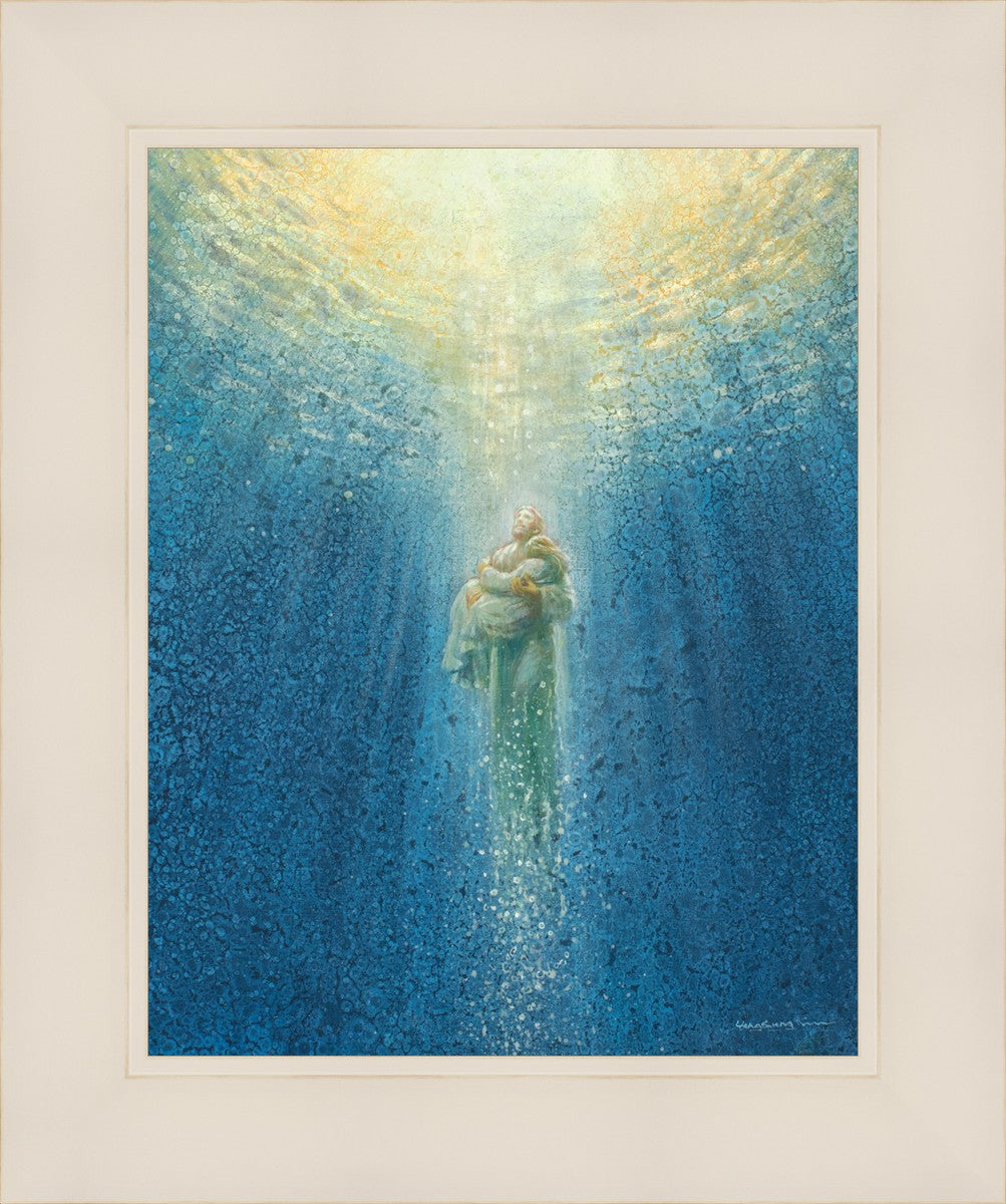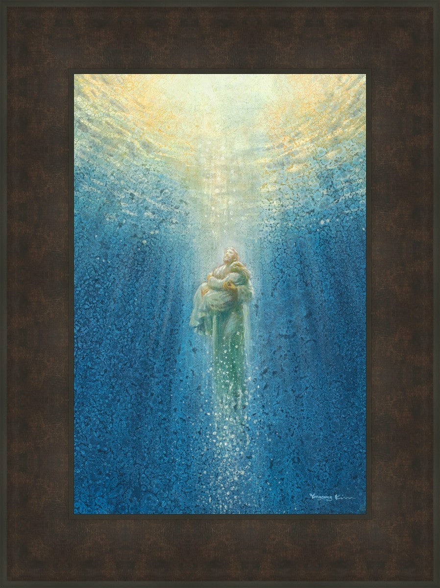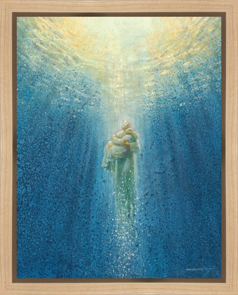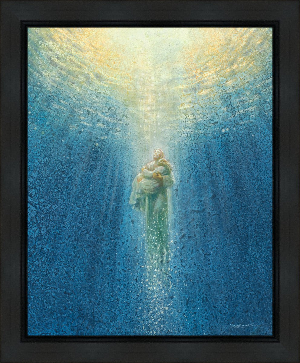 "Rescue Me" by Yongsung Kim portrays Jesus extending his hand to lift a sinking person out of deep waters, symbolizing divine rescue and salvation from despair. This artwork offers hope and reassurance to those facing adversity, reminding viewers of Jesus's unwavering presence and compassion in times of hardship and isolation.