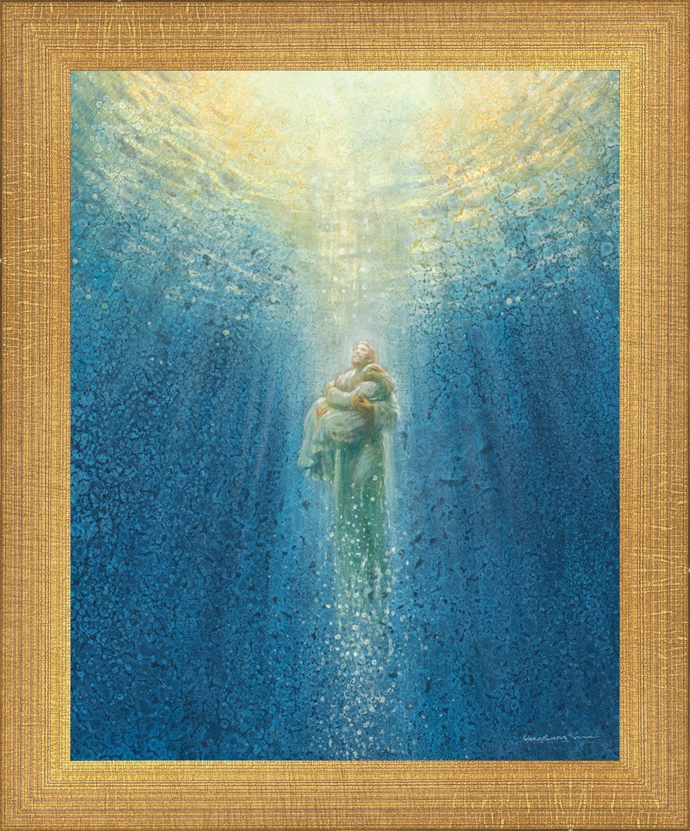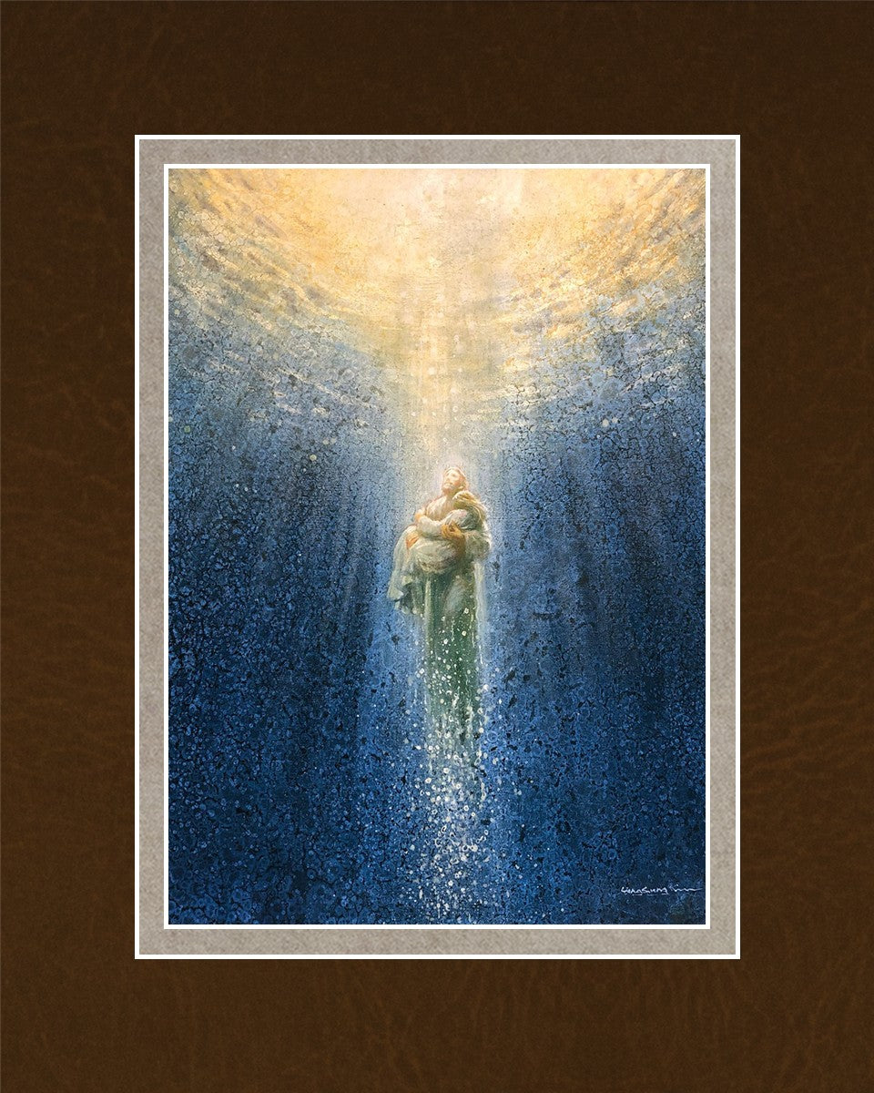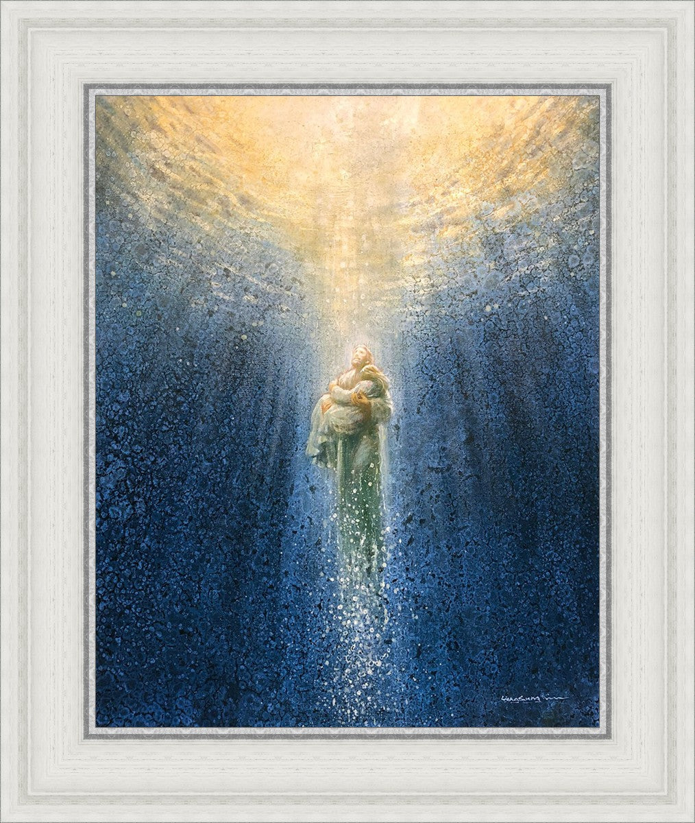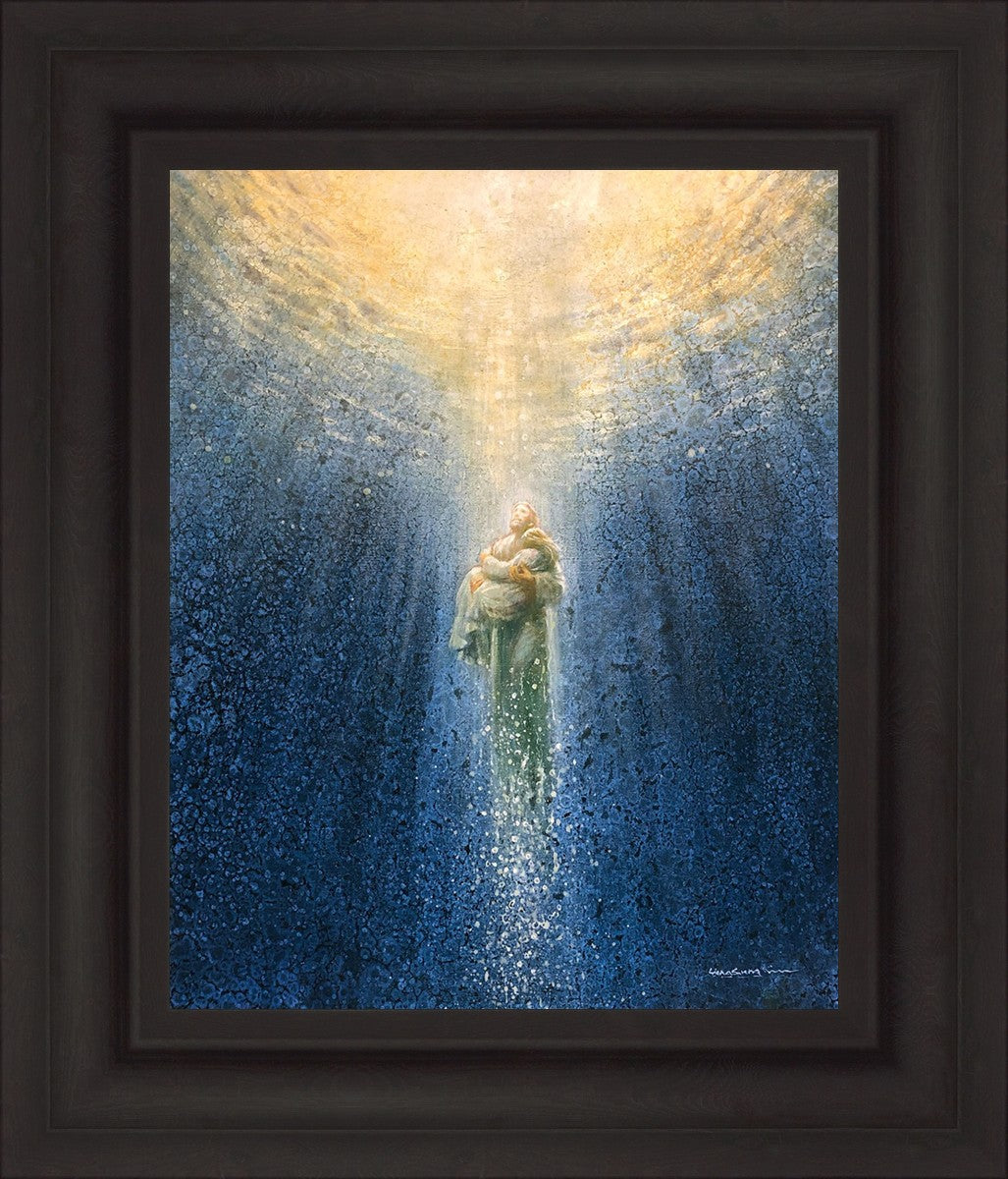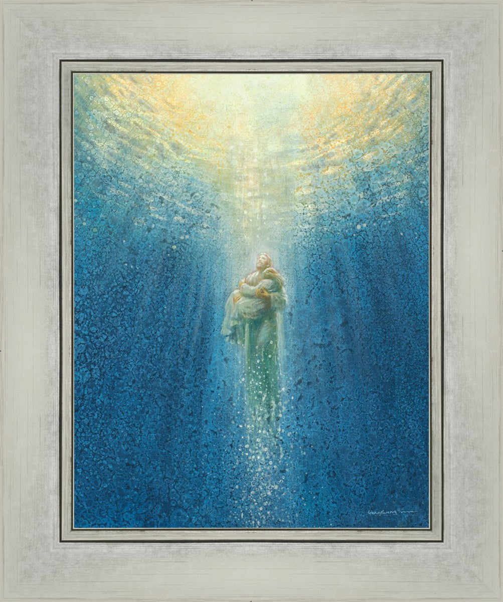 "Rescue Me" by Yongsung Kim portrays Jesus extending his hand to lift a sinking person out of deep waters, symbolizing divine rescue and salvation from despair. This artwork offers hope and reassurance to those facing adversity, reminding viewers of Jesus's unwavering presence and compassion in times of hardship and isolation.