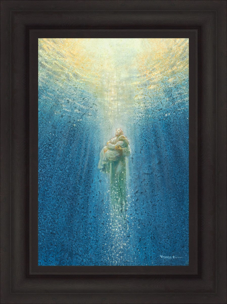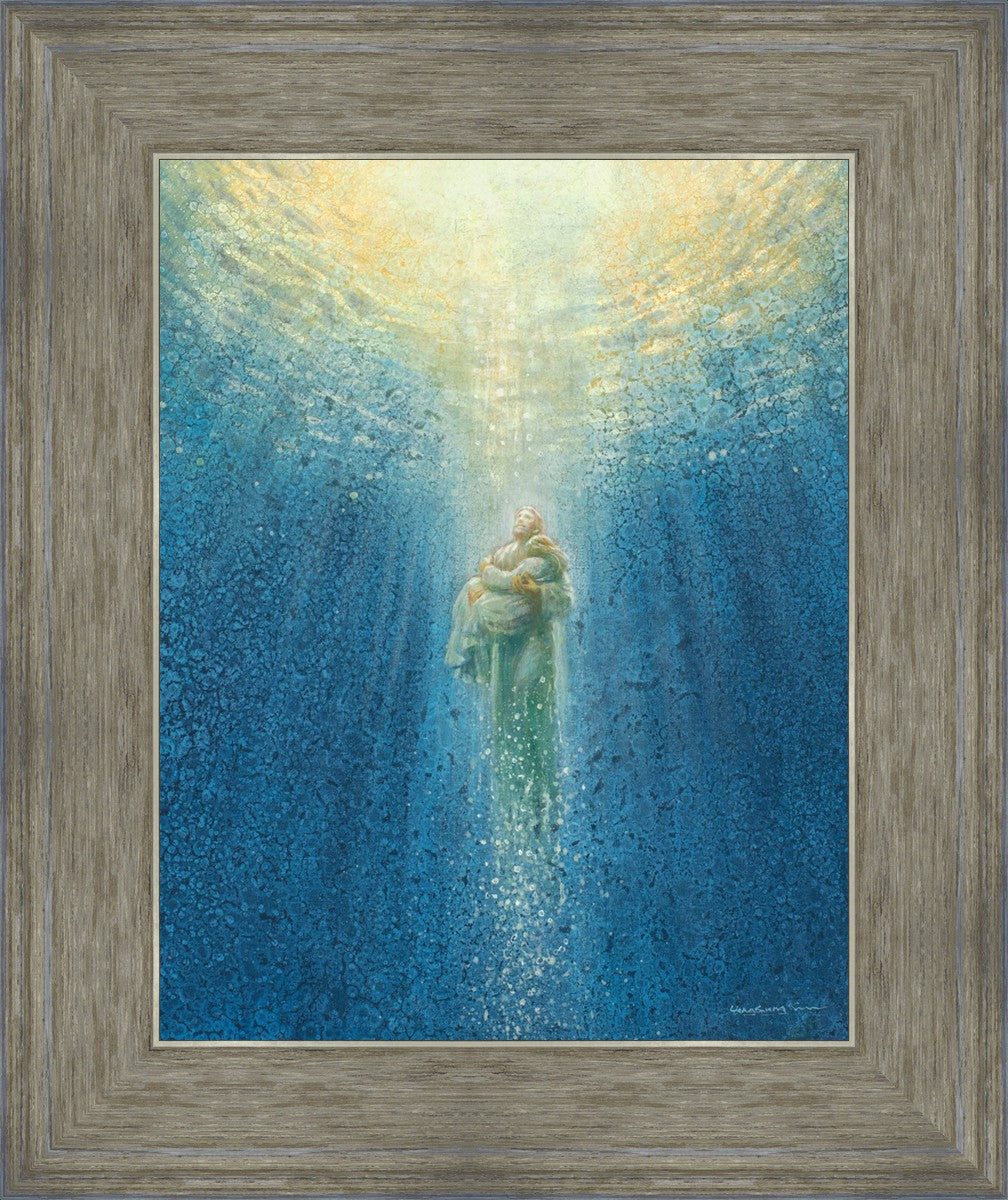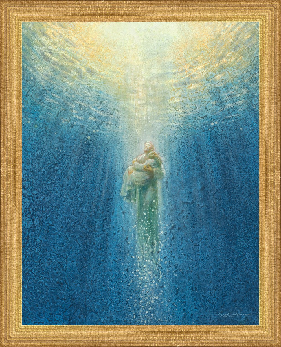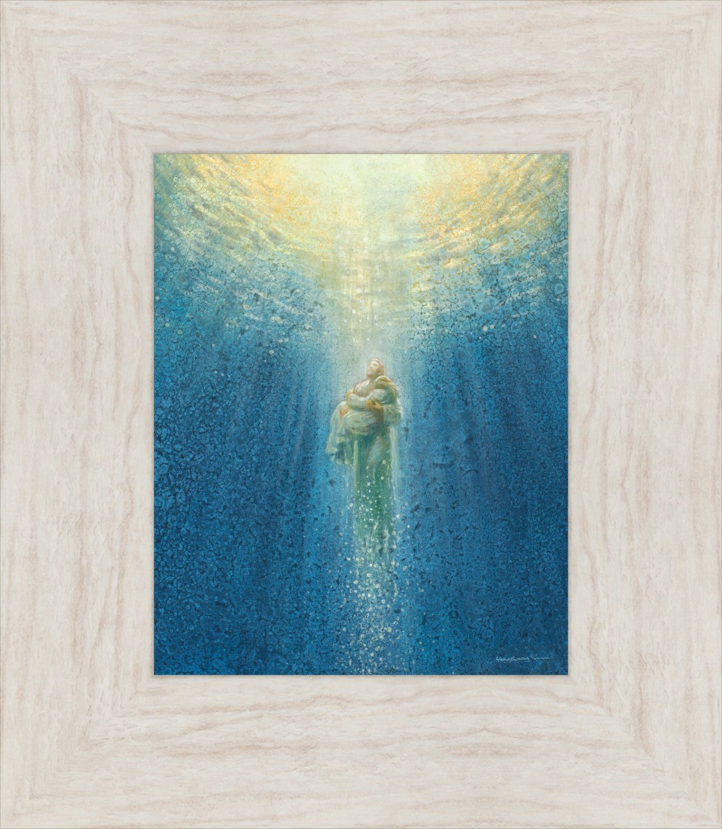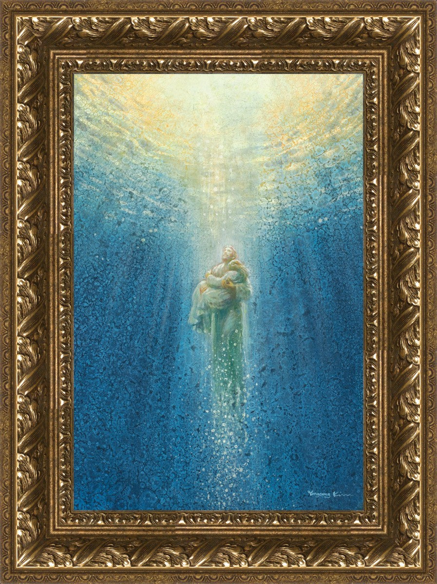 "Rescue Me" by Yongsung Kim portrays Jesus extending his hand to lift a sinking person out of deep waters, symbolizing divine rescue and salvation from despair. This artwork offers hope and reassurance to those facing adversity, reminding viewers of Jesus's unwavering presence and compassion in times of hardship and isolation.