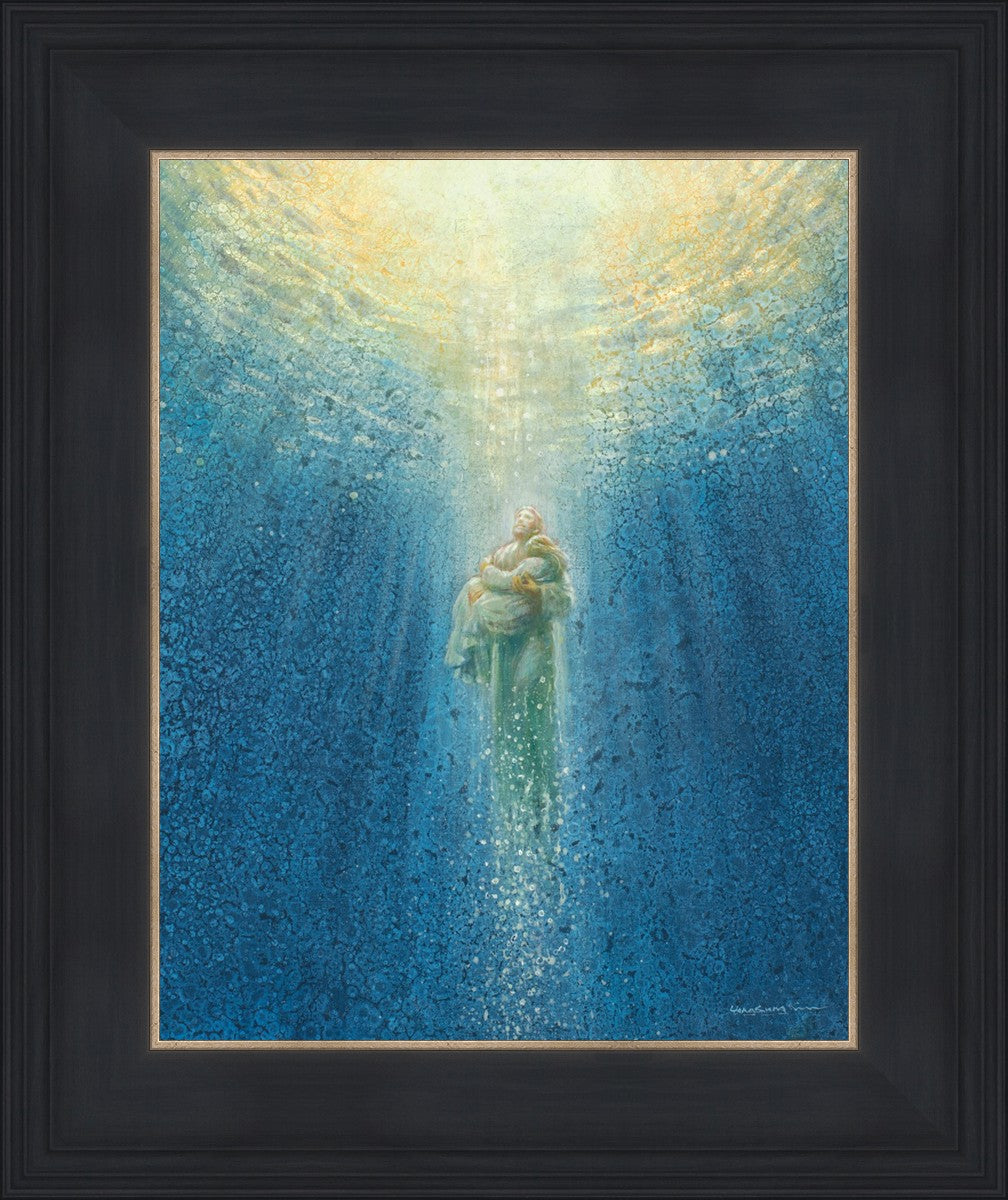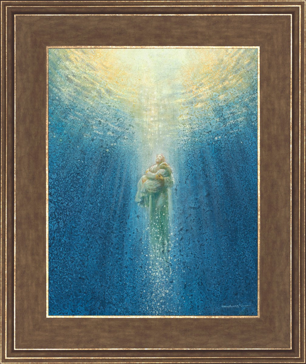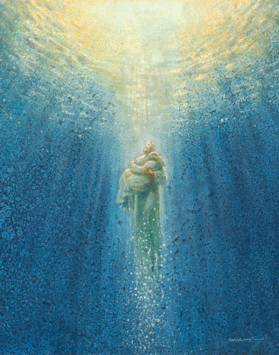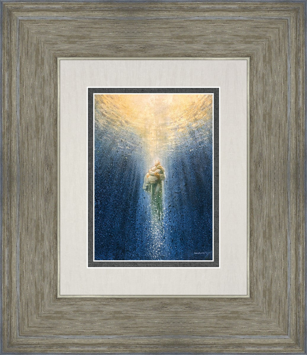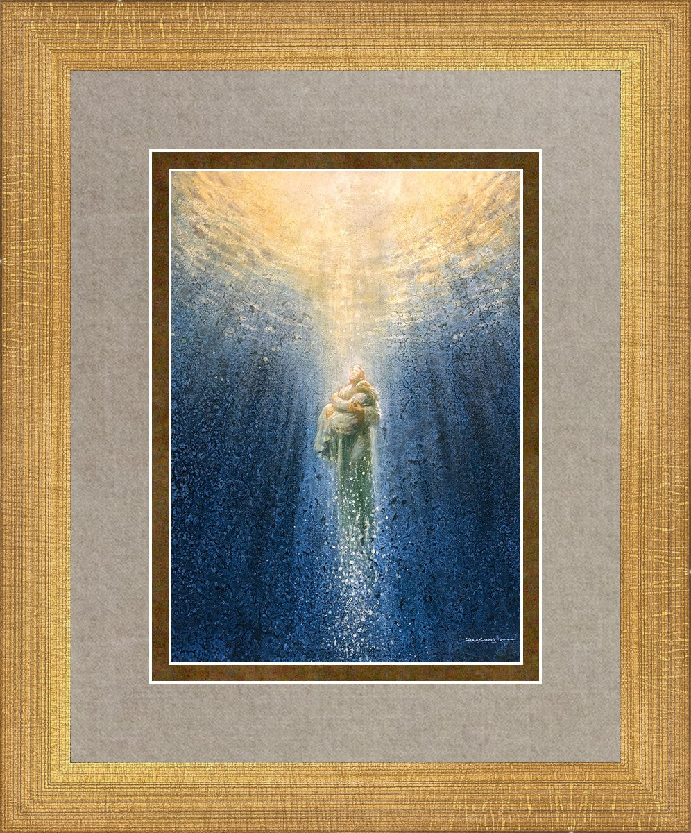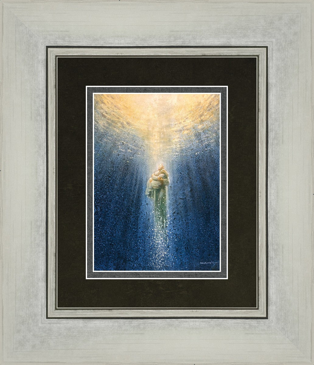 "Rescue Me" by Yongsung Kim portrays Jesus extending his hand to lift a sinking person out of deep waters, symbolizing divine rescue and salvation from despair. This artwork offers hope and reassurance to those facing adversity, reminding viewers of Jesus's unwavering presence and compassion in times of hardship and isolation.
