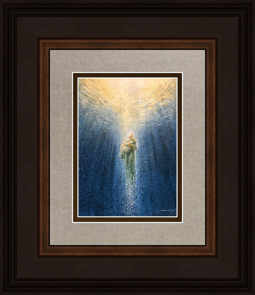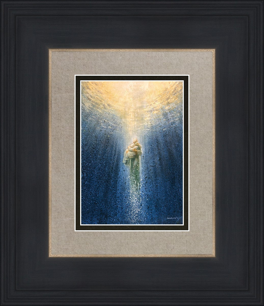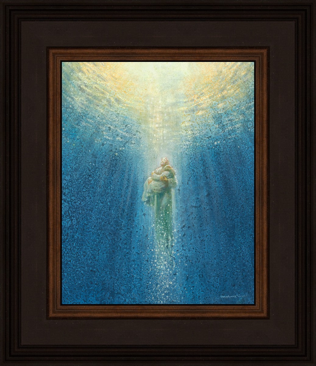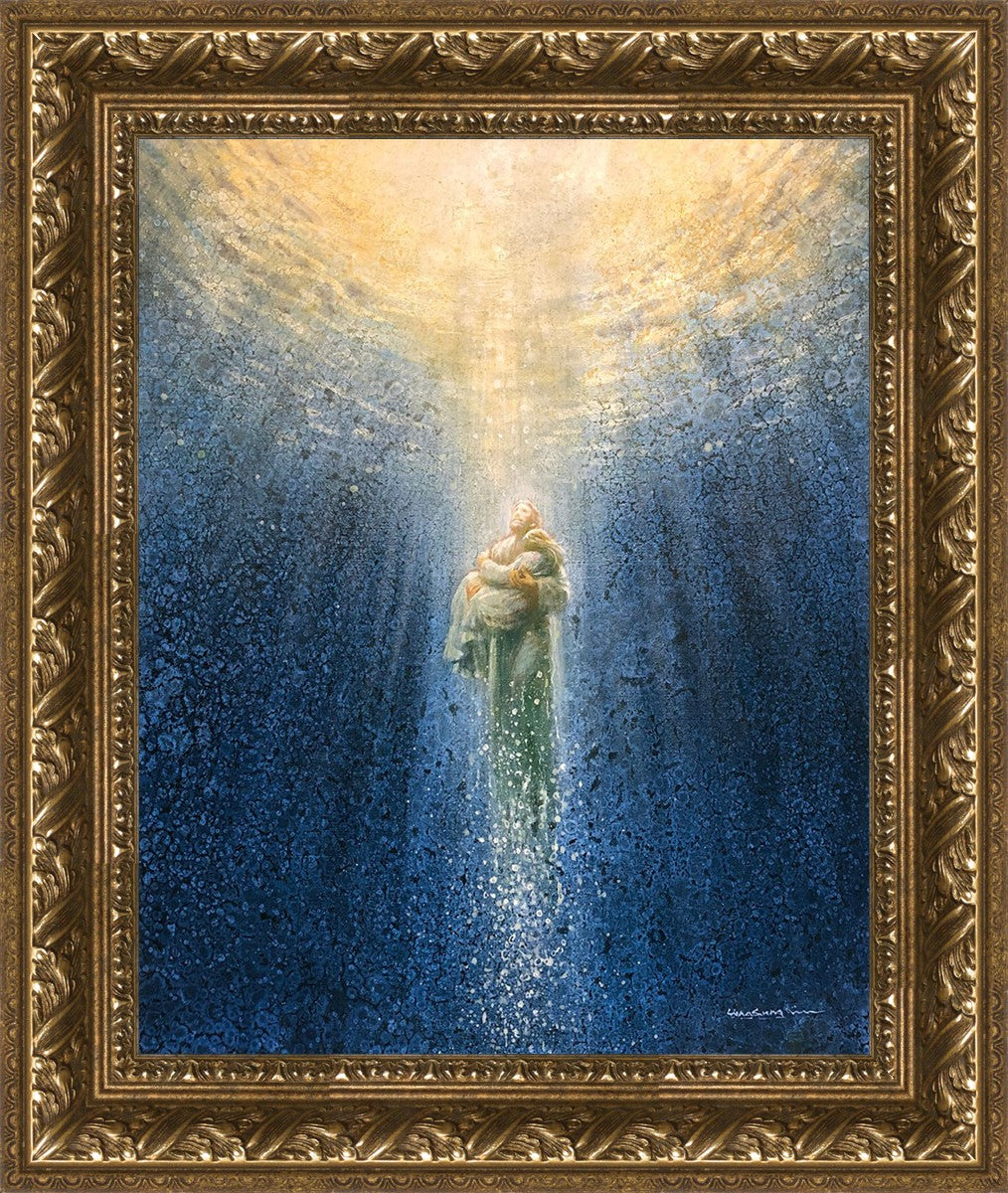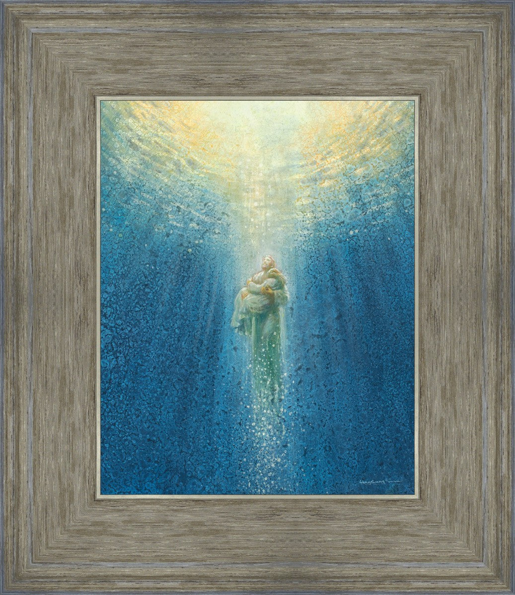 "Rescue Me" by Yongsung Kim portrays Jesus extending his hand to lift a sinking person out of deep waters, symbolizing divine rescue and salvation from despair. This artwork offers hope and reassurance to those facing adversity, reminding viewers of Jesus's unwavering presence and compassion in times of hardship and isolation.
