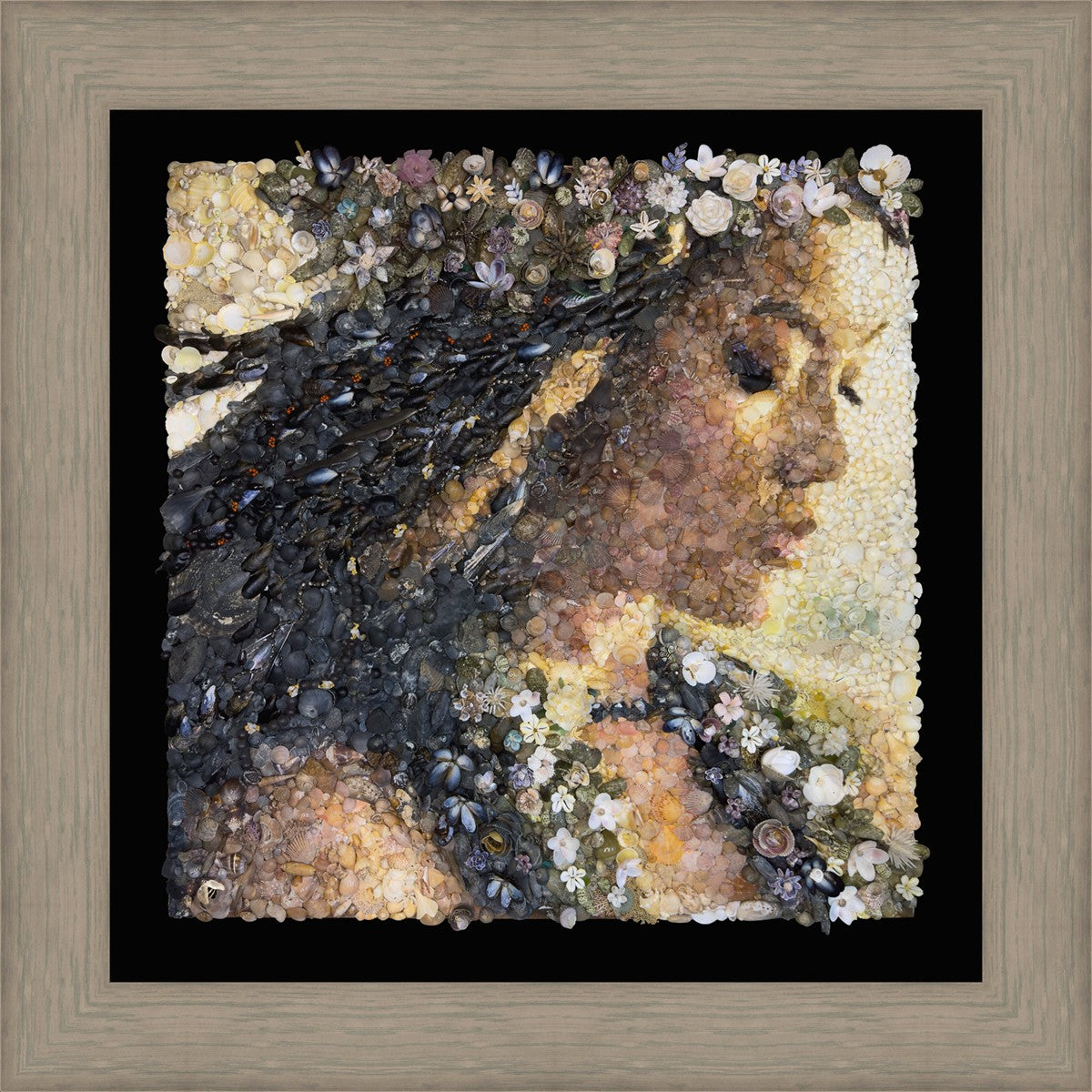 Reproduced from the artist's original artwork of arranged shells and other natural items.
