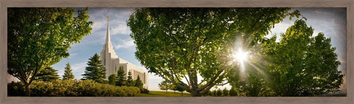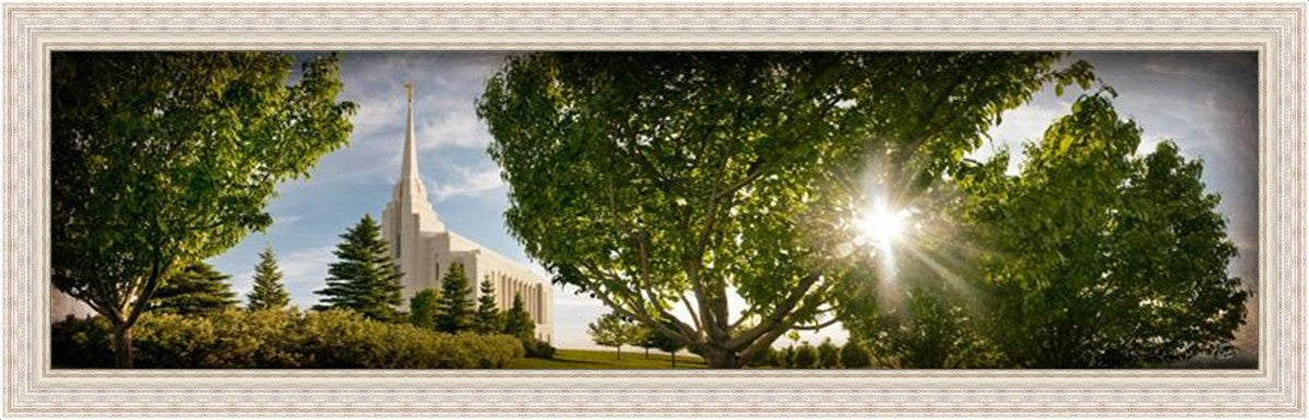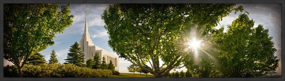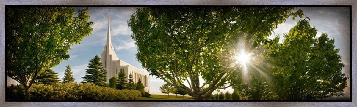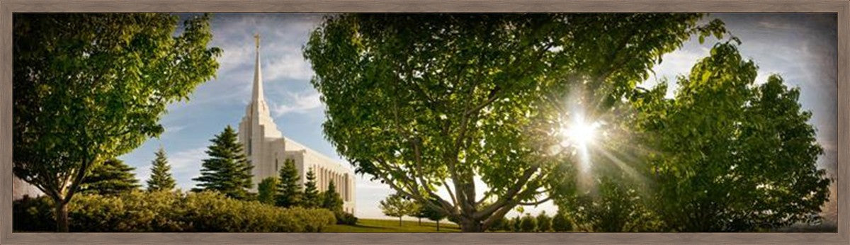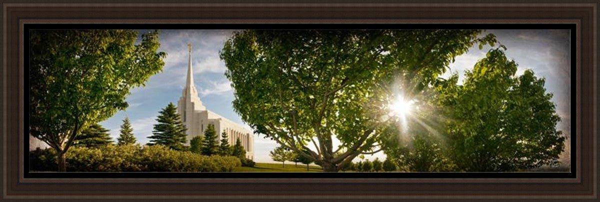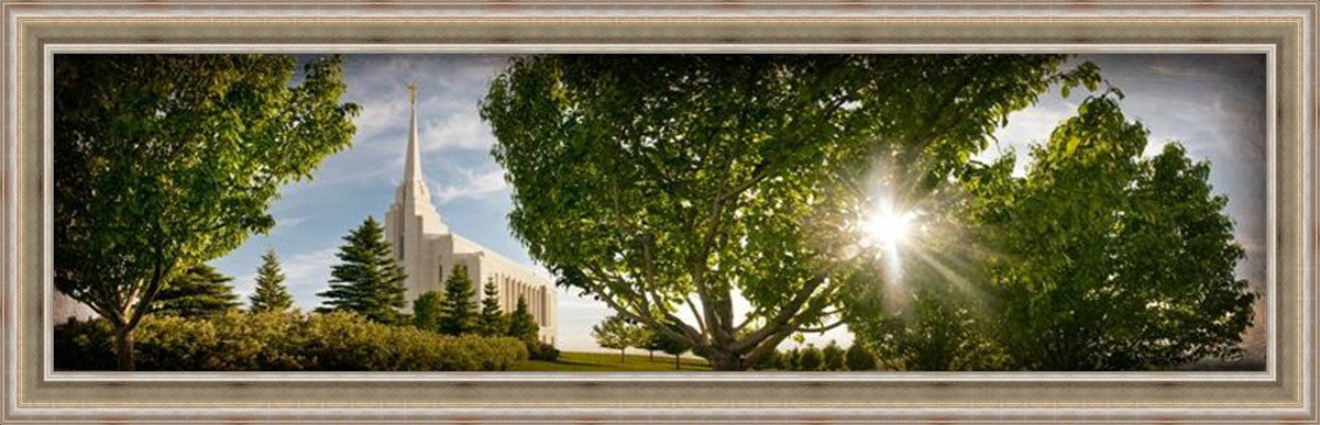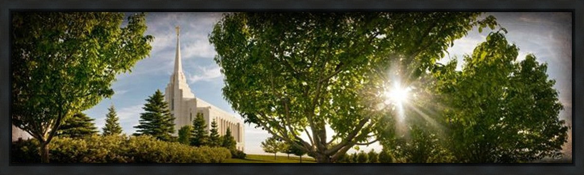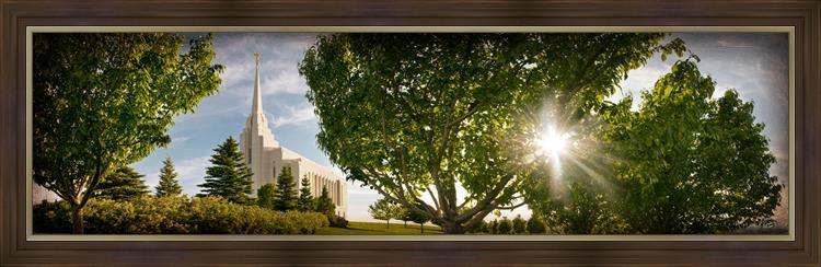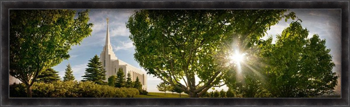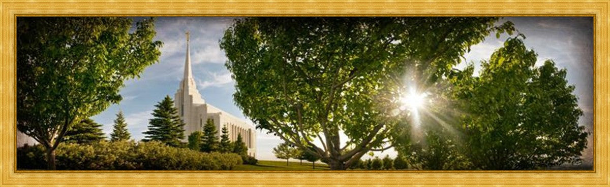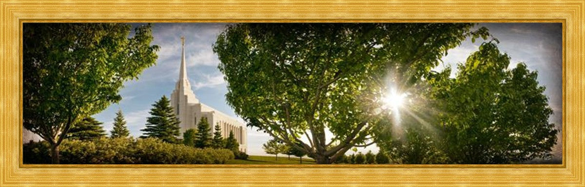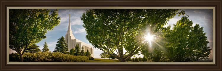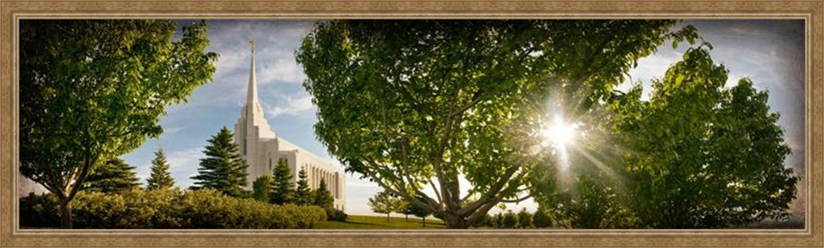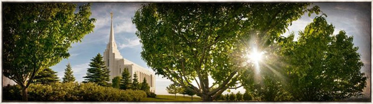 Since 1999 Landon has worked as an artisan in nearly 40 temples doing the decorative paint and gold leaf. He continues to do so as well as wood repair and graining. He was married in 2001 to Jacey Thomas in the Manti Utah temple. When she couldn’t find an image of the temple that she liked enough to purchase for their home, he decided to take one himself. That desire to create something original and different inspired his current series of temple art. They are taken from a panoramic viewpoint and stylized with an artistic border that reflect his paintings. All modern structures apart from the temple have been omitted.
