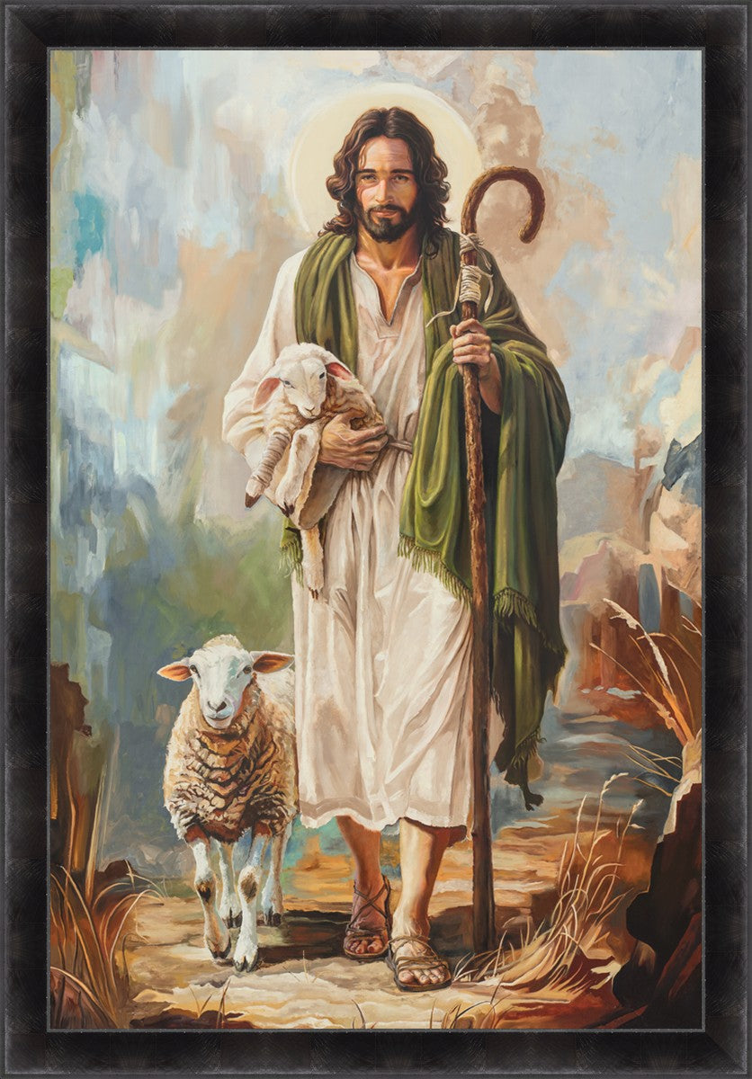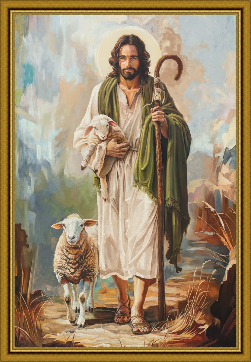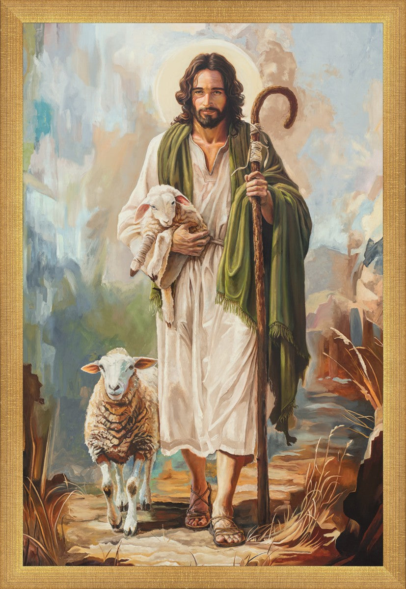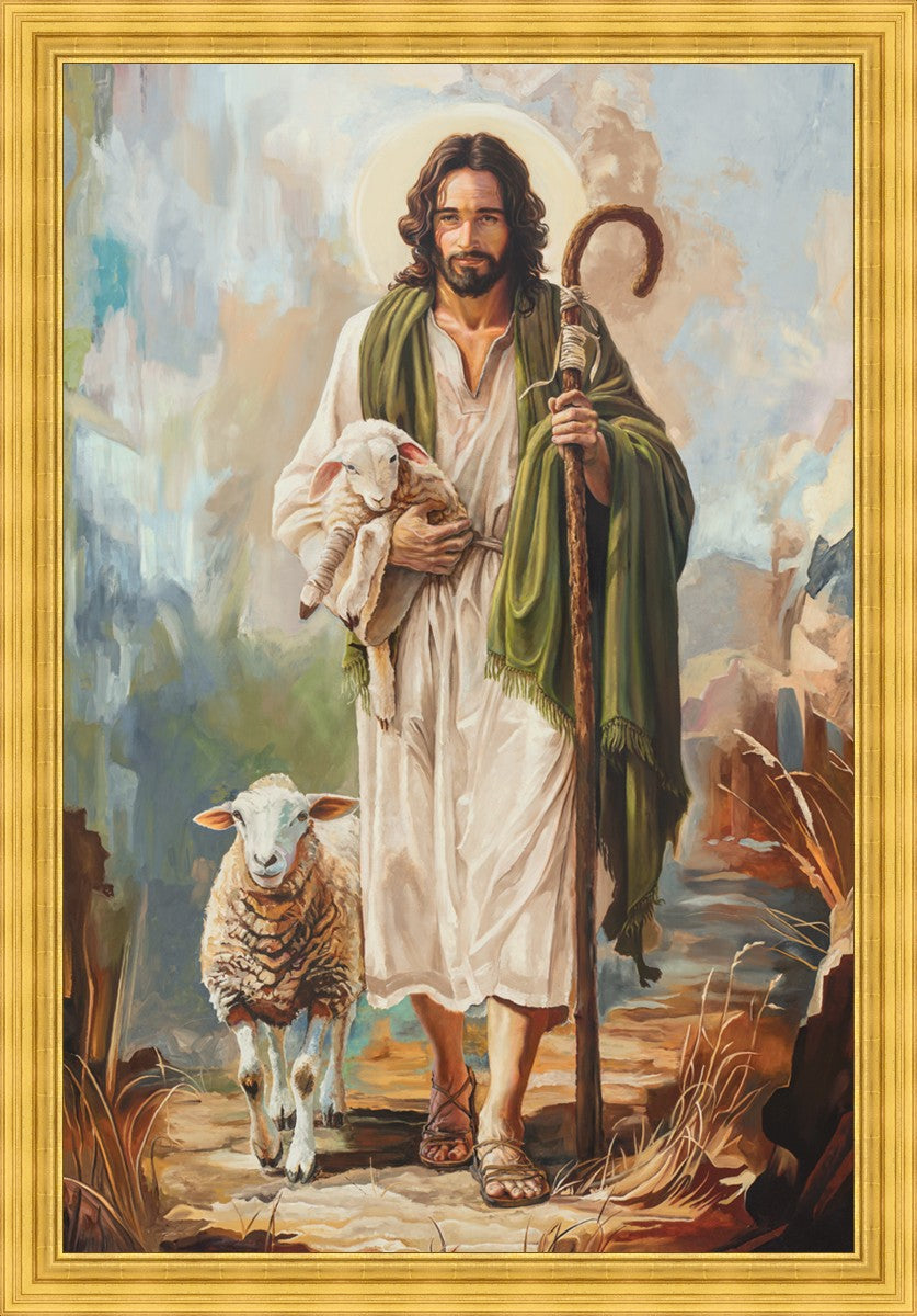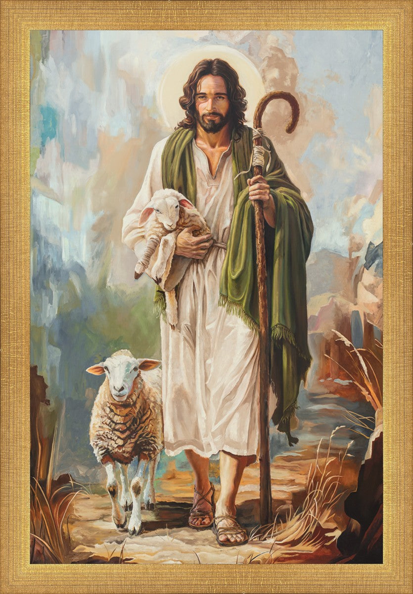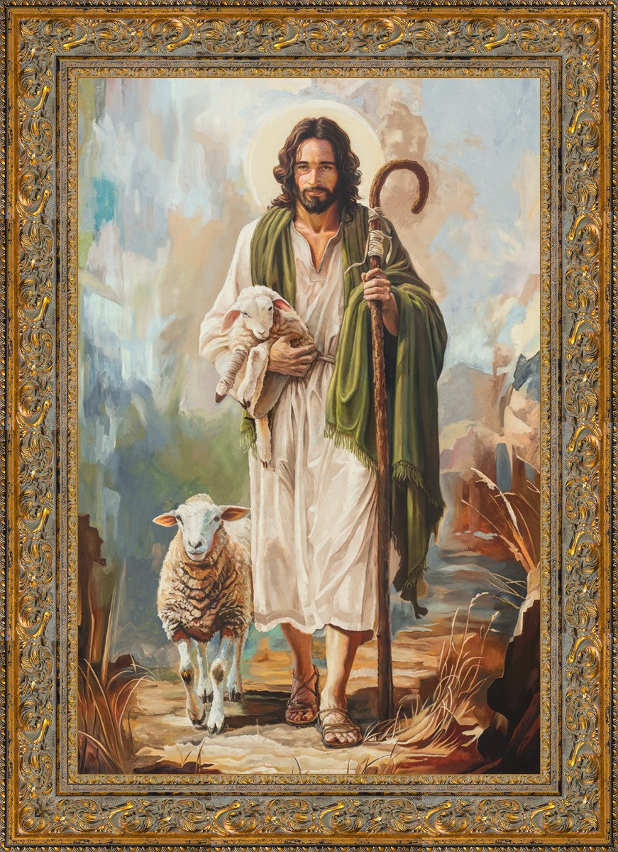 This oil on canvas painting portrays Christ in the Good Shepherd motif, leading His flock with strength and compassion. Like shepherds of ancient Israel who walked ahead of their sheep, guiding them with familiarity and trust, Christ strides forward, exemplifying the guidance and protection He offers to all who follow Him. In His arms, He cradles an injured lamb, representing those who have strayed and experienced hurt. Through the warm, earthy tones of the landscape and the gentle, reassuring details in Christ’s expression, the painting conveys a sense of peace and safety. The lamb, embraced in the Shepherd’s arms, symbolizes the grace available to those who, through repentance and faith, allow Christ to tend to their wounds and restore them to His flock.