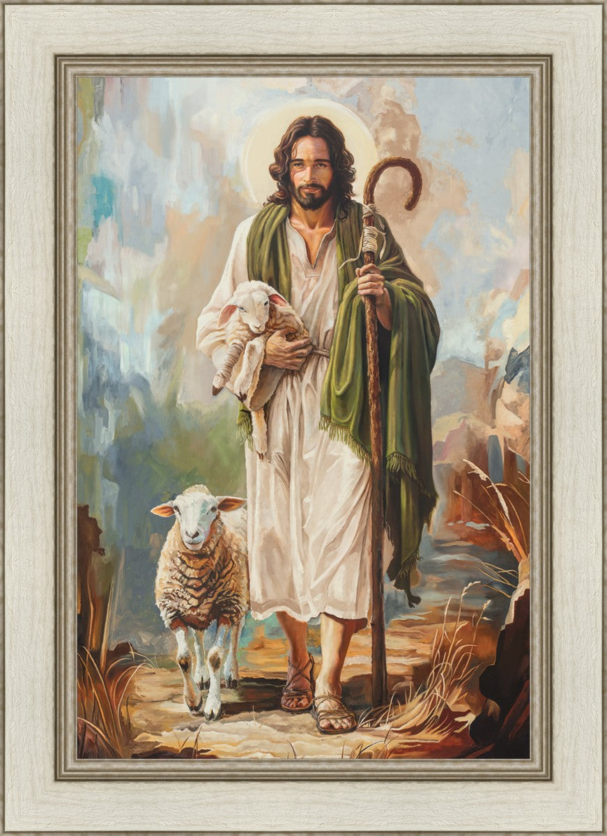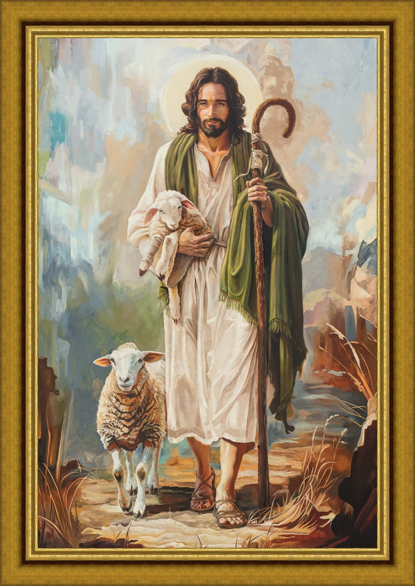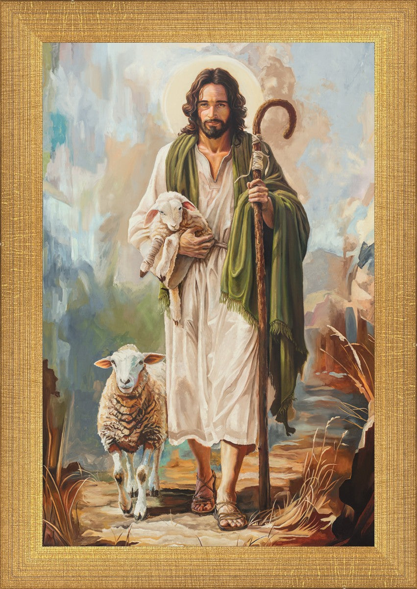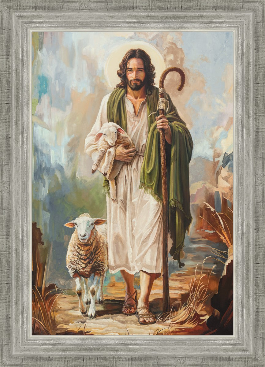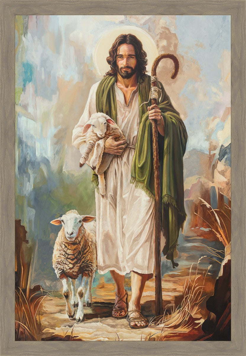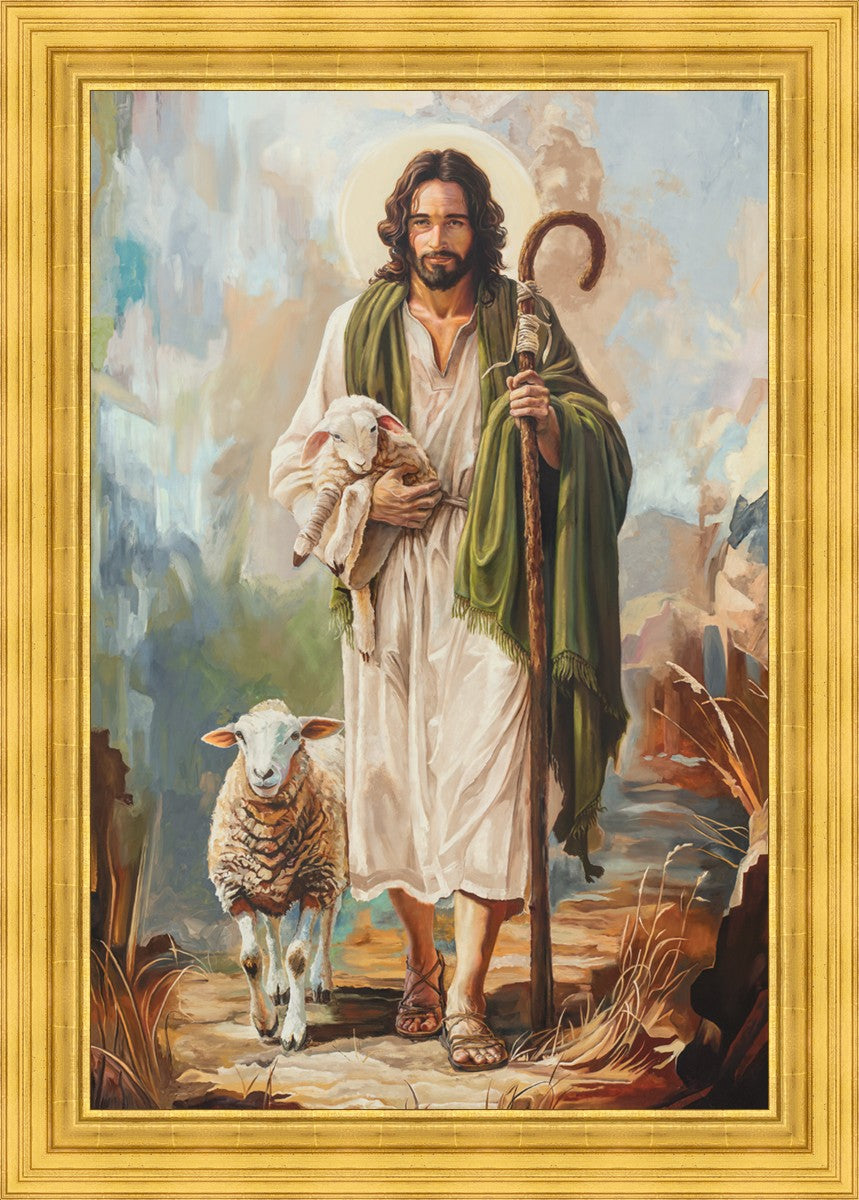 This oil on canvas painting portrays Christ in the Good Shepherd motif, leading His flock with strength and compassion. Like shepherds of ancient Israel who walked ahead of their sheep, guiding them with familiarity and trust, Christ strides forward, exemplifying the guidance and protection He offers to all who follow Him. In His arms, He cradles an injured lamb, representing those who have strayed and experienced hurt. Through the warm, earthy tones of the landscape and the gentle, reassuring details in Christ’s expression, the painting conveys a sense of peace and safety. The lamb, embraced in the Shepherd’s arms, symbolizes the grace available to those who, through repentance and faith, allow Christ to tend to their wounds and restore them to His flock.