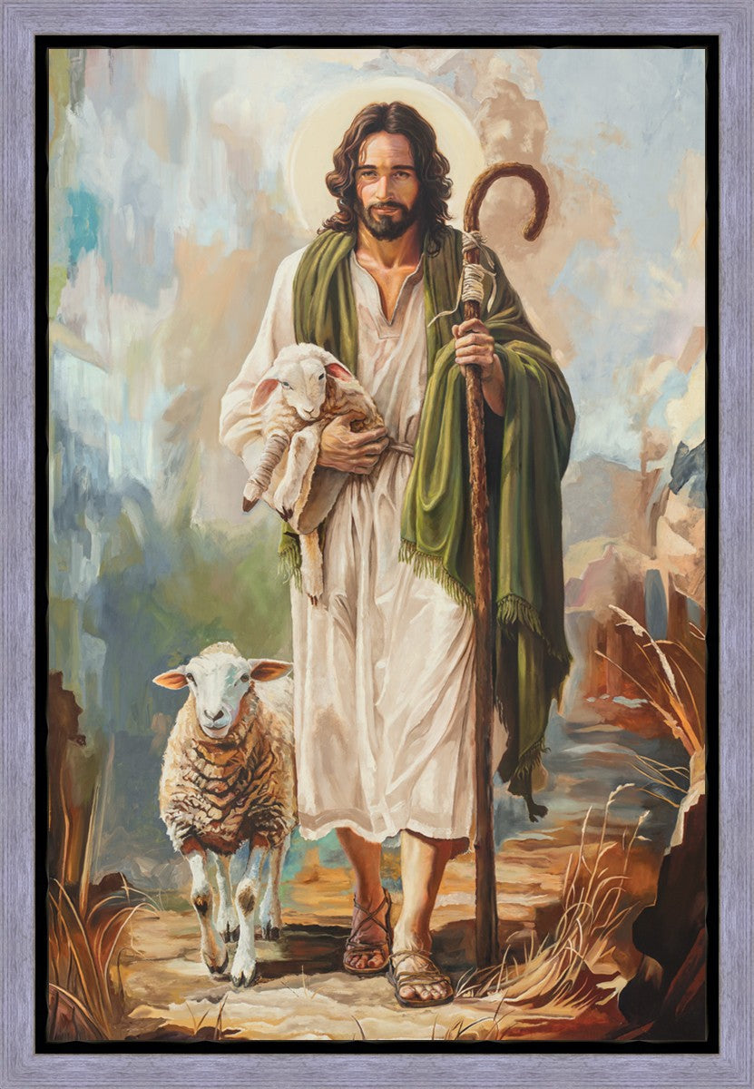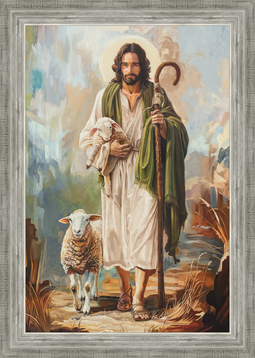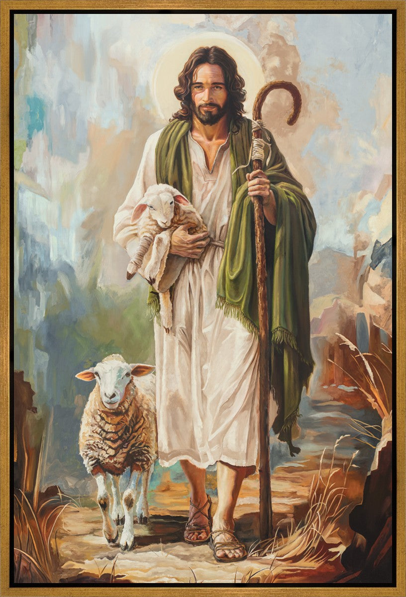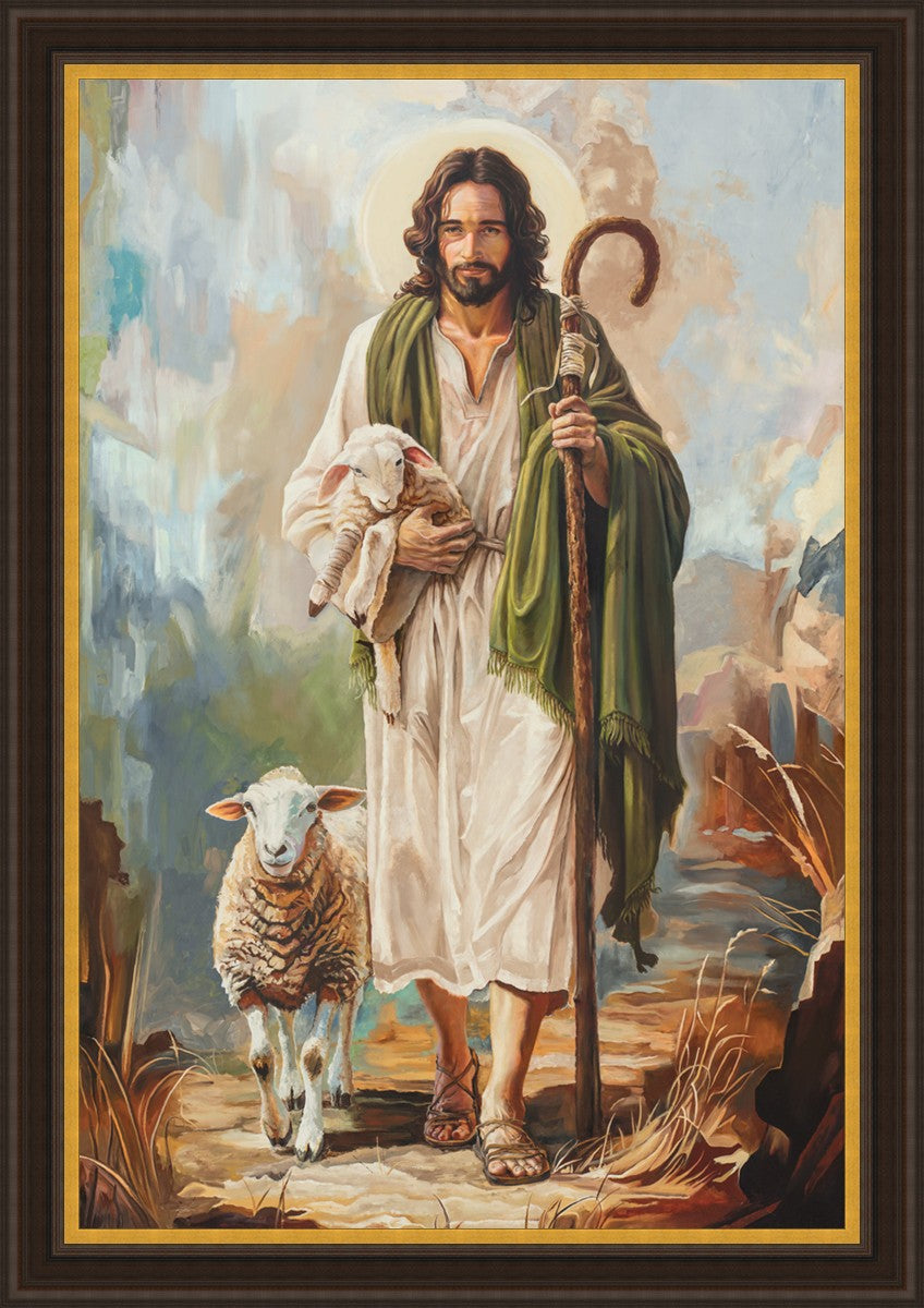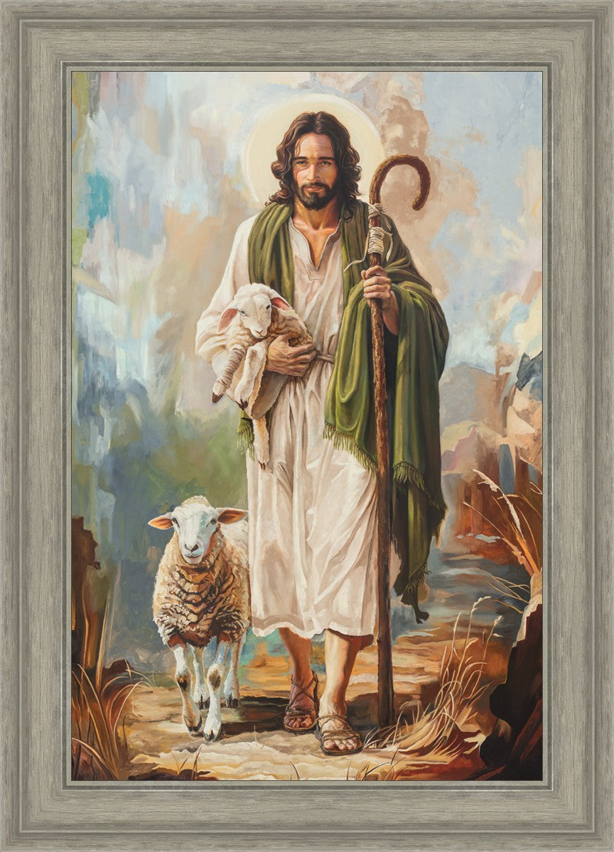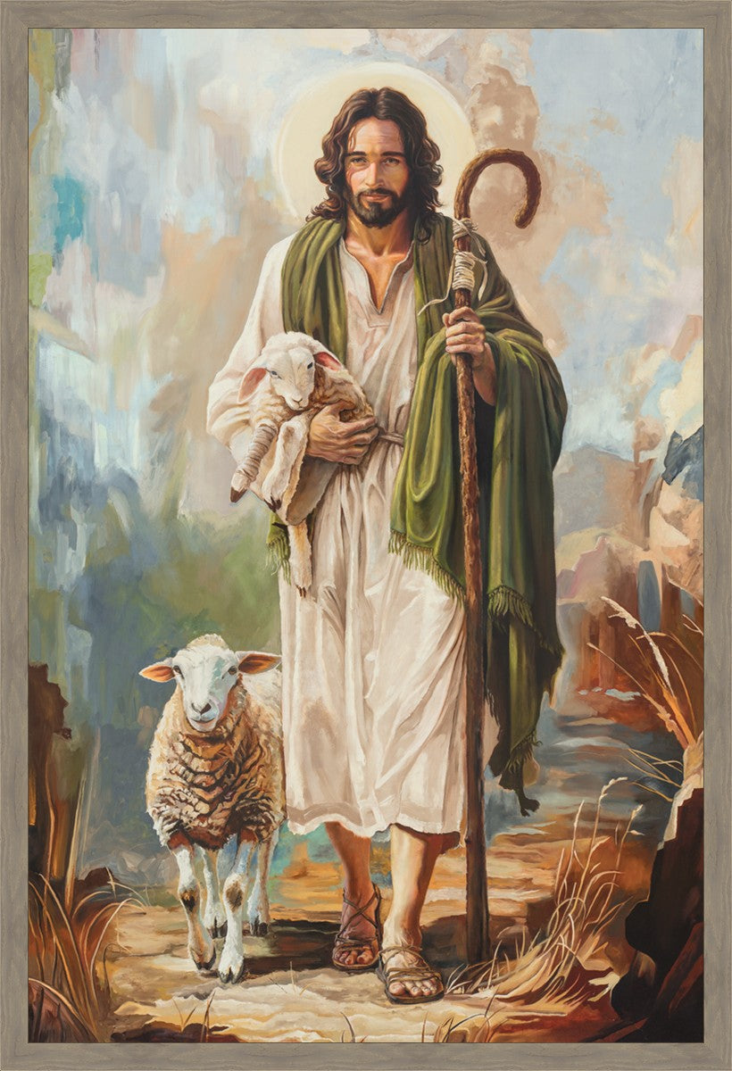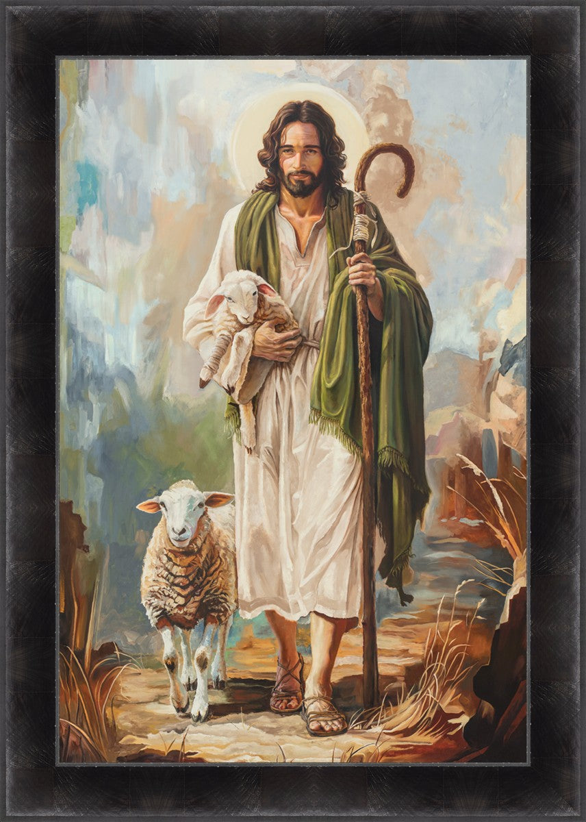 This oil on canvas painting portrays Christ in the Good Shepherd motif, leading His flock with strength and compassion. Like shepherds of ancient Israel who walked ahead of their sheep, guiding them with familiarity and trust, Christ strides forward, exemplifying the guidance and protection He offers to all who follow Him. In His arms, He cradles an injured lamb, representing those who have strayed and experienced hurt. Through the warm, earthy tones of the landscape and the gentle, reassuring details in Christ’s expression, the painting conveys a sense of peace and safety. The lamb, embraced in the Shepherd’s arms, symbolizes the grace available to those who, through repentance and faith, allow Christ to tend to their wounds and restore them to His flock.