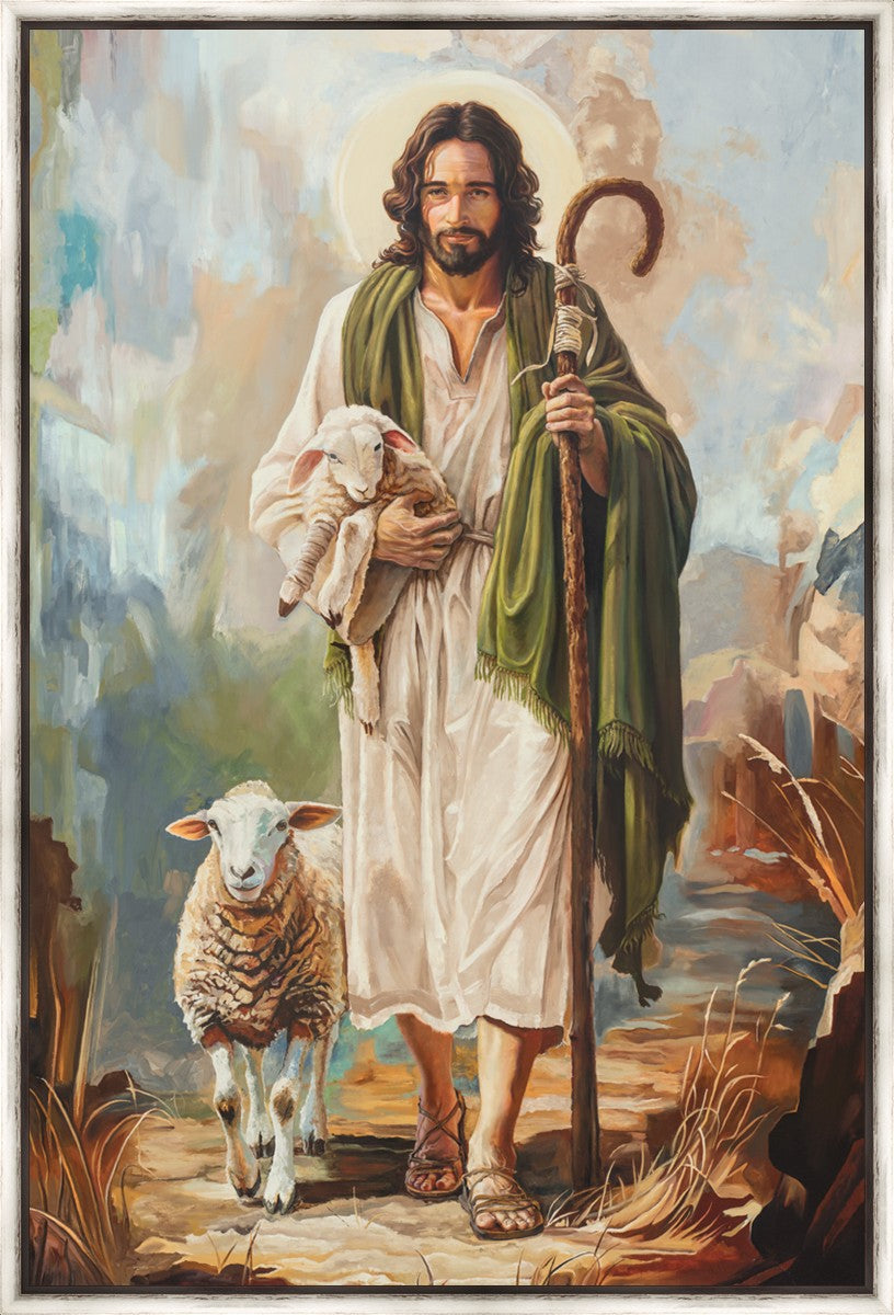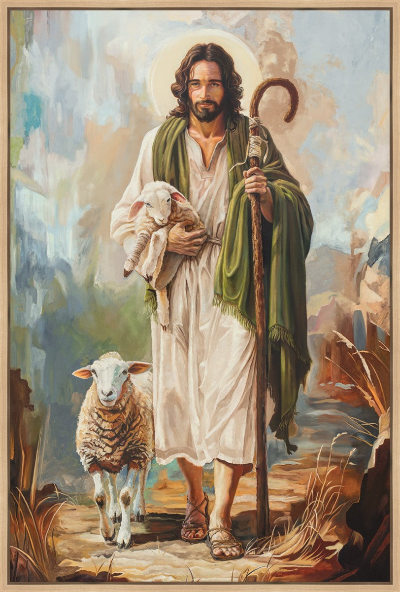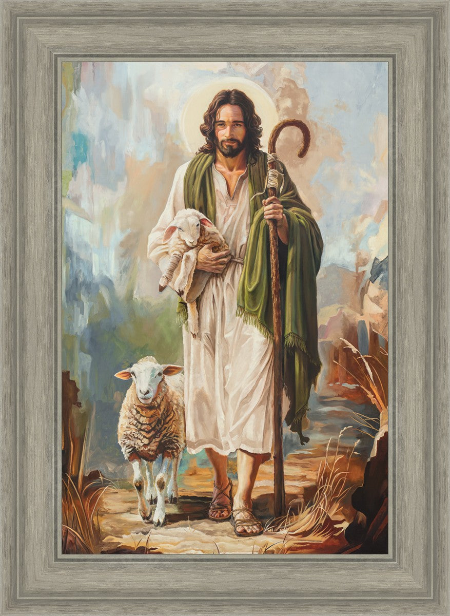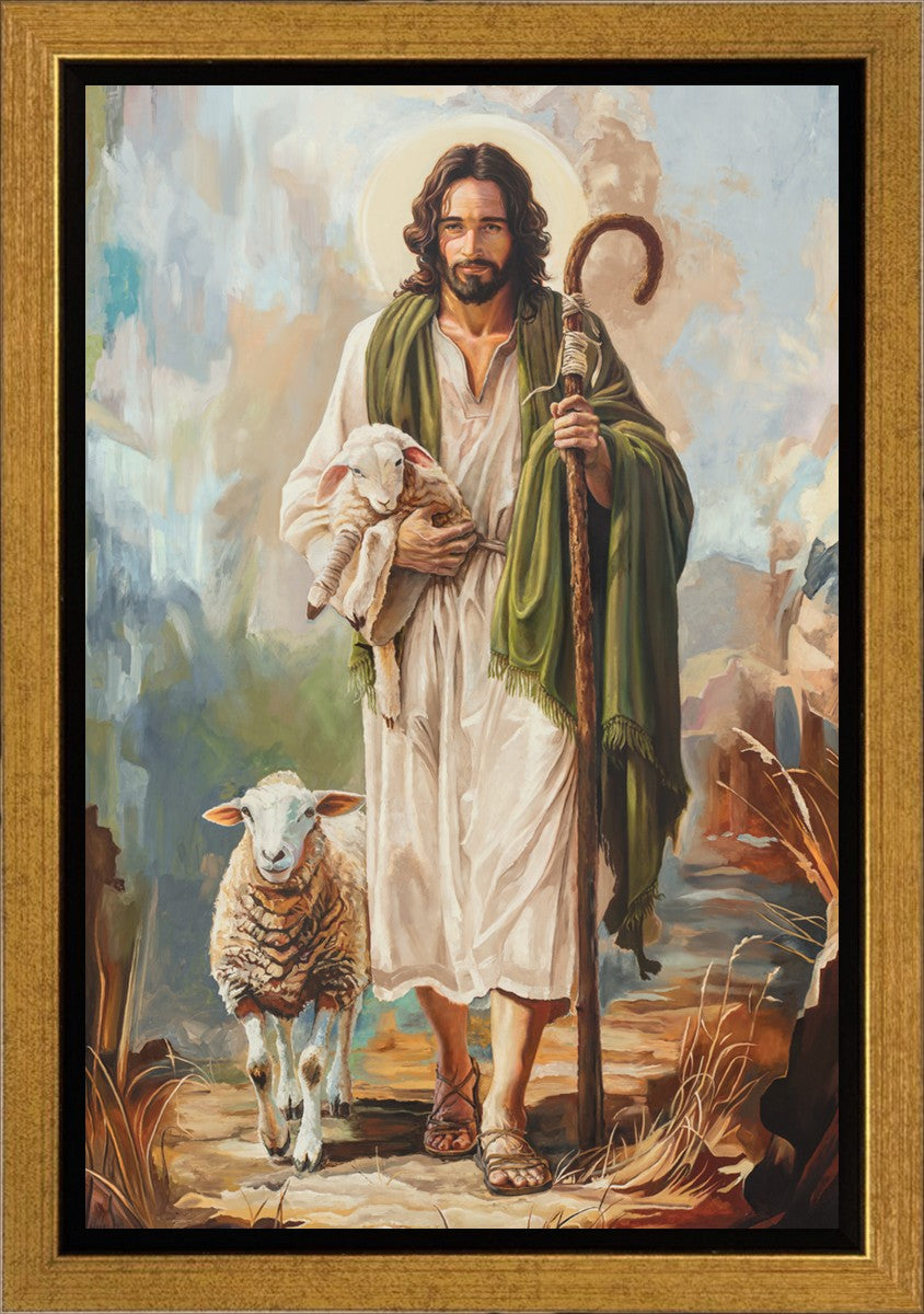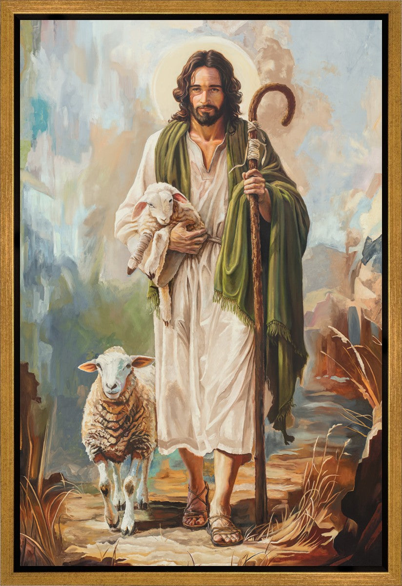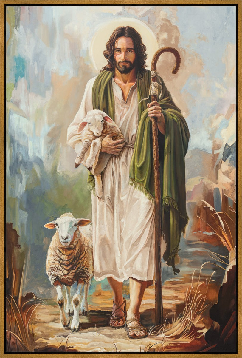 This oil on canvas painting portrays Christ in the Good Shepherd motif, leading His flock with strength and compassion. Like shepherds of ancient Israel who walked ahead of their sheep, guiding them with familiarity and trust, Christ strides forward, exemplifying the guidance and protection He offers to all who follow Him. In His arms, He cradles an injured lamb, representing those who have strayed and experienced hurt. Through the warm, earthy tones of the landscape and the gentle, reassuring details in Christ’s expression, the painting conveys a sense of peace and safety. The lamb, embraced in the Shepherd’s arms, symbolizes the grace available to those who, through repentance and faith, allow Christ to tend to their wounds and restore them to His flock.