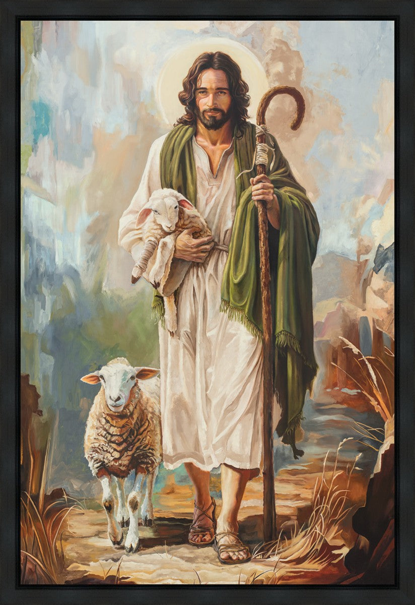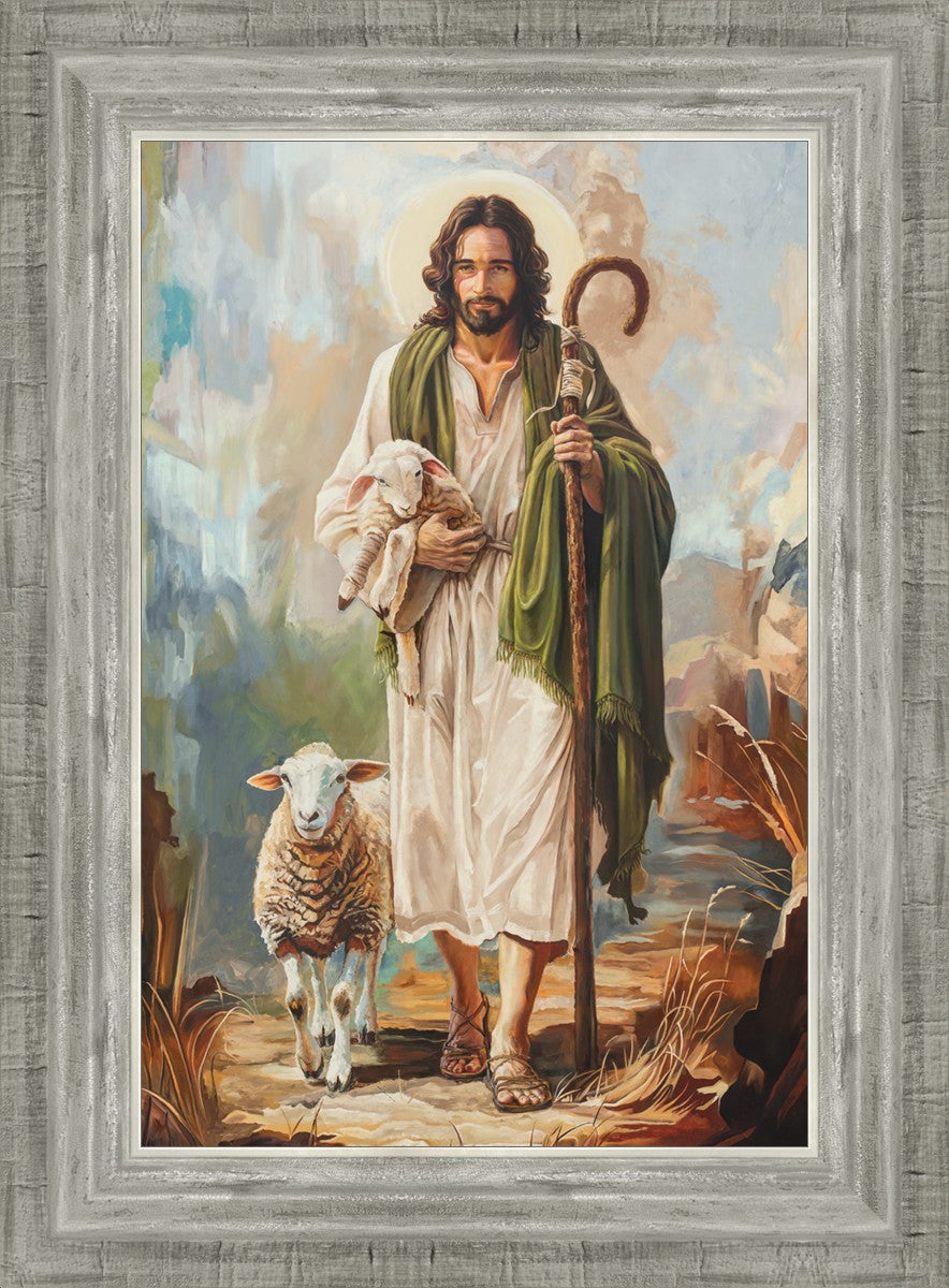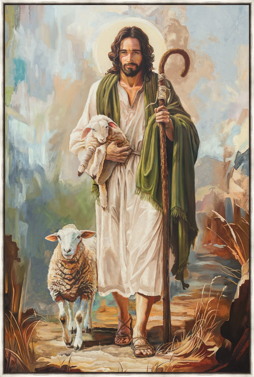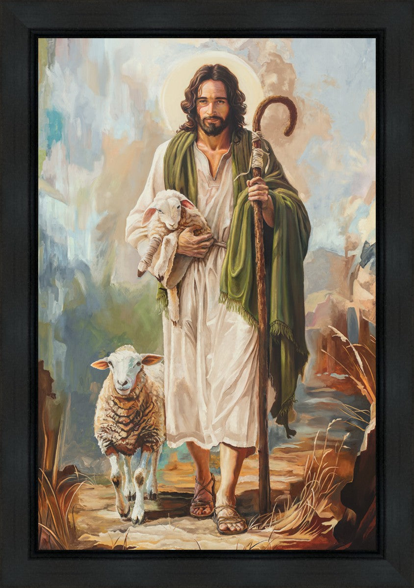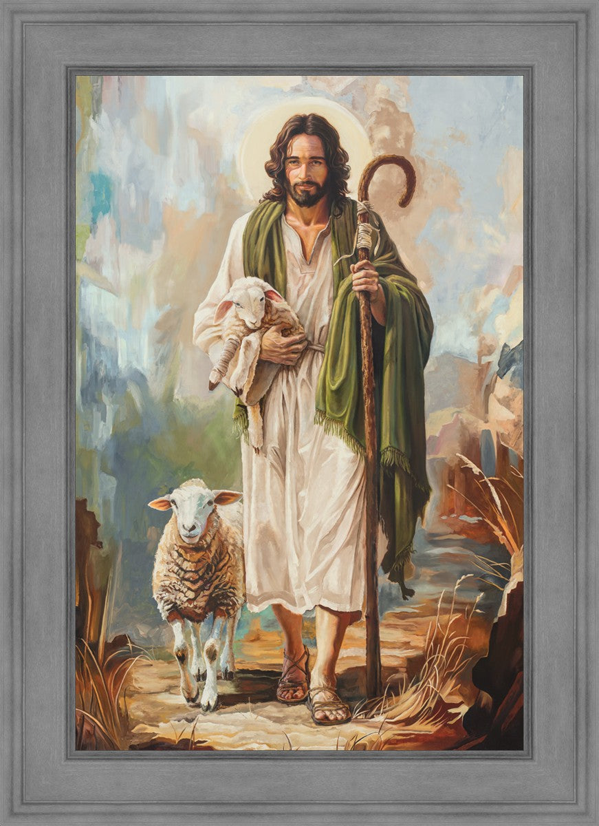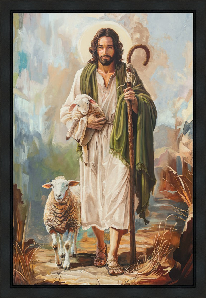 This oil on canvas painting portrays Christ in the Good Shepherd motif, leading His flock with strength and compassion. Like shepherds of ancient Israel who walked ahead of their sheep, guiding them with familiarity and trust, Christ strides forward, exemplifying the guidance and protection He offers to all who follow Him. In His arms, He cradles an injured lamb, representing those who have strayed and experienced hurt. Through the warm, earthy tones of the landscape and the gentle, reassuring details in Christ’s expression, the painting conveys a sense of peace and safety. The lamb, embraced in the Shepherd’s arms, symbolizes the grace available to those who, through repentance and faith, allow Christ to tend to their wounds and restore them to His flock.