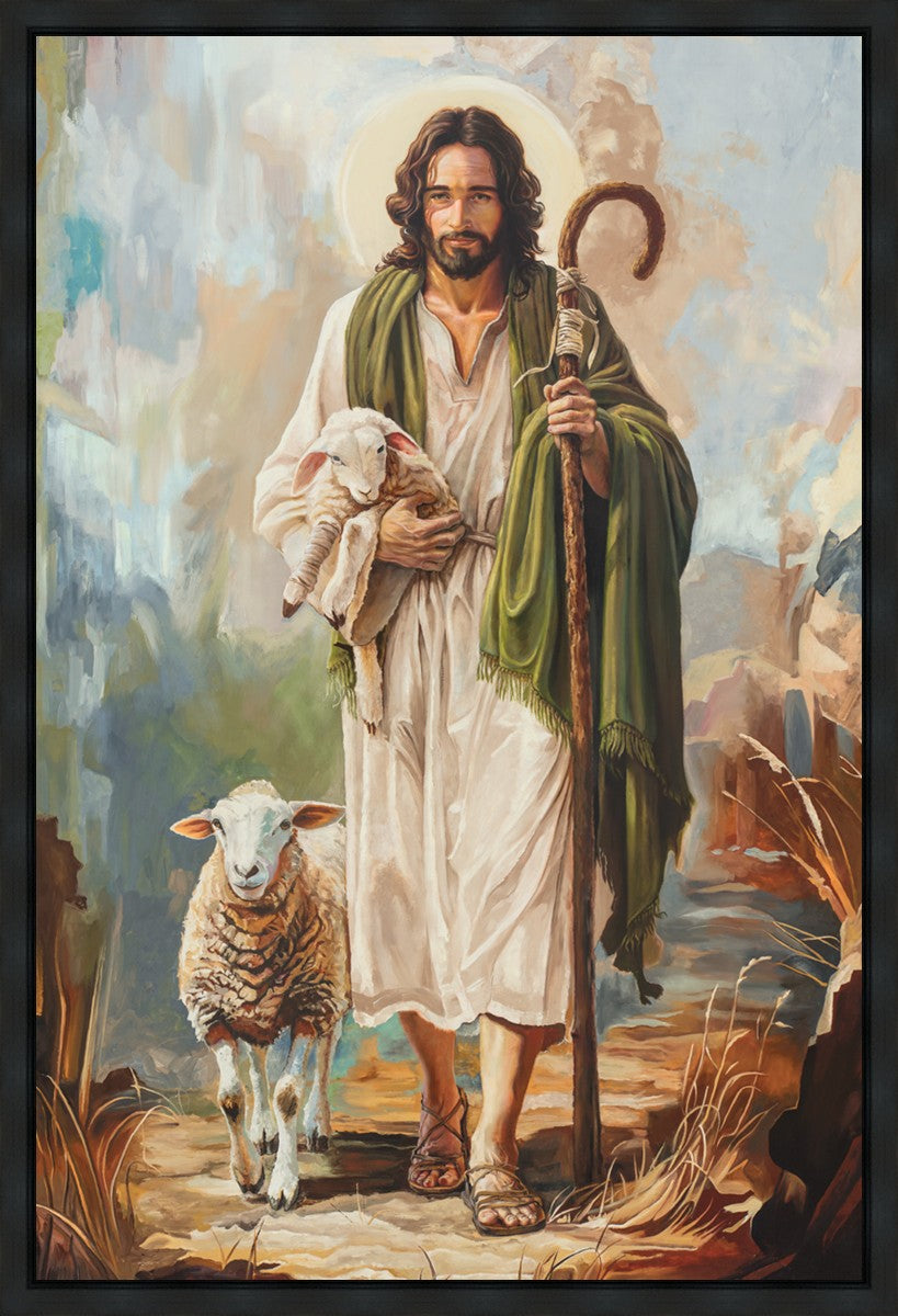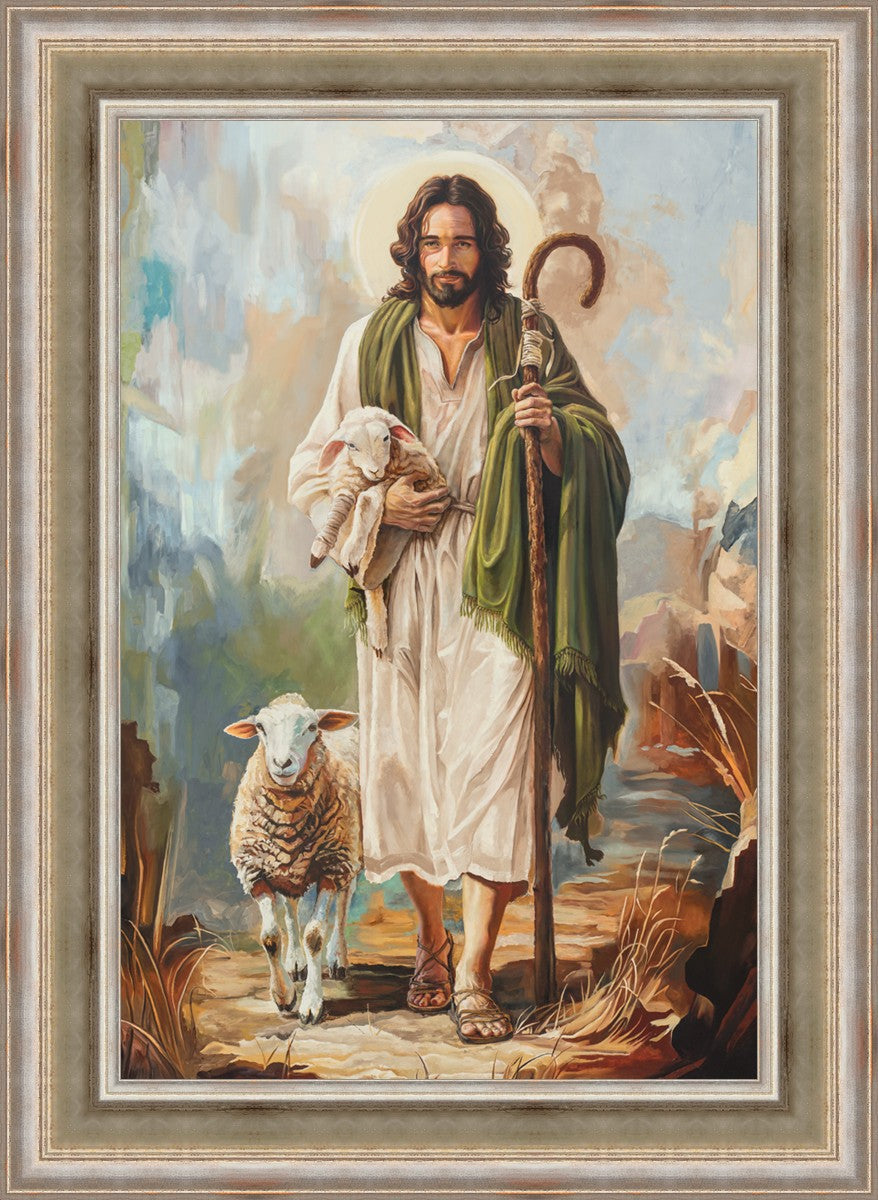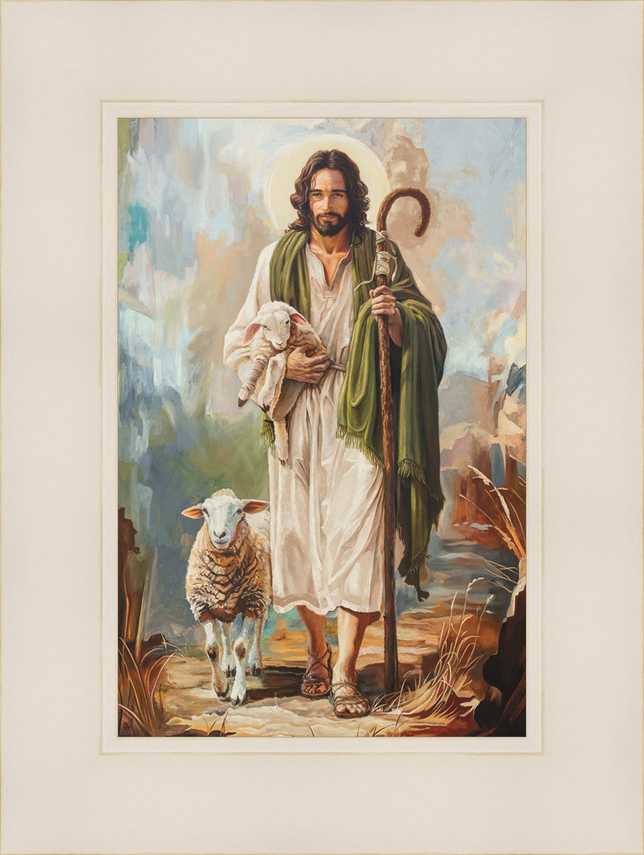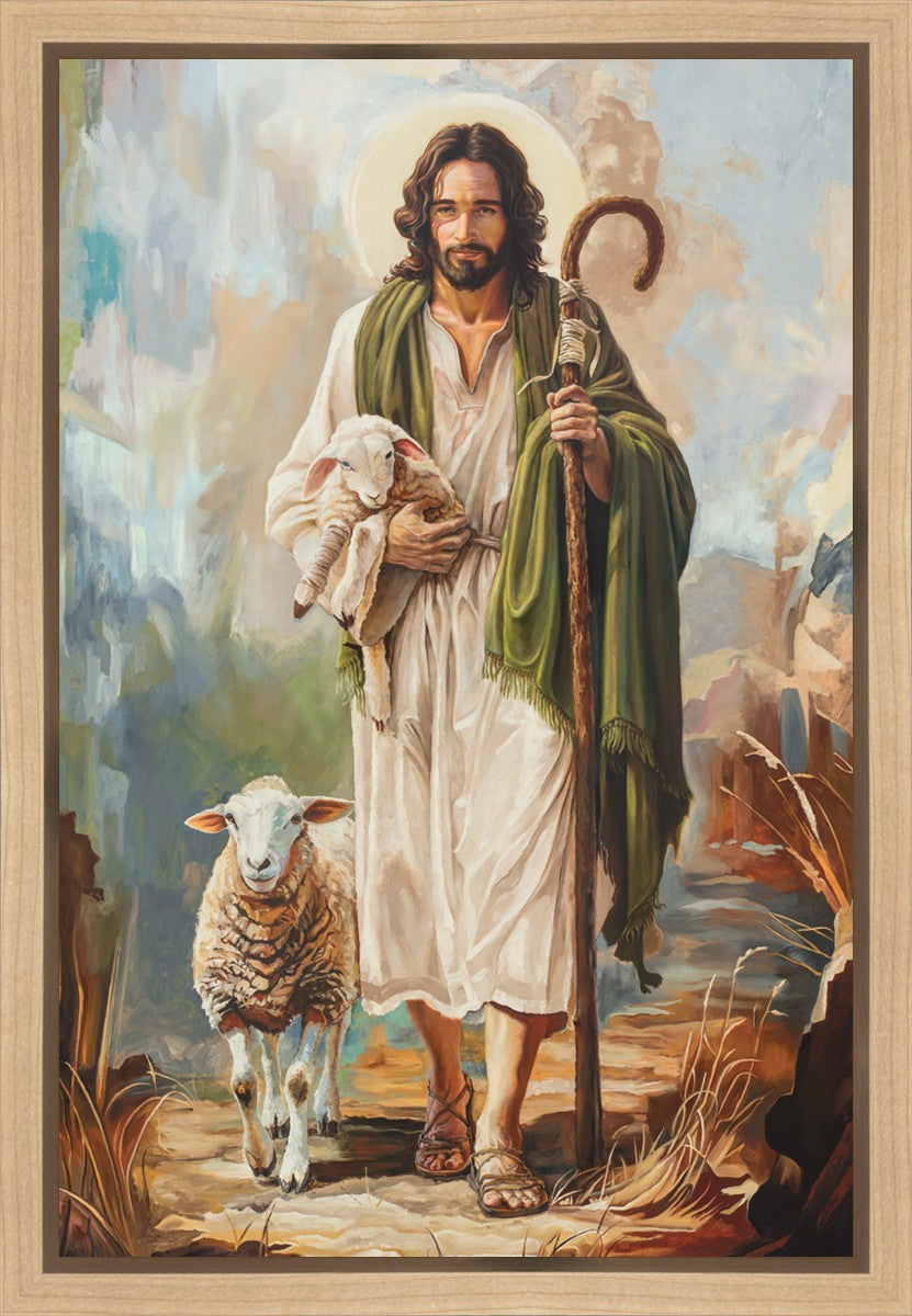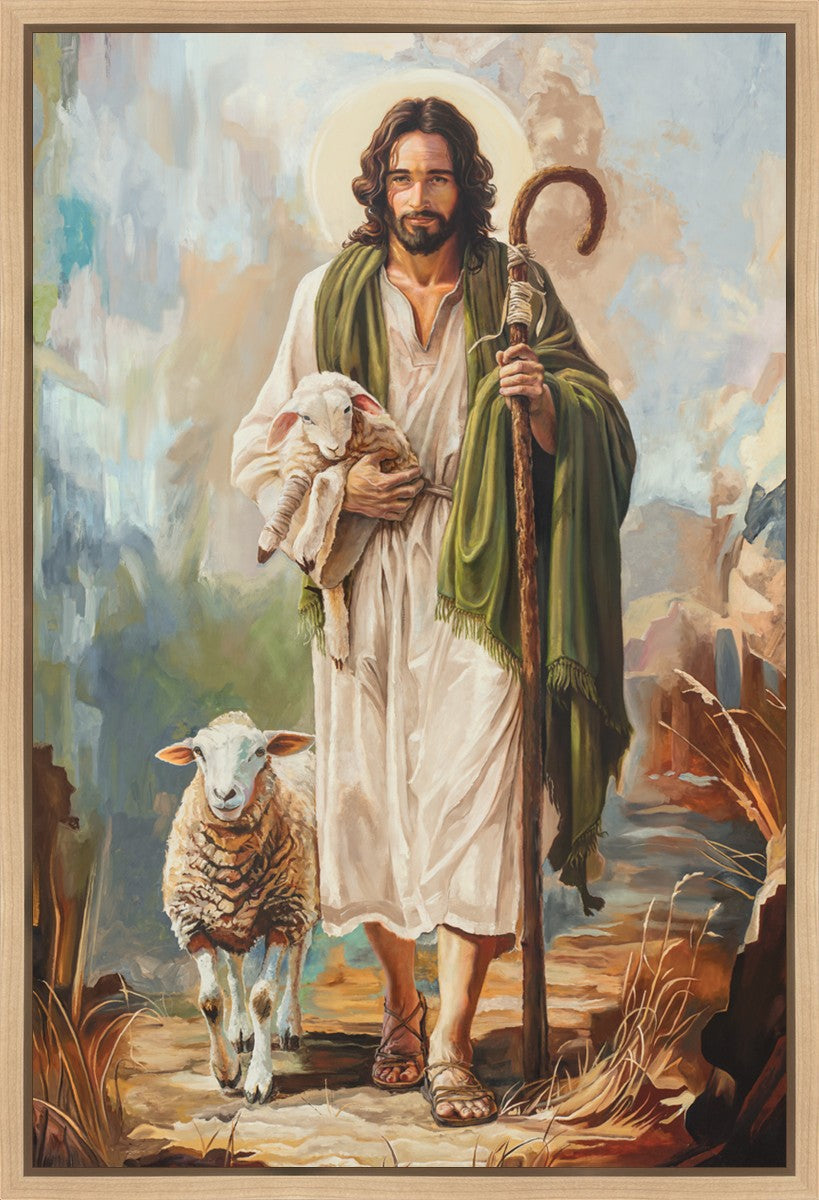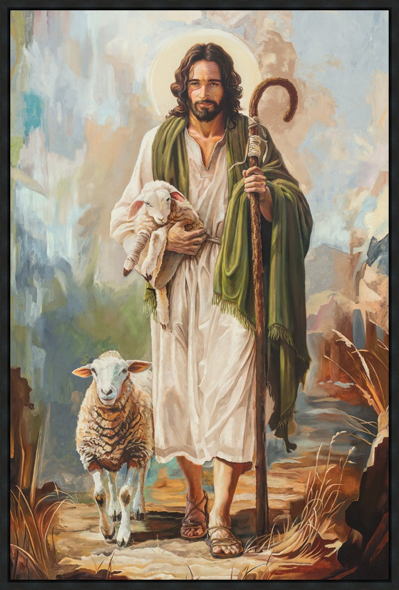 This oil on canvas painting portrays Christ in the Good Shepherd motif, leading His flock with strength and compassion. Like shepherds of ancient Israel who walked ahead of their sheep, guiding them with familiarity and trust, Christ strides forward, exemplifying the guidance and protection He offers to all who follow Him. In His arms, He cradles an injured lamb, representing those who have strayed and experienced hurt. Through the warm, earthy tones of the landscape and the gentle, reassuring details in Christ’s expression, the painting conveys a sense of peace and safety. The lamb, embraced in the Shepherd’s arms, symbolizes the grace available to those who, through repentance and faith, allow Christ to tend to their wounds and restore them to His flock.
