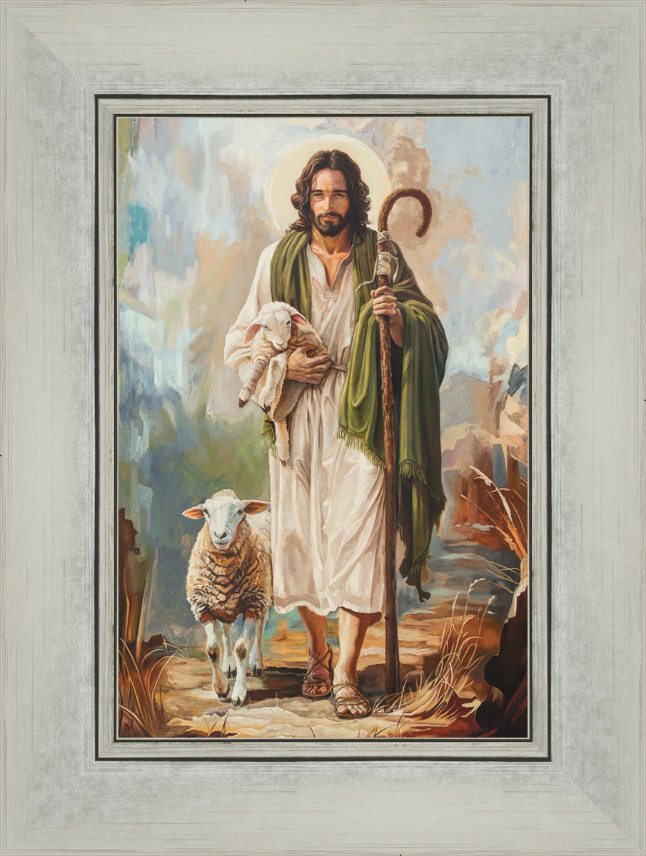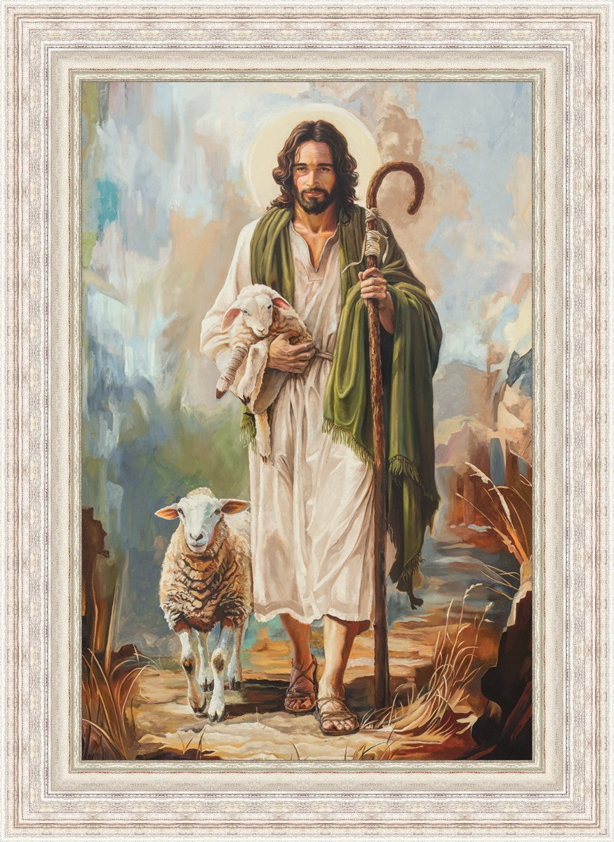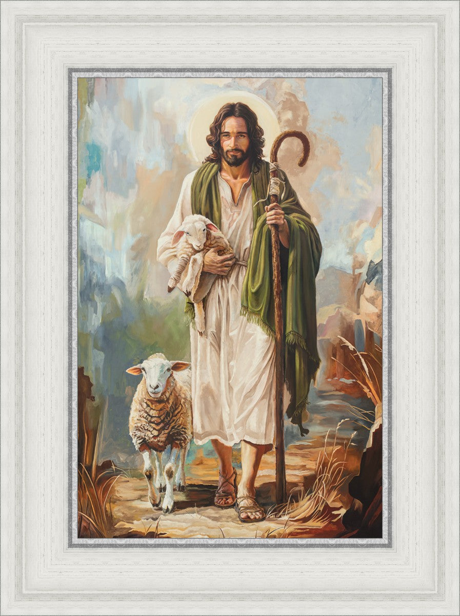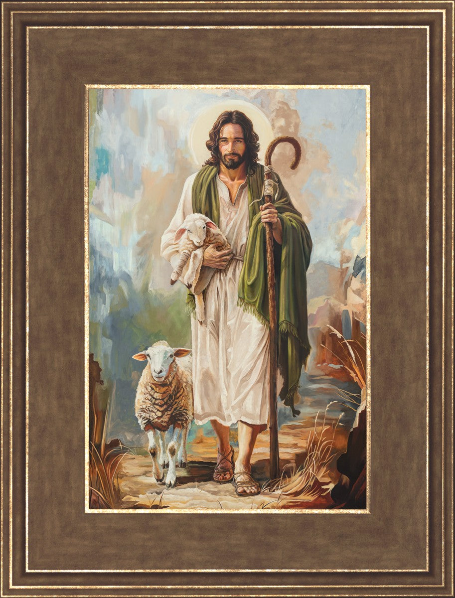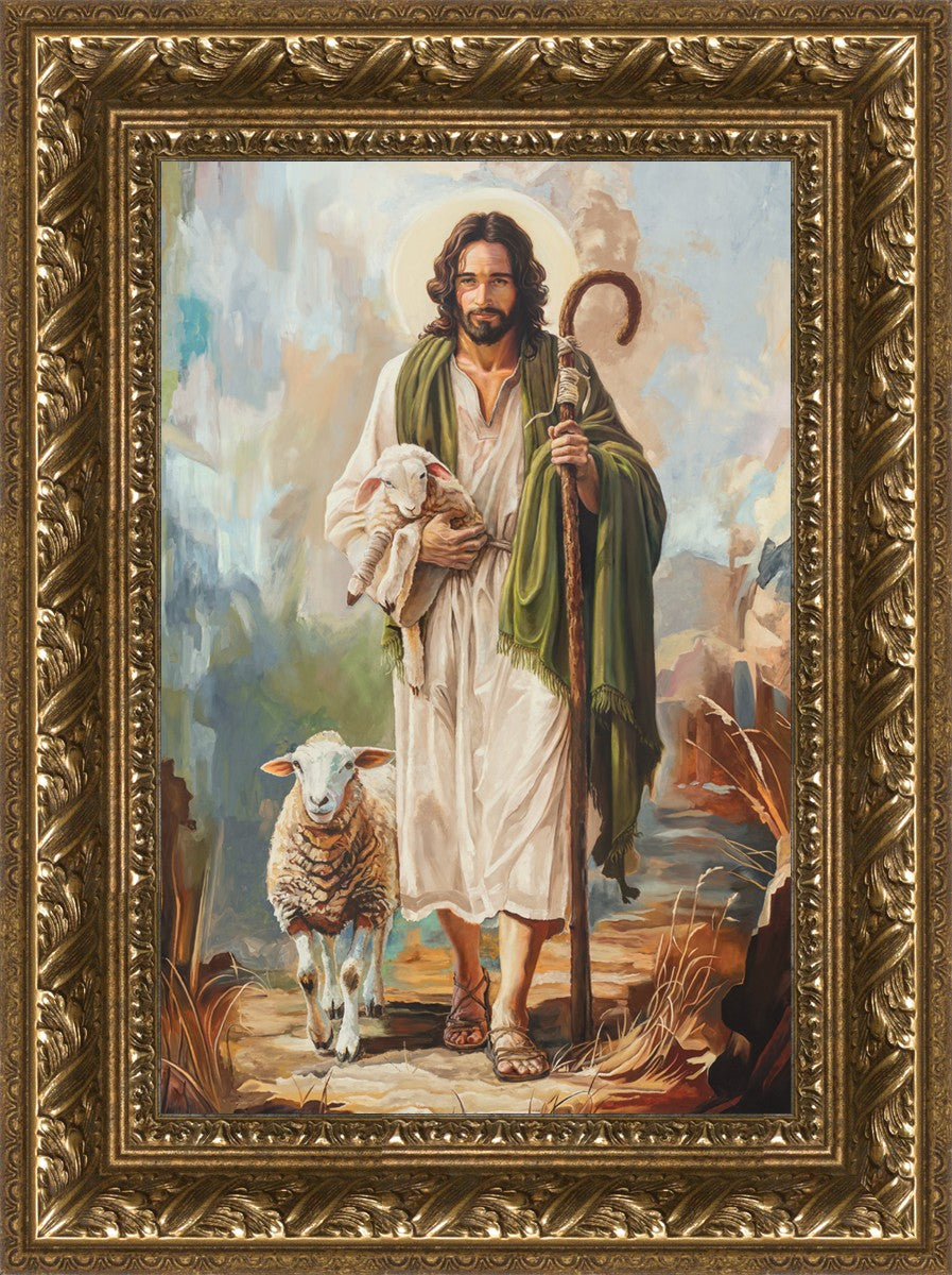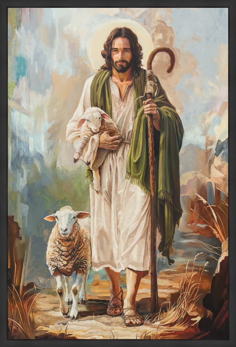 This oil on canvas painting portrays Christ in the Good Shepherd motif, leading His flock with strength and compassion. Like shepherds of ancient Israel who walked ahead of their sheep, guiding them with familiarity and trust, Christ strides forward, exemplifying the guidance and protection He offers to all who follow Him. In His arms, He cradles an injured lamb, representing those who have strayed and experienced hurt. Through the warm, earthy tones of the landscape and the gentle, reassuring details in Christ’s expression, the painting conveys a sense of peace and safety. The lamb, embraced in the Shepherd’s arms, symbolizes the grace available to those who, through repentance and faith, allow Christ to tend to their wounds and restore them to His flock.