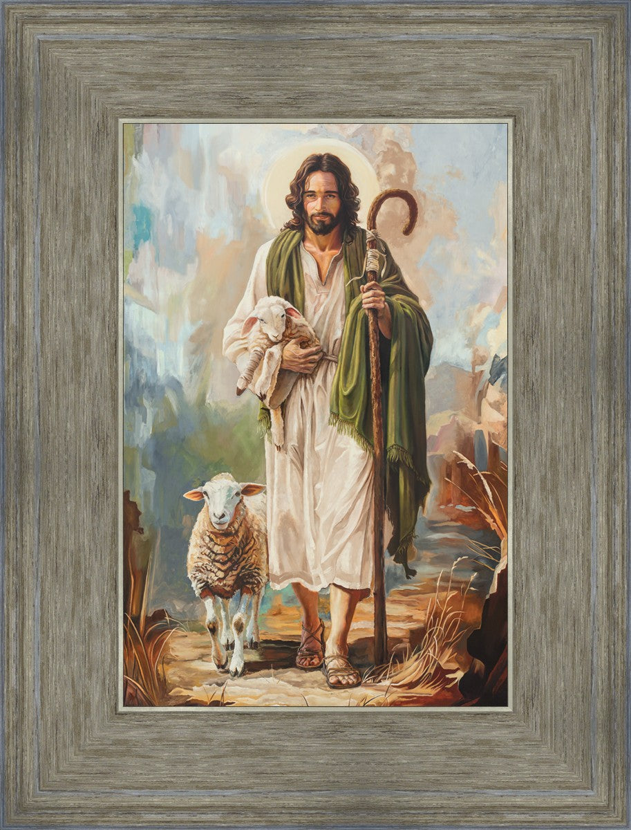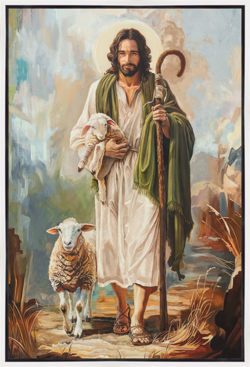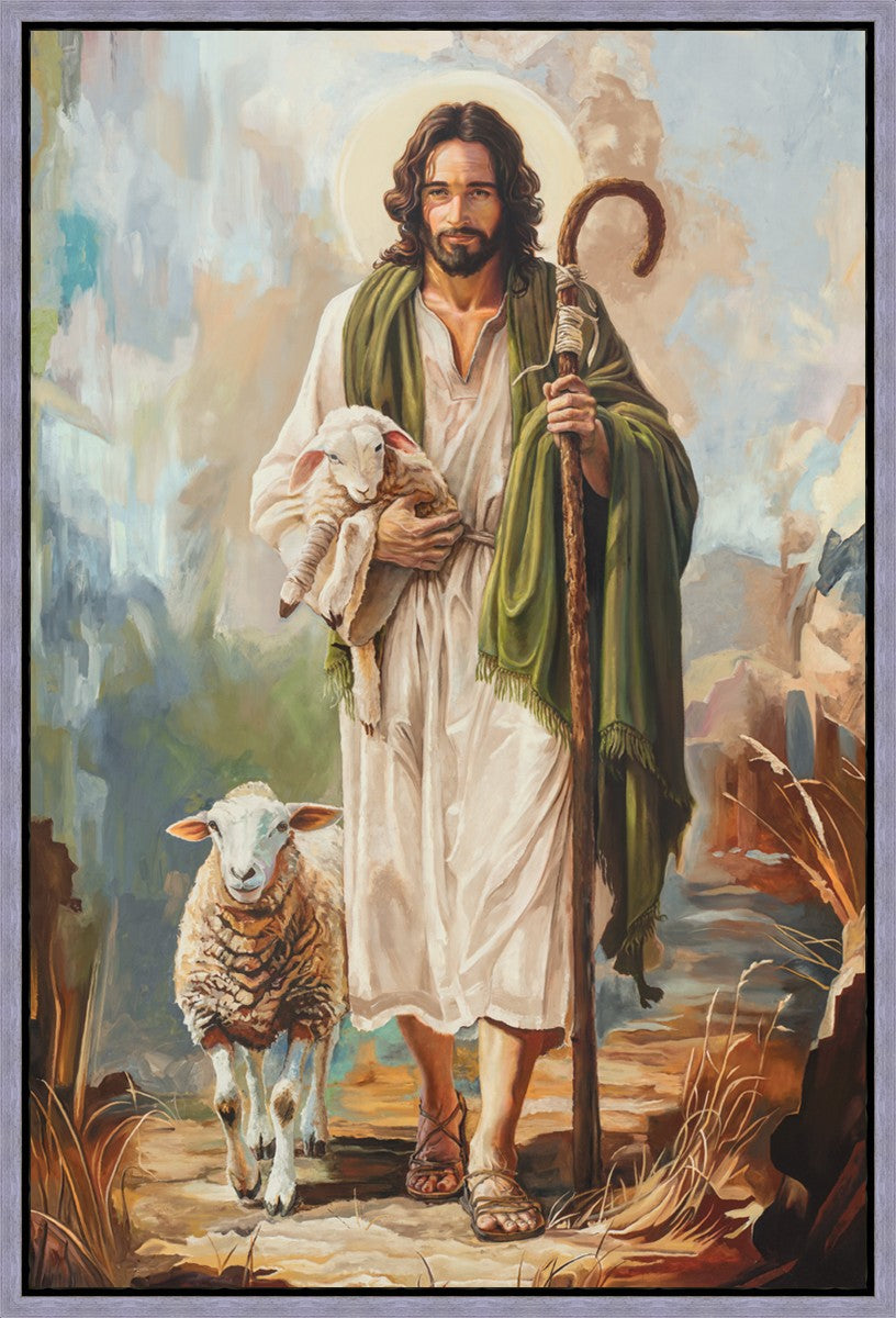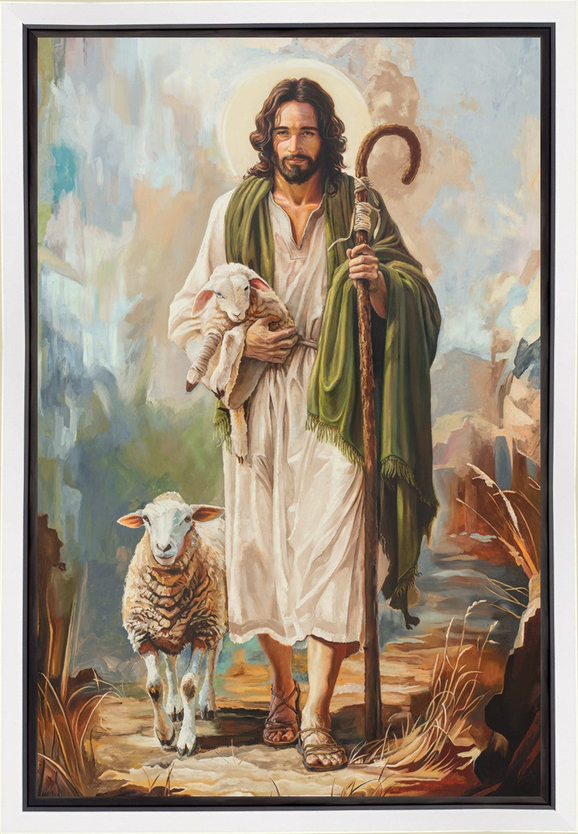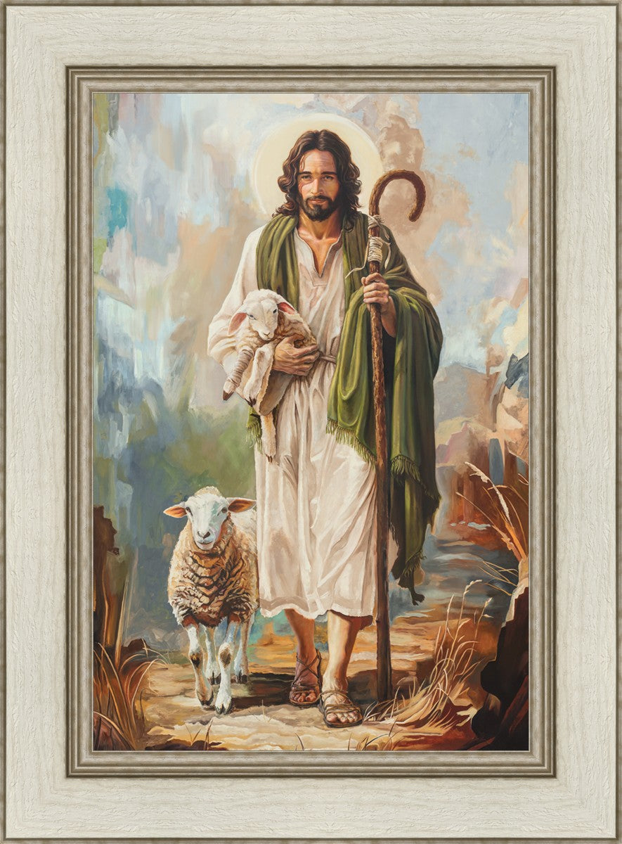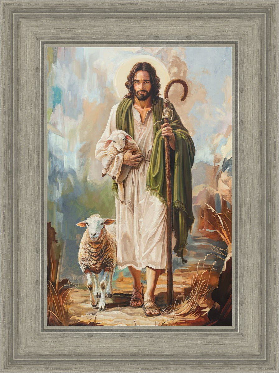This oil on canvas painting portrays Christ in the Good Shepherd motif, leading His flock with strength and compassion. Like shepherds of ancient Israel who walked ahead of their sheep, guiding them with familiarity and trust, Christ strides forward, exemplifying the guidance and protection He offers to all who follow Him. In His arms, He cradles an injured lamb, representing those who have strayed and experienced hurt. Through the warm, earthy tones of the landscape and the gentle, reassuring details in Christ’s expression, the painting conveys a sense of peace and safety. The lamb, embraced in the Shepherd’s arms, symbolizes the grace available to those who, through repentance and faith, allow Christ to tend to their wounds and restore them to His flock.