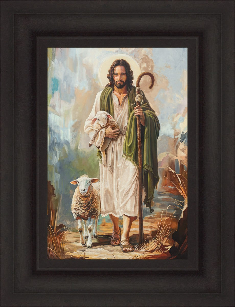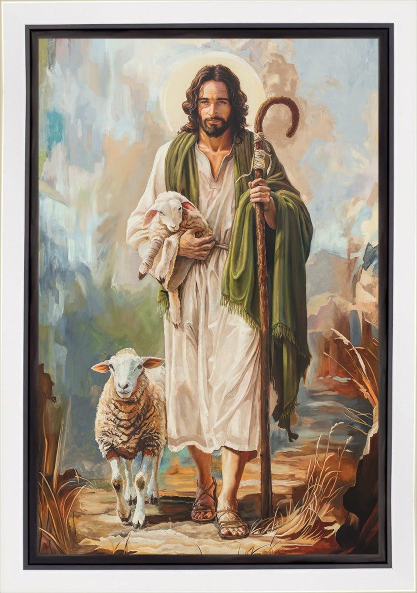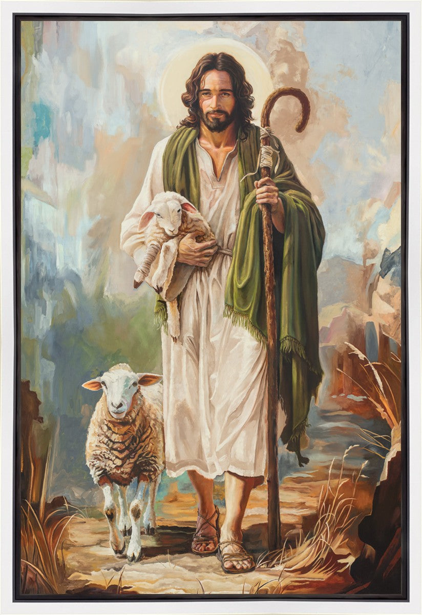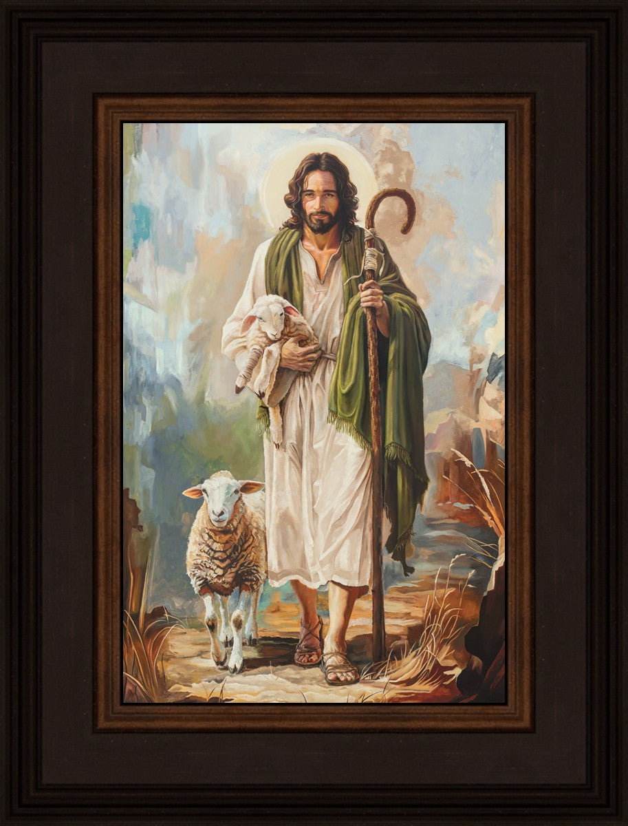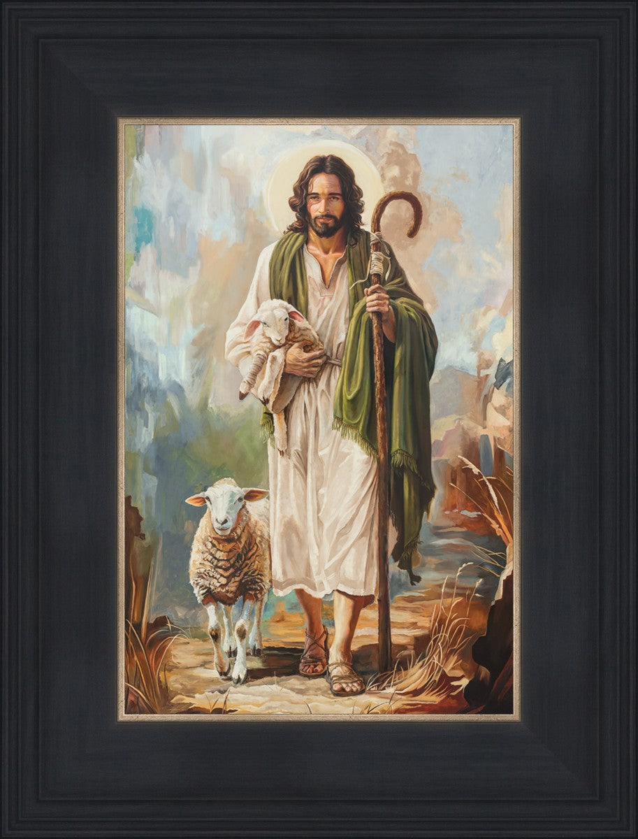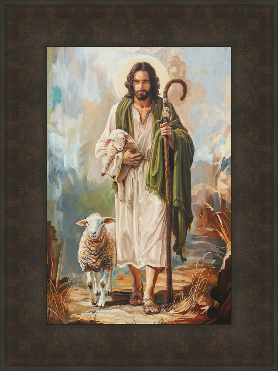 This oil on canvas painting portrays Christ in the Good Shepherd motif, leading His flock with strength and compassion. Like shepherds of ancient Israel who walked ahead of their sheep, guiding them with familiarity and trust, Christ strides forward, exemplifying the guidance and protection He offers to all who follow Him. In His arms, He cradles an injured lamb, representing those who have strayed and experienced hurt. Through the warm, earthy tones of the landscape and the gentle, reassuring details in Christ’s expression, the painting conveys a sense of peace and safety. The lamb, embraced in the Shepherd’s arms, symbolizes the grace available to those who, through repentance and faith, allow Christ to tend to their wounds and restore them to His flock.