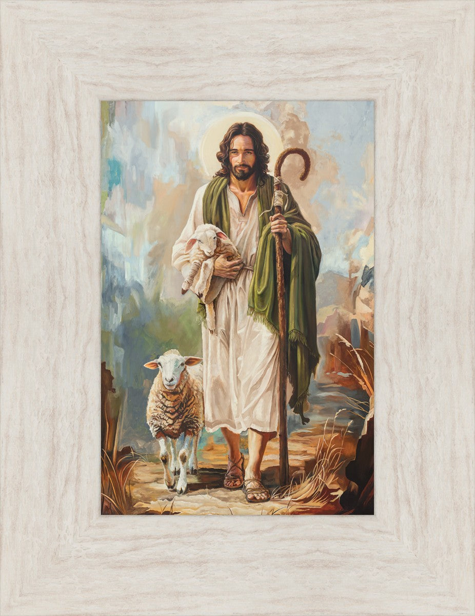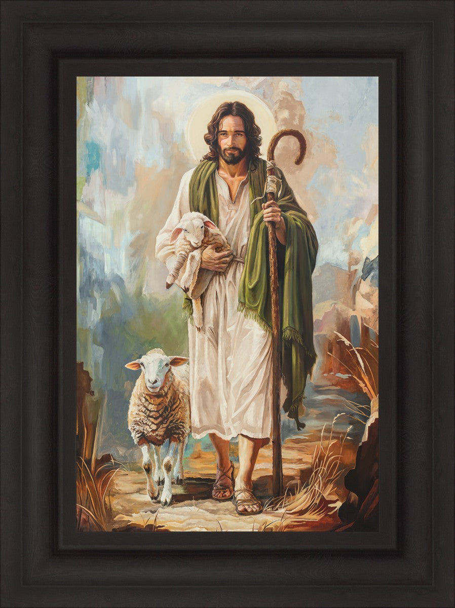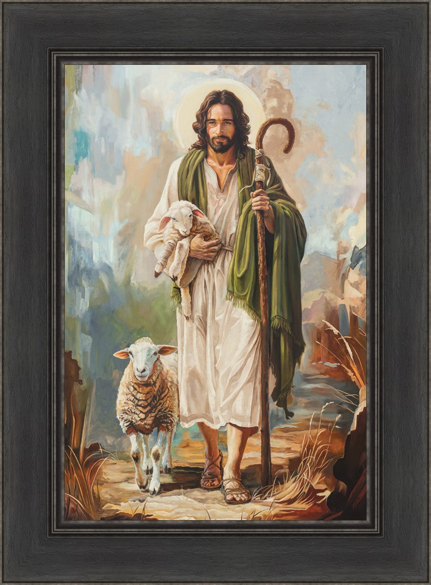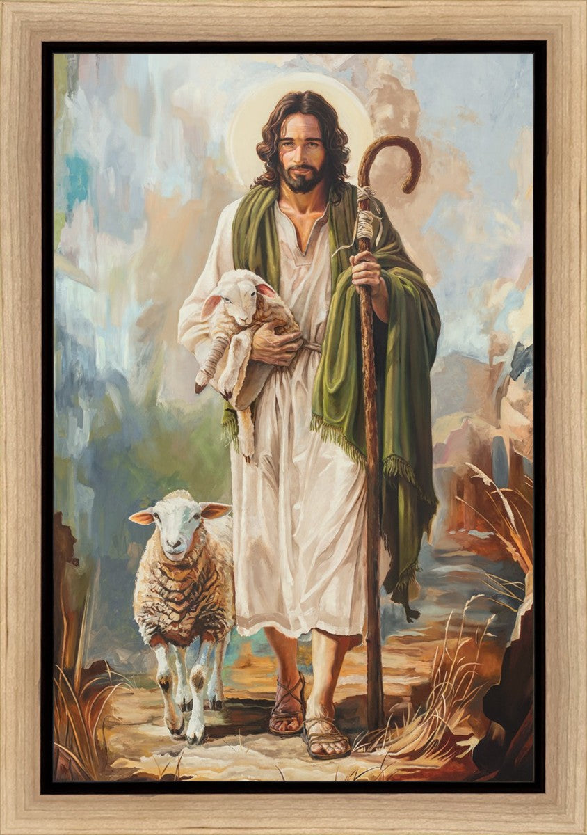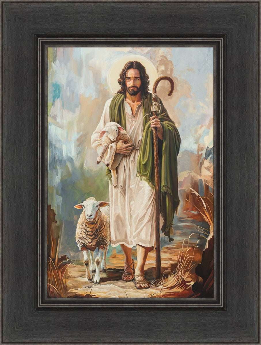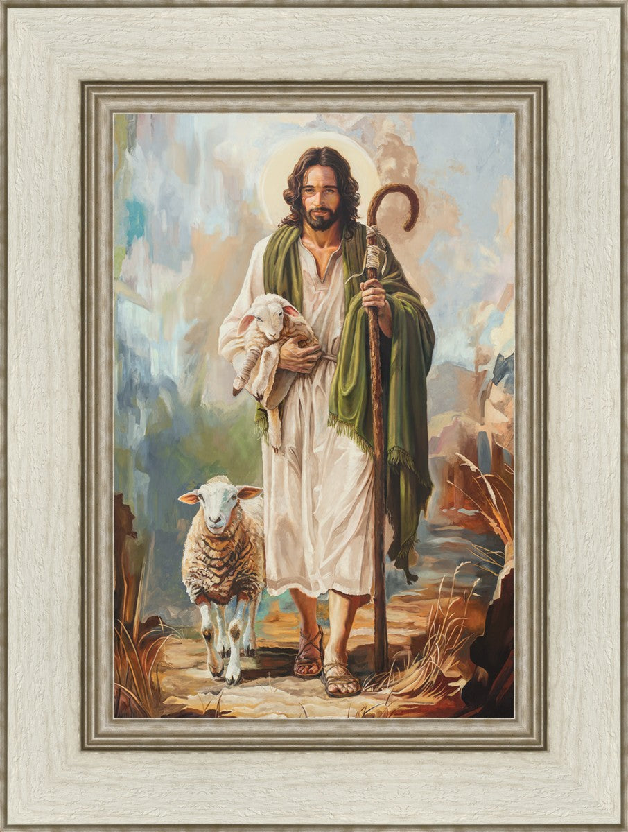 This oil on canvas painting portrays Christ in the Good Shepherd motif, leading His flock with strength and compassion. Like shepherds of ancient Israel who walked ahead of their sheep, guiding them with familiarity and trust, Christ strides forward, exemplifying the guidance and protection He offers to all who follow Him. In His arms, He cradles an injured lamb, representing those who have strayed and experienced hurt. Through the warm, earthy tones of the landscape and the gentle, reassuring details in Christ’s expression, the painting conveys a sense of peace and safety. The lamb, embraced in the Shepherd’s arms, symbolizes the grace available to those who, through repentance and faith, allow Christ to tend to their wounds and restore them to His flock.