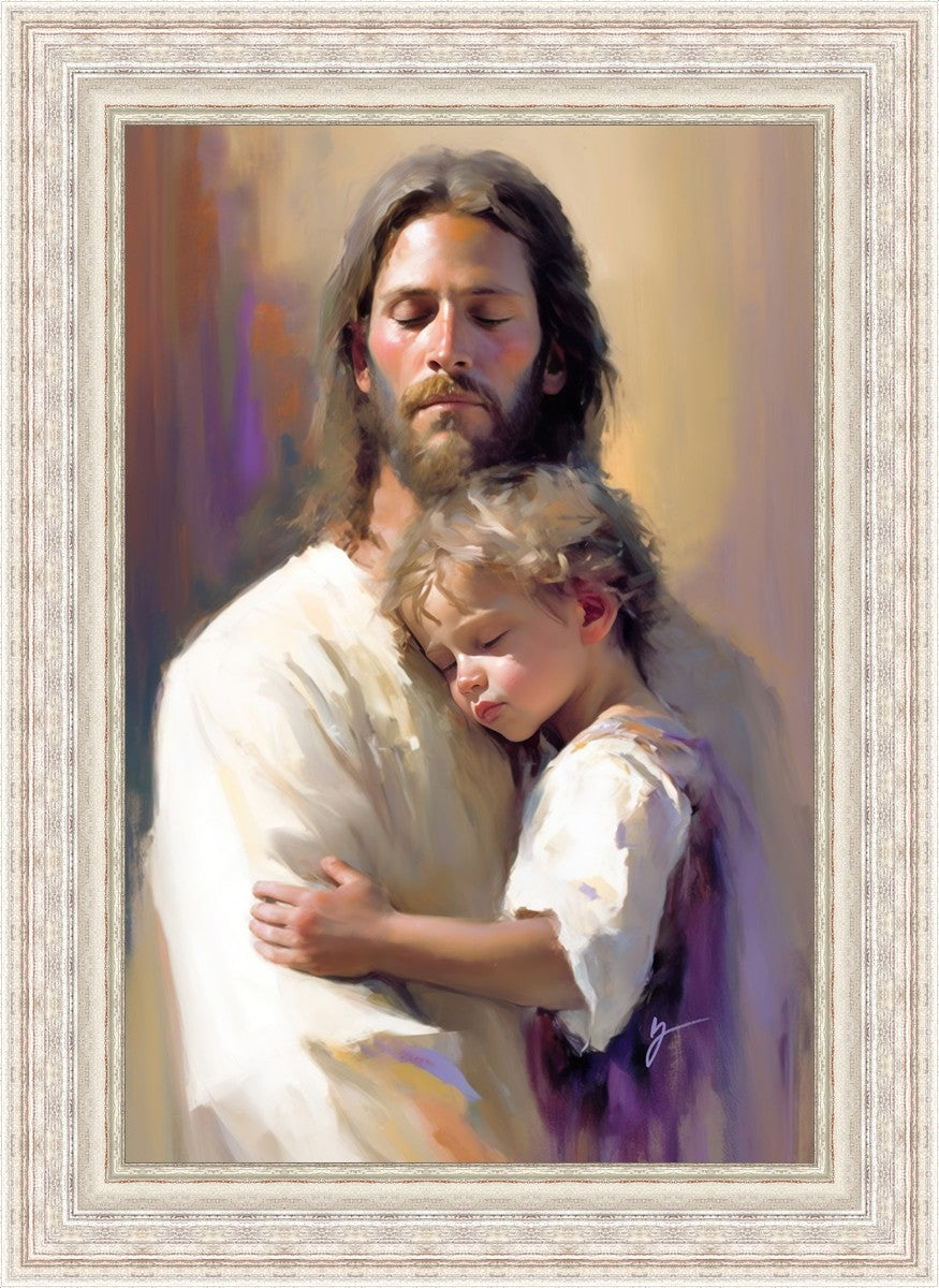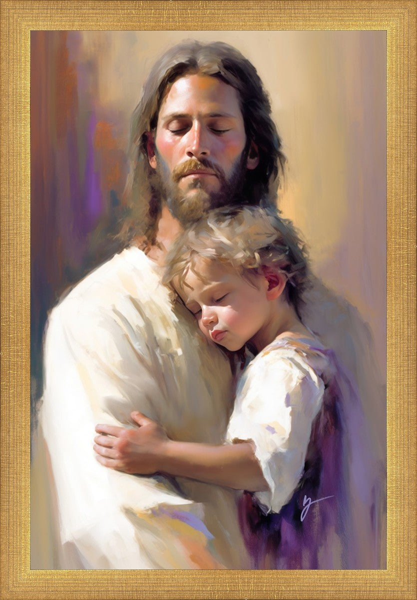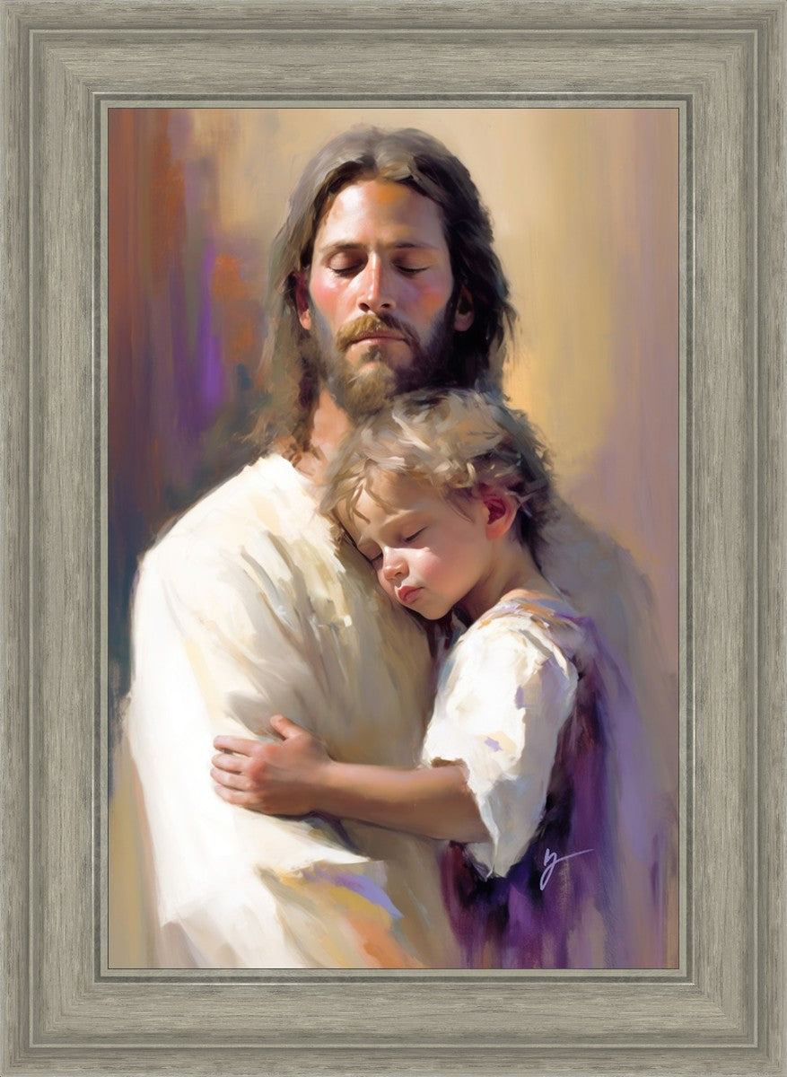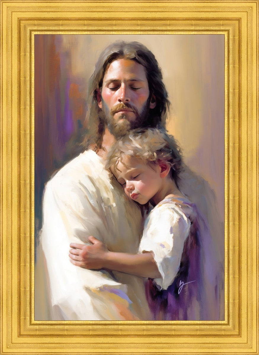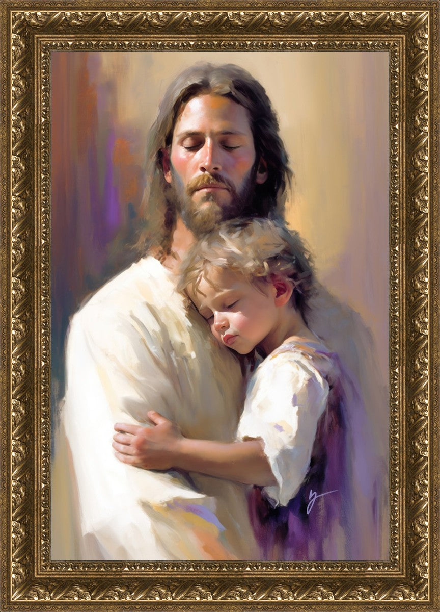 Step into a world of divine embrace with the captivating painting titled "Safely In His Arms." This exquisite artwork portrays Jesus Christ holding a small boy, their hearts intertwined in a bond of love and tranquility. With closed eyes and an embrace radiating warmth, it reminds us of the profound emotional, spiritual, and physical safety found in the loving arms of Jesus. It serves as a tender reminder to teach our children the blessings of seeking solace and comfort in the embrace of our Savior.