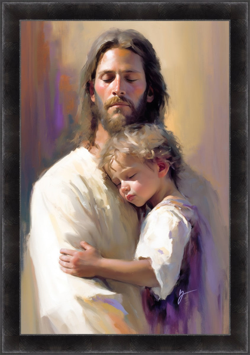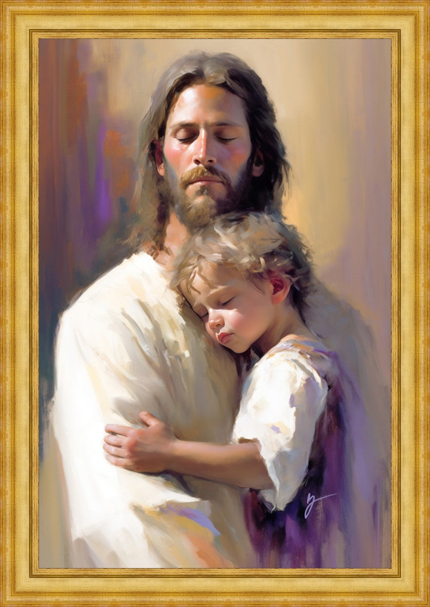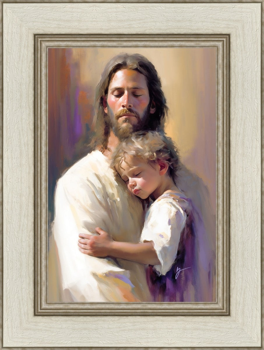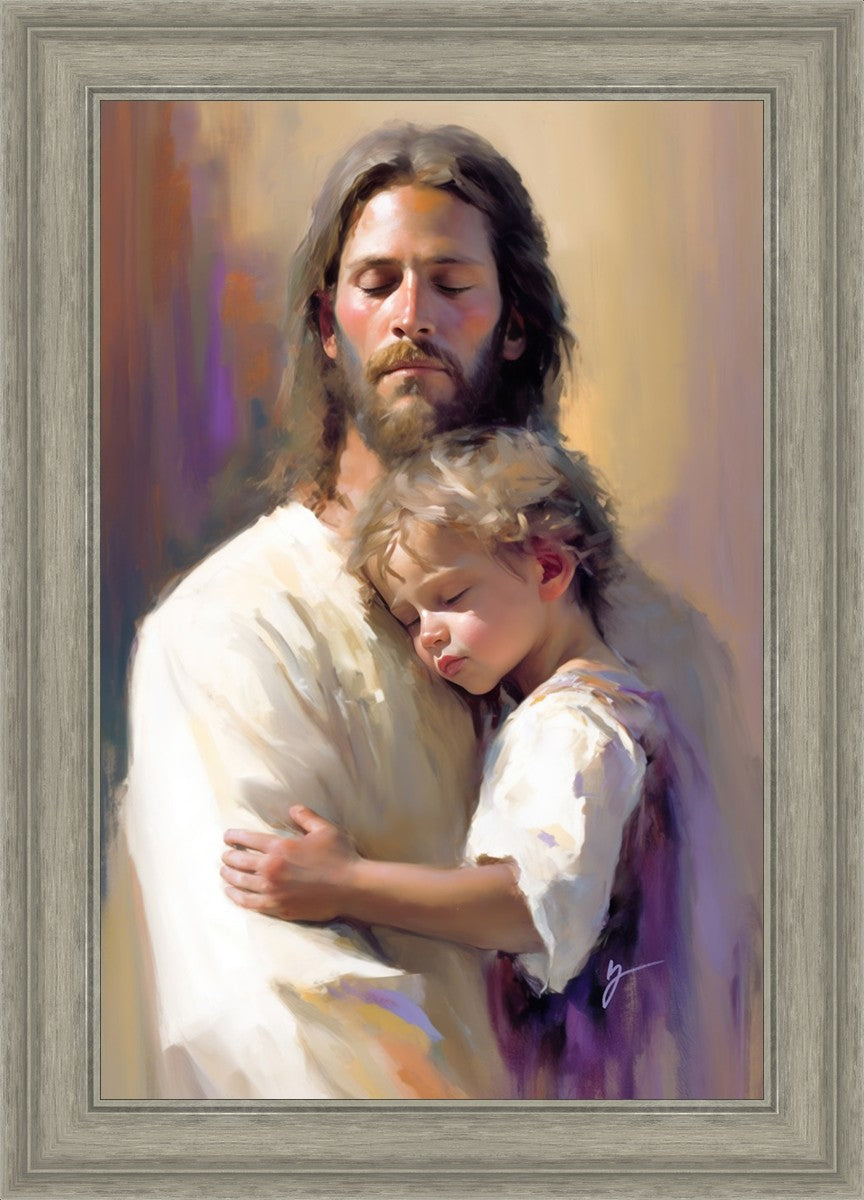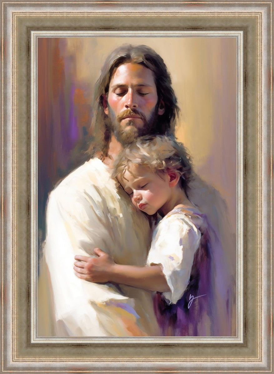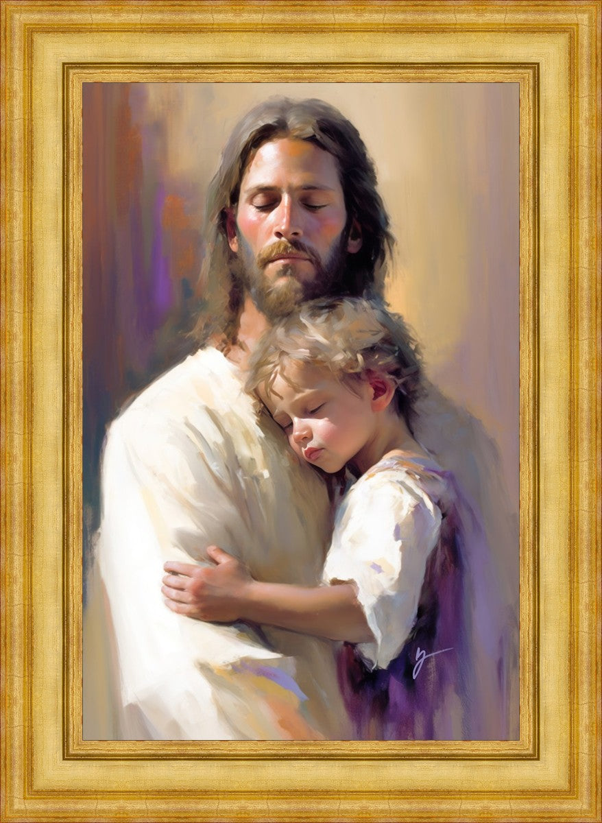 Step into a world of divine embrace with the captivating painting titled "Safely In His Arms." This exquisite artwork portrays Jesus Christ holding a small boy, their hearts intertwined in a bond of love and tranquility. With closed eyes and an embrace radiating warmth, it reminds us of the profound emotional, spiritual, and physical safety found in the loving arms of Jesus. It serves as a tender reminder to teach our children the blessings of seeking solace and comfort in the embrace of our Savior.