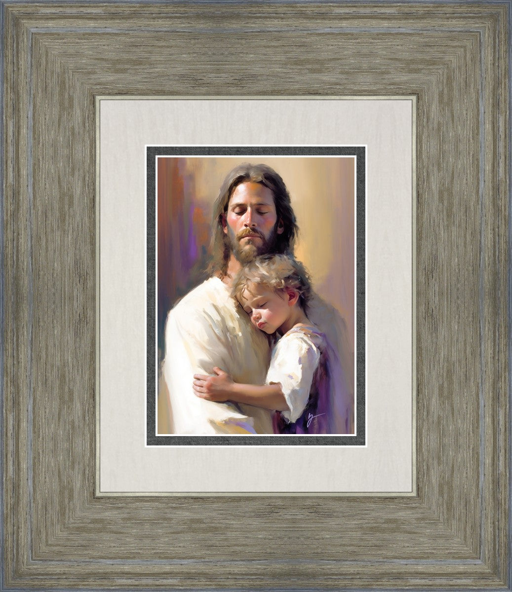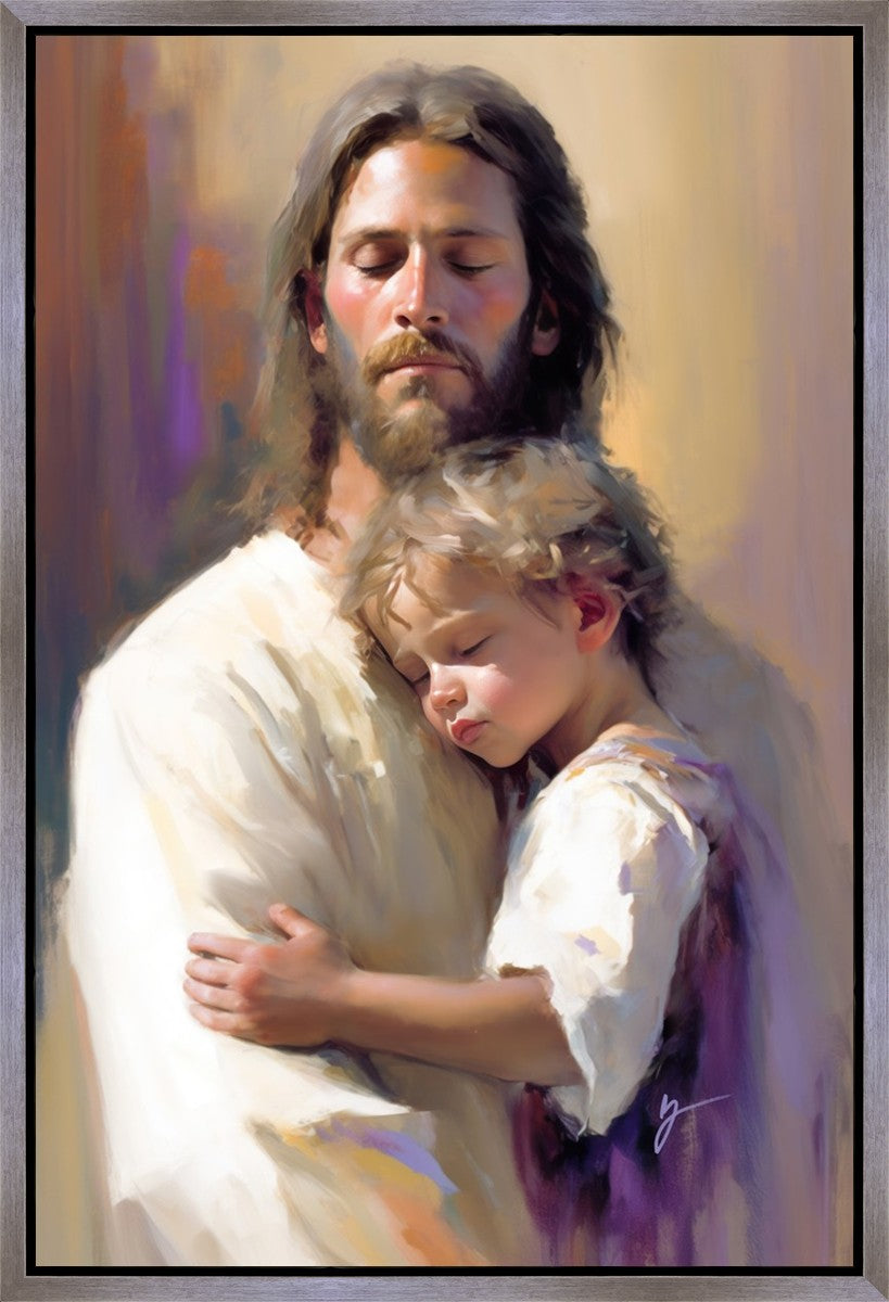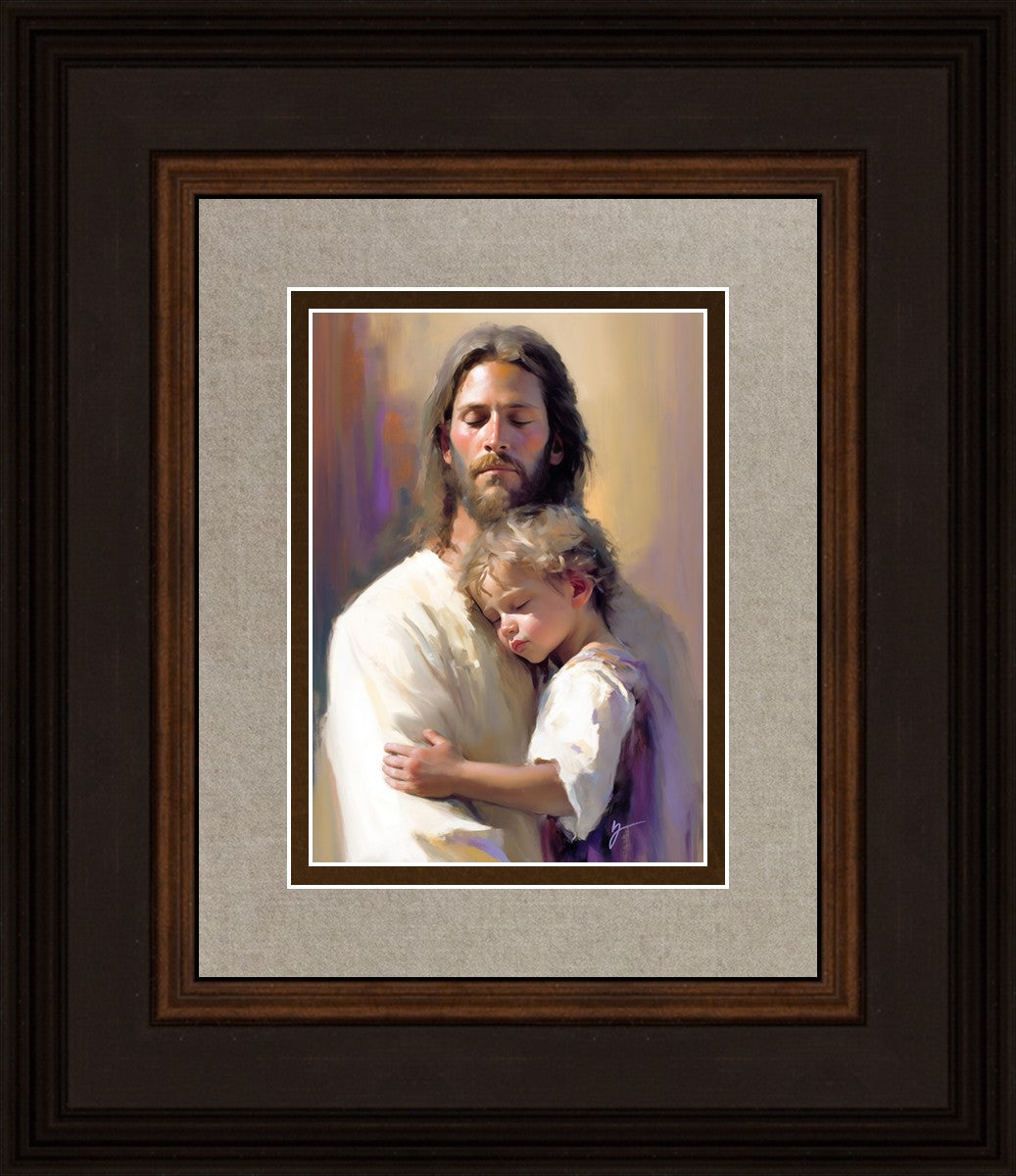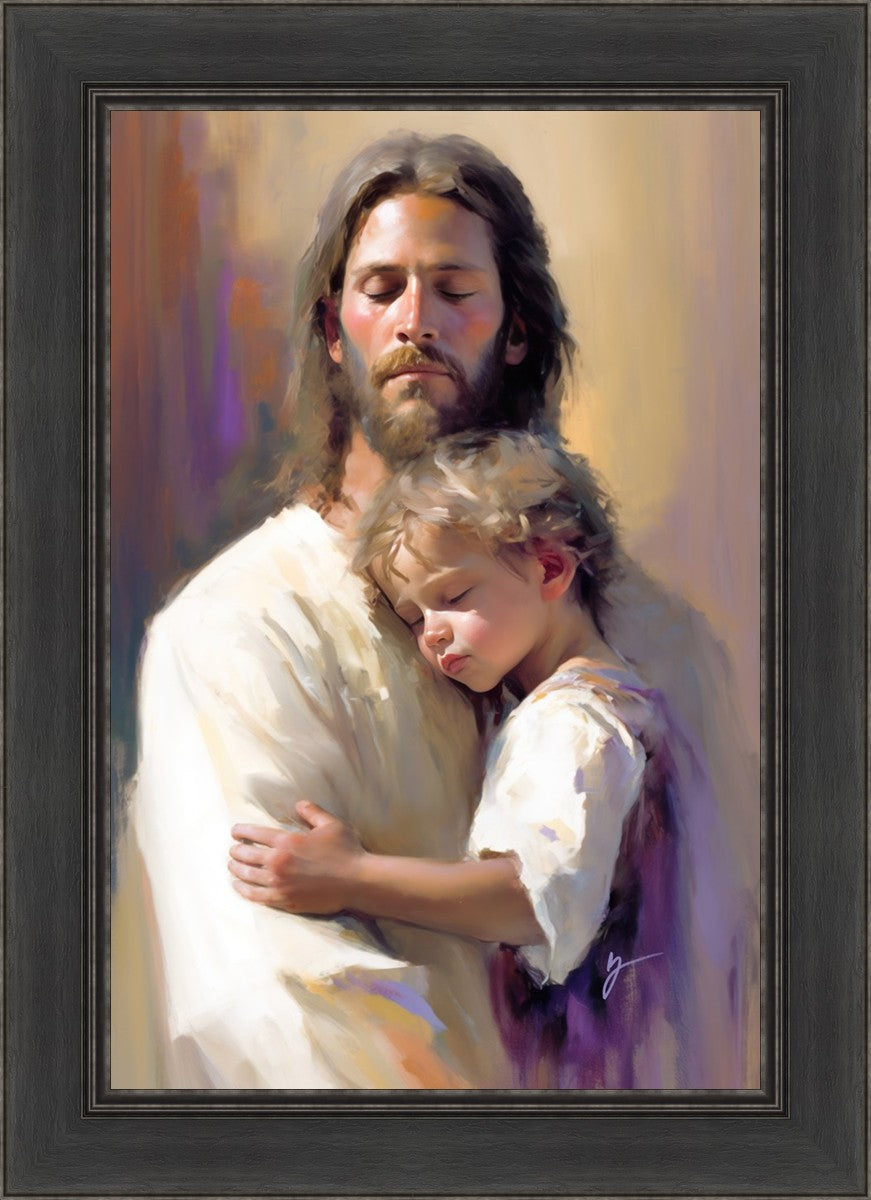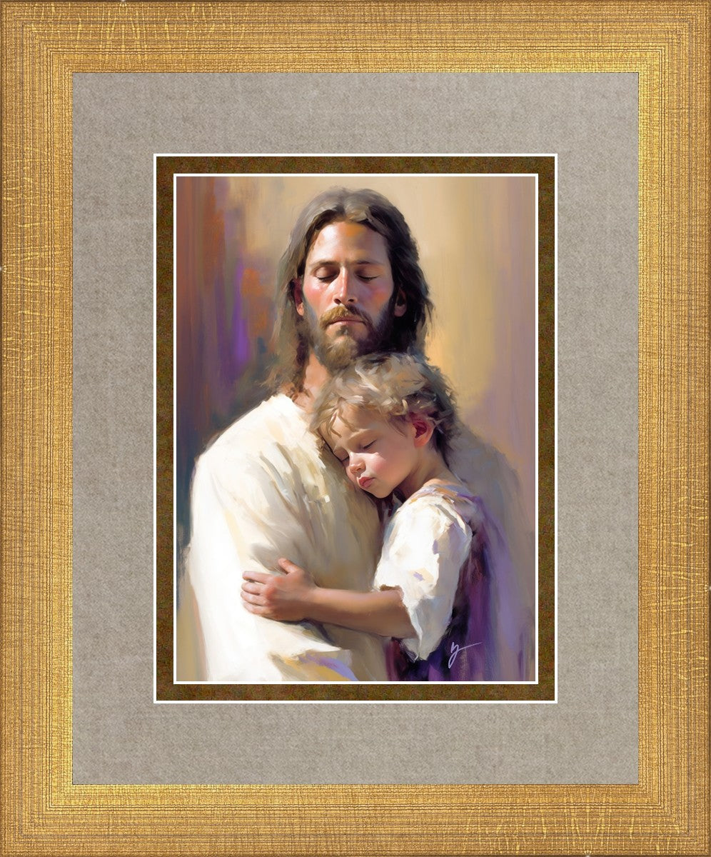 Step into a world of divine embrace with the captivating painting titled "Safely In His Arms." This exquisite artwork portrays Jesus Christ holding a small boy, their hearts intertwined in a bond of love and tranquility. With closed eyes and an embrace radiating warmth, it reminds us of the profound emotional, spiritual, and physical safety found in the loving arms of Jesus. It serves as a tender reminder to teach our children the blessings of seeking solace and comfort in the embrace of our Savior.