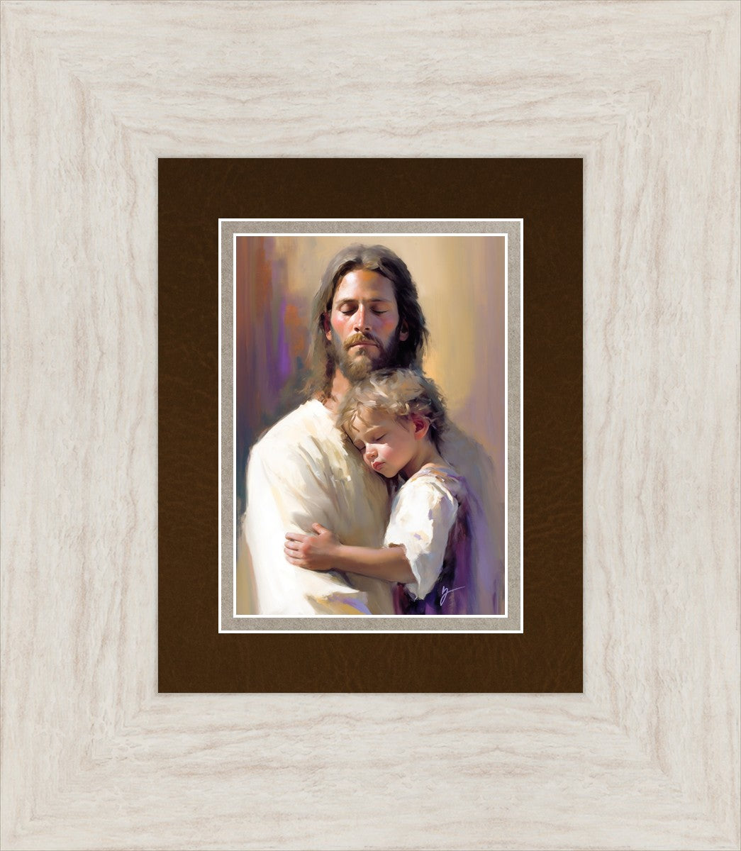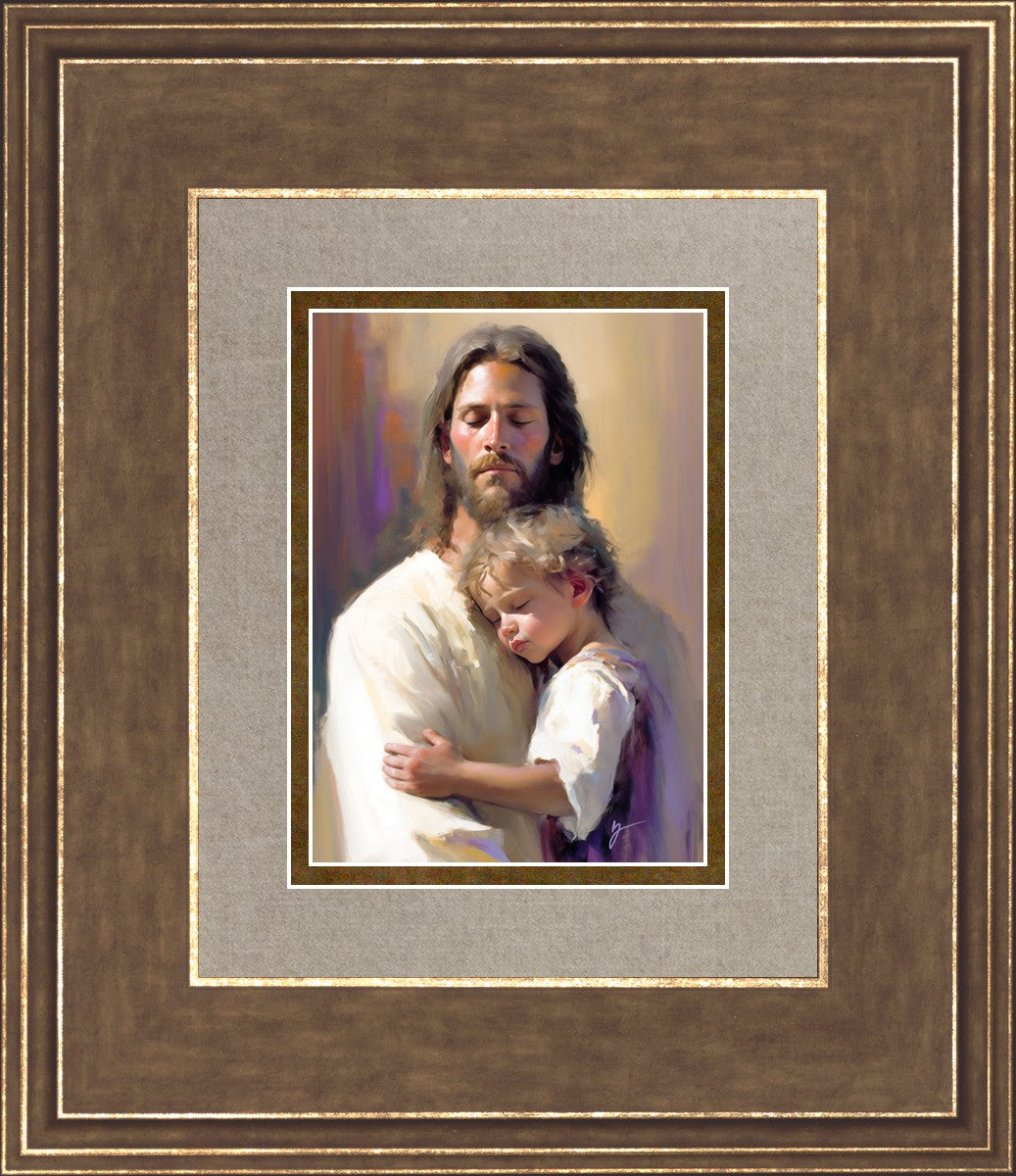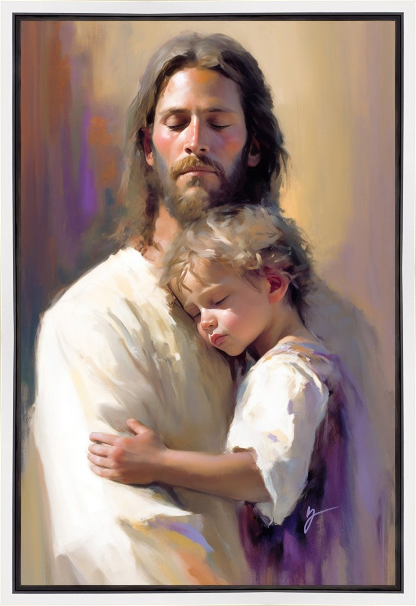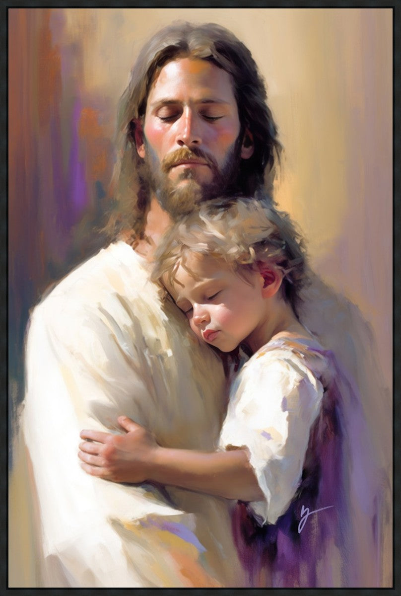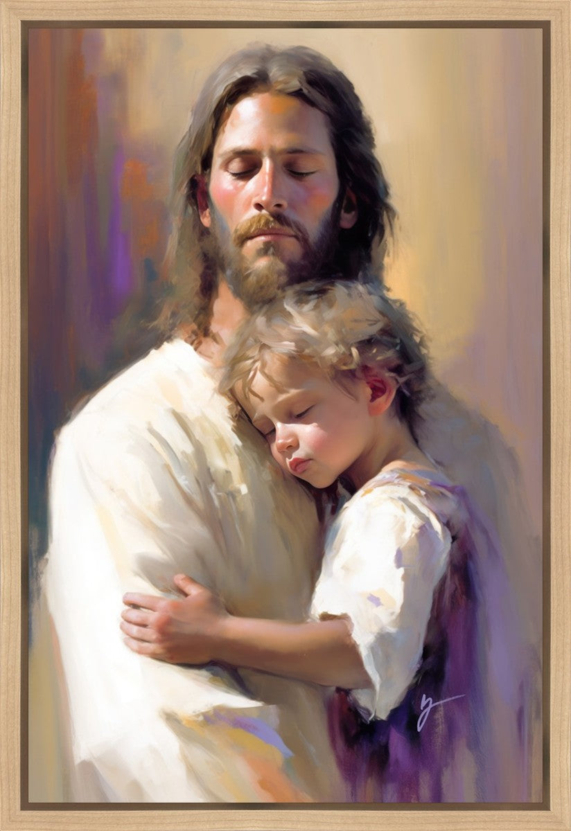 Step into a world of divine embrace with the captivating painting titled "Safely In His Arms." This exquisite artwork portrays Jesus Christ holding a small boy, their hearts intertwined in a bond of love and tranquility. With closed eyes and an embrace radiating warmth, it reminds us of the profound emotional, spiritual, and physical safety found in the loving arms of Jesus. It serves as a tender reminder to teach our children the blessings of seeking solace and comfort in the embrace of our Savior.