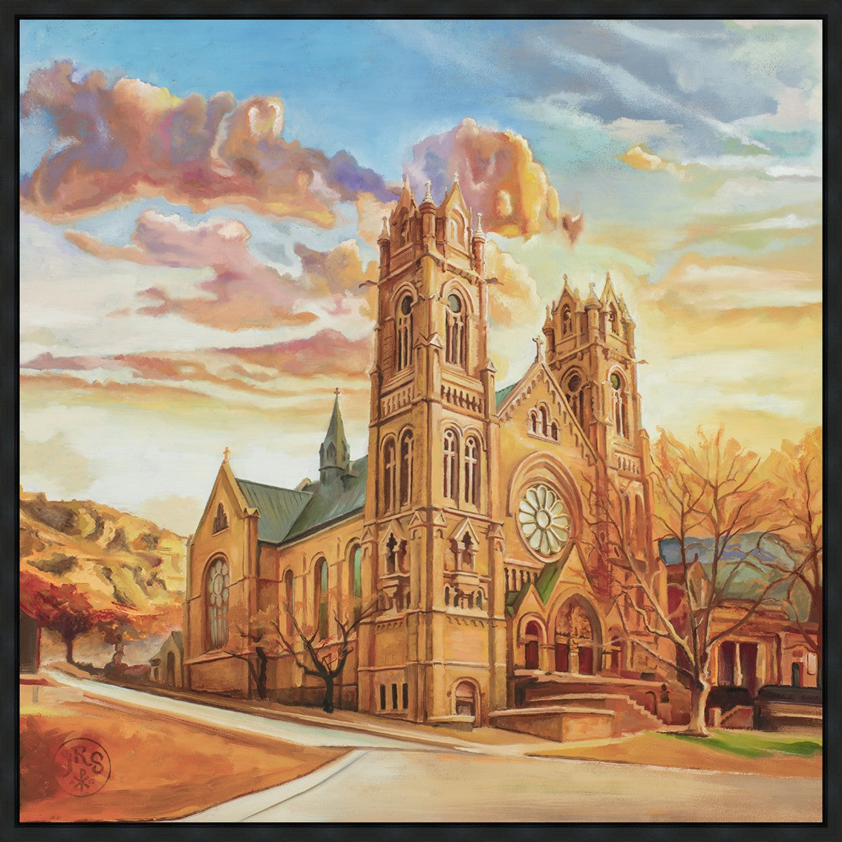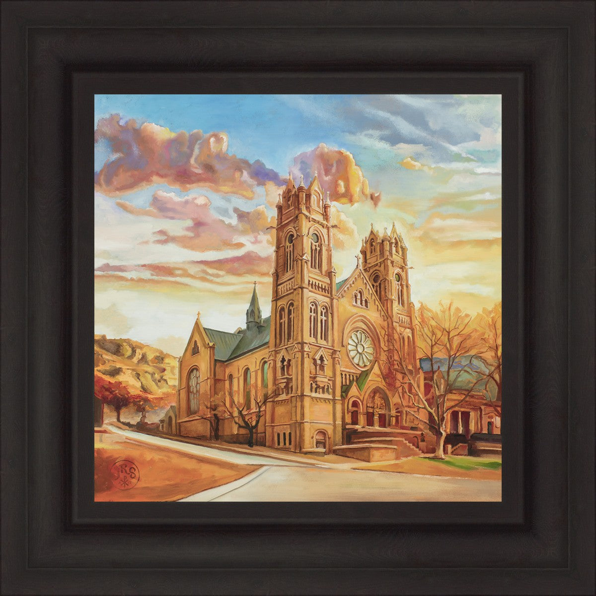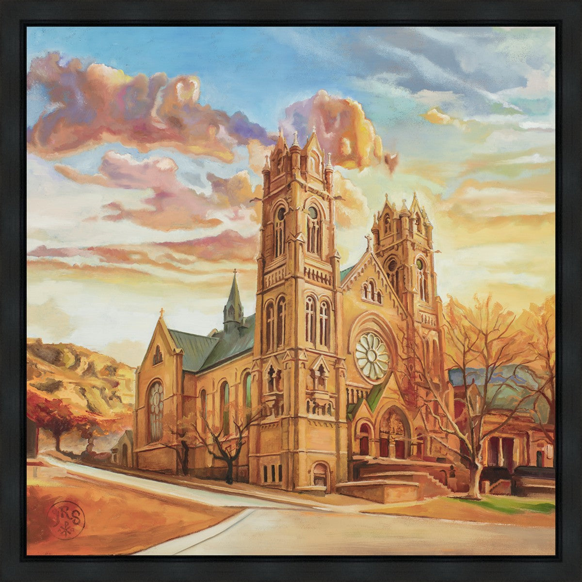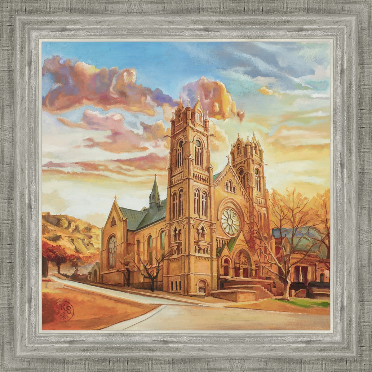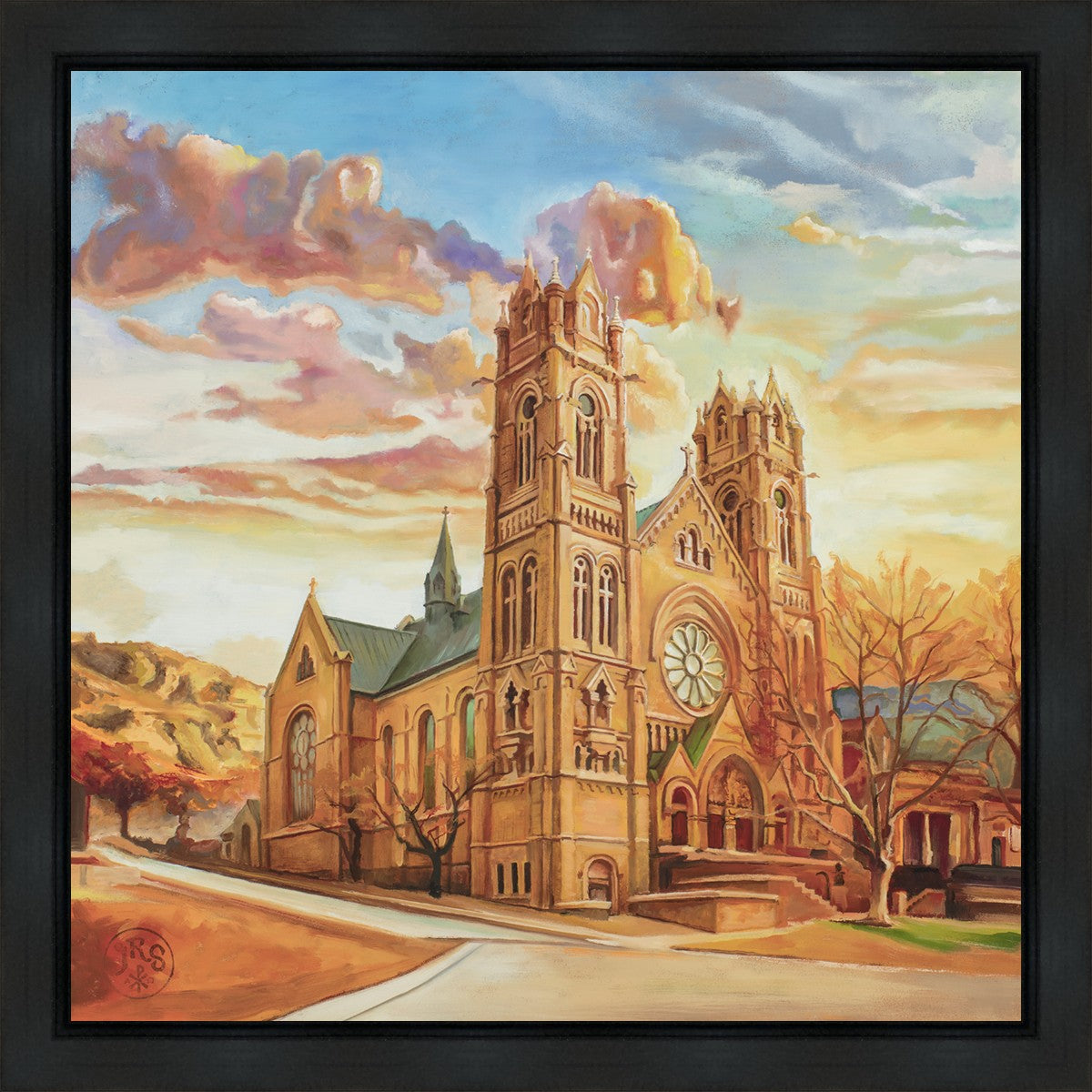 In "Saints and Sacraments: The Cathedral of the Madeline," artist Jordan Ring-Sakabe invites viewers on a visual pilgrimage through the heart of the Catholic community of Utah in the depiction of this Salt Lake City spiritual landmark. This oil on panel piece captures the essence of the Cathedral of the Madeline, a symbol of divine artistry and unwavering faith, erected in 1909. The artwork transcends mere representation, delving into the cathedral's rich narrative woven by time and devotion. The Cathedral is depicted bathed in the warm, golden hues of an autumnal sunset. This choice of lighting for depicting the iconic religious edifice, not only accentuates the grandeur of the cathedral but also casts it as a beacon of hope and faith amidst the changing seasons of life.