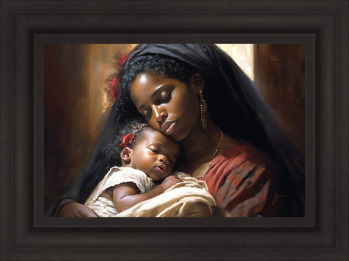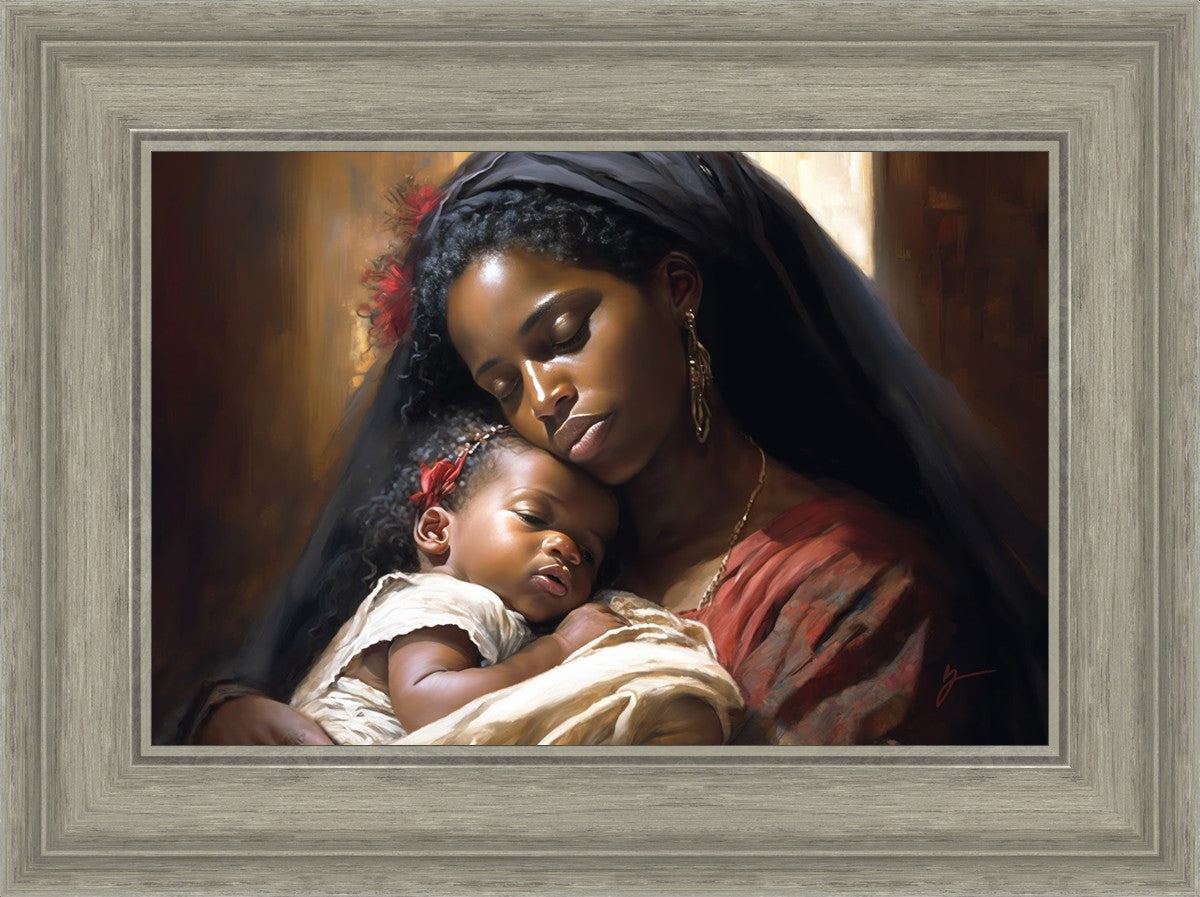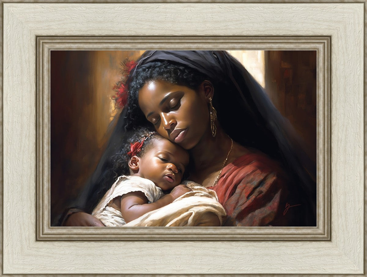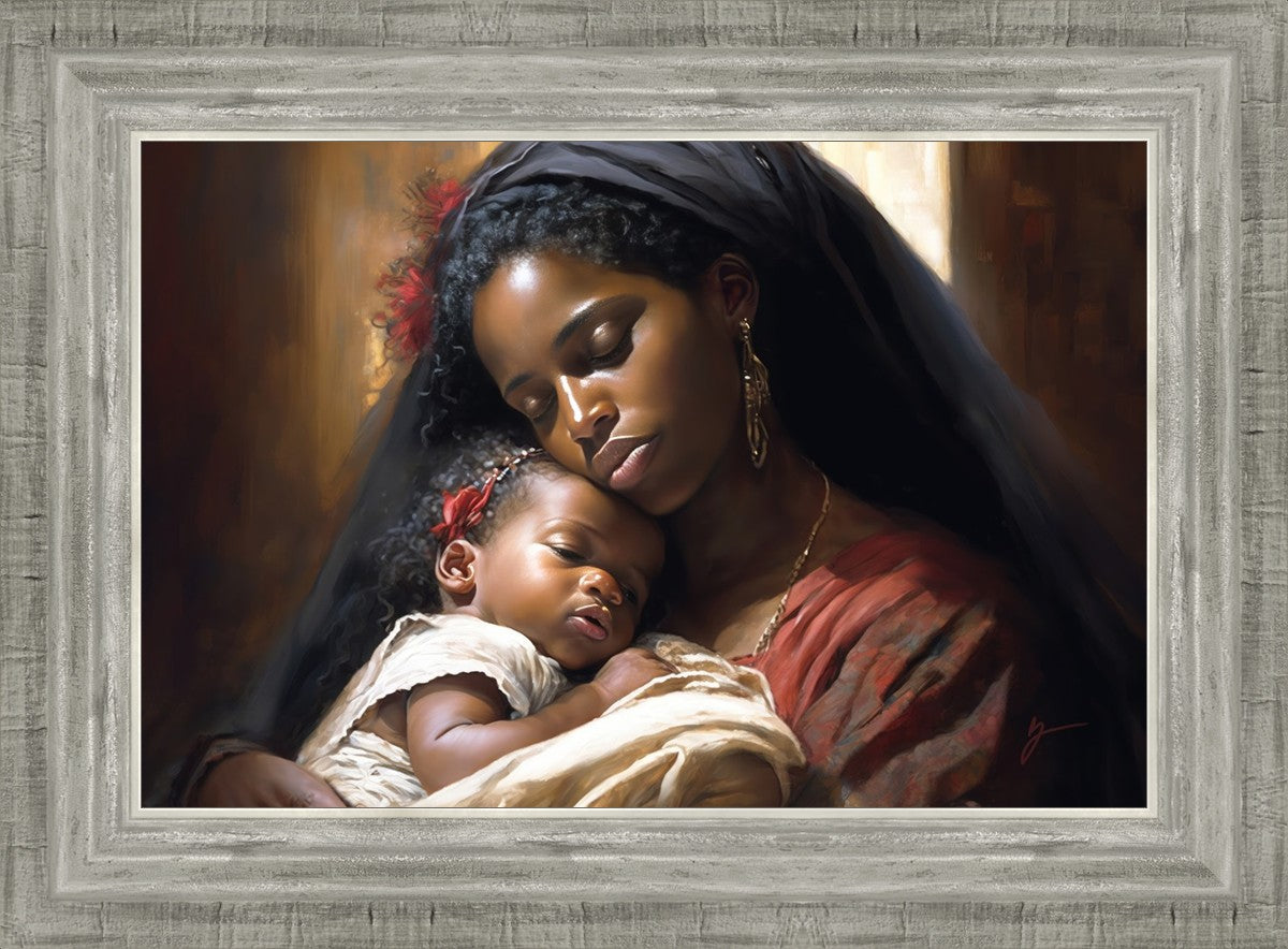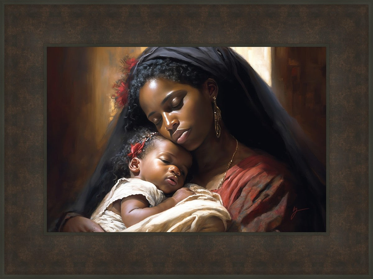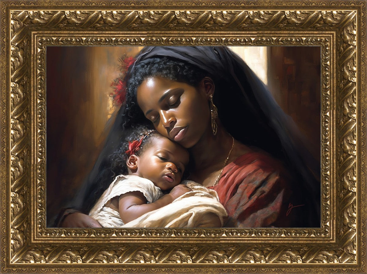 In summary, "Sanctuary of Love" is a captivating work of art that captures the beauty and tenderness of motherhood. Its warm earth tones and serene ambiance would make it a perfect addition to any home or office. This painting is not just a beautiful piece of art, but it is also a reminder of the special bond between a mother and her child.