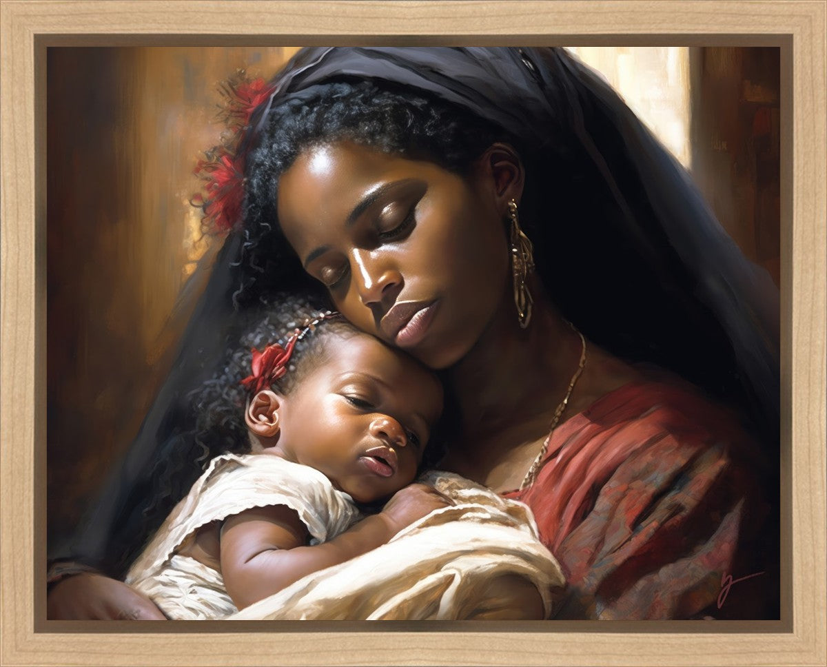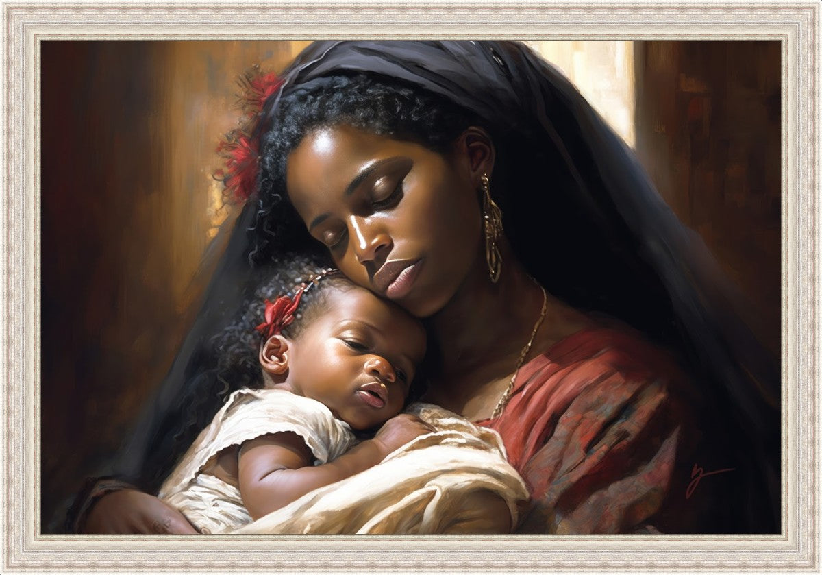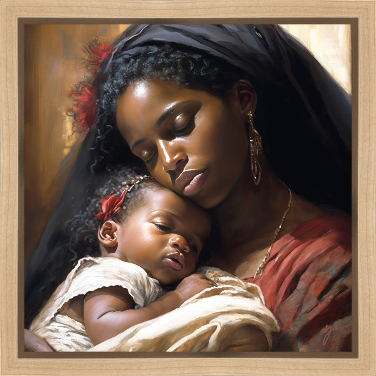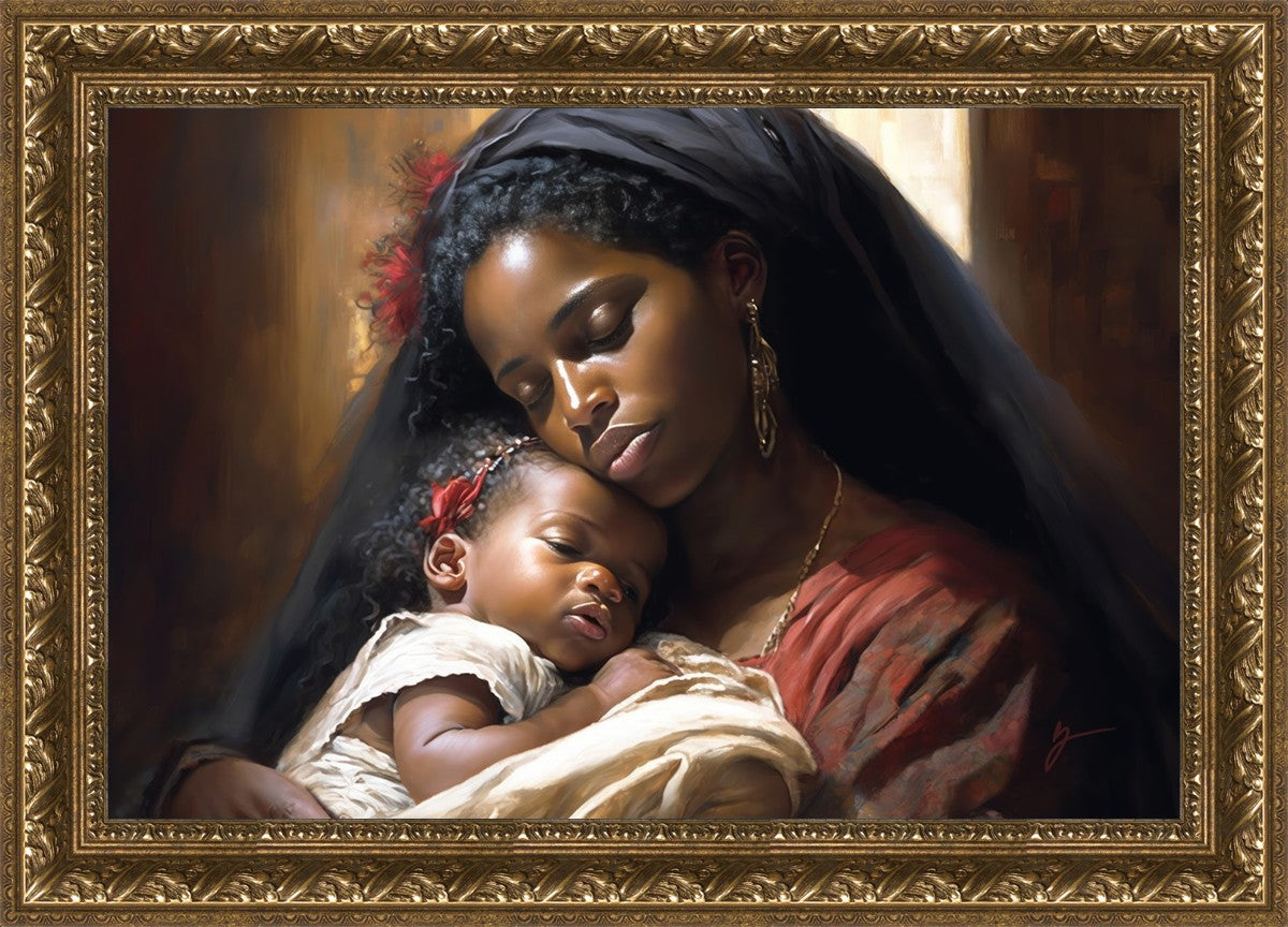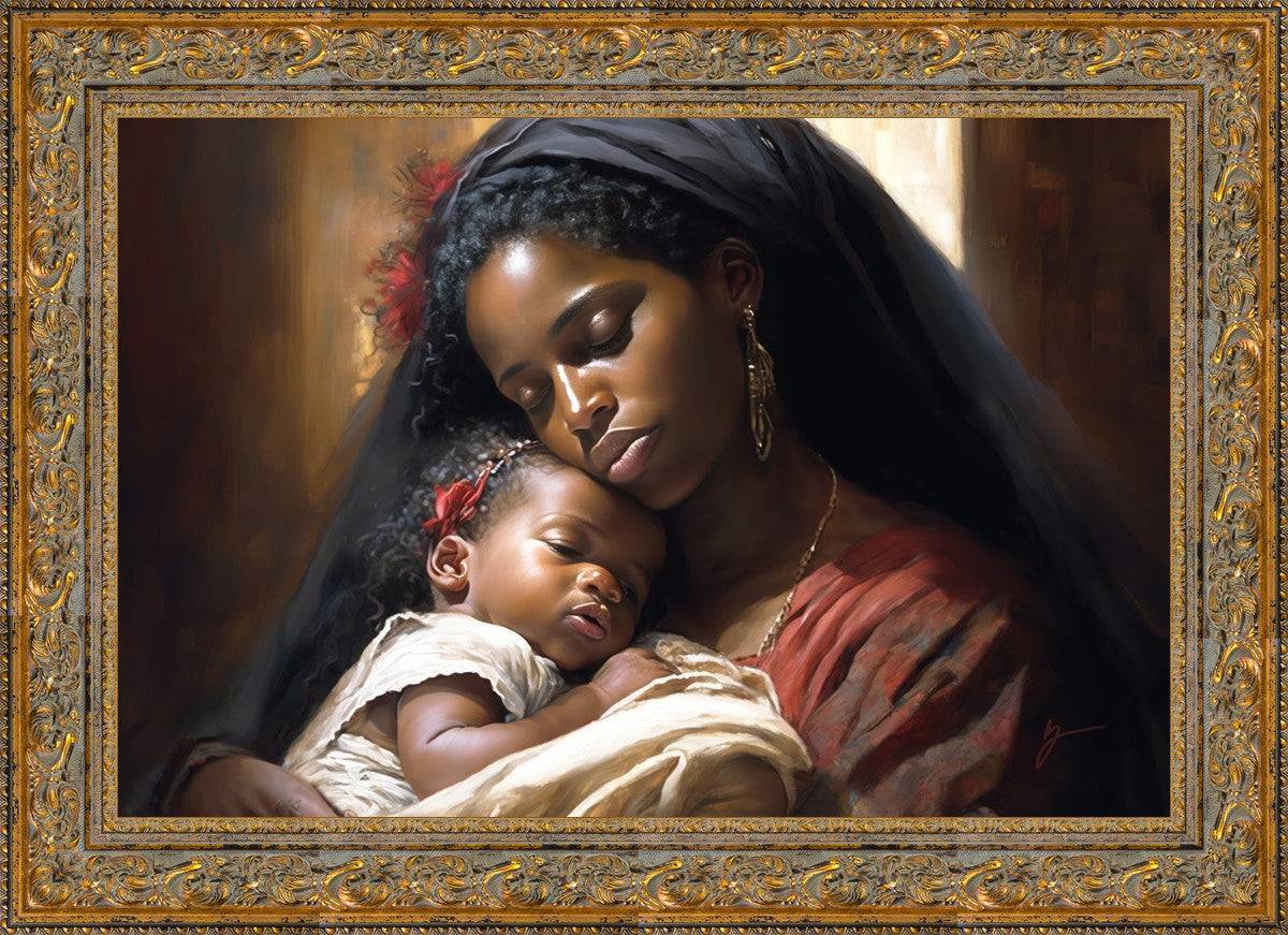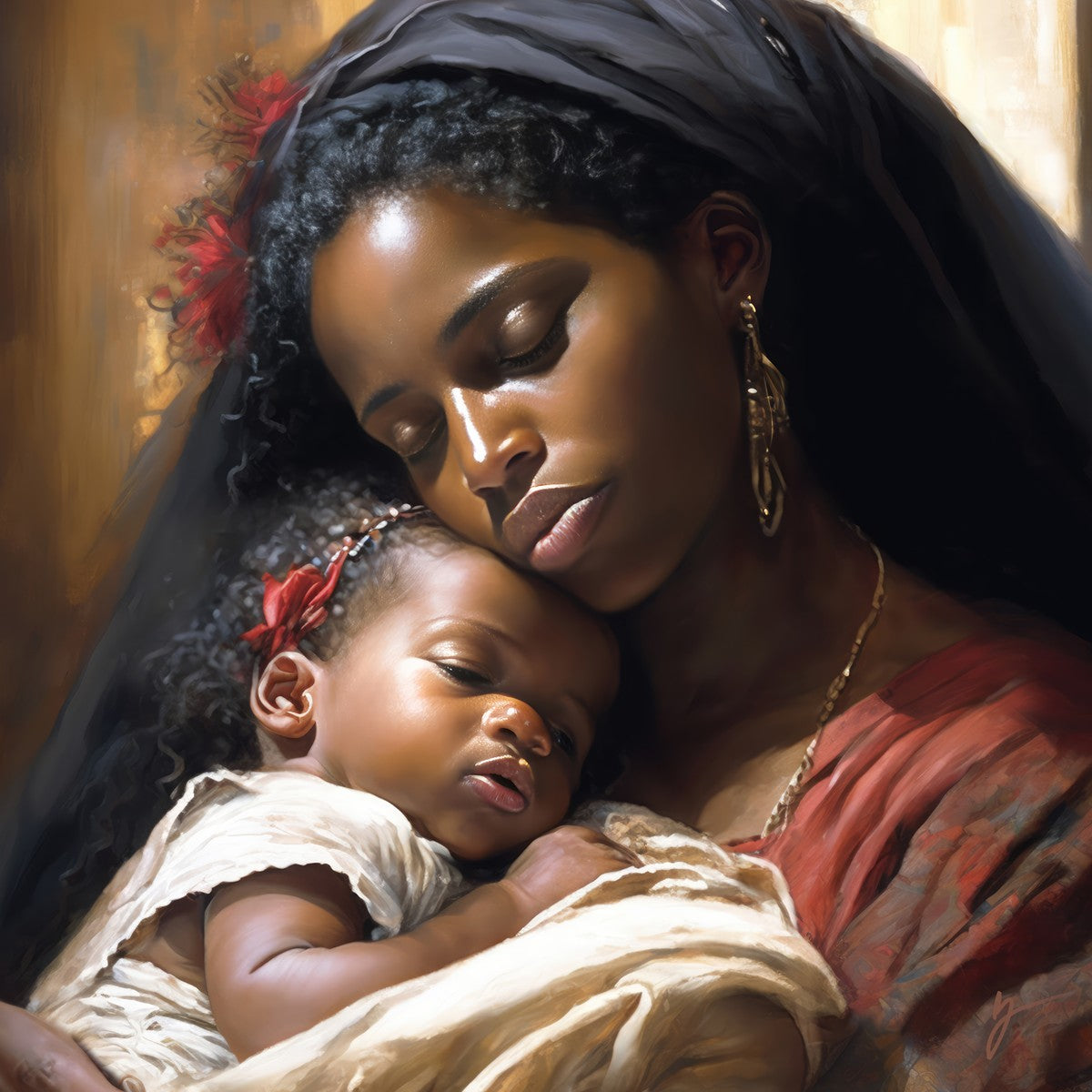 Sanctuary of Love" is a stunning painting that captures the beauty and tenderness of motherhood. In this artwork, a young mother holds her precious baby close to her chest, enveloping them both in a warm and protective embrace. The mother's eyes are closed, and a serene smile graces her face as she cherishes this moment with her child.