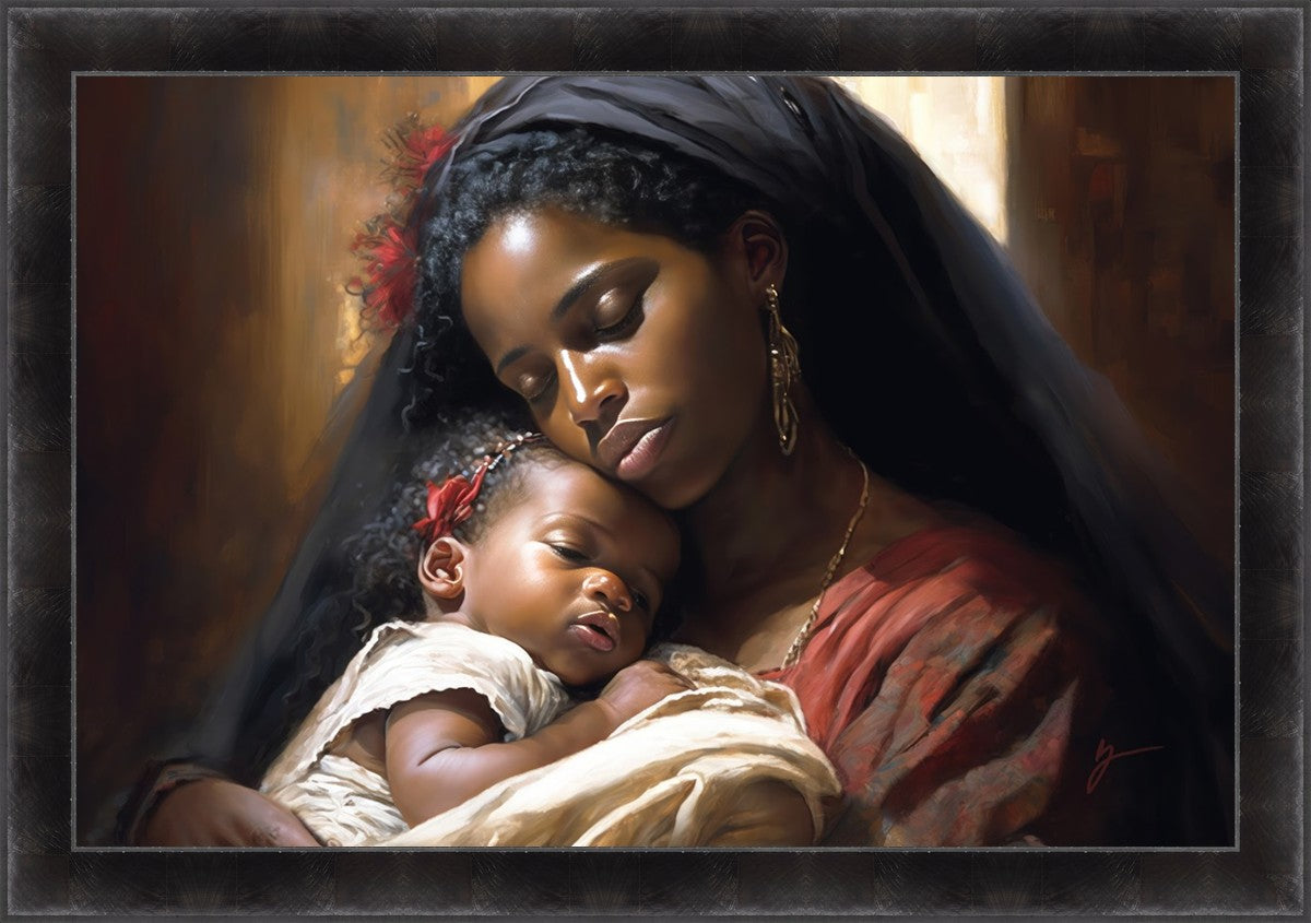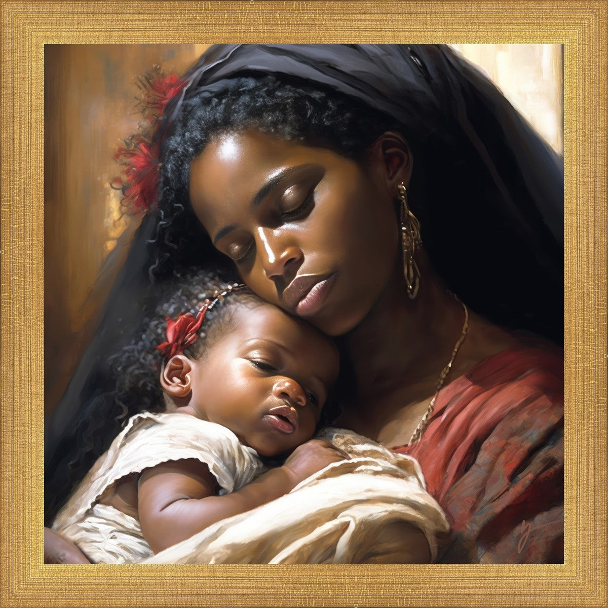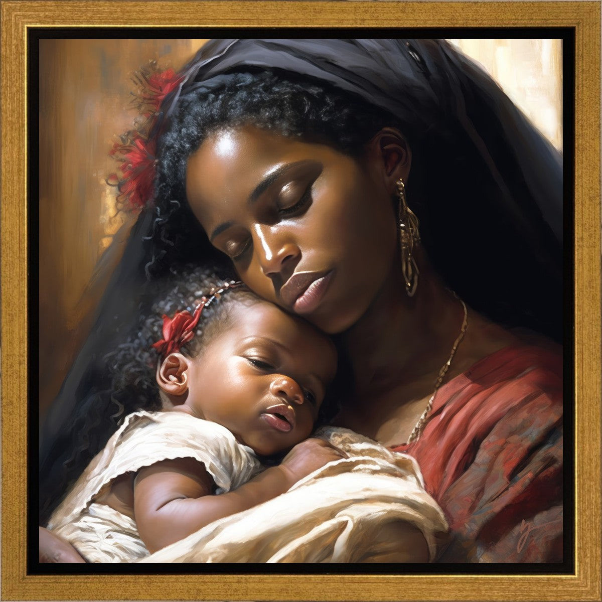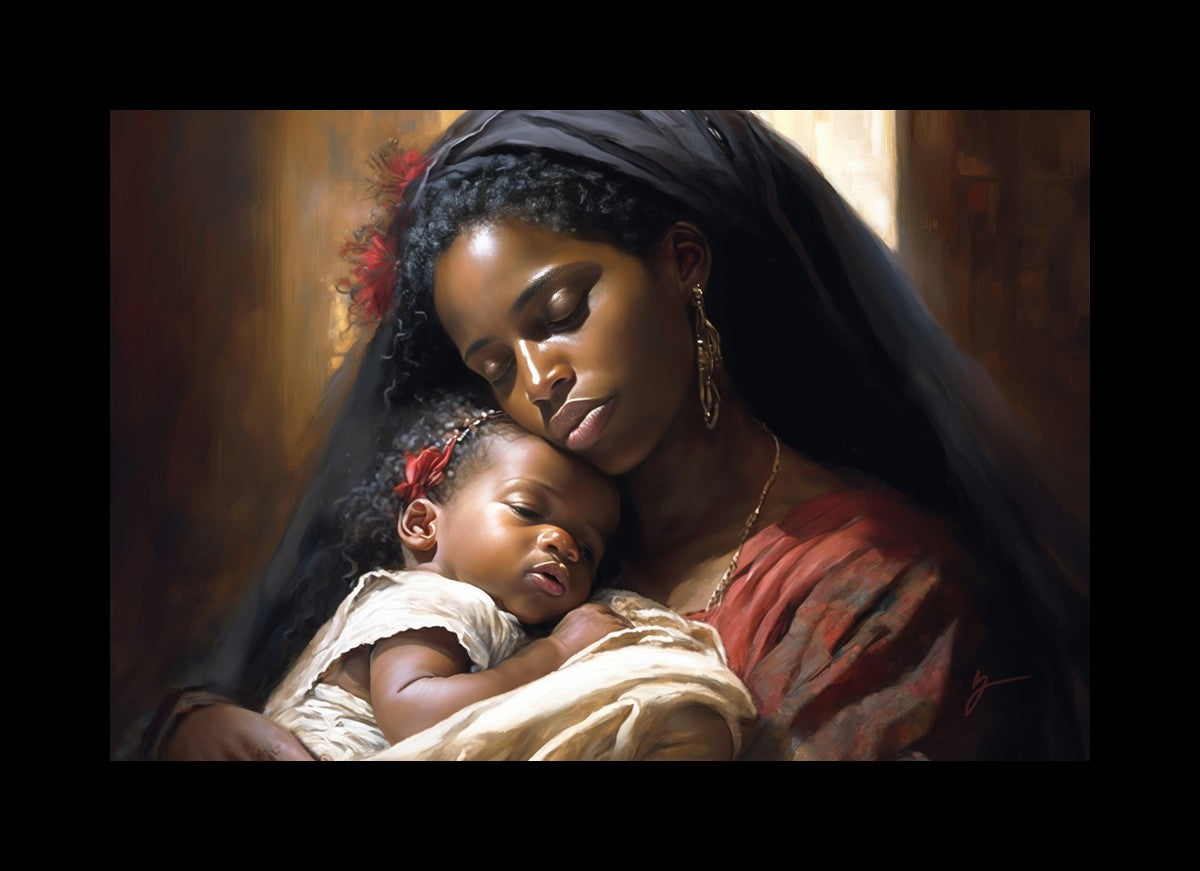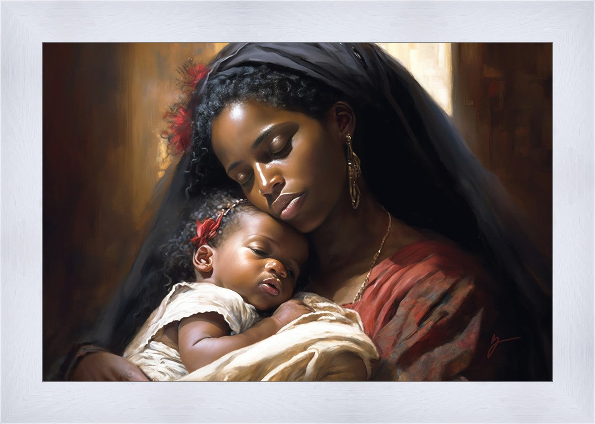 Sanctuary of Love" is a stunning painting that captures the beauty and tenderness of motherhood. In this artwork, a young mother holds her precious baby close to her chest, enveloping them both in a warm and protective embrace. The mother's eyes are closed, and a serene smile graces her face as she cherishes this moment with her child.