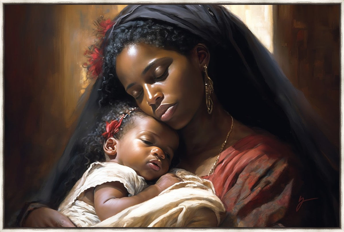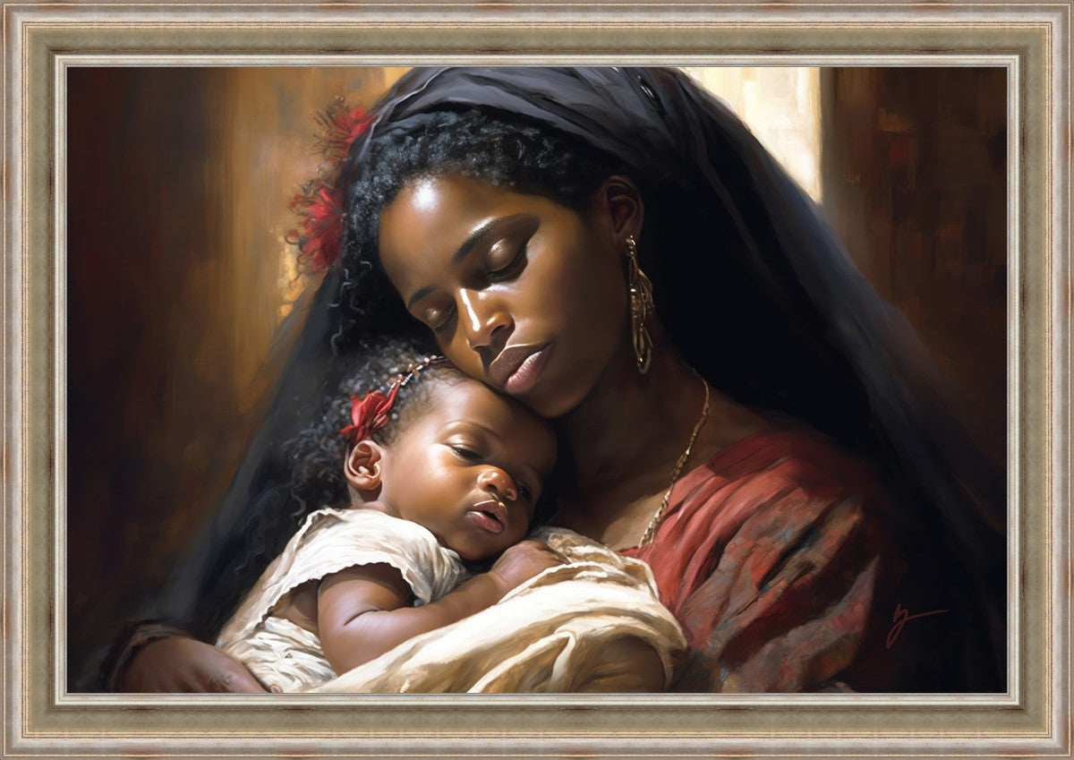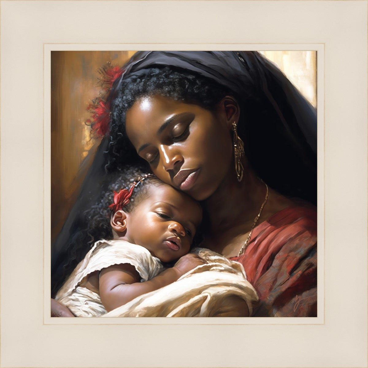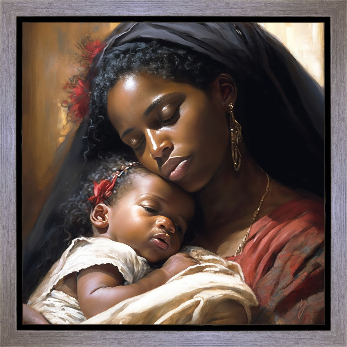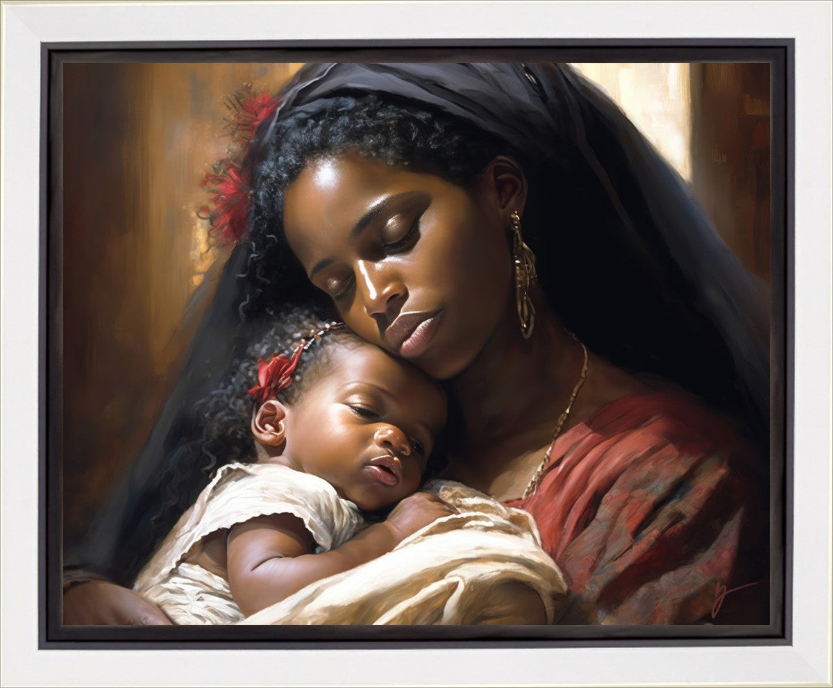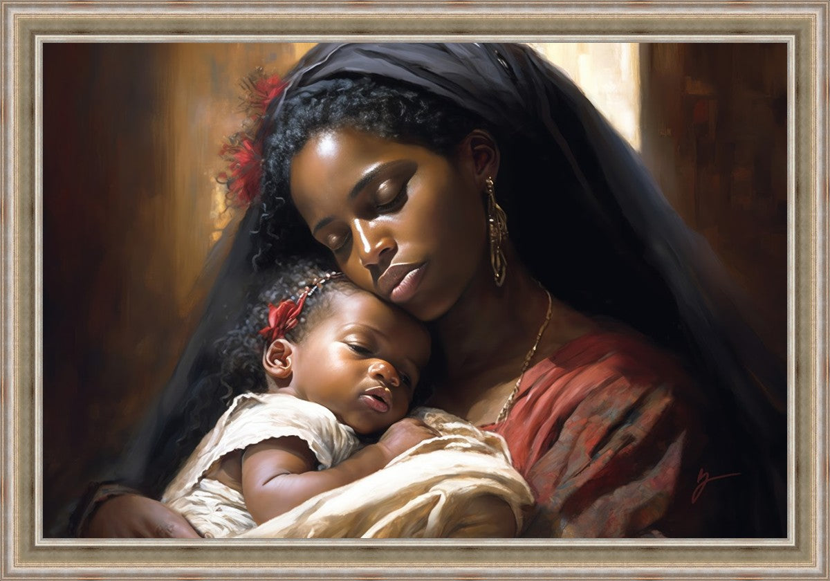 Sanctuary of Love" is a stunning painting that captures the beauty and tenderness of motherhood. In this artwork, a young mother holds her precious baby close to her chest, enveloping them both in a warm and protective embrace. The mother's eyes are closed, and a serene smile graces her face as she cherishes this moment with her child.