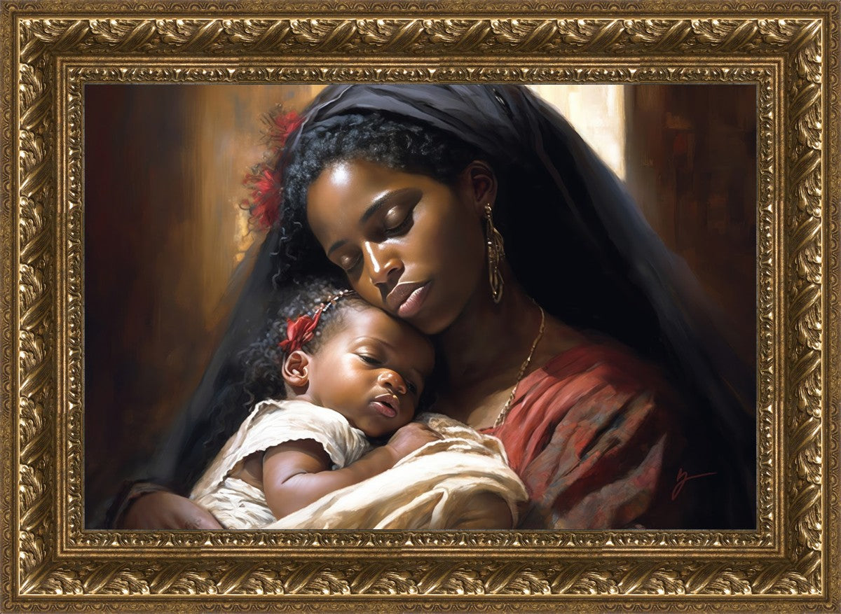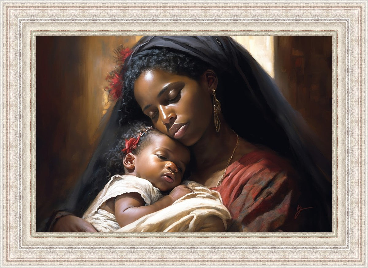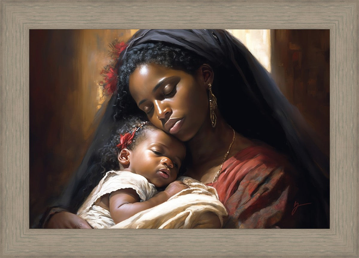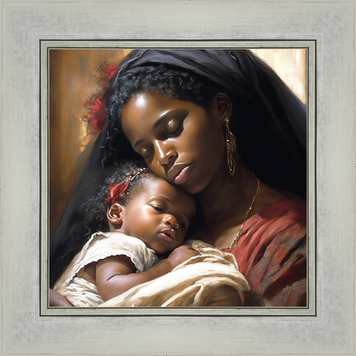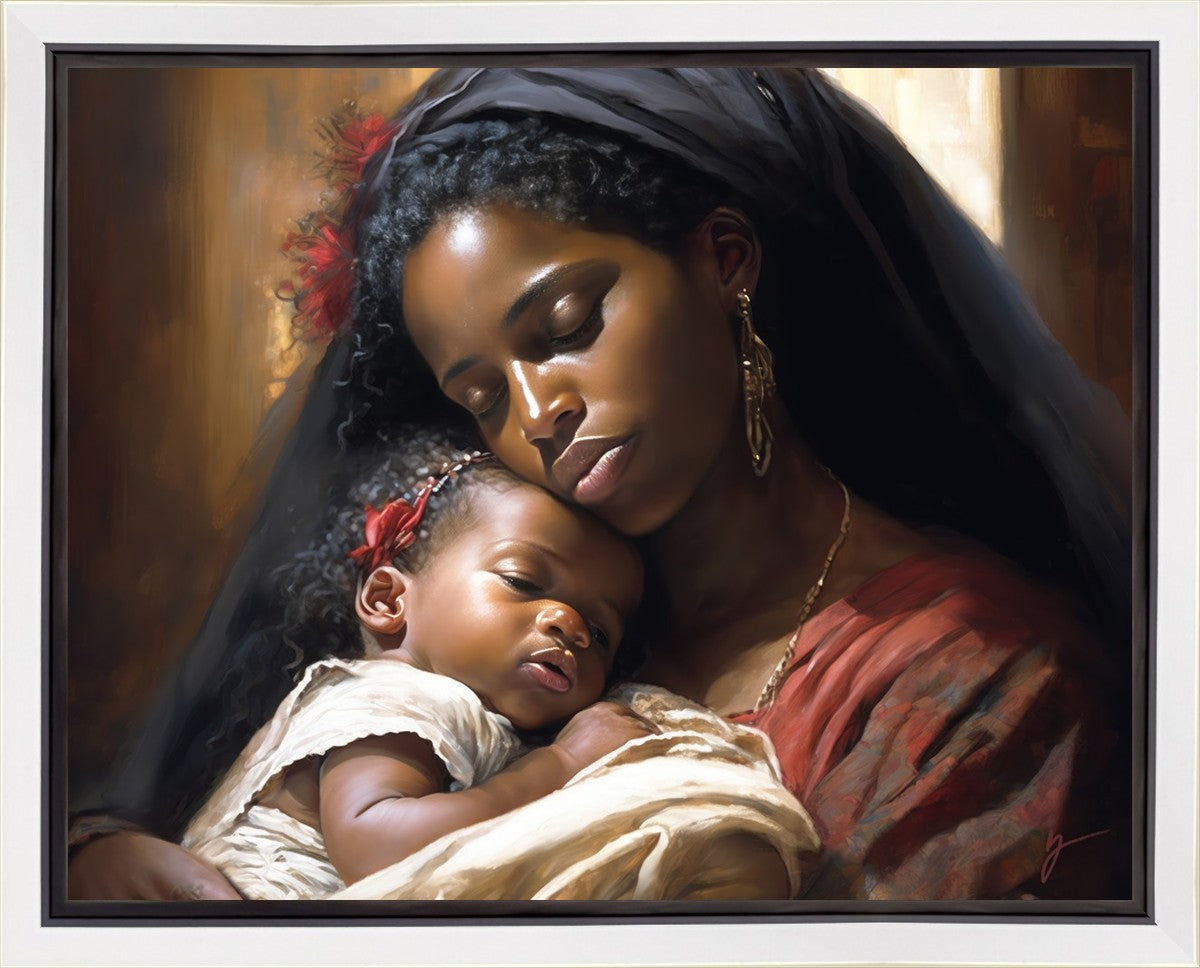 Sanctuary of Love" is a stunning painting that captures the beauty and tenderness of motherhood. In this artwork, a young mother holds her precious baby close to her chest, enveloping them both in a warm and protective embrace. The mother's eyes are closed, and a serene smile graces her face as she cherishes this moment with her child.