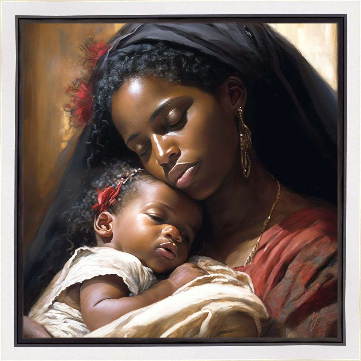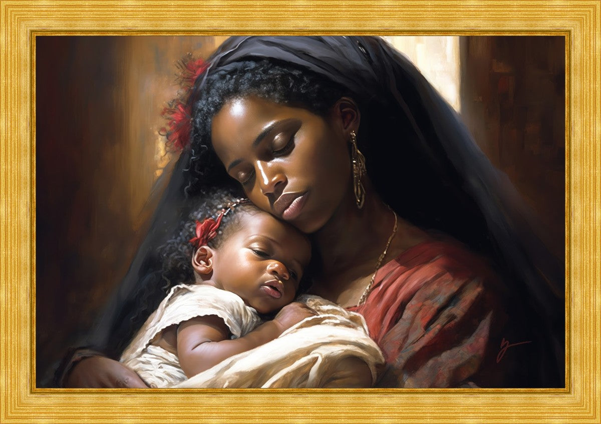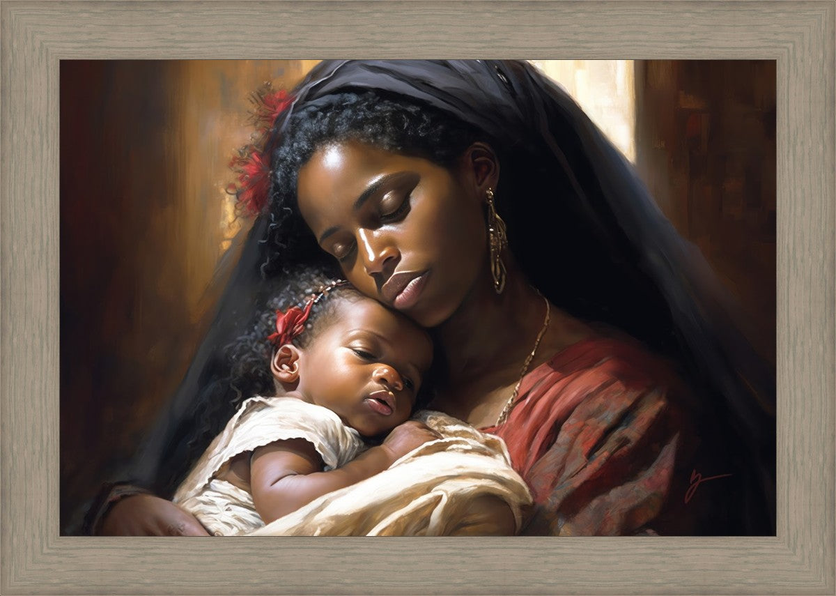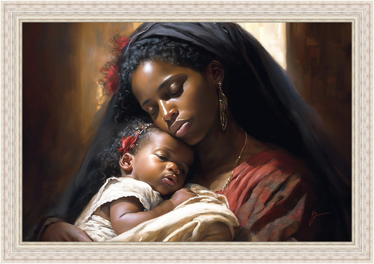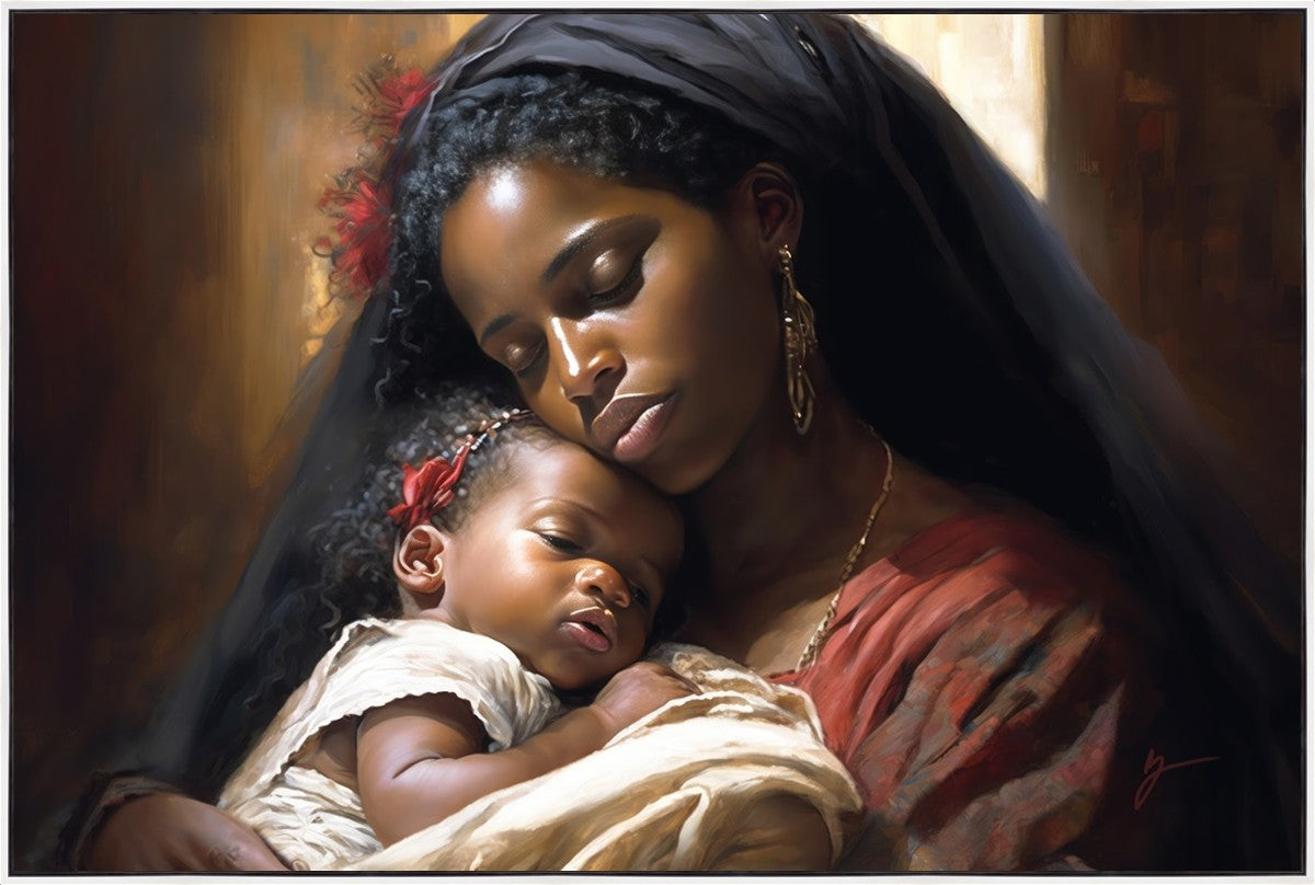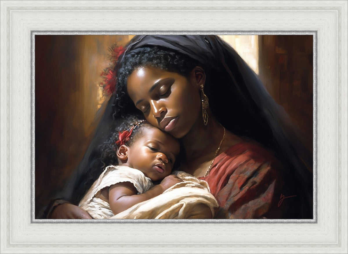 Sanctuary of Love" is a stunning painting that captures the beauty and tenderness of motherhood. In this artwork, a young mother holds her precious baby close to her chest, enveloping them both in a warm and protective embrace. The mother's eyes are closed, and a serene smile graces her face as she cherishes this moment with her child.