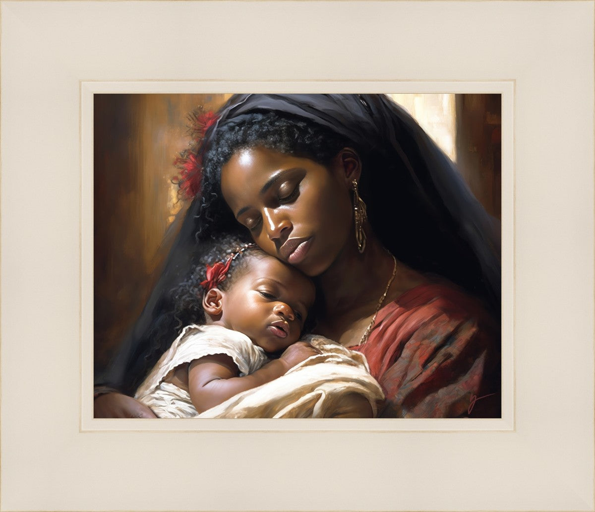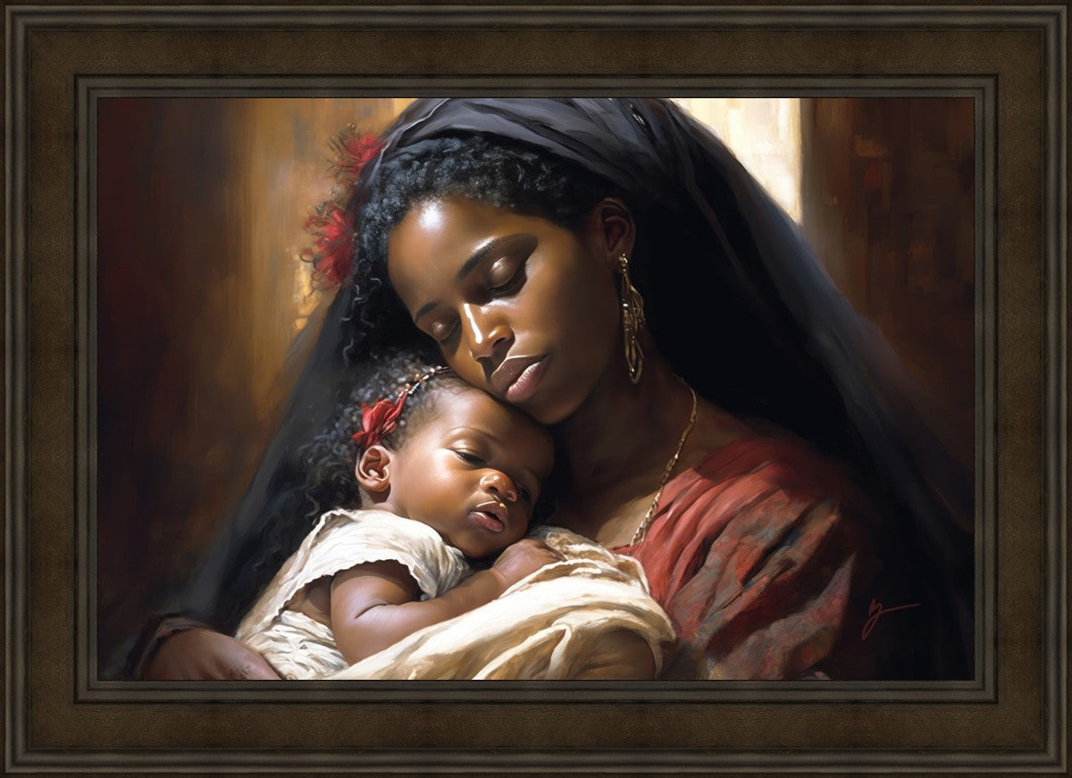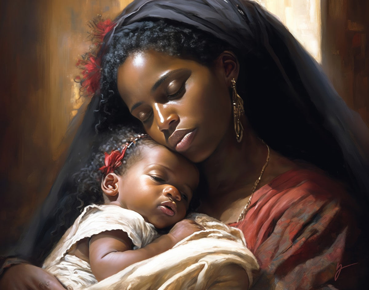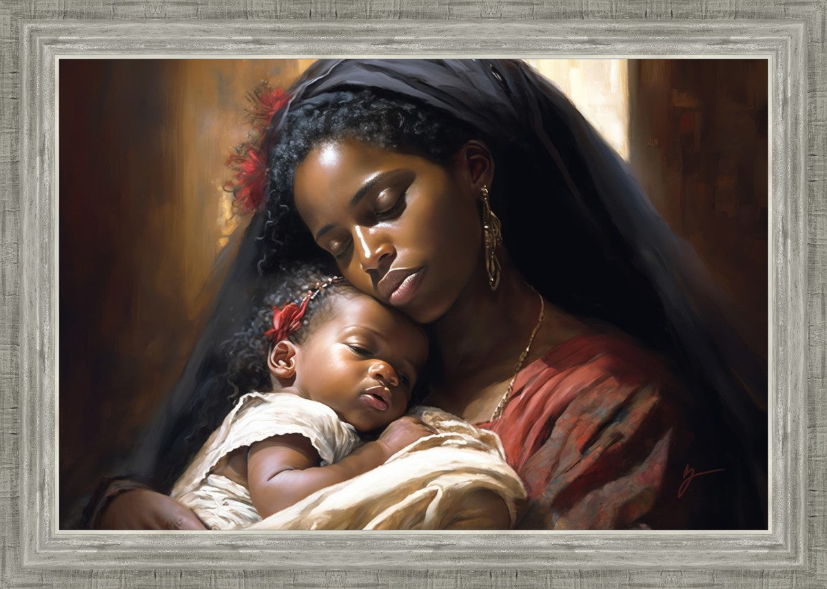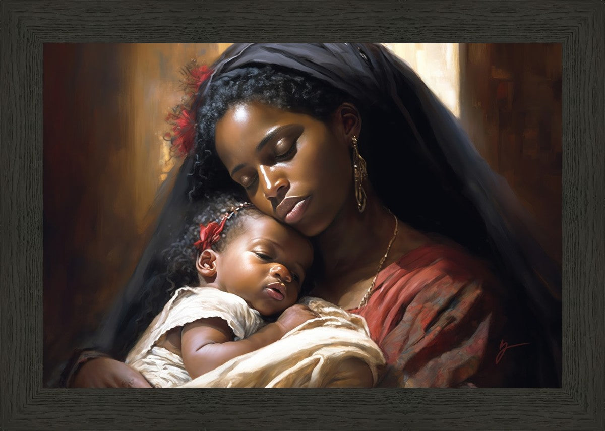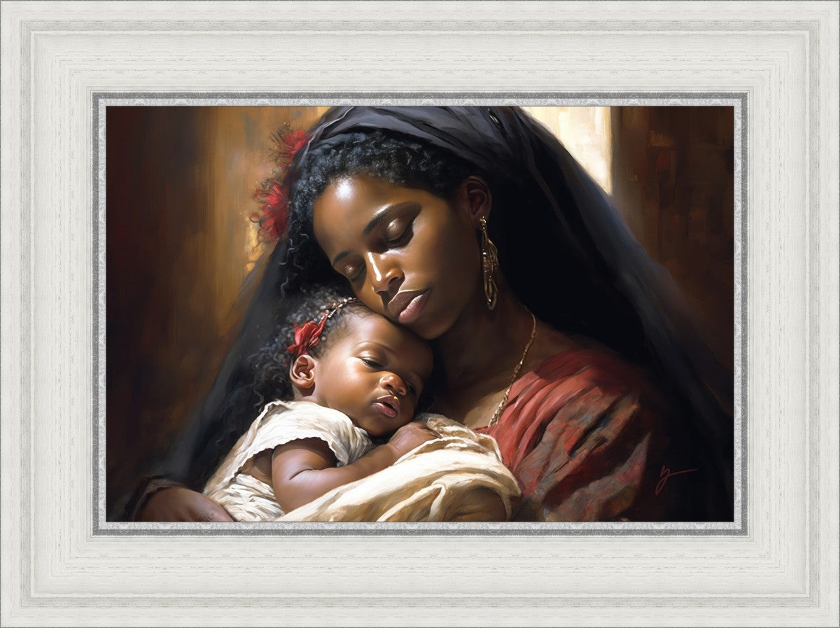 Sanctuary of Love" is a stunning painting that captures the beauty and tenderness of motherhood. In this artwork, a young mother holds her precious baby close to her chest, enveloping them both in a warm and protective embrace. The mother's eyes are closed, and a serene smile graces her face as she cherishes this moment with her child.