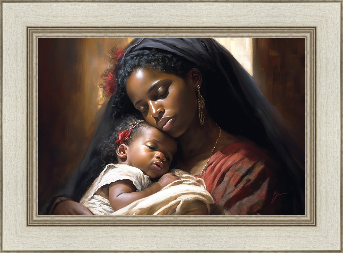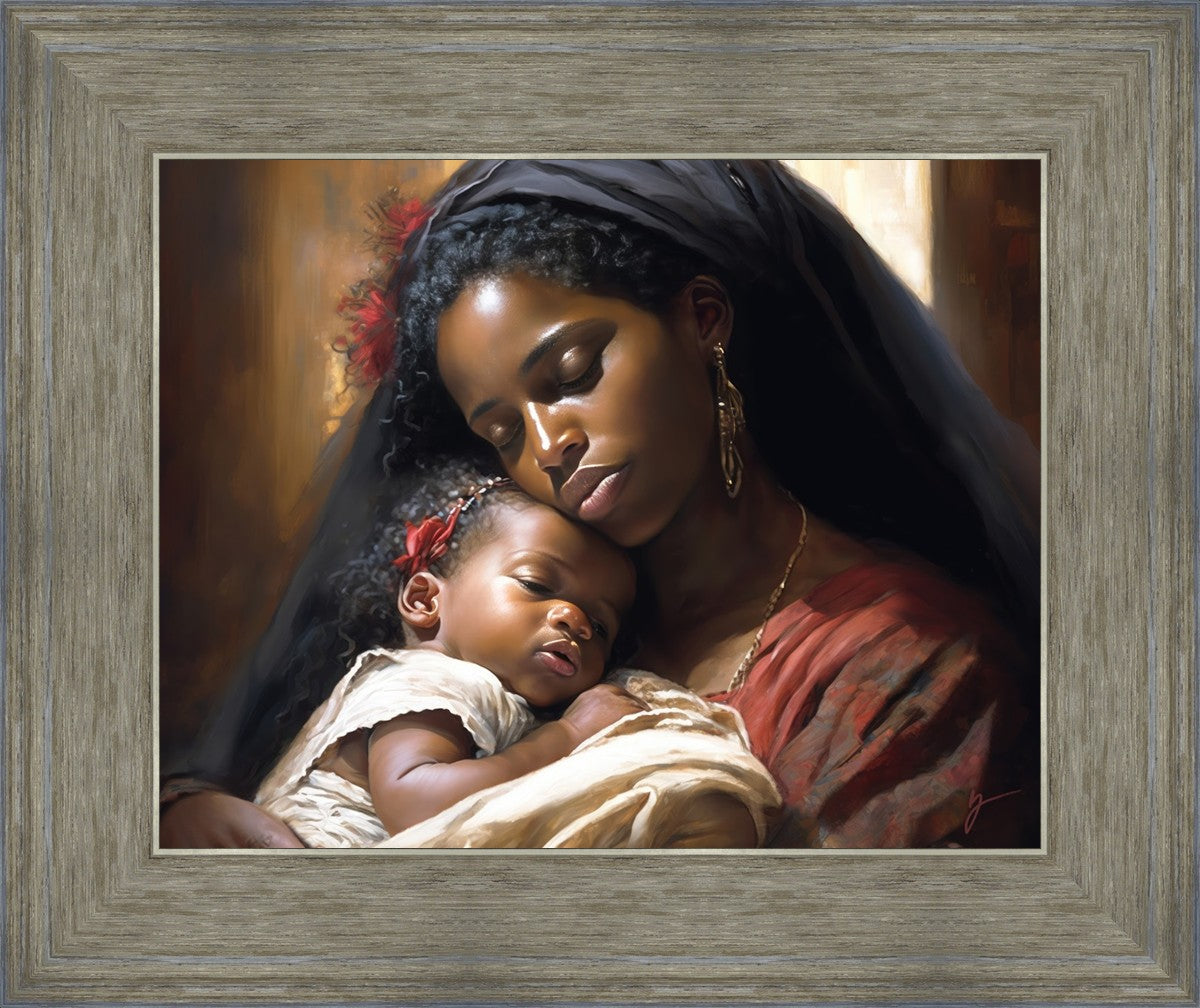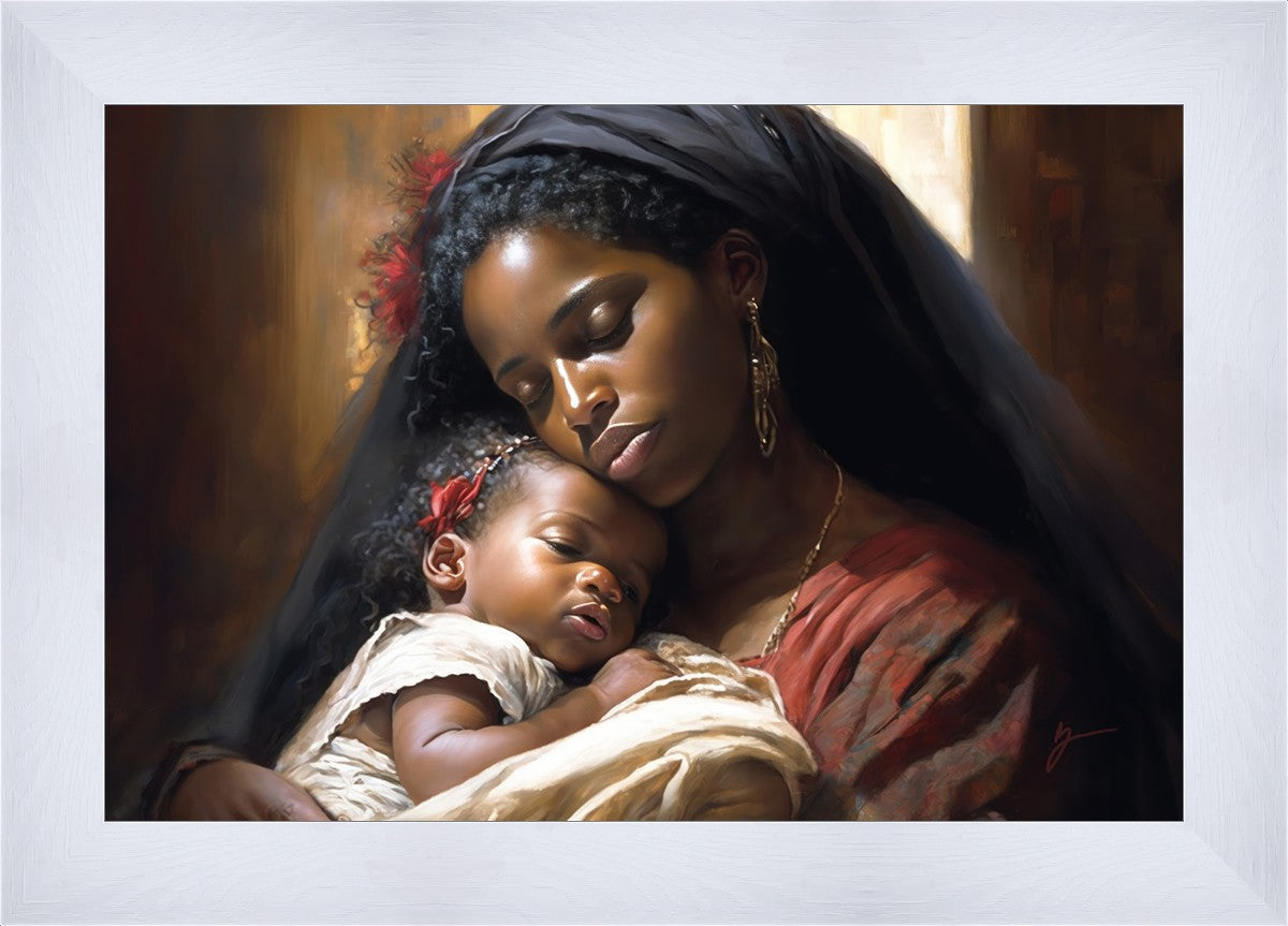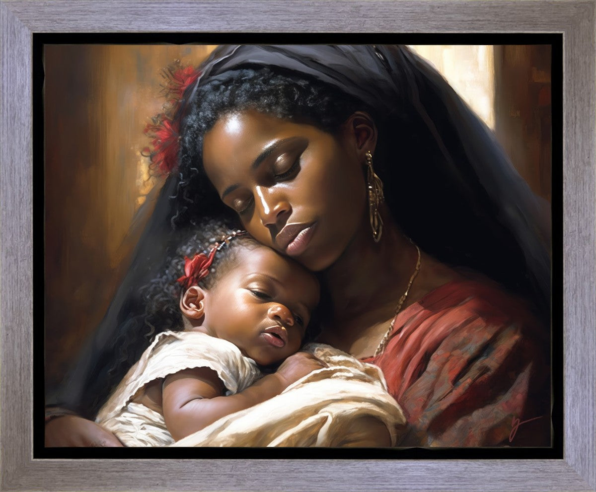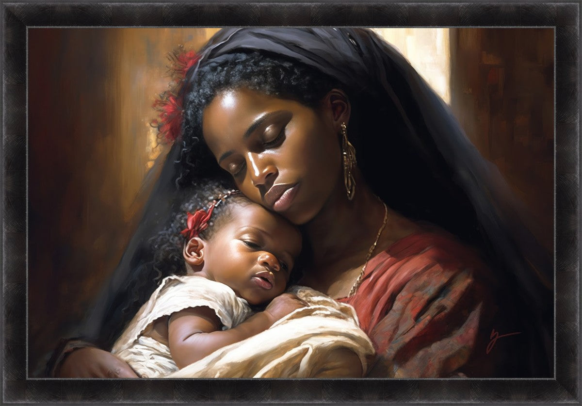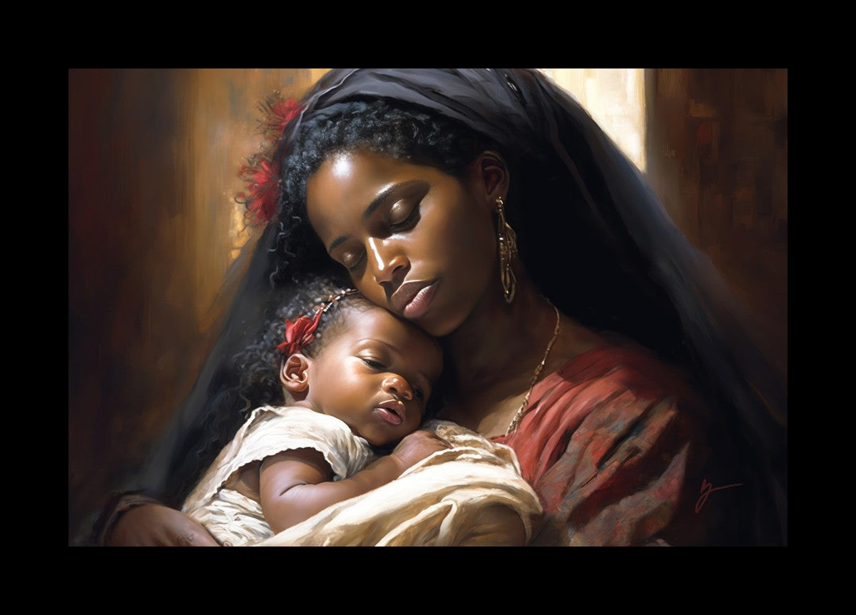 Sanctuary of Love" is a stunning painting that captures the beauty and tenderness of motherhood. In this artwork, a young mother holds her precious baby close to her chest, enveloping them both in a warm and protective embrace. The mother's eyes are closed, and a serene smile graces her face as she cherishes this moment with her child.