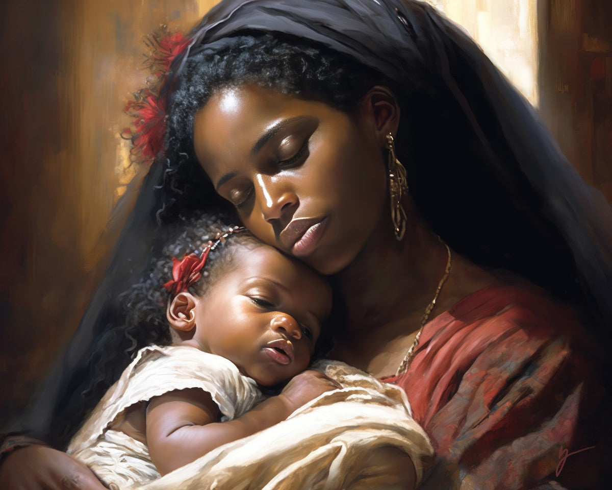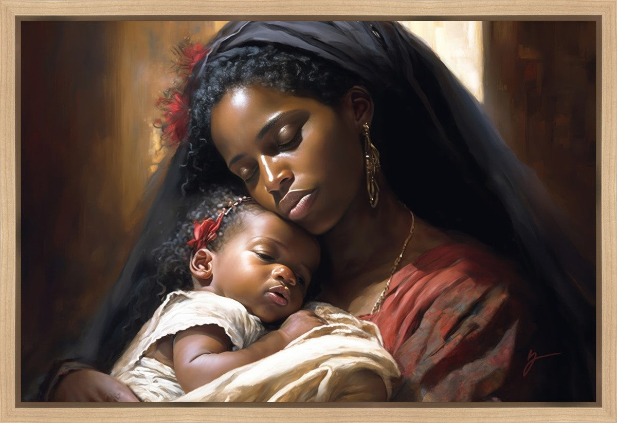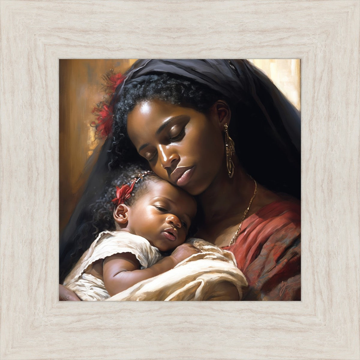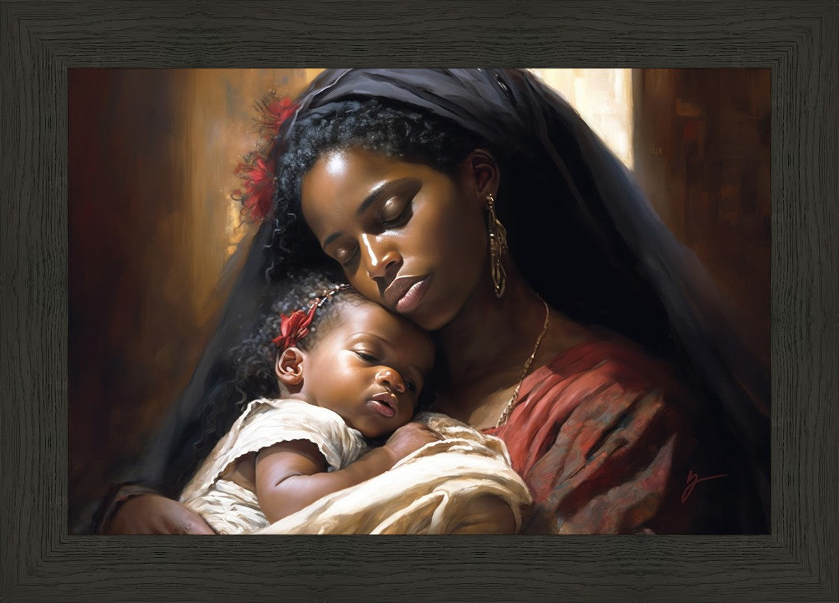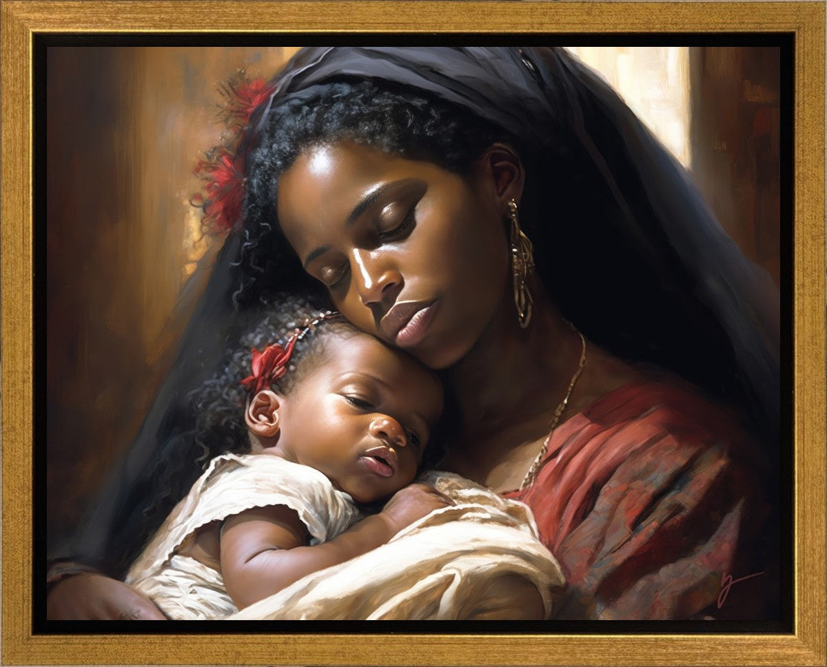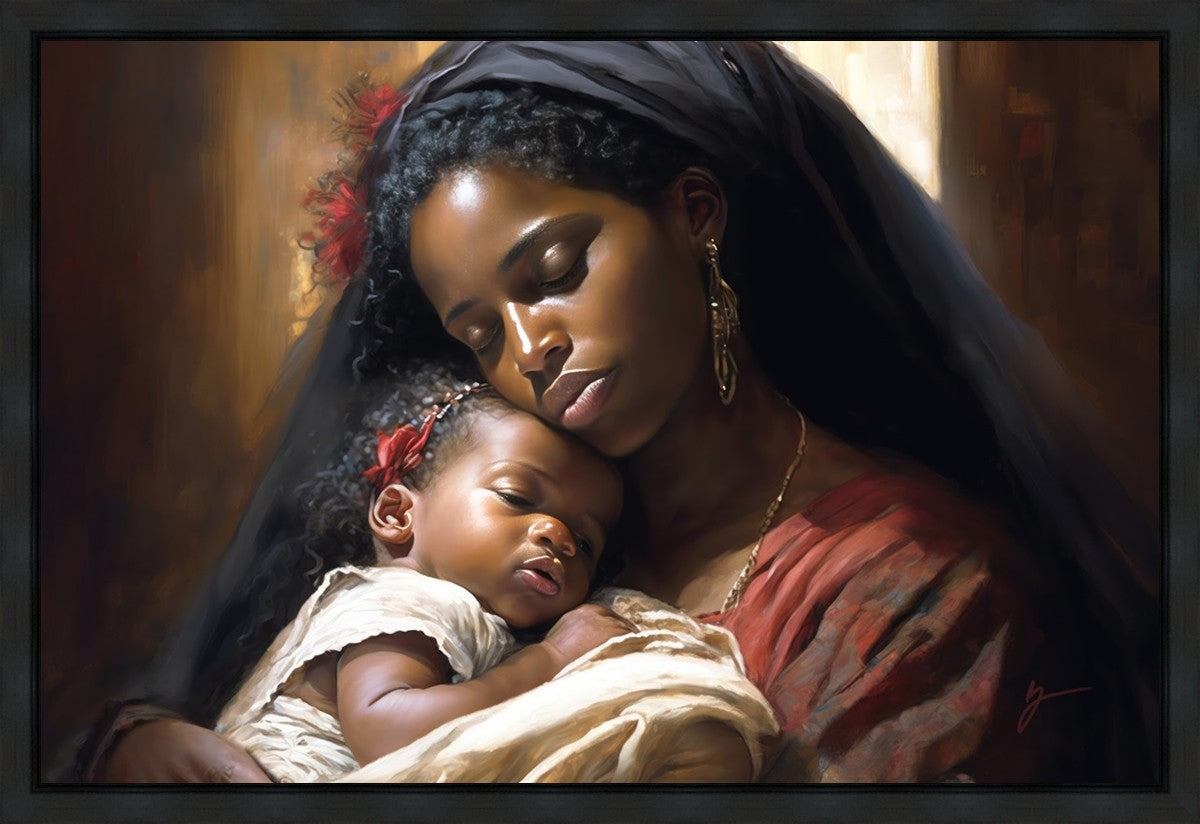 Sanctuary of Love" is a stunning painting that captures the beauty and tenderness of motherhood. In this artwork, a young mother holds her precious baby close to her chest, enveloping them both in a warm and protective embrace. The mother's eyes are closed, and a serene smile graces her face as she cherishes this moment with her child.