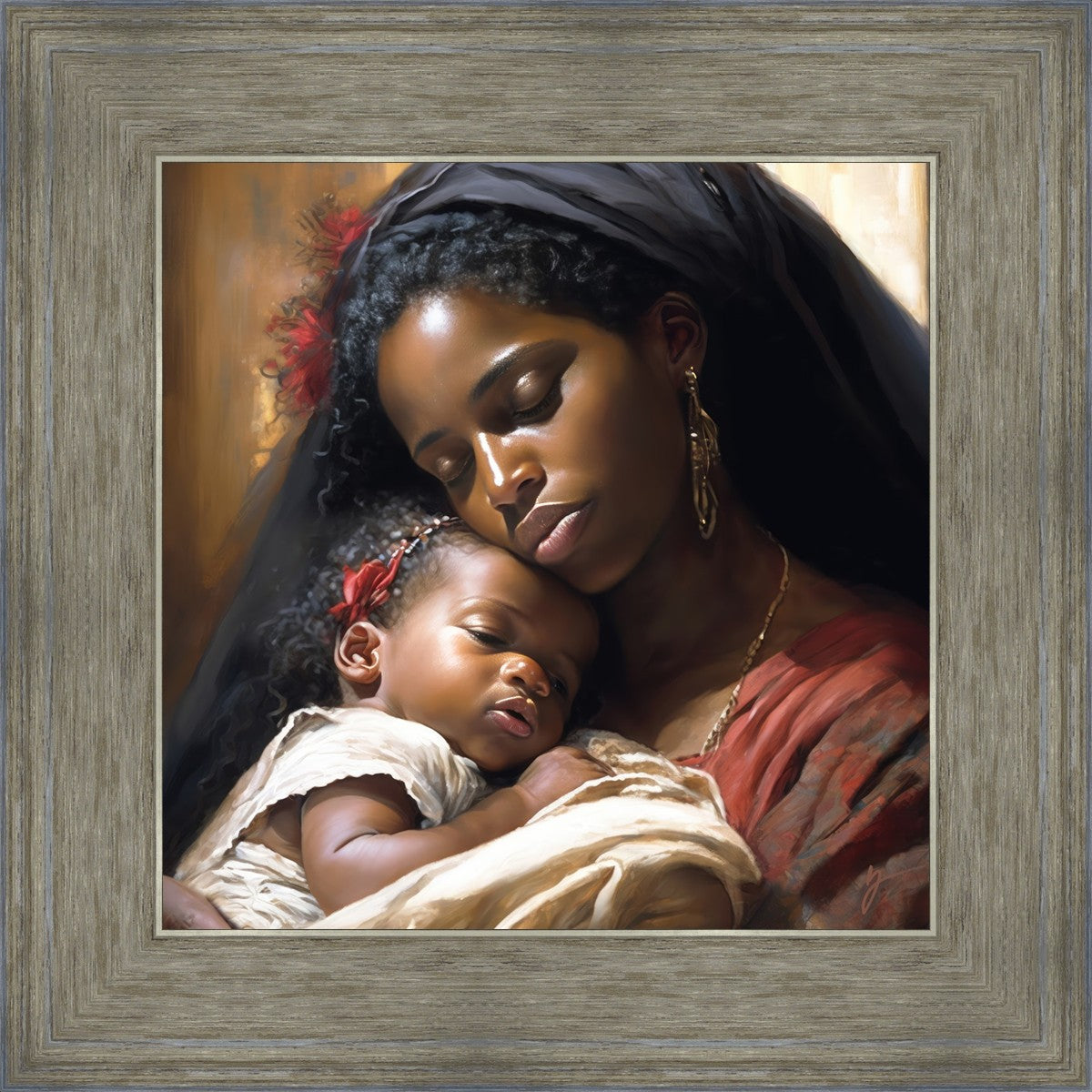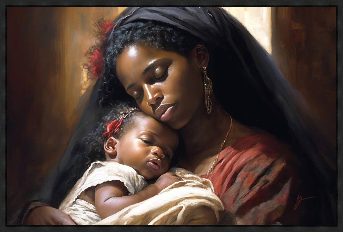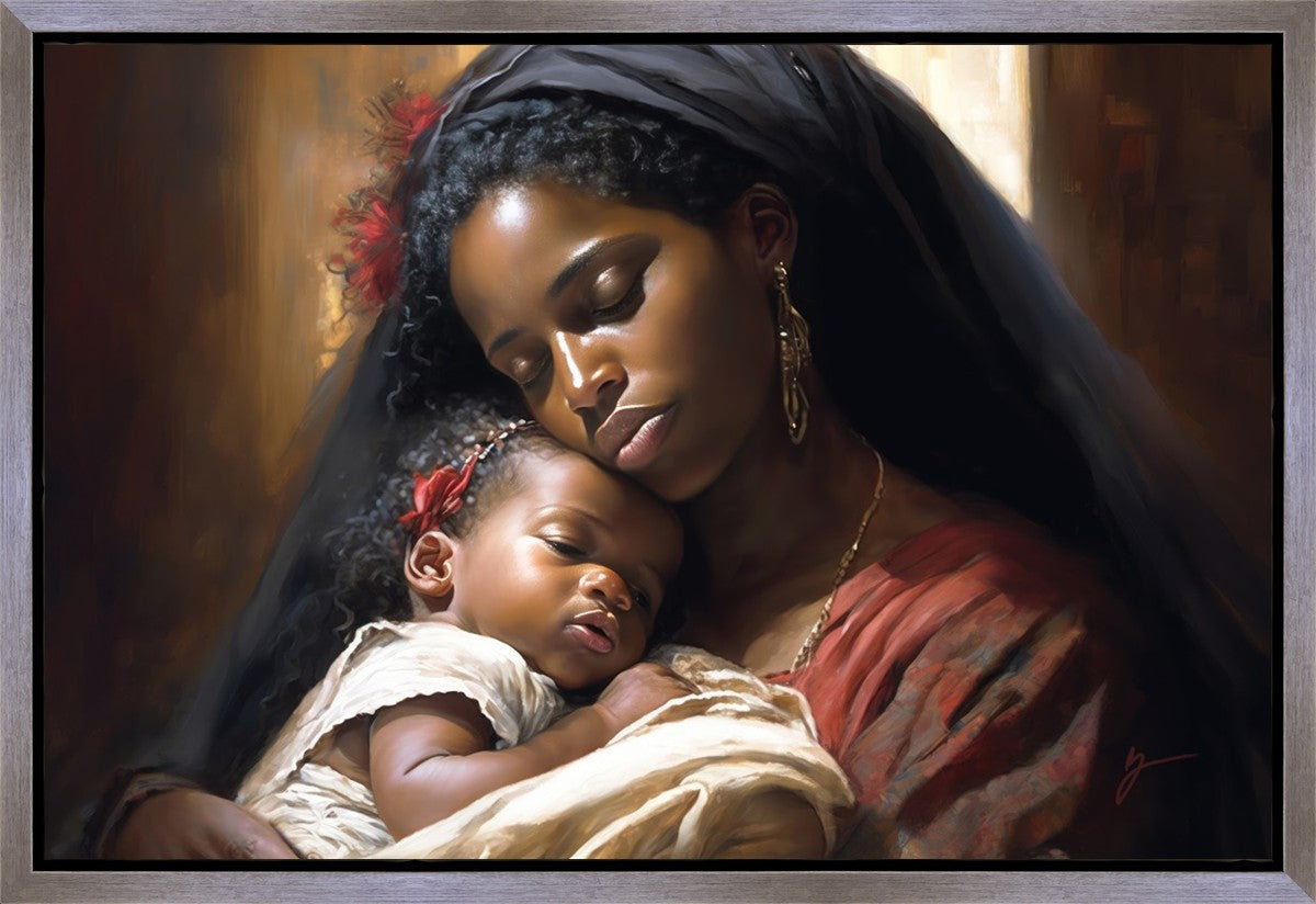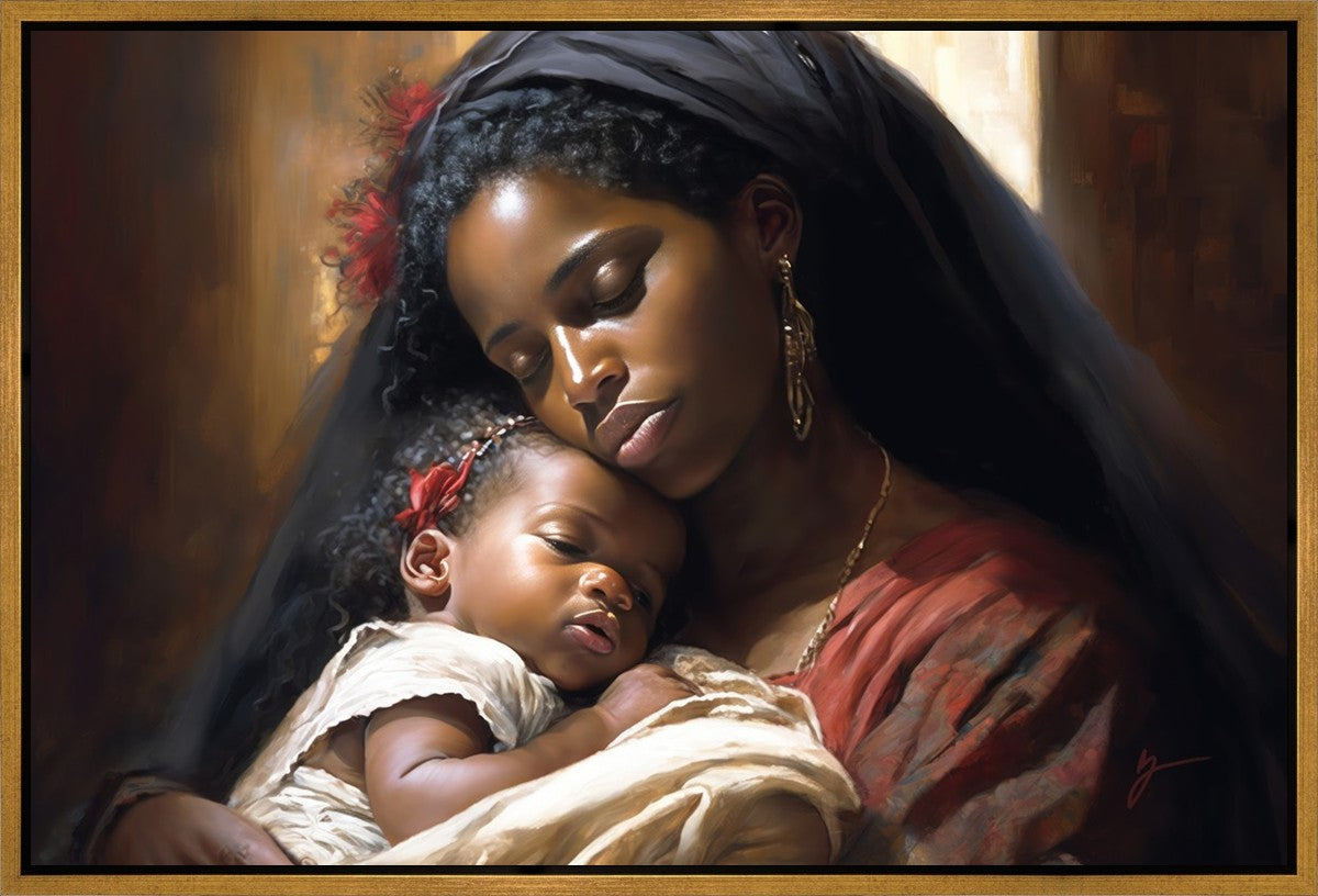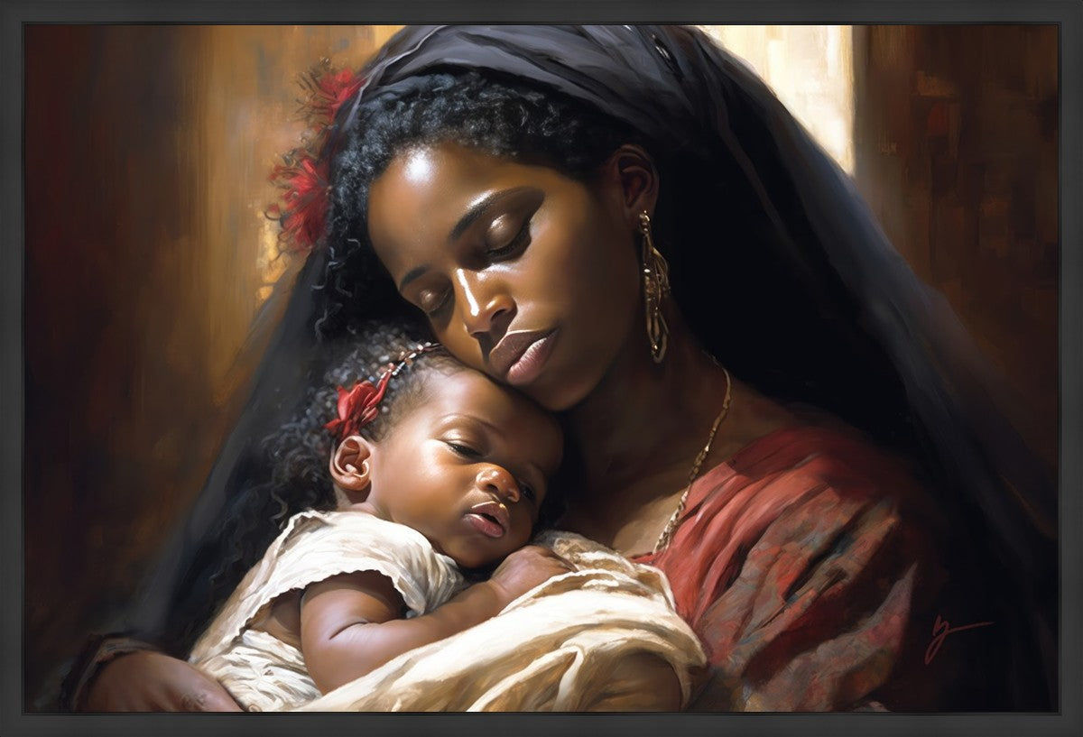 Sanctuary of Love" is a stunning painting that captures the beauty and tenderness of motherhood. In this artwork, a young mother holds her precious baby close to her chest, enveloping them both in a warm and protective embrace. The mother's eyes are closed, and a serene smile graces her face as she cherishes this moment with her child.