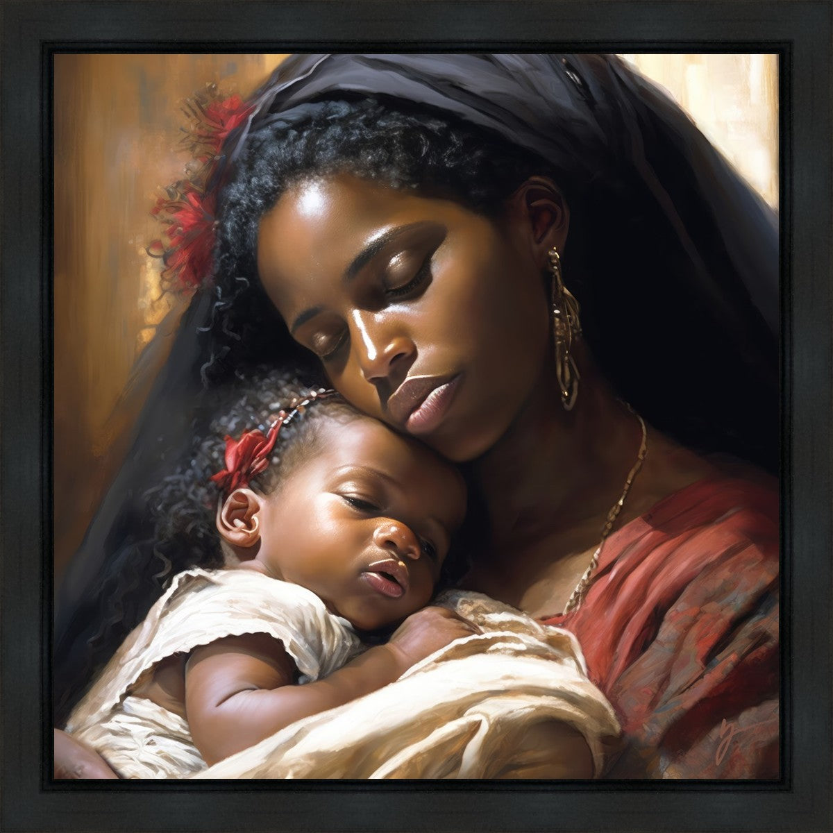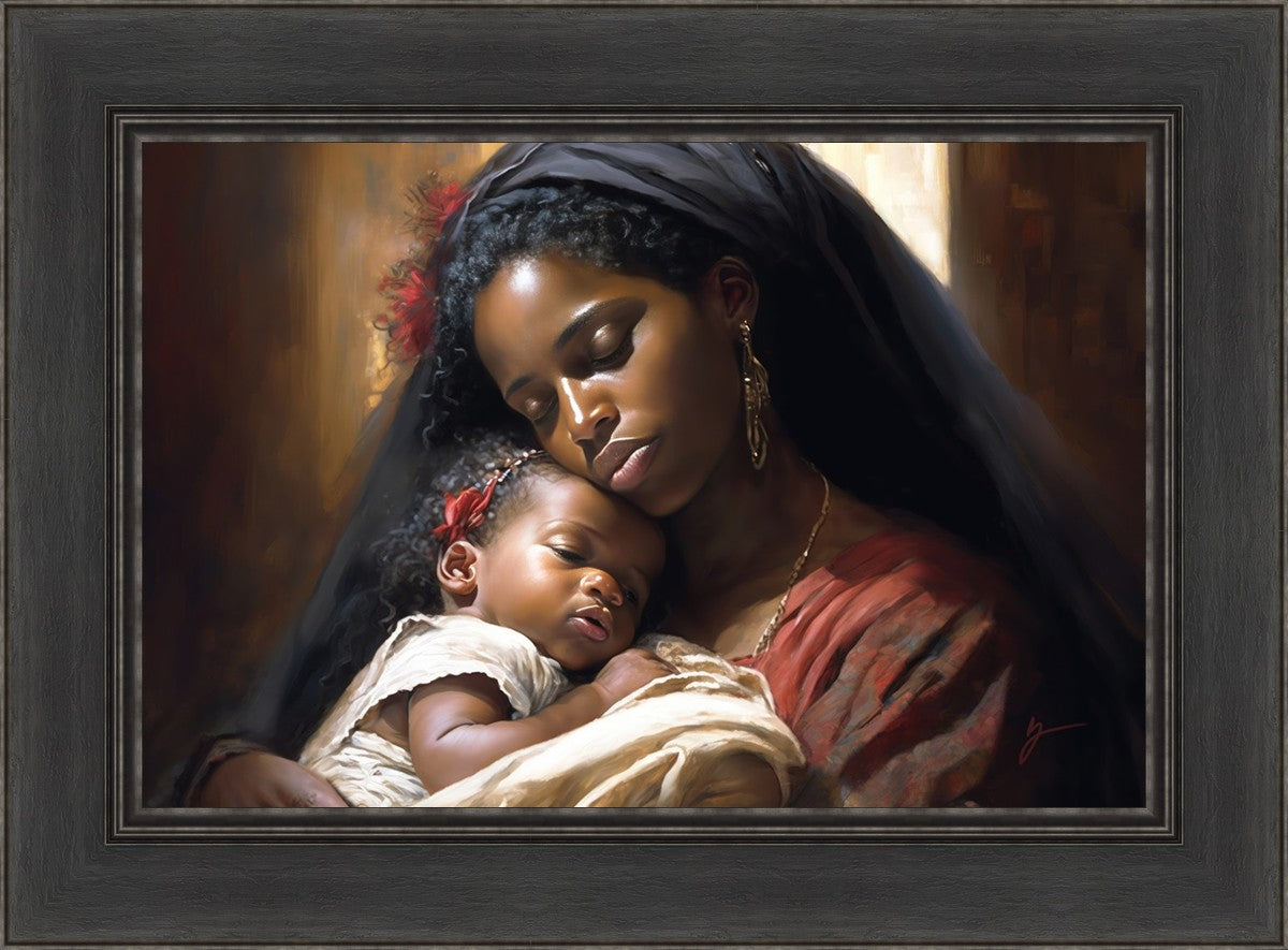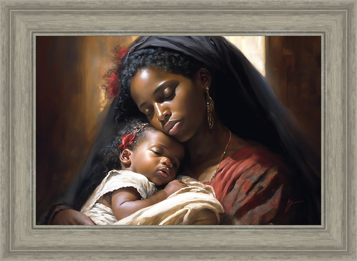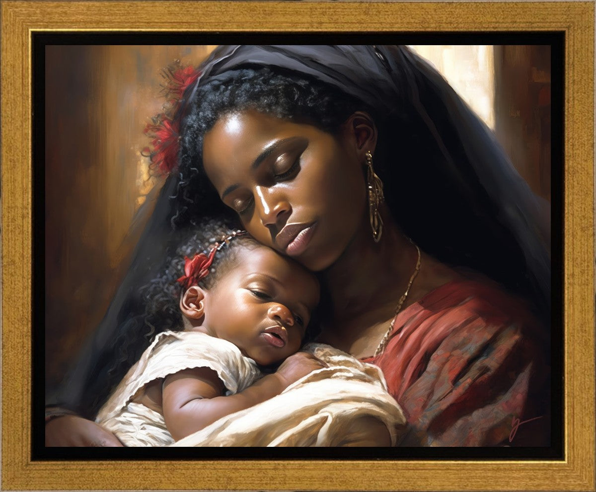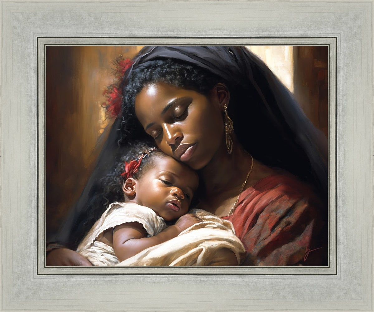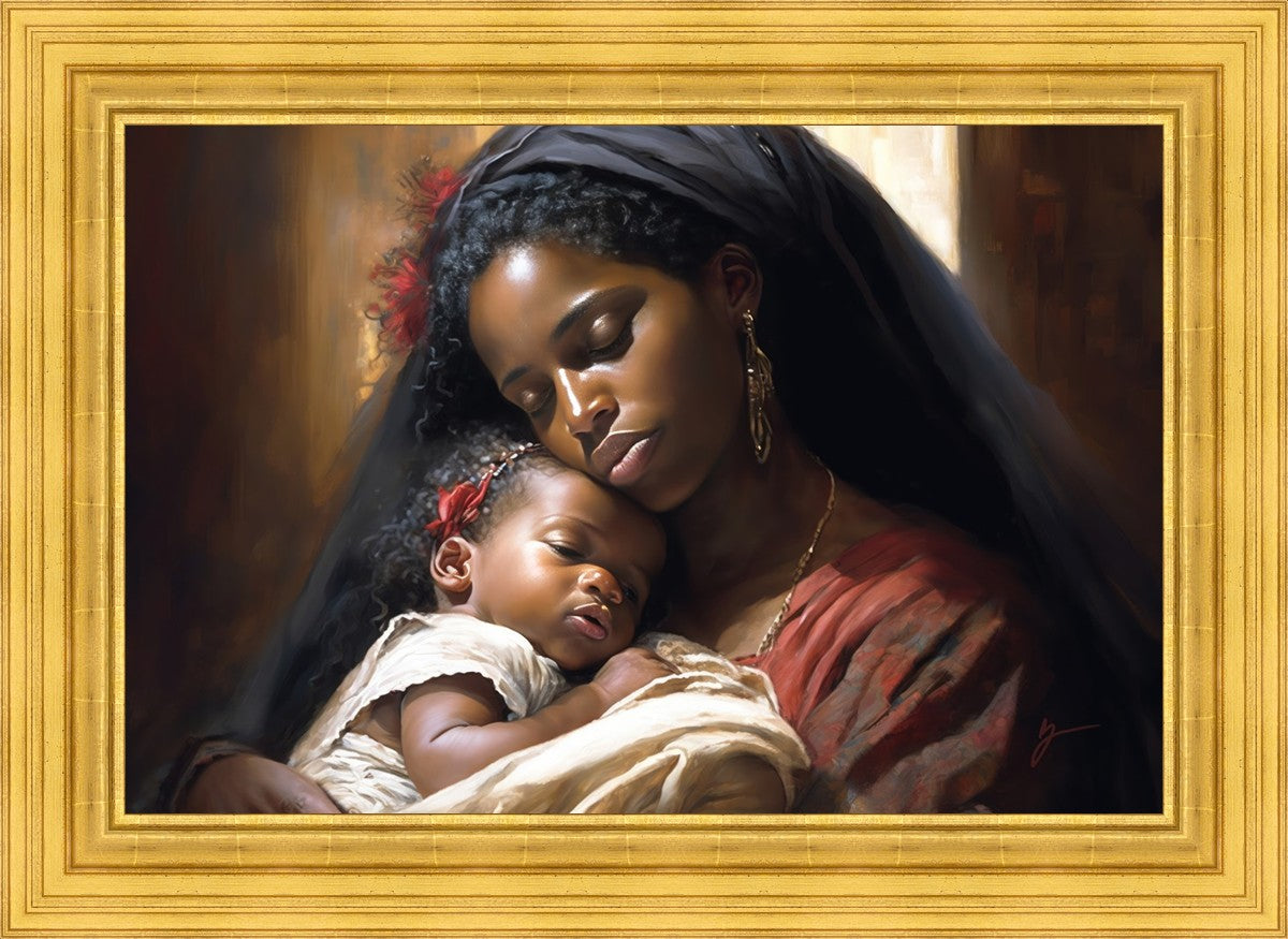 Sanctuary of Love" is a stunning painting that captures the beauty and tenderness of motherhood. In this artwork, a young mother holds her precious baby close to her chest, enveloping them both in a warm and protective embrace. The mother's eyes are closed, and a serene smile graces her face as she cherishes this moment with her child.